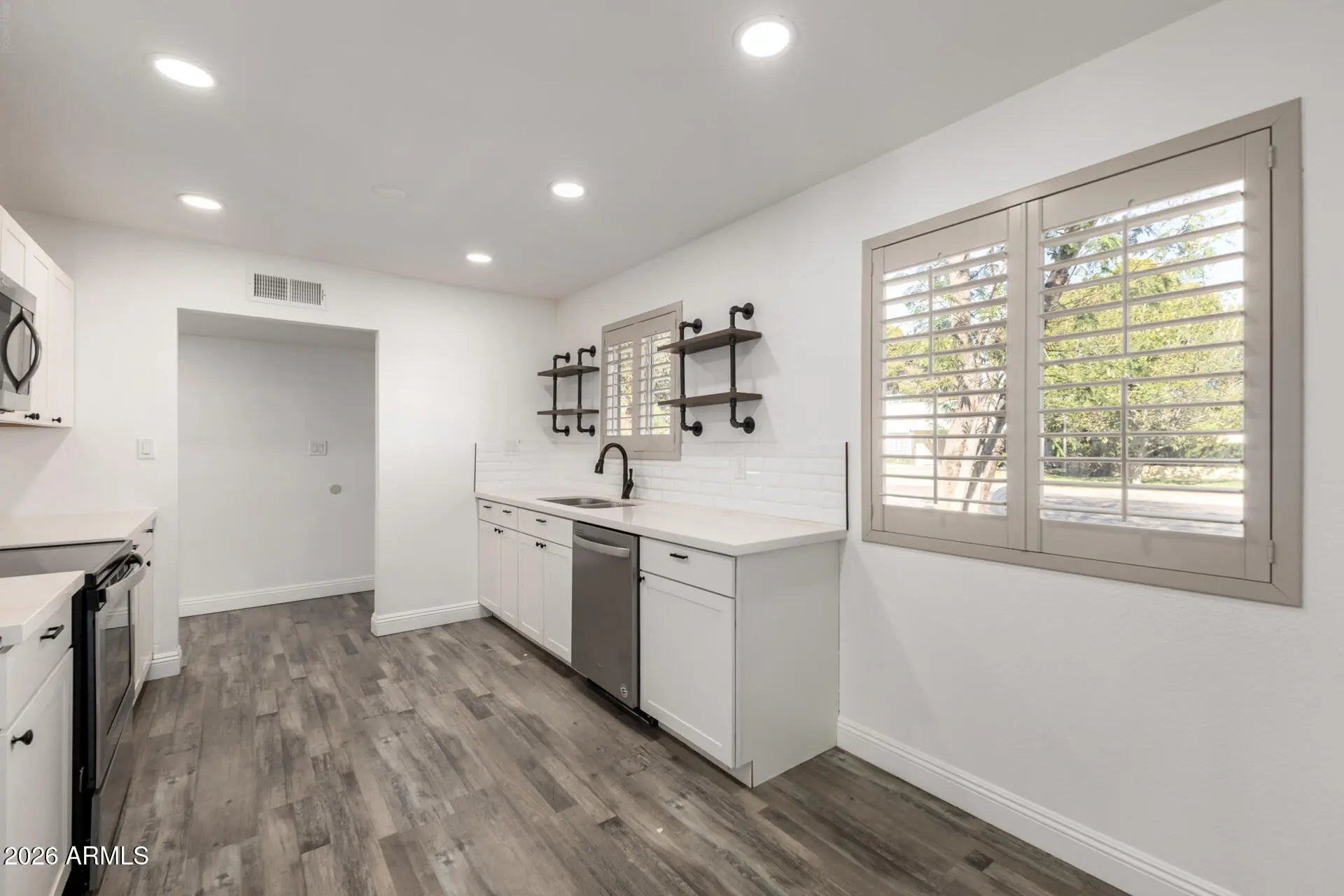 FULLY RENOVATED! Enjoy added privacy with no neighbors behind in this single-story home! Convenient parking and an easy-care front yard greet you upon arrival. Fall in love with the open layout featuring wood-style flooring, plantation shutters, neutral paint, recessed lighting, and a cozy fireplace. The eat-in kitchen offers stainless steel appliances, white cabinetry, granite counters, and a classic subway tile backsplash. Just off the kitchen, the family room provides a comfortable gathering space with a ceiling fan. The main bedroom boasts a spacious closet and a private bathroom. Discover a low-maintenance backyard including covered patio, refreshing pool, fire pit area, and storage shed. Plus alley access for added functionality! Move-in ready and recently updated! Hurry!