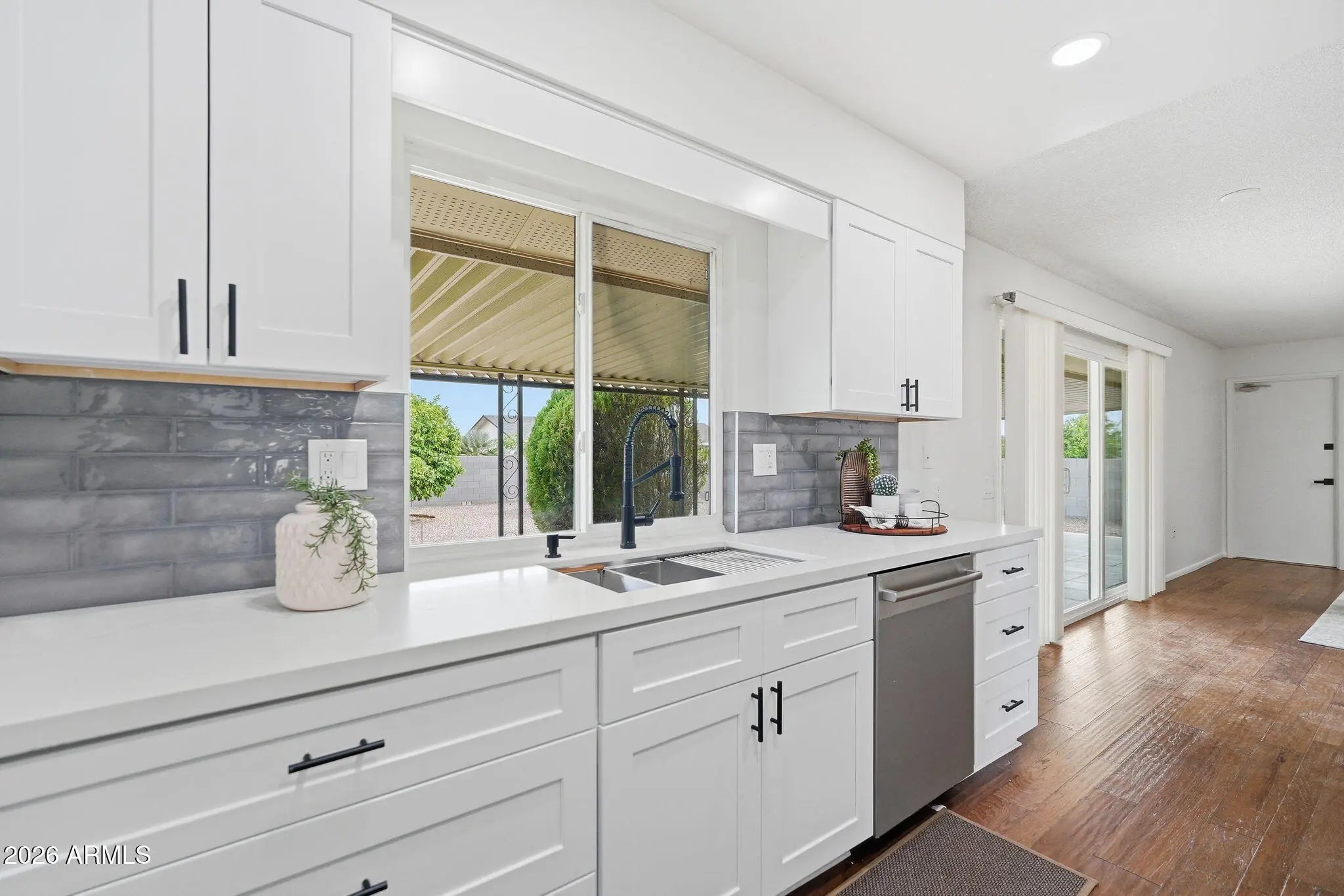 Welcome to this beautifully updated ranch-style home in Sun City! This move-in-ready 3 bed, 2 bath home offers an open floor plan with spacious living and dining areas--perfect for everyday living and entertaining. The fully renovated kitchen features white shaker cabinets with soft-close doors, quartz countertops, tile backsplash, and new stainless steel appliances. Upgrades include dual-pane windows, engineered hardwood flooring, fresh paint, updated bathrooms, and new lighting. Enjoy a huge covered patio and private backyard with mature landscaping, fruit trees, and block fencing. Oversized tandem garage offers ample storage and golf cart space. Close to shopping, dining, and golf--must see!