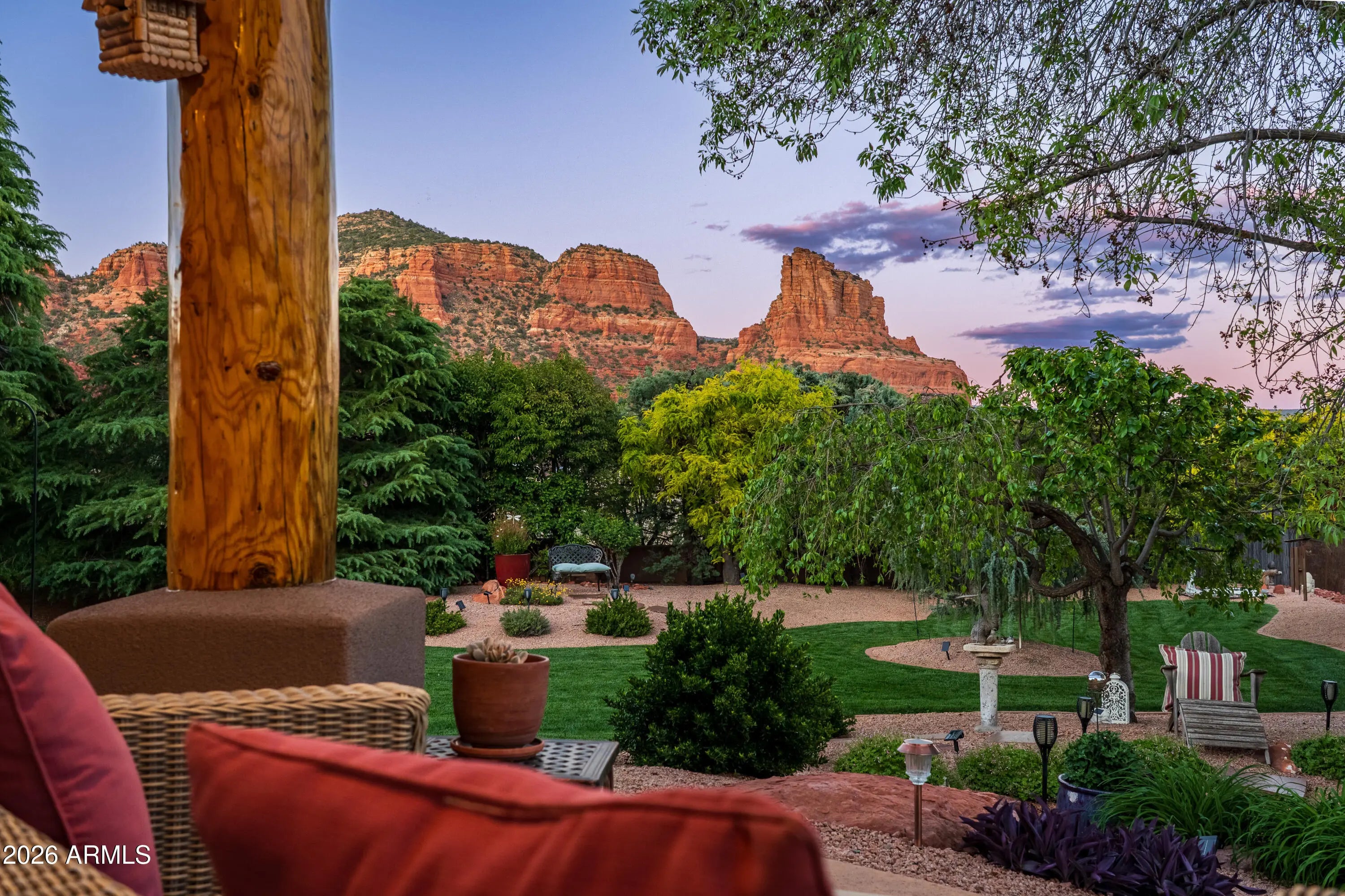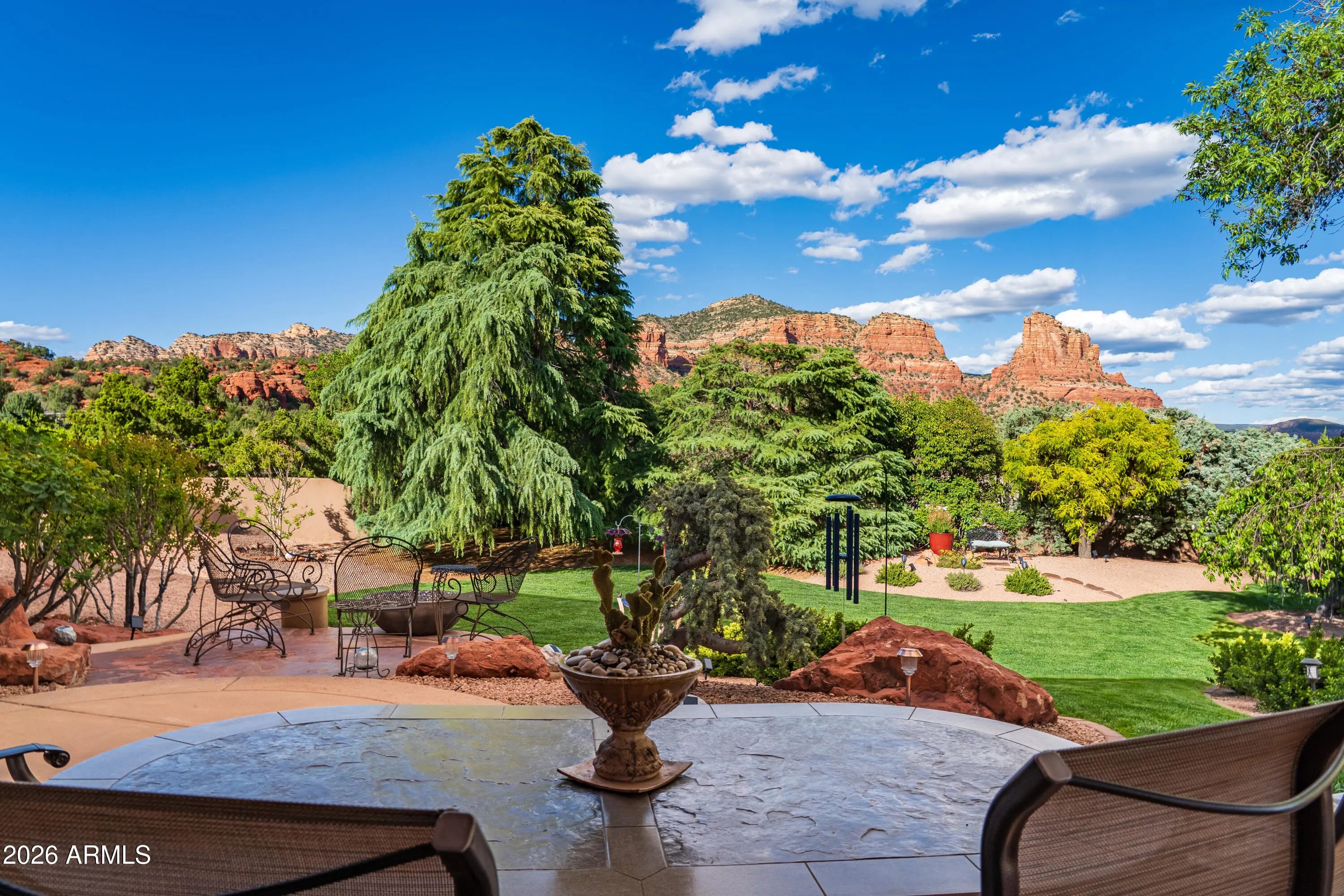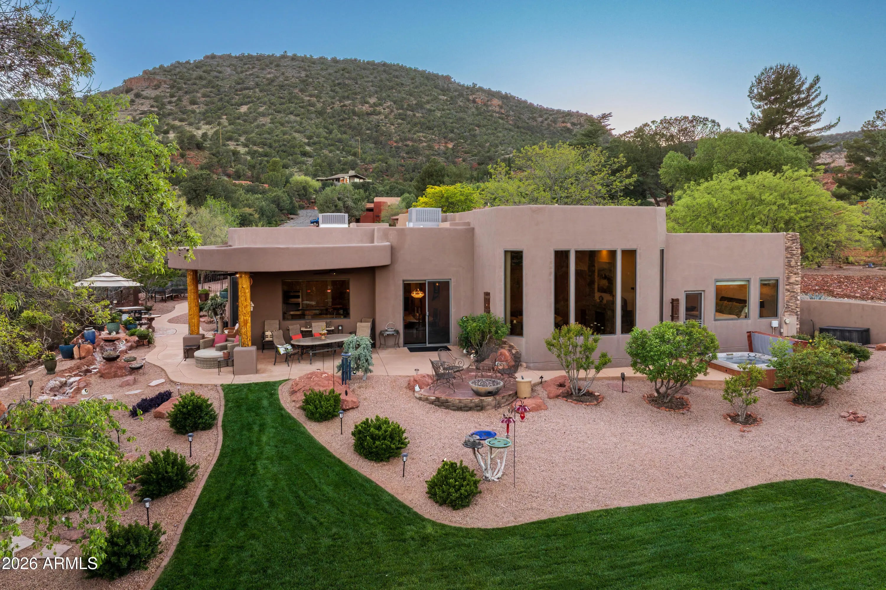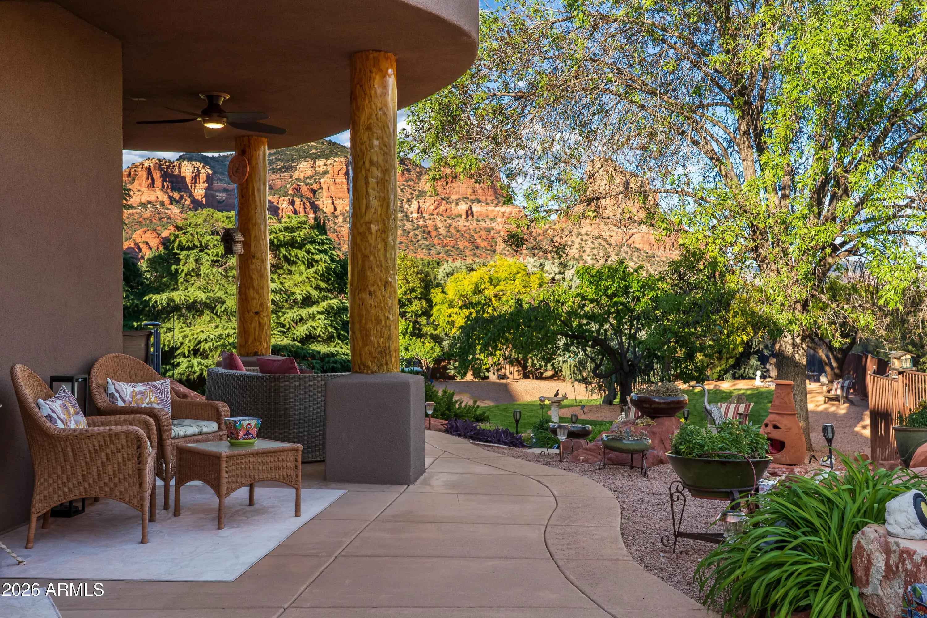 A lush and verdant landscape, stretching across the very private fully fenced backyard, can be seen from the floor to ceiling windows of the living room and most rooms of this meticulously maintained Santa Fe style home. Enchanting red rock views are showcased from the oversized windows in most every room in the home. Large open spaces, warm natural light, two gas fireplaces, rich maple and polished concrete floors, quiet cul-de-sac location, a 3-car oversized garage, a sumptuous water feature and above ground spa, and a split floor plan create a one of a kind aesthetic that can only truly be experienced in person. Don't miss this rare opportunity to own one of the finest homes Sedona has to offer. Turnkey and ready for you...a true hidden gem.