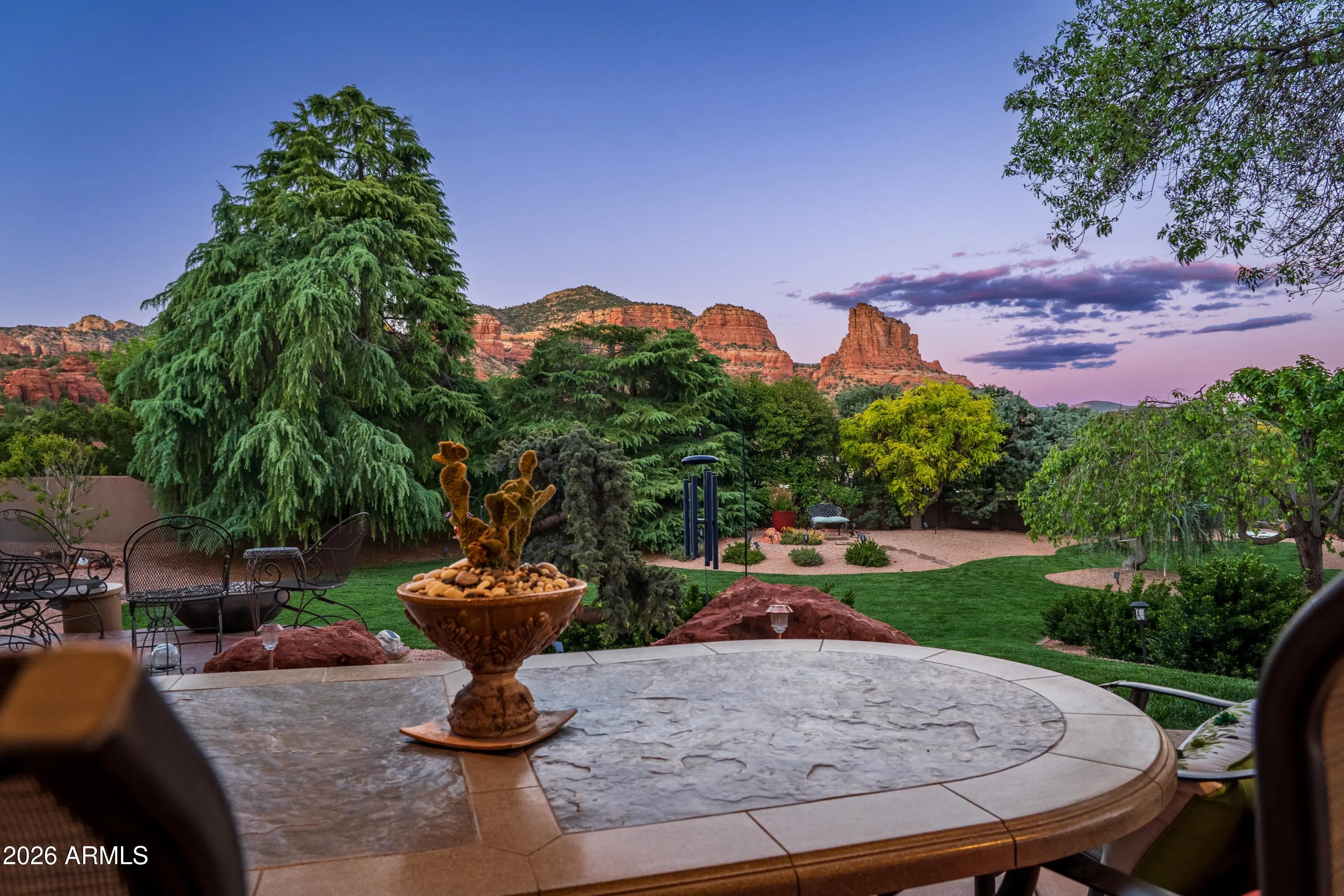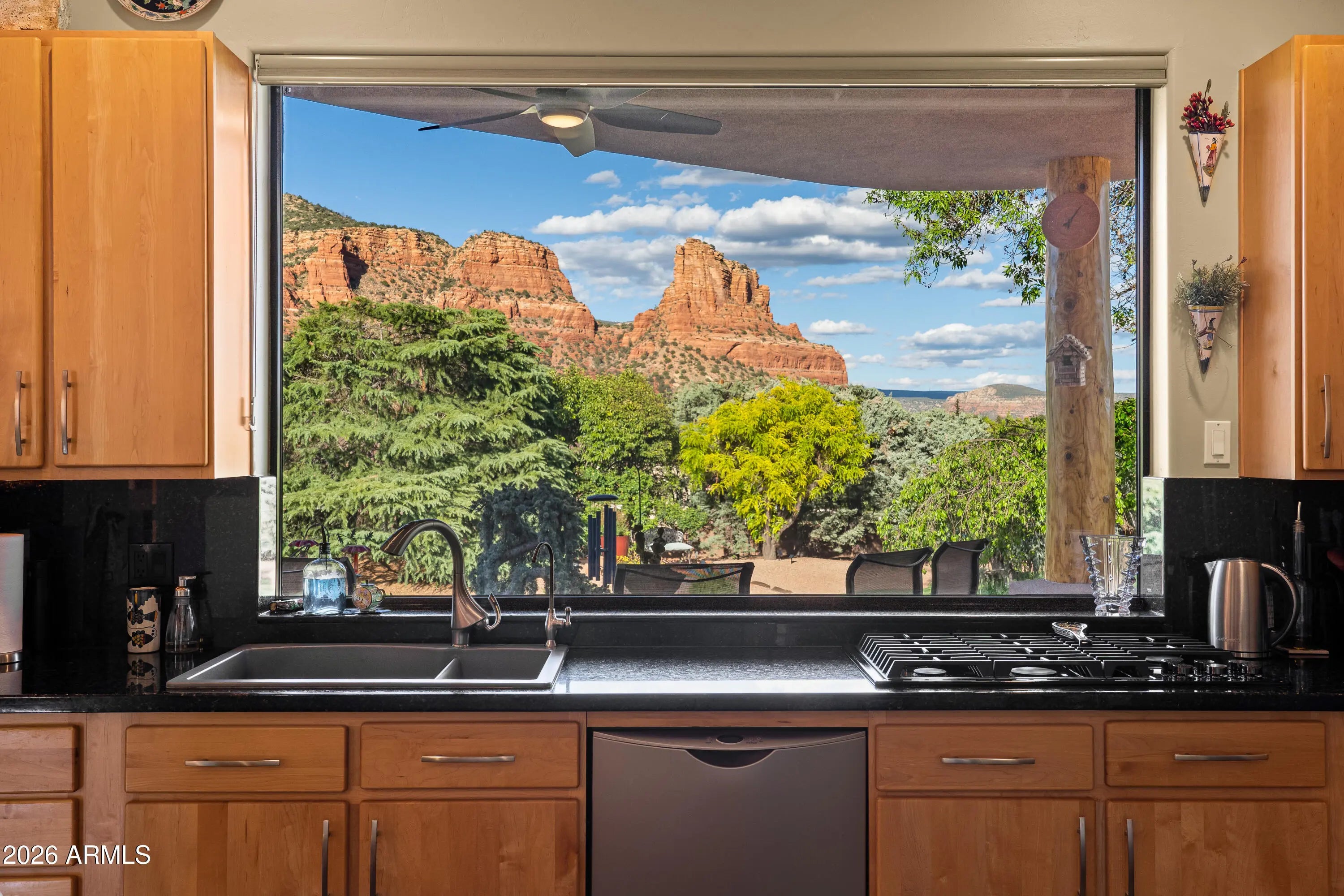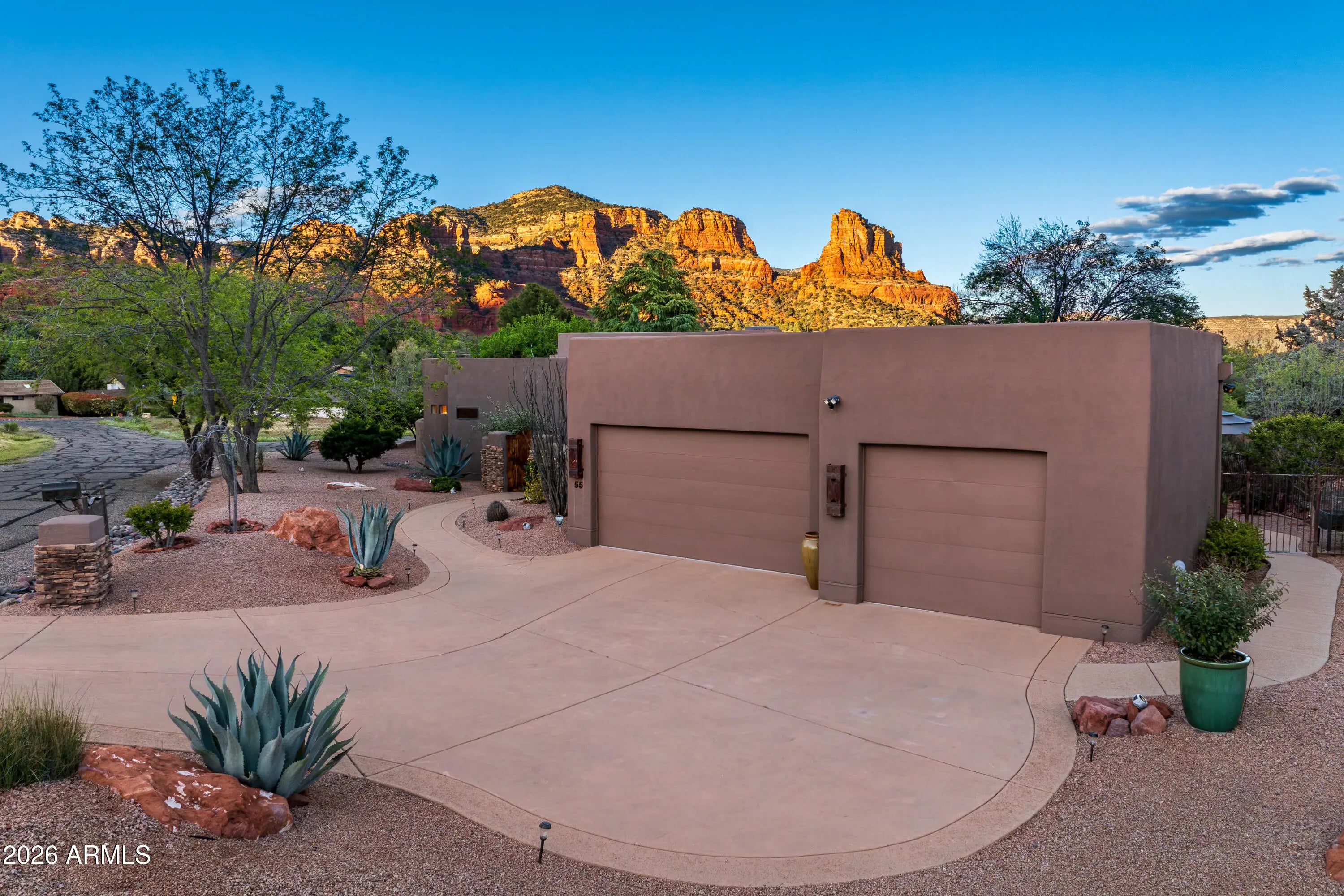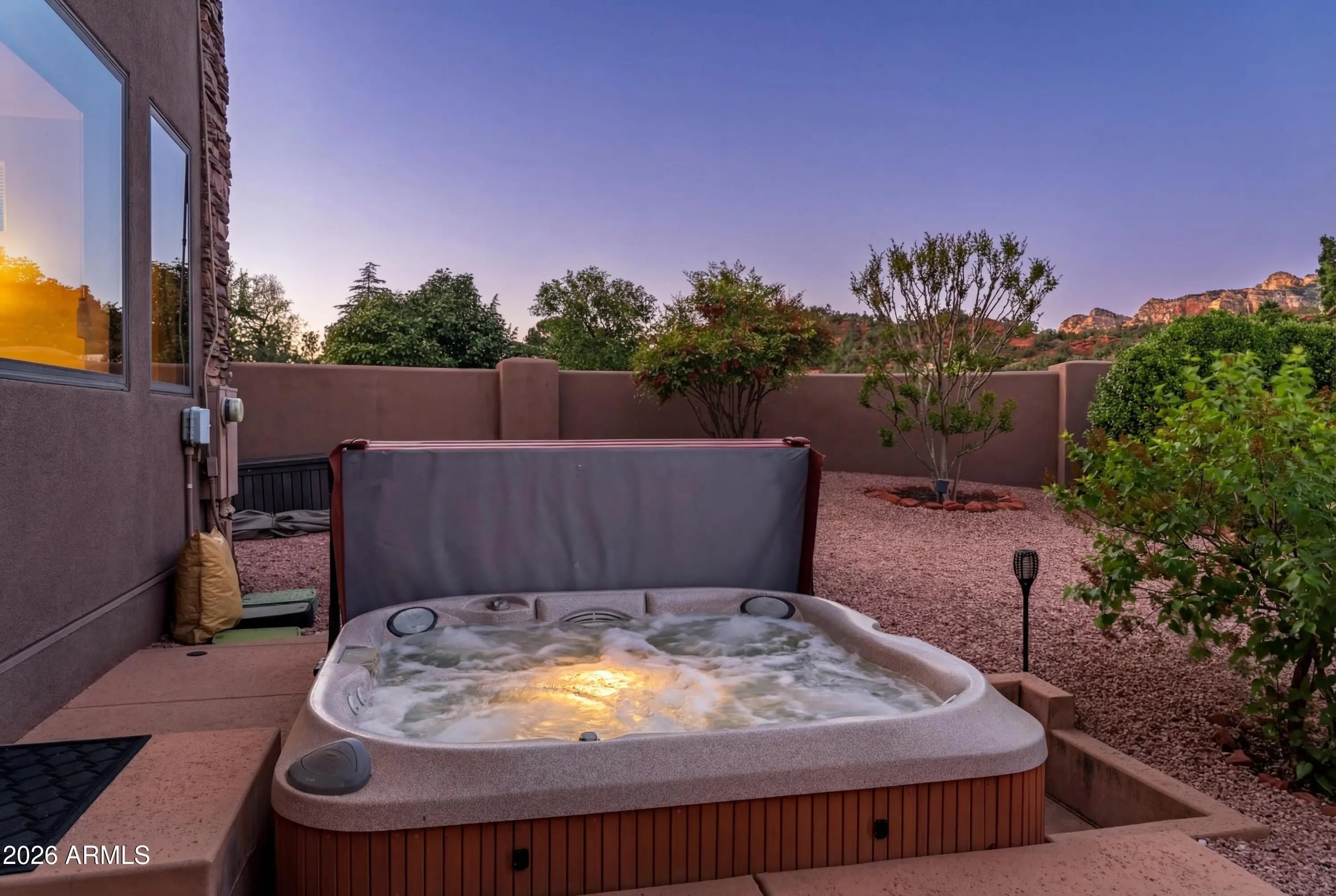 A lush and verdant landscape, stretching across the very private fully fenced backyard, can be seen from the floor to ceiling windows of the living room and most rooms of this meticulously maintained Santa Fe style home. Enchanting red rock views are showcased from the oversized windows in most every room in the home. Large open spaces, warm natural light, two gas fireplaces, rich maple and polished concrete floors, quiet cul-de-sac location, a 3-car oversized garage, a sumptuous water feature and above ground spa, and a split floor plan create a one of a kind aesthetic that can only truly be experienced in person. Don't miss this rare opportunity to own one of the finest homes Sedona has to offer. Turnkey and ready for you...a true hidden gem.