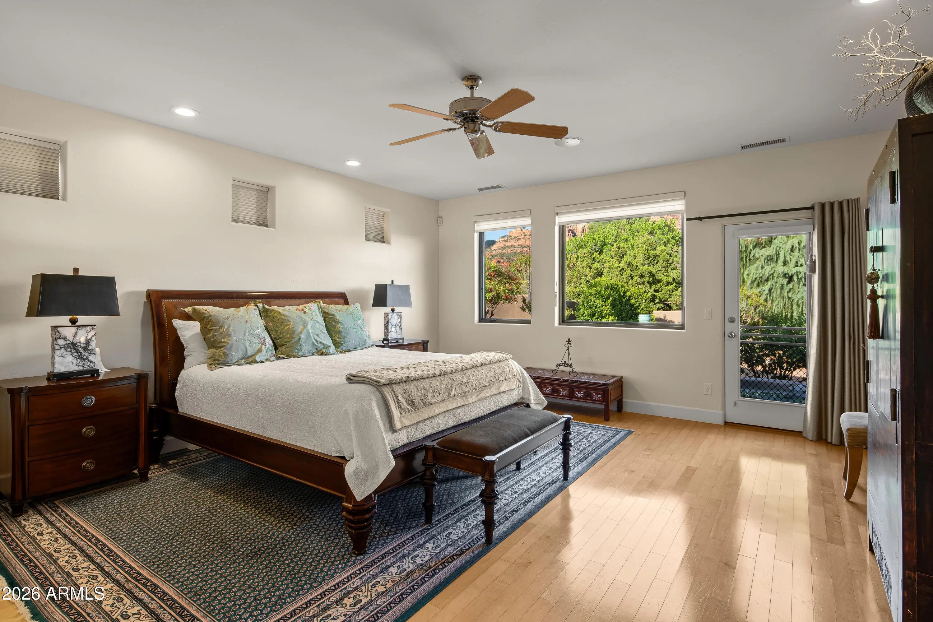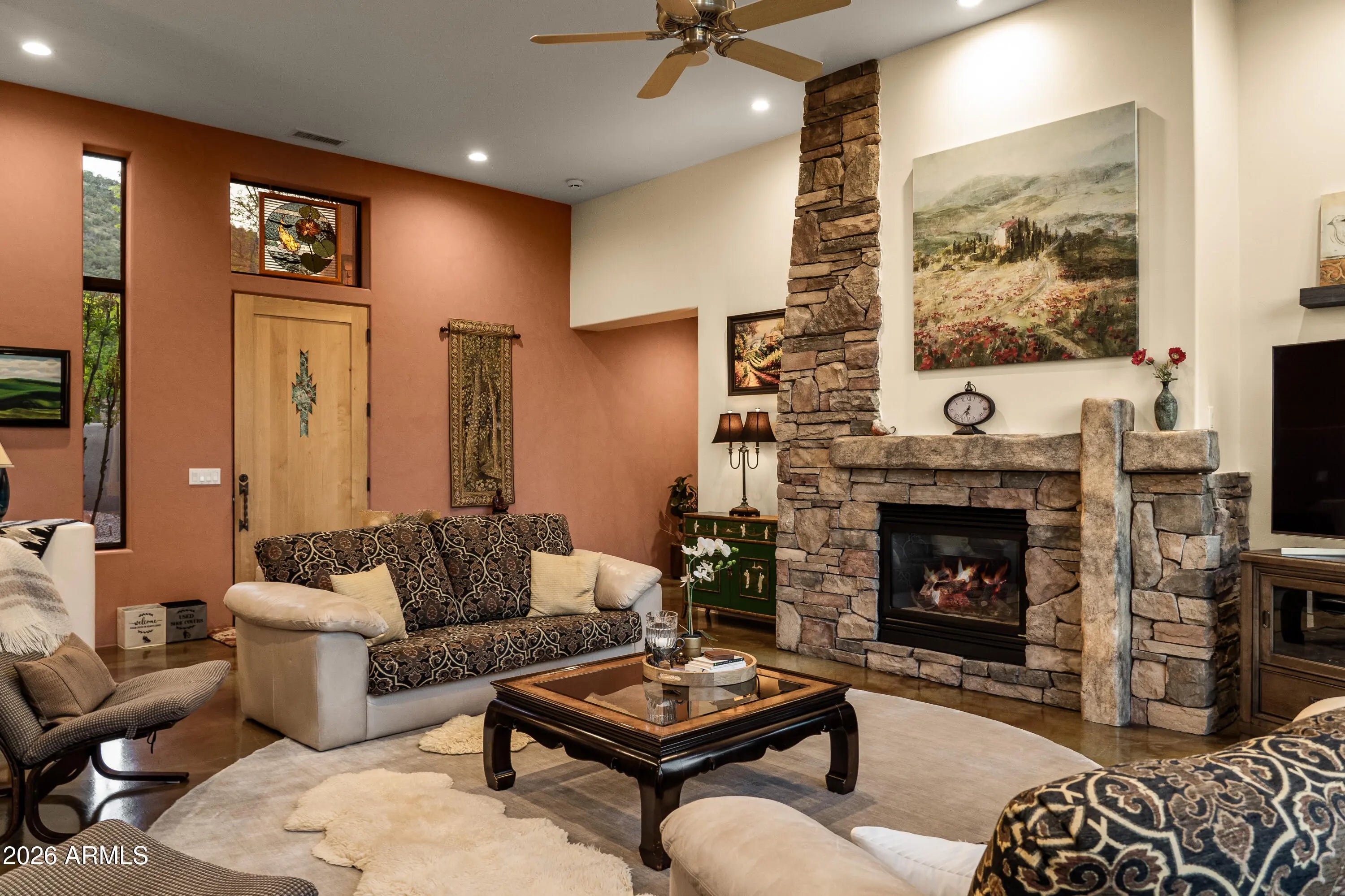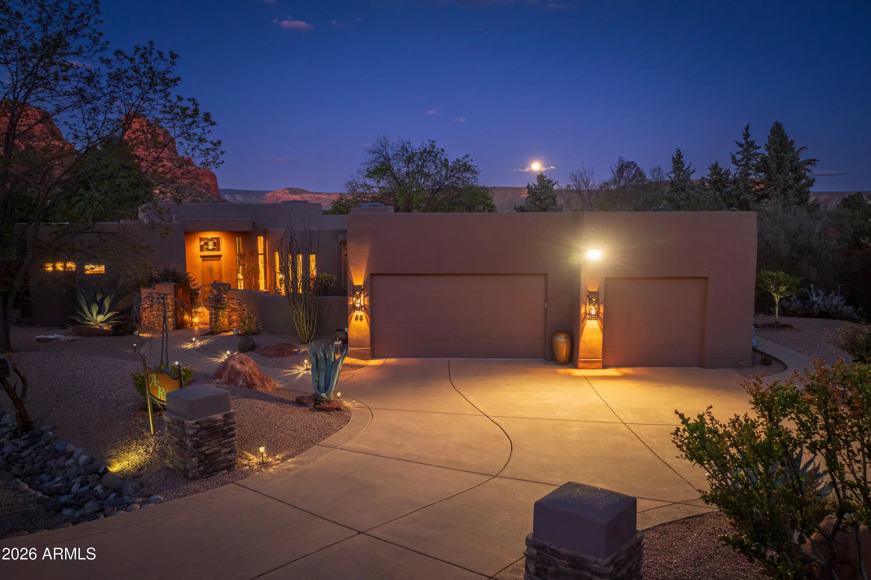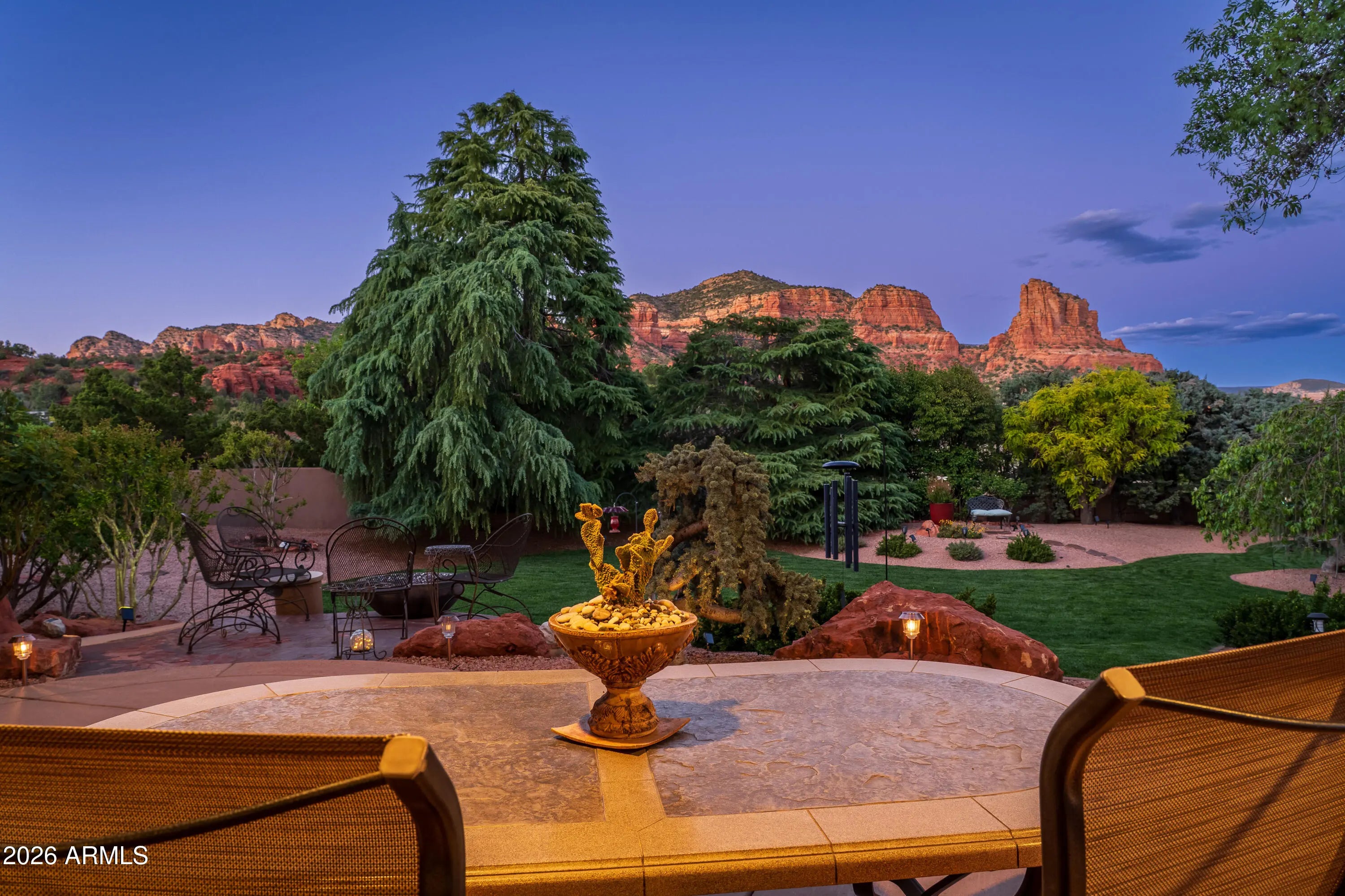 A lush and verdant landscape, stretching across the very private fully fenced backyard, can be seen from the floor to ceiling windows of the living room and most rooms of this meticulously maintained Santa Fe style home. Enchanting red rock views are showcased from the oversized windows in most every room in the home. Large open spaces, warm natural light, two gas fireplaces, rich maple and polished concrete floors, quiet cul-de-sac location, a 3-car oversized garage, a sumptuous water feature and above ground spa, and a split floor plan create a one of a kind aesthetic that can only truly be experienced in person. Don't miss this rare opportunity to own one of the finest homes Sedona has to offer. Turnkey and ready for you...a true hidden gem.