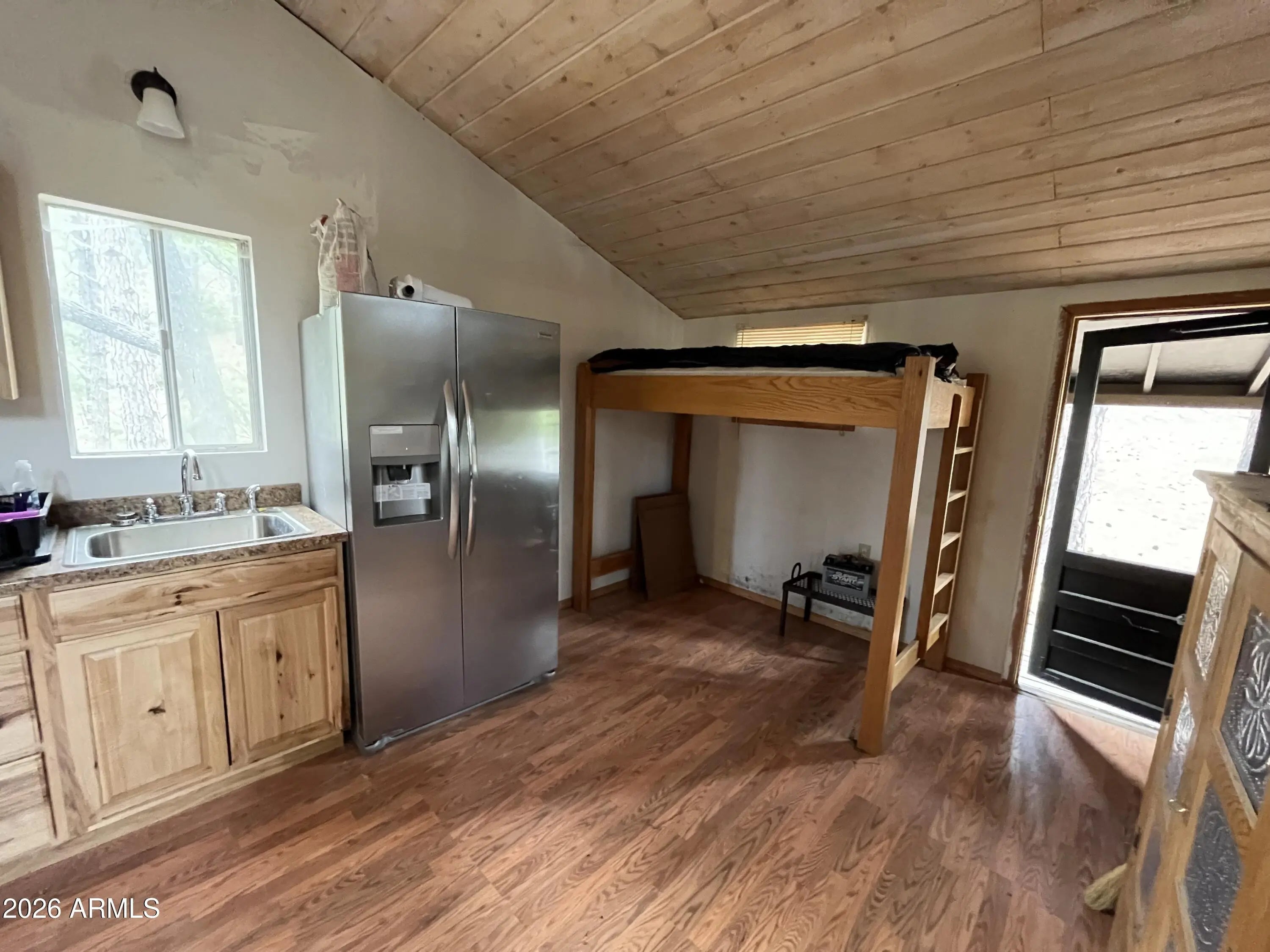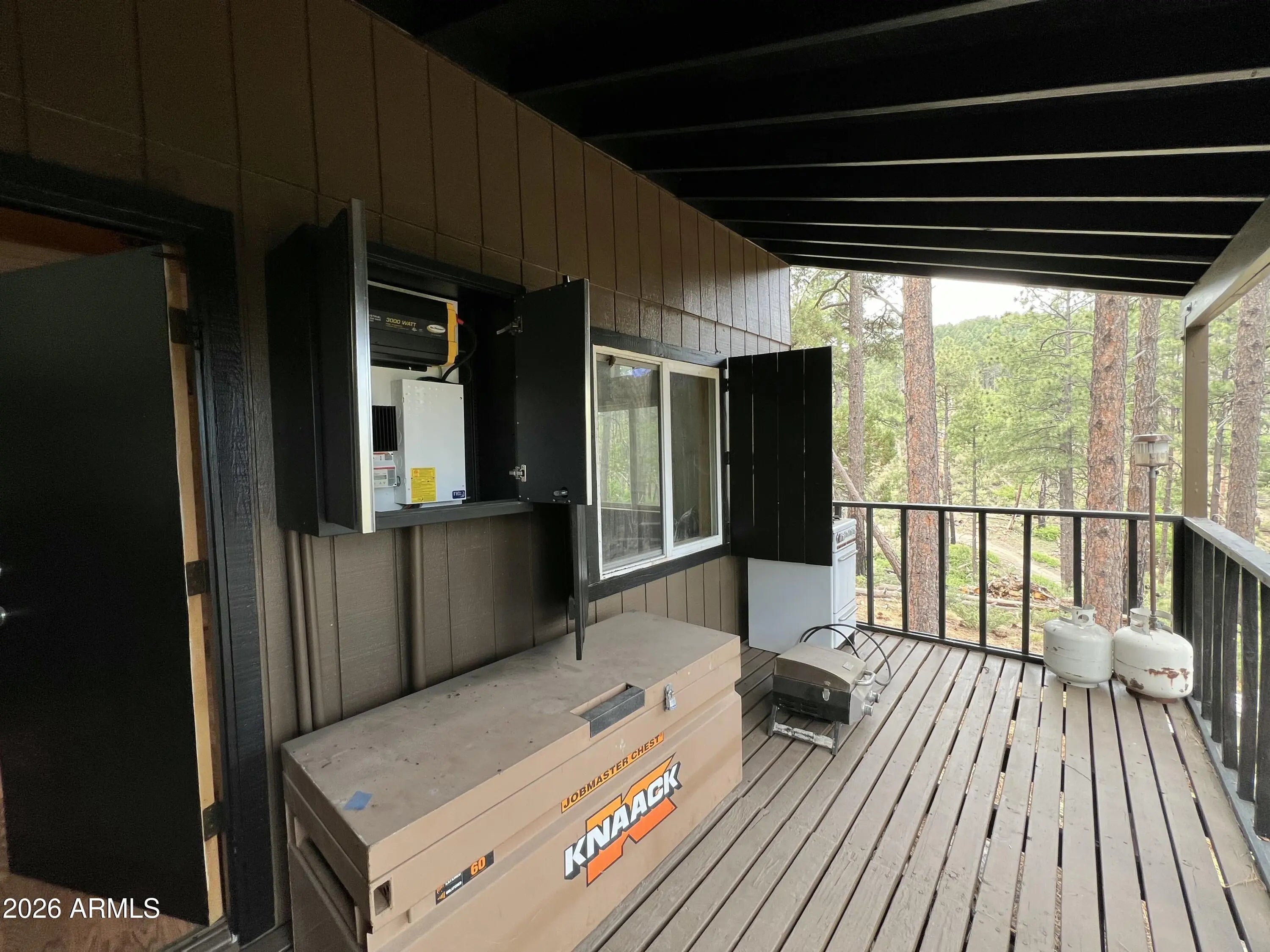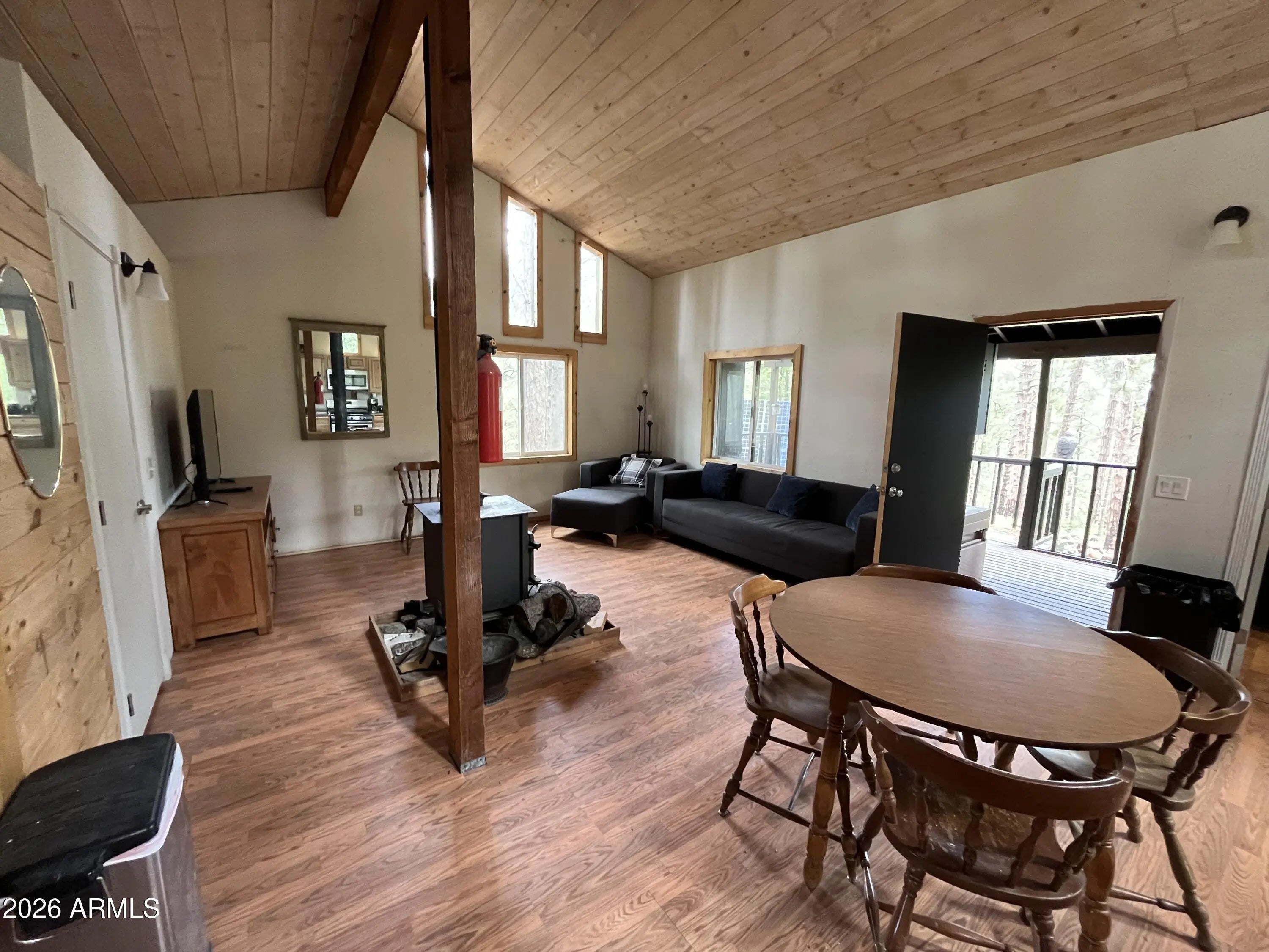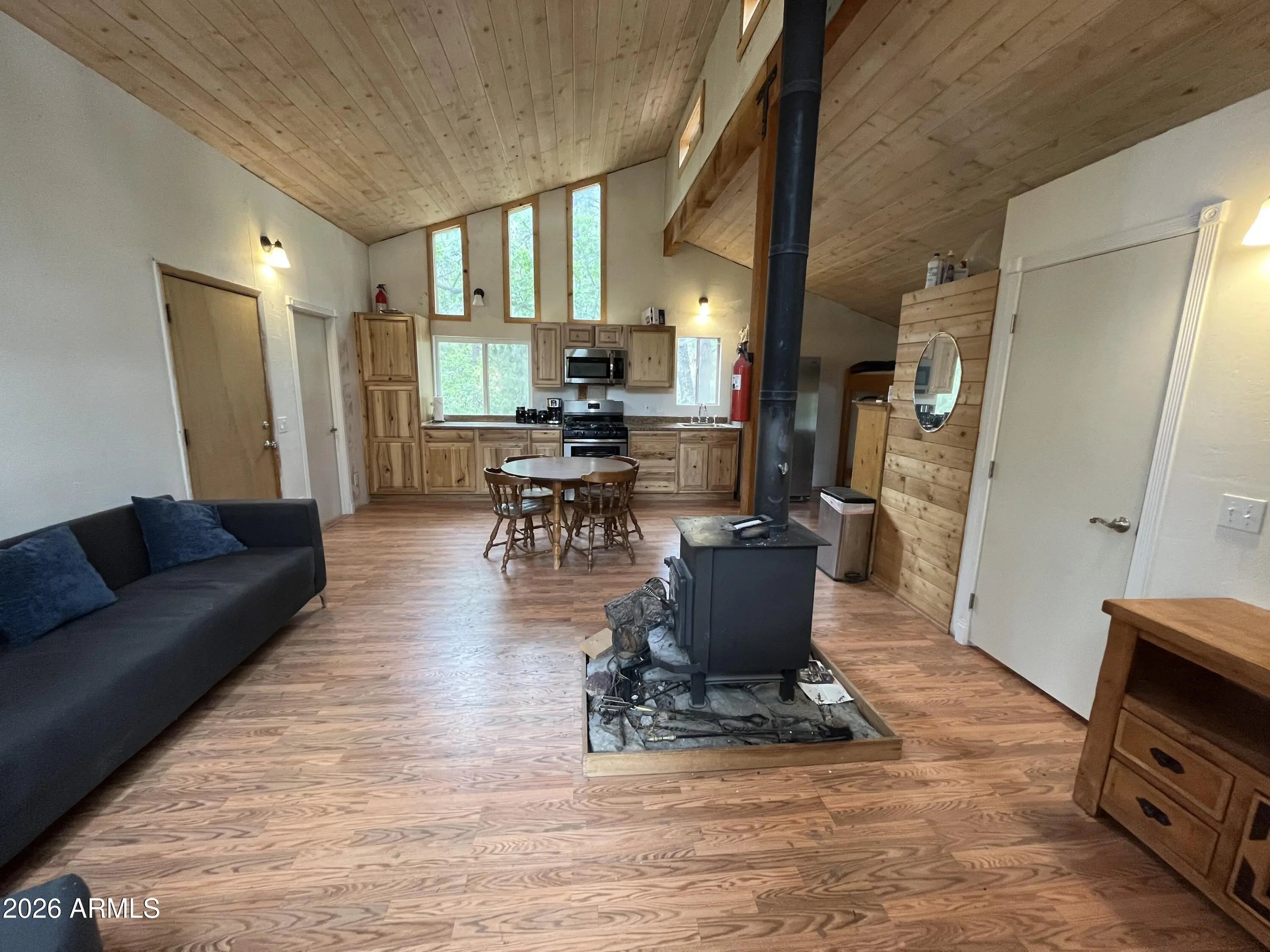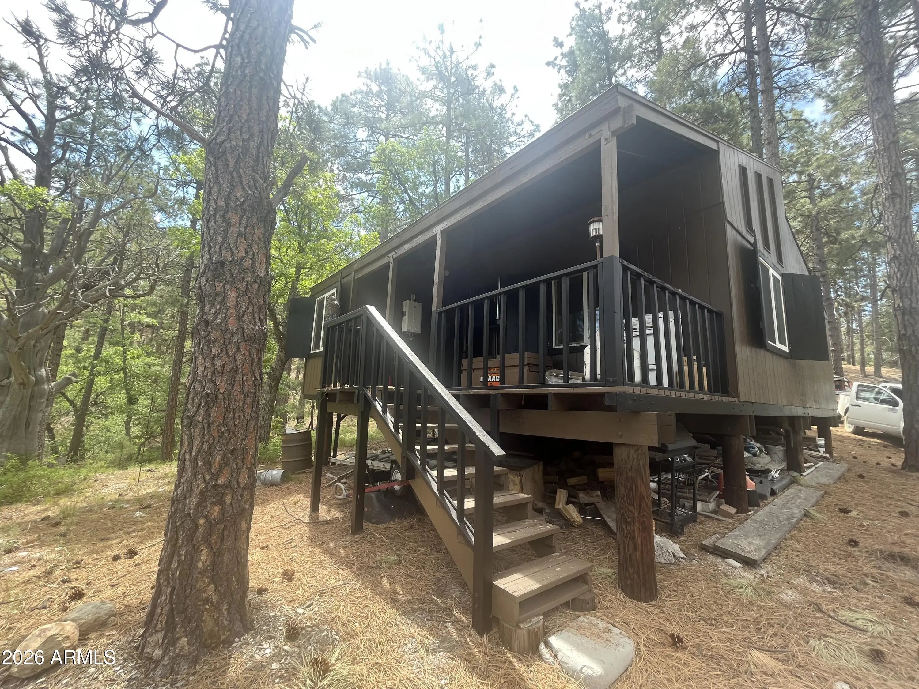 You will love this turn key off-grid cabin nestled high above Crown King at 7,000 feet elevation. Home features a gated entry located on 3 parcels totaling 10.34 aces. Cabin is surrounded by tall ponderosa pines and borders National Forest. Property is complete with well, septic and upgraded solar system. Enjoy the wildlife from the covered back deck. Open concept kitchen is perfect for entertaining guests. Kitchen features knotty pine cabinetry, Fridgidare appliances, propane oven and lots of natural light. Living room is spacious with a cozy wood stove. Wood beams and pine siding accents give this the perfect cabin feel. Home has storm windows for protection. 4x4 only, limited winter access. Locked gate. No access to property w/o permission. Additional acreage also available!
