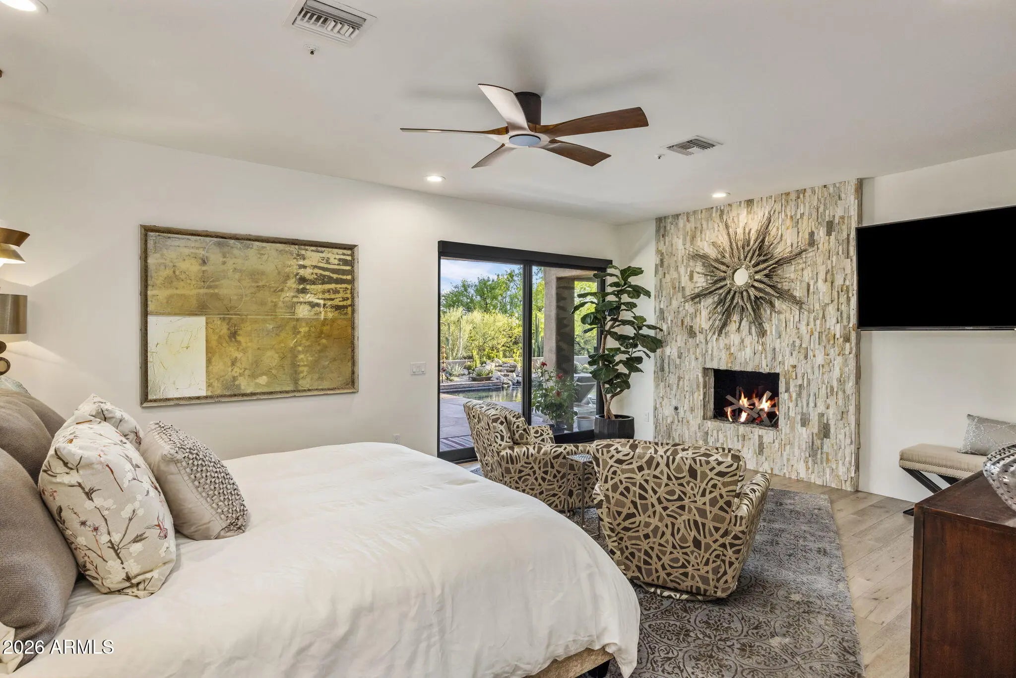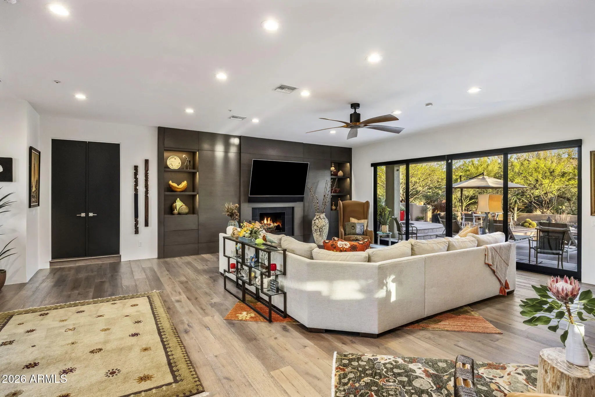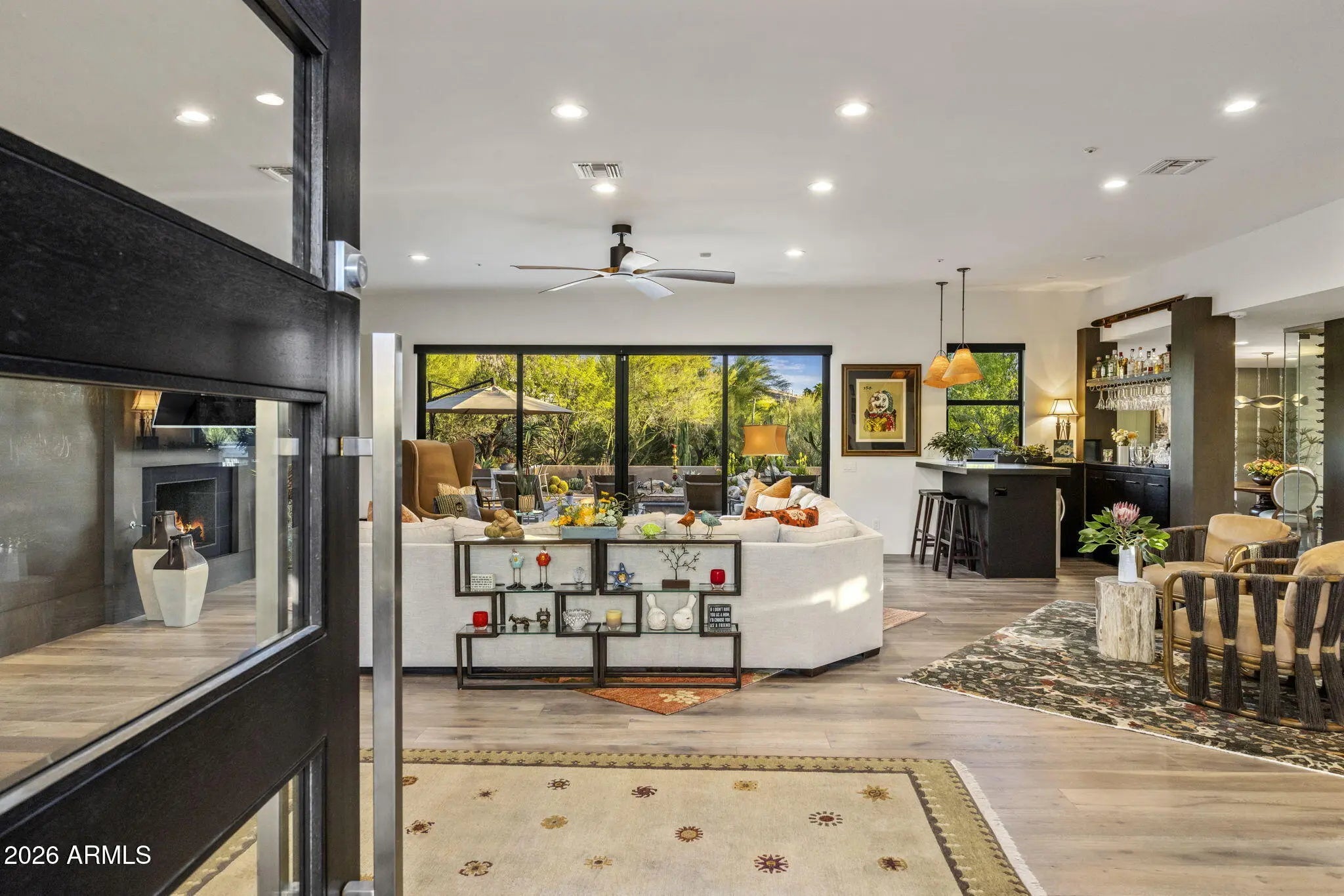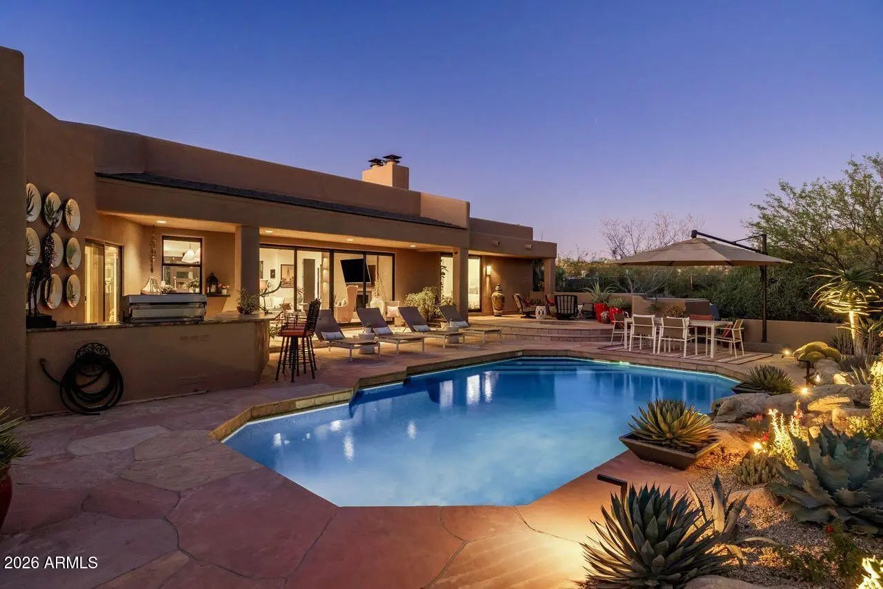 RARE Lifestyle/Social Membership immediately available with club approval. Tucked away on the end of a quiet cul-de-sac in Desert Mountain's Gambel Quail enclave, this soft desert contemporary single level estate offers over 4,200 sq. feet of refined living on a private, usable 1 acre+ lot with mountain views. Thoughtfully updated with a warm, modern aesthetic, the home features 4 spacious bedrooms, all ensuite, 2 half baths, and multiple indoor/outdoor living spaces designed for both comfort and entertaining. Featuring French oak hardwood floors throughout, complemented by new designer lighting and a cohesive, elevated finish palette. The kitchen is outfitted with premium Thermador appliances, double ovens, and opens to a stylish bar area and an impressive 700+ bottle wine wall just off the dining room. The primary suite is a true retreat, complete with a stacked stone fireplace and direct access to the outdoor living areas.Each bedroom enjoys its own patio access, creating a seamless indoor-outdoor lifestyle. The resort-style backyard has been completely reimagined with all new landscaping, and features an outdoor kitchen equipped with a pizza oven and smoker--ideal for entertaining under the Arizona sky. With three fireplaces, pool bath access, this home offers a rare blend of privacy, design, and functionality in one of North Scottsdale's most sought-after communities.
