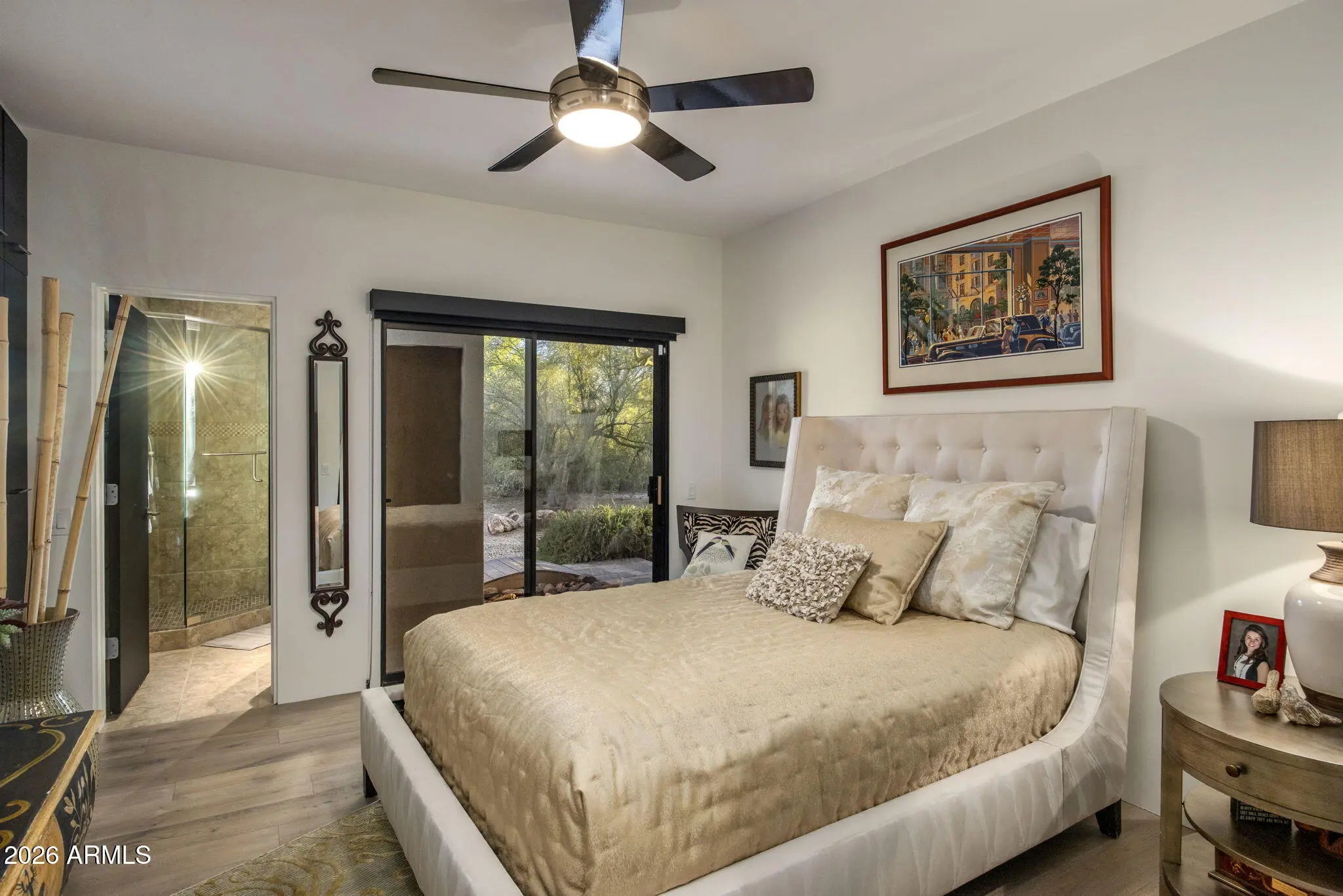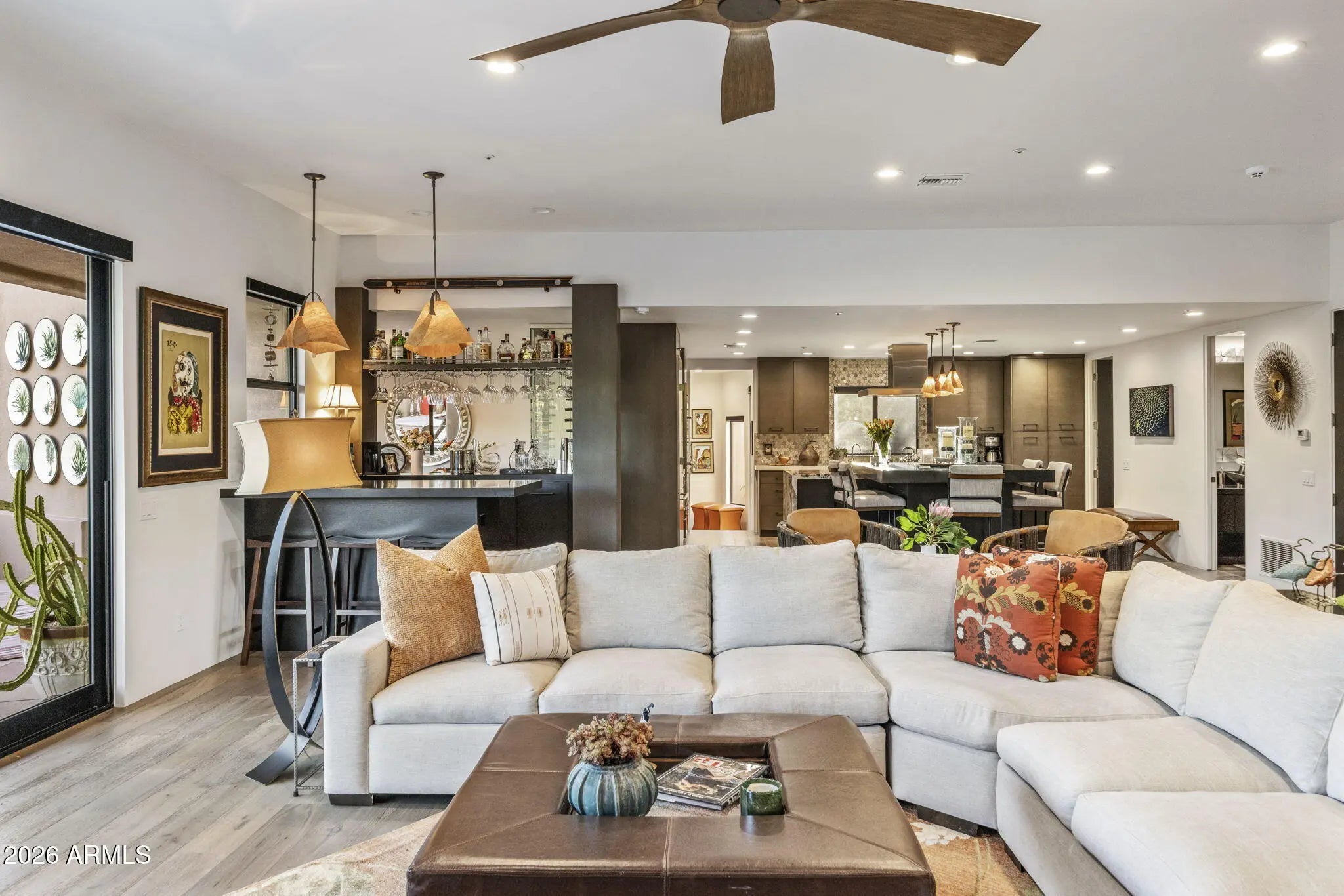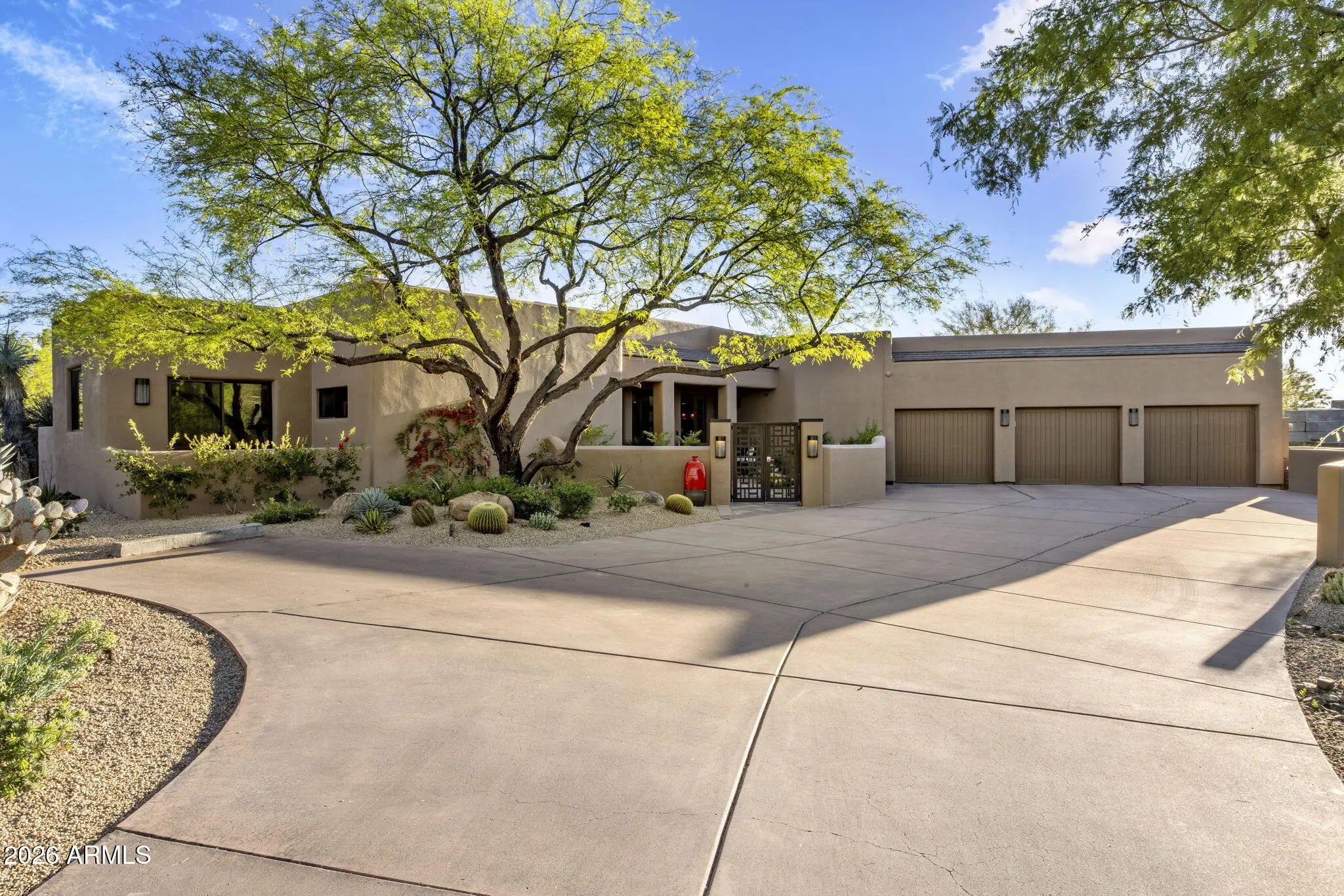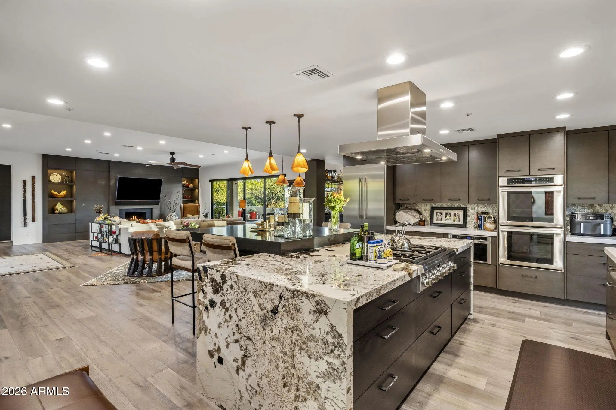 RARE Lifestyle/Social Membership immediately available with club approval. Tucked away on the end of a quiet cul-de-sac in Desert Mountain's Gambel Quail enclave, this soft desert contemporary single level estate offers over 4,200 sq. feet of refined living on a private, usable 1 acre+ lot with mountain views. Thoughtfully updated with a warm, modern aesthetic, the home features 4 spacious bedrooms, all ensuite, 2 half baths, and multiple indoor/outdoor living spaces designed for both comfort and entertaining. Featuring French oak hardwood floors throughout, complemented by new designer lighting and a cohesive, elevated finish palette. The kitchen is outfitted with premium Thermador appliances, double ovens, and opens to a stylish bar area and an impressive 700+ bottle wine wall just off the dining room. The primary suite is a true retreat, complete with a stacked stone fireplace and direct access to the outdoor living areas.Each bedroom enjoys its own patio access, creating a seamless indoor-outdoor lifestyle. The resort-style backyard has been completely reimagined with all new landscaping, and features an outdoor kitchen equipped with a pizza oven and smoker--ideal for entertaining under the Arizona sky. With three fireplaces, pool bath access, this home offers a rare blend of privacy, design, and functionality in one of North Scottsdale's most sought-after communities.