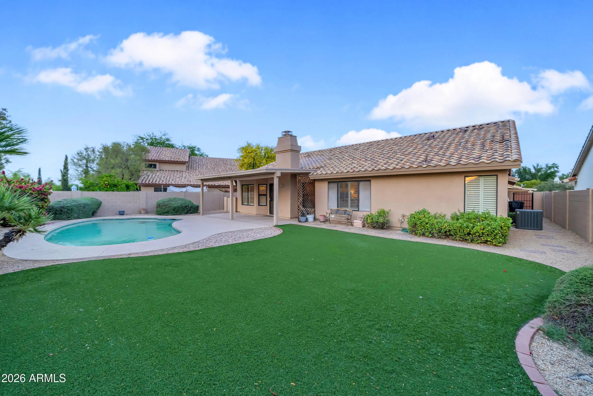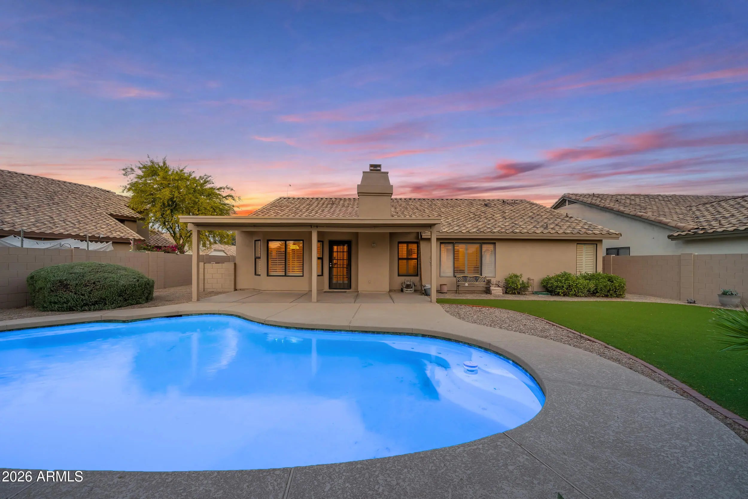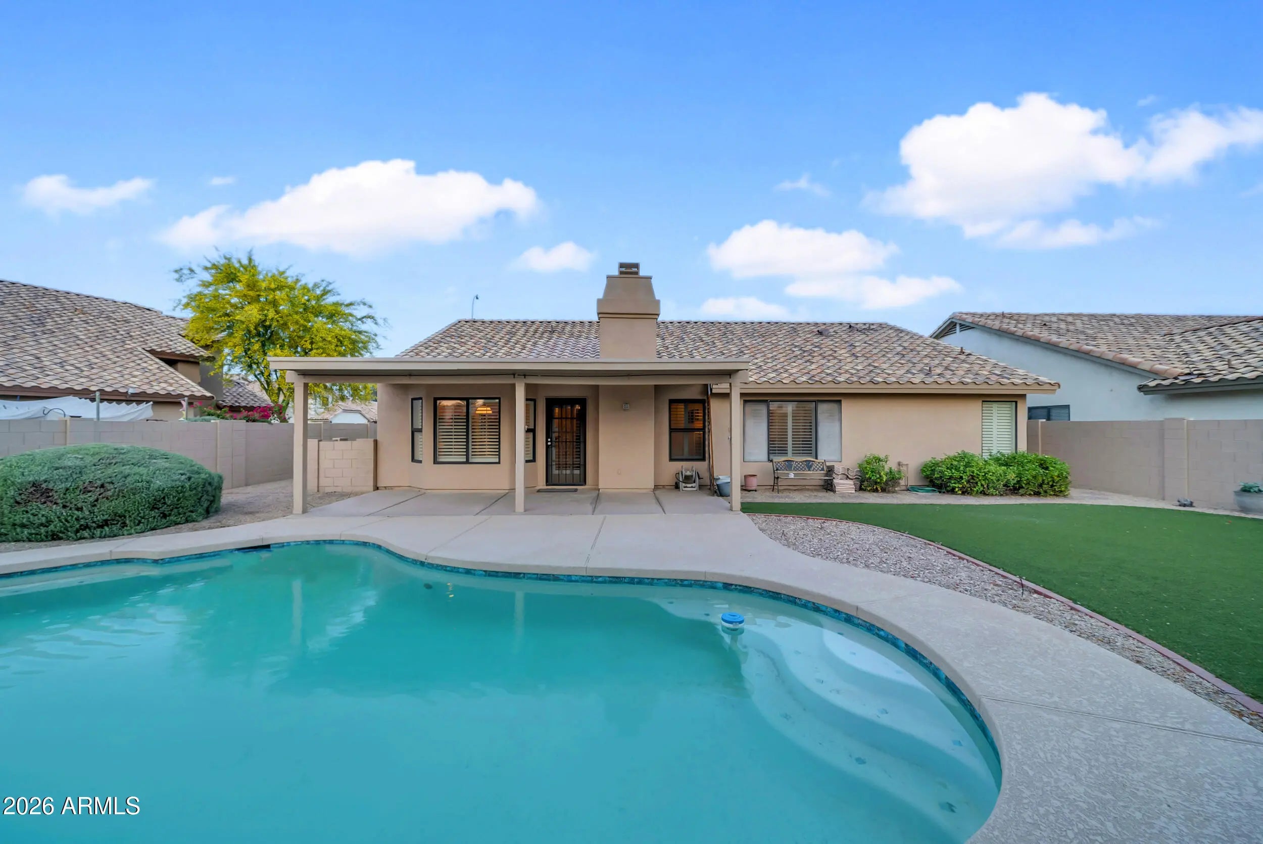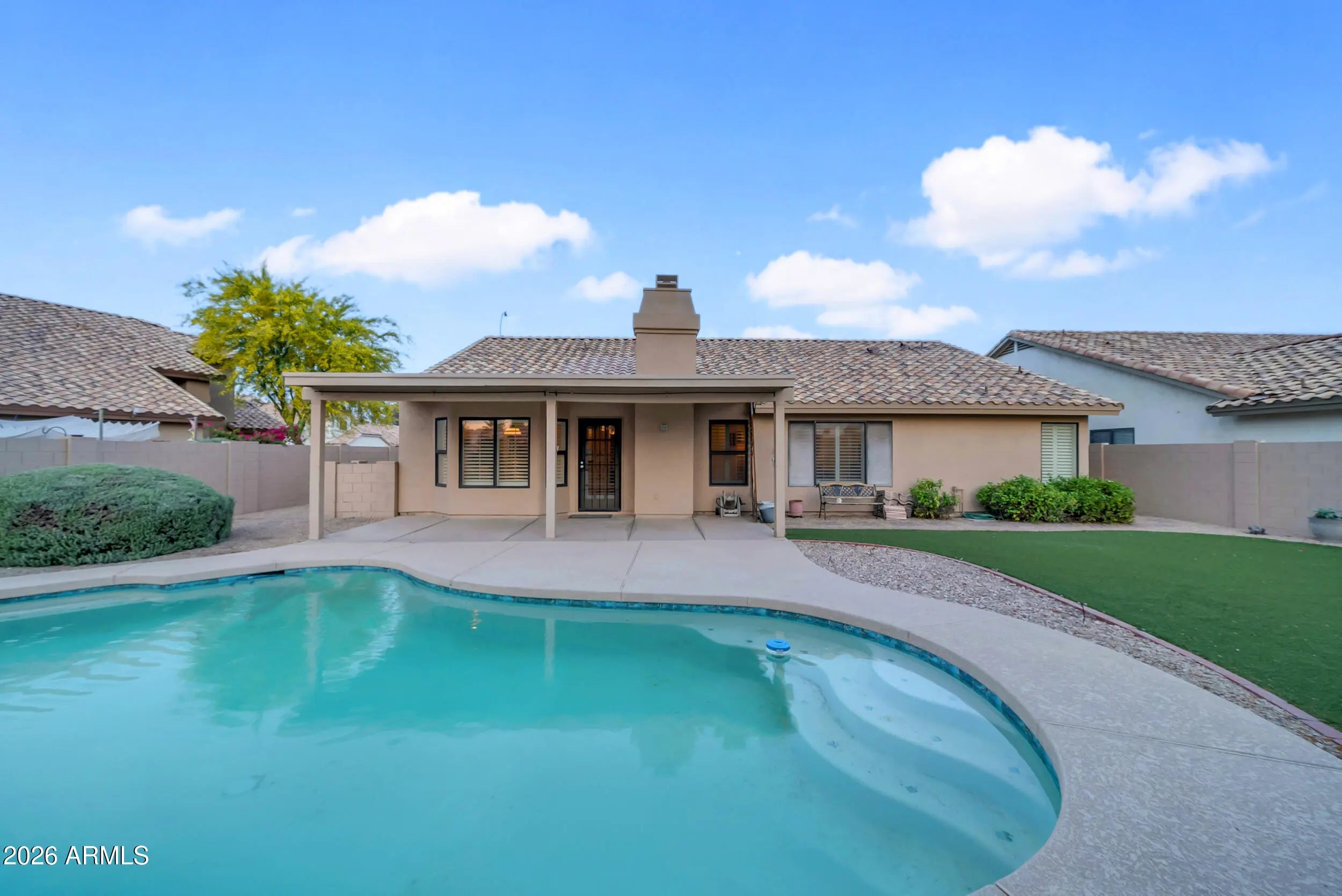 Welcome to Parkside Meadows in Chandler, where this charming 3 bedroom, 2 bath home offers a warm and inviting space with a smart and easy floor plan. From the moment you walk in, you will notice the fresh paint, clean lines, and beautiful mix of wood flooring and tile that flow all through the home, along with plantation shutters that add style and soft light in every room. There is a formal dining room for special meals, a cozy family room for relaxing nights, and a separate living room that gives you space to spread out and enjoy time with family and friends. The open kitchen sits at the center of the home and features an eat-in area that is perfect for morning coffee or easy meals, making it a great place to gather each day. A new roof installed in 2026 gives added peace of mind and Step outside to a large backyard built for both fun and quiet moments, complete with easy-care synthetic grass, a sparkling pool, and an extended patio that is ready for outdoor dining or weekend get-togethers. With no one behind you, you can enjoy open views and take in the beauty of Arizona sunsets right from your own yard. The location makes life even better, with quick access to the Loop 101 and Loop 202, and just minutes away from shopping, dining, and entertainment at Chandler Fashion Center, giving you both ease at home and convenience all around.