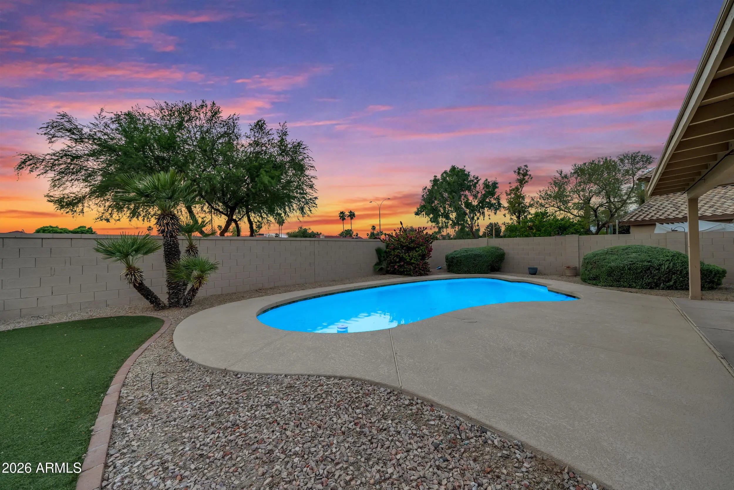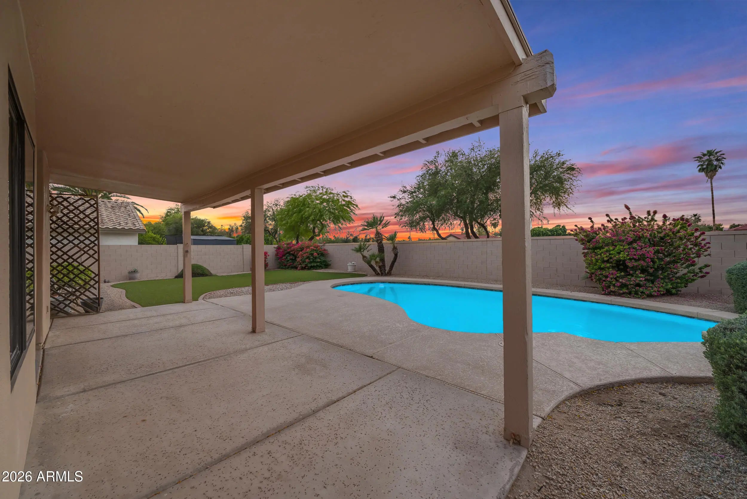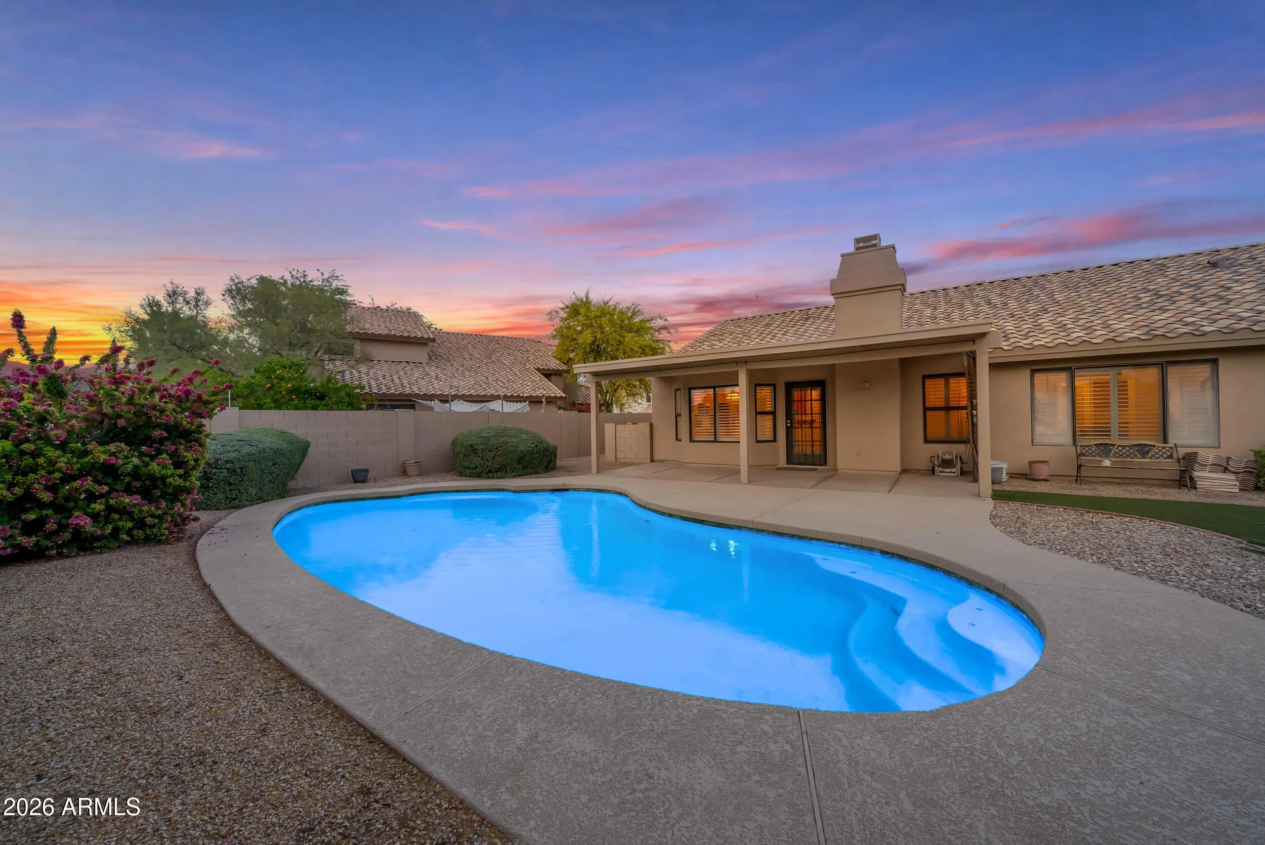 Welcome to Parkside Meadows in Chandler, where this charming 3 bedroom, 2 bath home offers a warm and inviting space with a smart and easy floor plan. From the moment you walk in, you will notice the fresh paint, clean lines, and beautiful mix of wood flooring and tile that flow all through the home, along with plantation shutters that add style and soft light in every room. There is a formal dining room for special meals, a cozy family room for relaxing nights, and a separate living room that gives you space to spread out and enjoy time with family and friends. The open kitchen sits at the center of the home and features an eat-in area that is perfect for morning coffee or easy meals, making it a great place to gather each day. A new roof installed in 2026 gives added peace of mind and Step outside to a large backyard built for both fun and quiet moments, complete with easy-care synthetic grass, a sparkling pool, and an extended patio that is ready for outdoor dining or weekend get-togethers. With no one behind you, you can enjoy open views and take in the beauty of Arizona sunsets right from your own yard. The location makes life even better, with quick access to the Loop 101 and Loop 202, and just minutes away from shopping, dining, and entertainment at Chandler Fashion Center, giving you both ease at home and convenience all around.