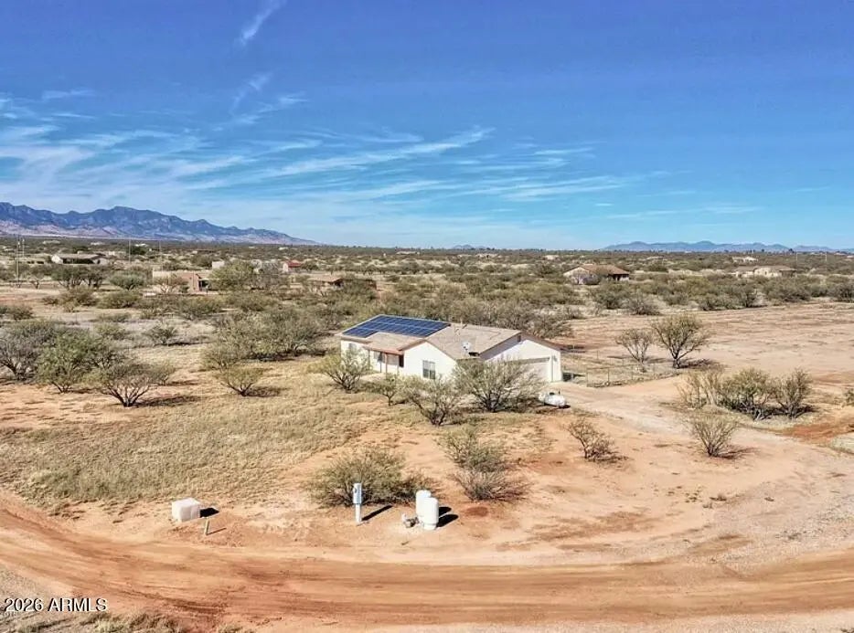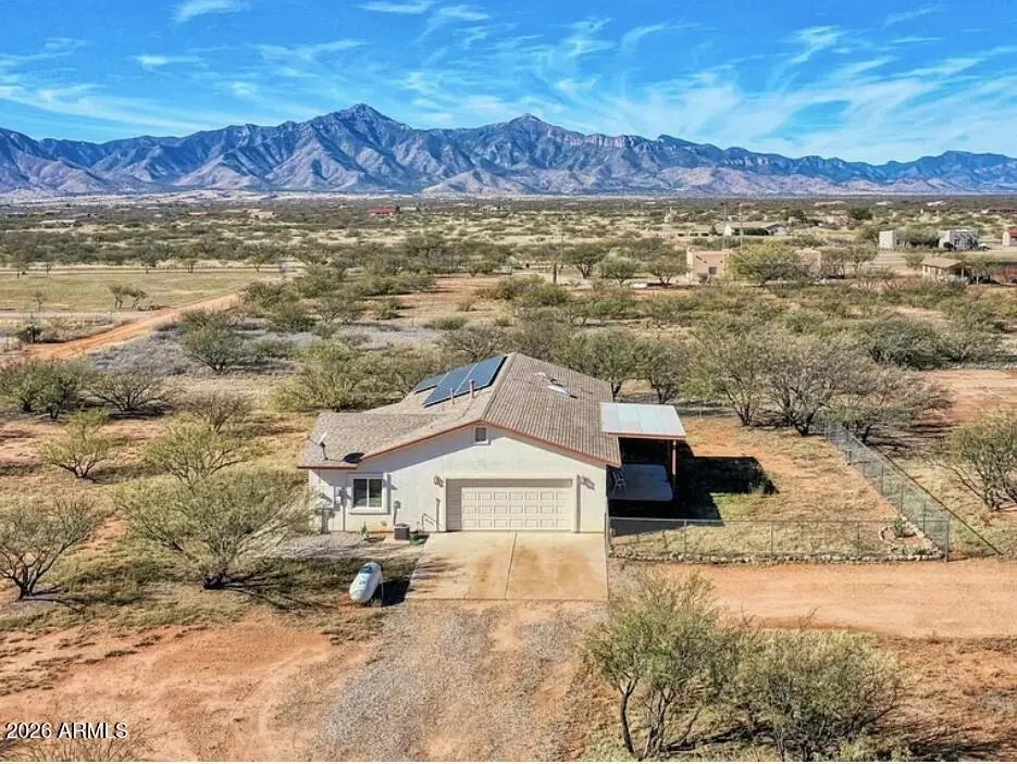 Situated on 4 acres of level, usable land, this 4-bedroom, 2-bath residence showcases sweeping mountain views and the benefit of 7 years of prepaid solar. The layout offers an open living concept that flows naturally for both daily living and hosting. The kitchen provides generous cabinet space, a central island with bar seating, and a gas cooktop. Modern lighting, updated ceiling fans, and strong natural light create a bright interior, complemented by tile flooring throughout the main areas. A split-bedroom design enhances privacy, featuring a well-sized primary suite with walk-in closet. The attached 2-car garage includes laundry connections. Outdoor space is separated for functionality, with a fenced section and a distinctive historical tie to a former World War II airstrip