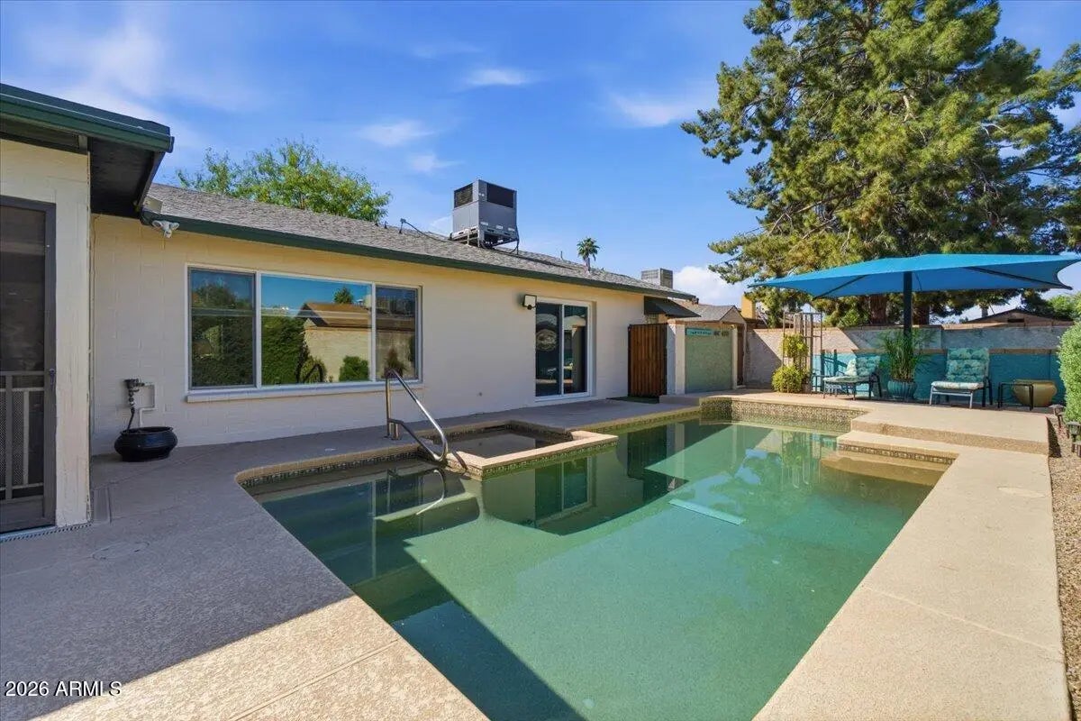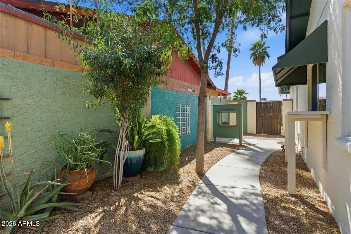 This home bursts with pride of ownership. Located in Central Chandler on a north/south facing lot, no HOA, this single level home has been well maintained. Three spacious bedrooms, 2 full bathrooms including a walk-in shower in the guest bathroom. The kitchen has plenty of cabinet & pantry, corion counter tops, dual ovens, stainless steel appliances, open to the dining & sitting area by the beehive fireplace. Relax in the the large living, enjoy views of the lush backyard. You will find peace & quiet in the multiple sitting areas around the home including the private gated front porch overlooking the yard & garden bed, the side yard, the enclosed Arizona room, or under the umbrella by the pebble-tech, Lake Tahoe colored pool. Don't miss the garage work bench & French cleat hanging system. and privacy shades in the garage. This home has so many bonus features include solar tube lights for natural light, screen door, freshly painted exterior, living room and bedroom. The wood burning fire place with electric insert. Enjoy your own private yard space with no overlooking neighbors or Shawnee Park & Dog Park just down the street.