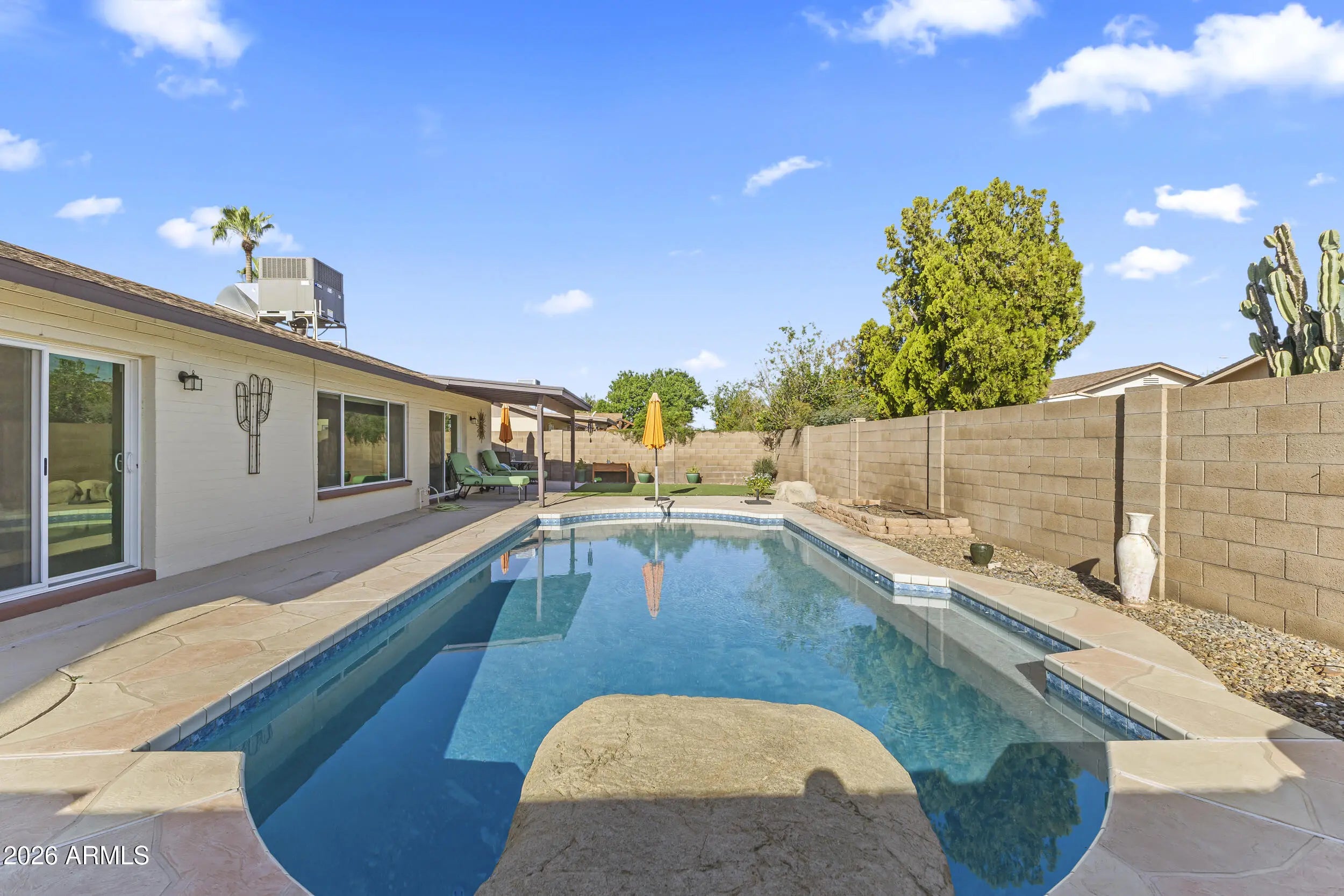 Step into your spacious home with a pool, located in a highly desirable area near shopping, dining, and easy freeway access. This updated block home in Glendale shows true pride of ownership throughout. Step inside to an open and inviting layout featuring a remodeled kitchen with granite countertops, upgraded cabinetry and newer appliances. Both bathrooms have been tastefully updated with clean, modern finishes. This home also features updated doors, fixtures, switches, and finishes throughout, giving it a fresh, move-in ready feel without the need for immediate upgrades. The backyard is where this home really stands out -- a remodeled pool with pebble finish, unique stepping stones. Perfect time to enjoy your new pool!