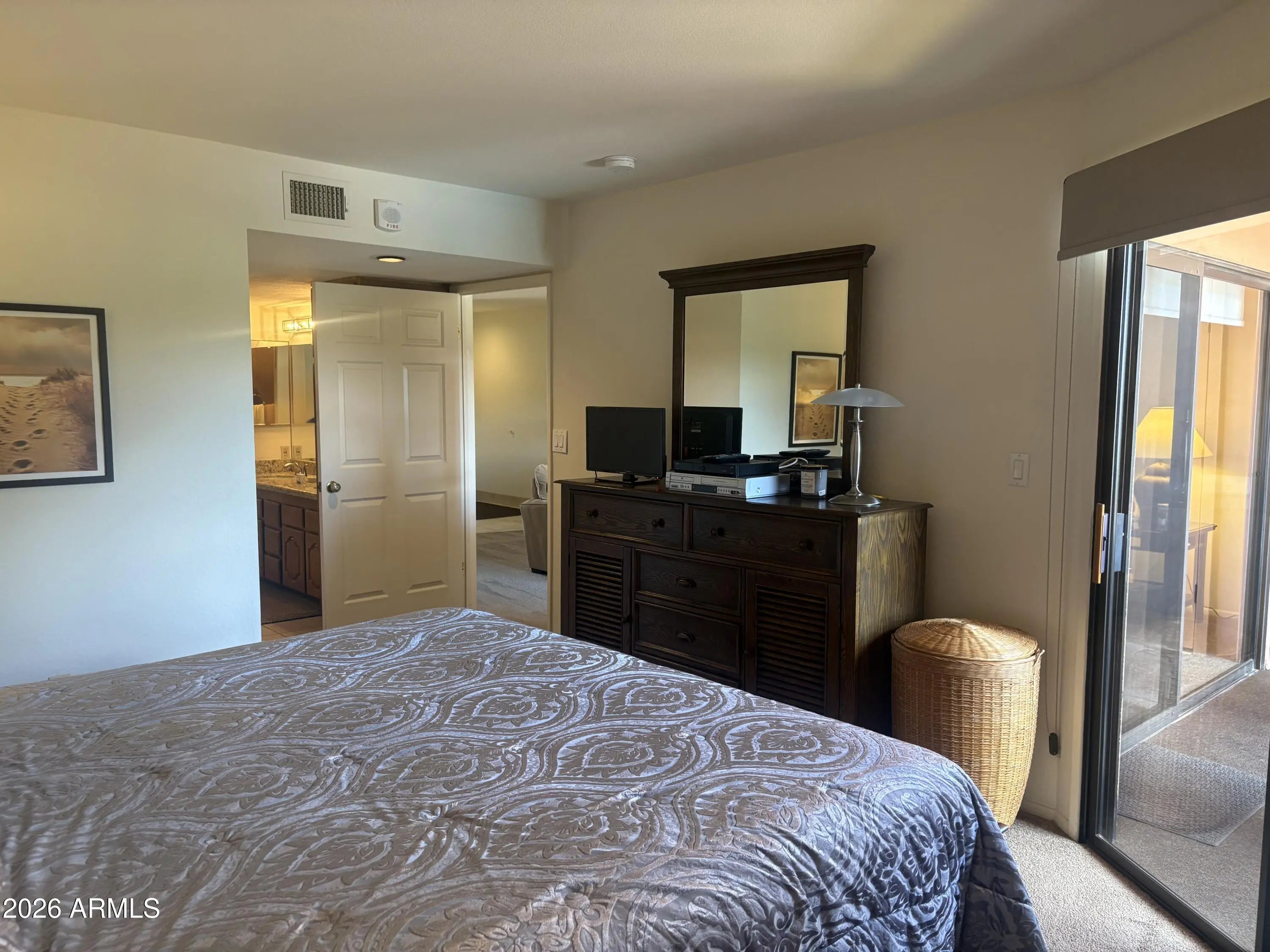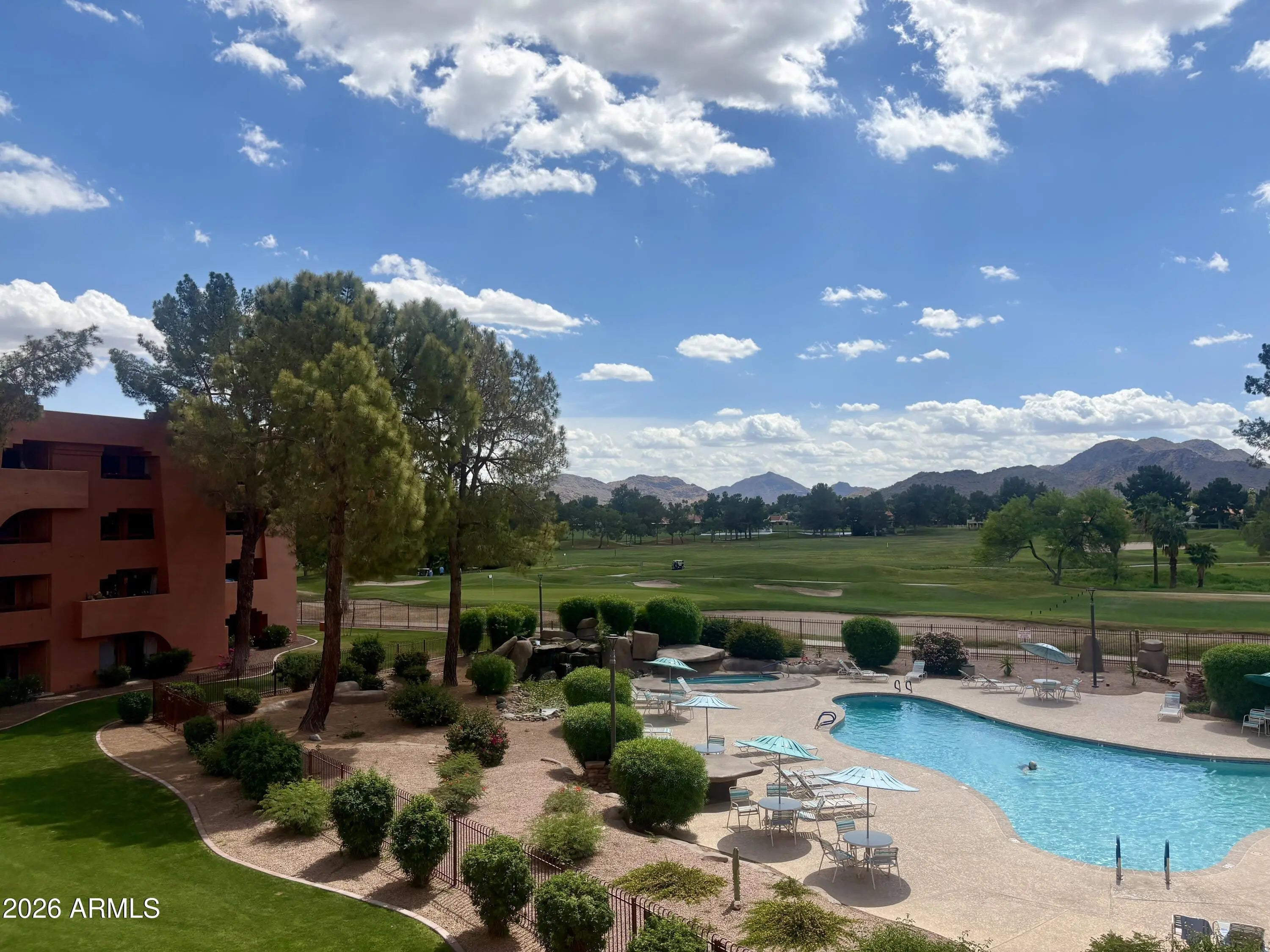 Anasazi Resort living in esteemed building 14 boasts unmatched views of the pool, golf course, and mountains. This turnkey property includes all contents and features a large balcony in a tranquil setting away from noise. The kitchen is spacious with granite countertops, a breakfast bar, stainless steel appliances, and ample storage. The living room has a mechanical sun shade, while the bathroom includes a double sink vanity with granite countertops. The AC unit was updated in 2022. Anasazi Village offers elevator-accessible buildings, 22 acres of greenery, a cactus garden, and 5 resort-style pool and spa areas. The clubhouse features two fitness centers, a media center, a billiards room, and gathering rooms for activities. Walk to the new PV, Stonecreek Golf Course, Target, Costco, Dutch Bros and dozens of upscale shops and restaurants. Great access to Loop 101 and I-51. Concrete block construction, not wood frame!