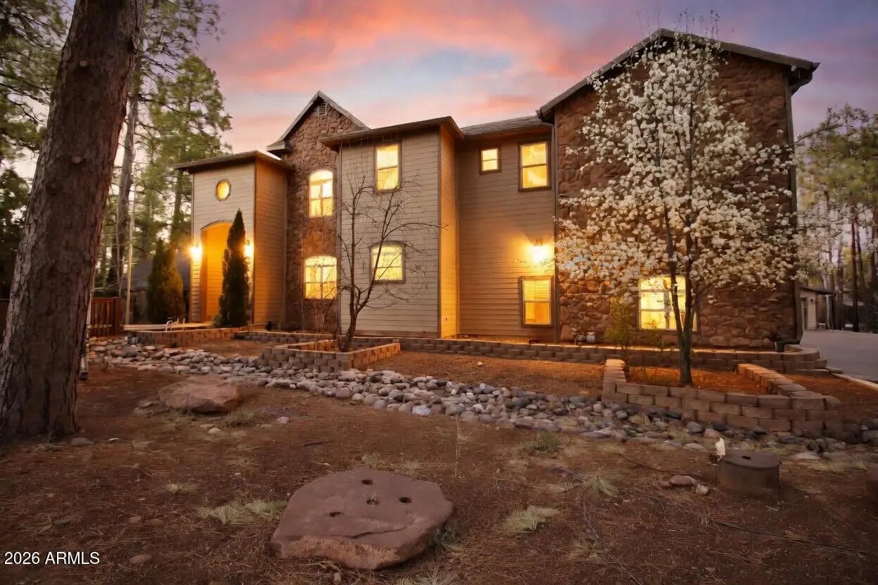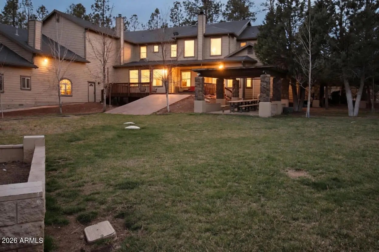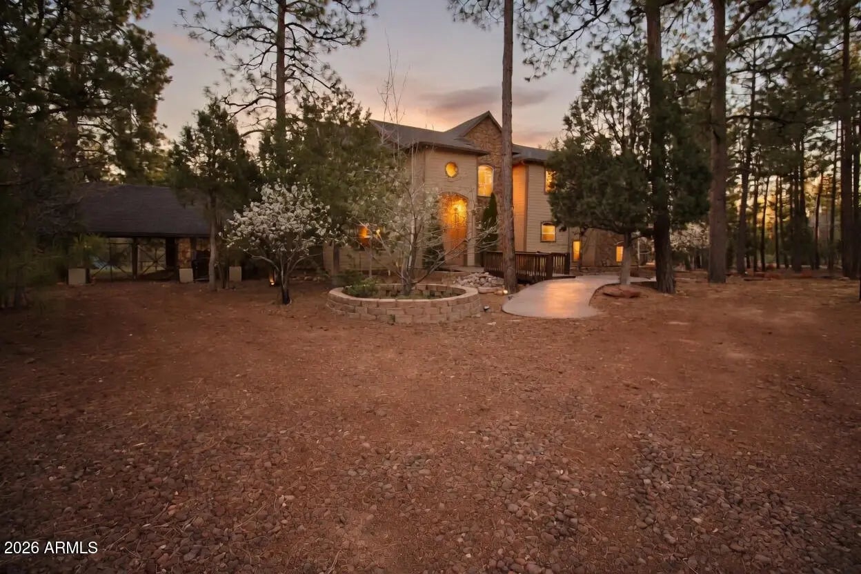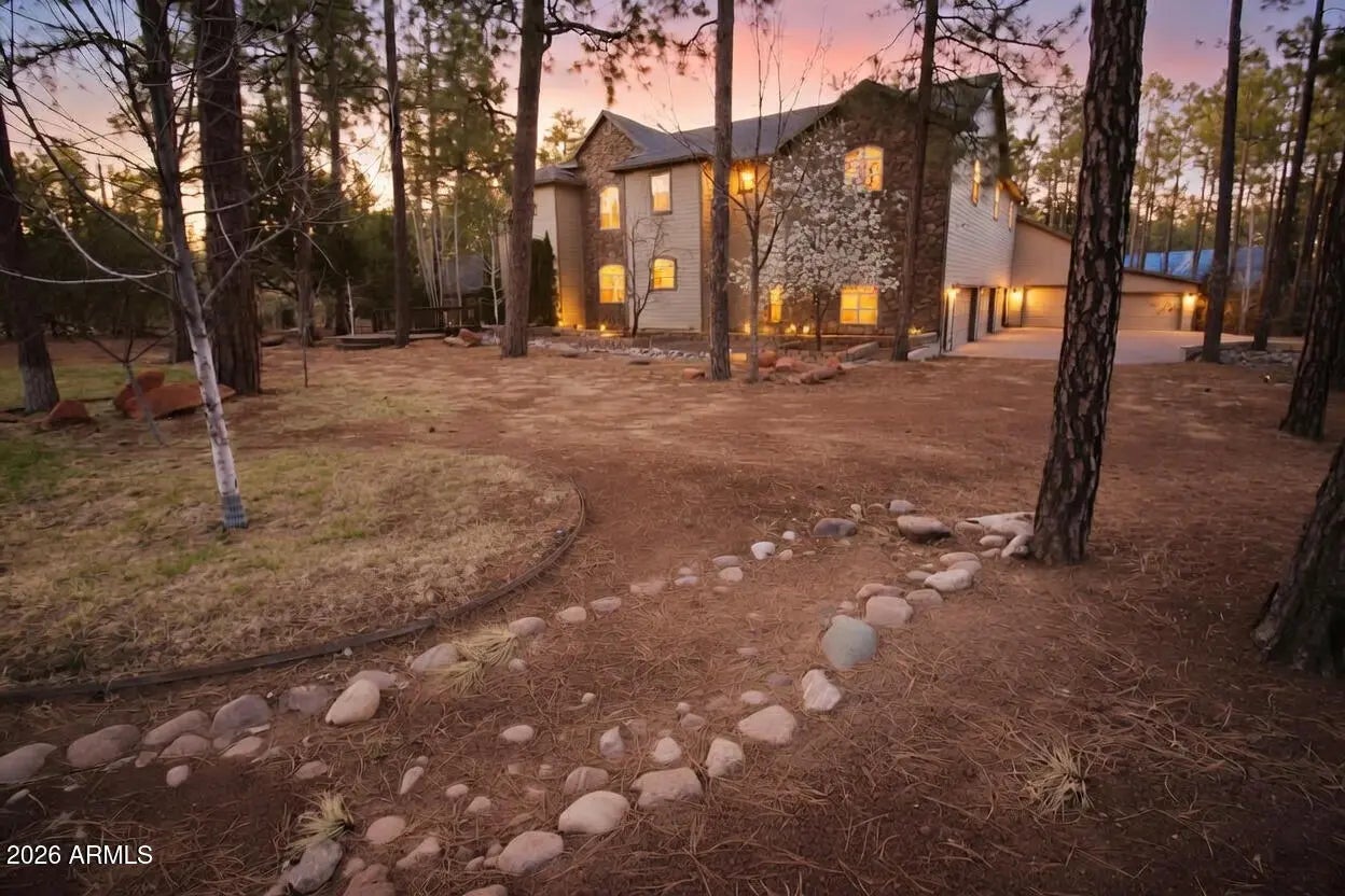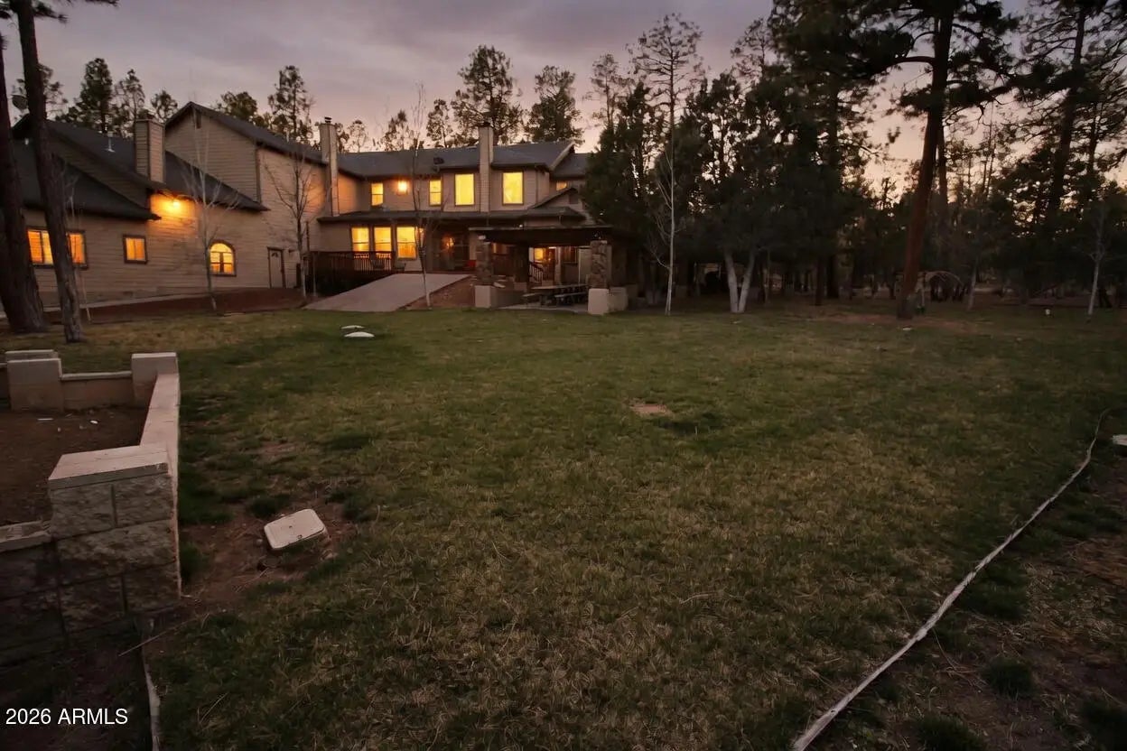 Nestled on a two-acre corner lot bordering the White Mountain Apache Reservation in Pinetop this stunning custom-built Lodge offers unmatched privacy and effortless mountain living. Located at Rim Road and Timber Pine Lane near Lakeside amenities. The 7600 square foot Lodge has a main level master suite huge upstairs game room six bedrooms and 6.5 baths. Includes attached two-bedroom two bath cottage with living area and kitchenette. Features eight car garage and landscaped fenced backyard with grass firepit and covered patio. Built in 2008 with no homeowner's association. Must see.