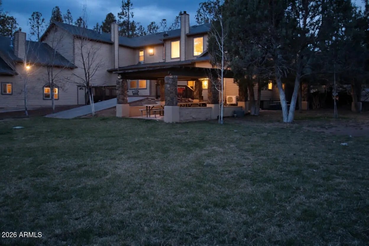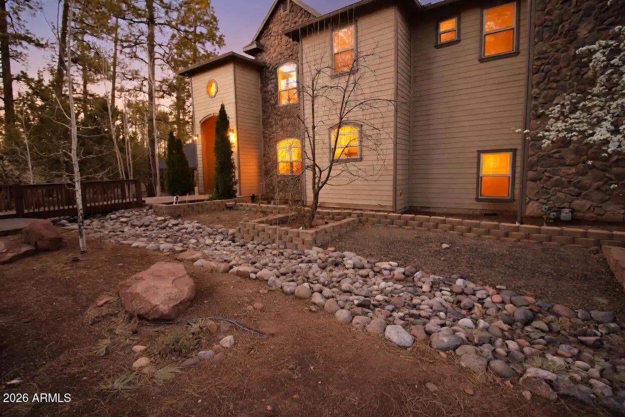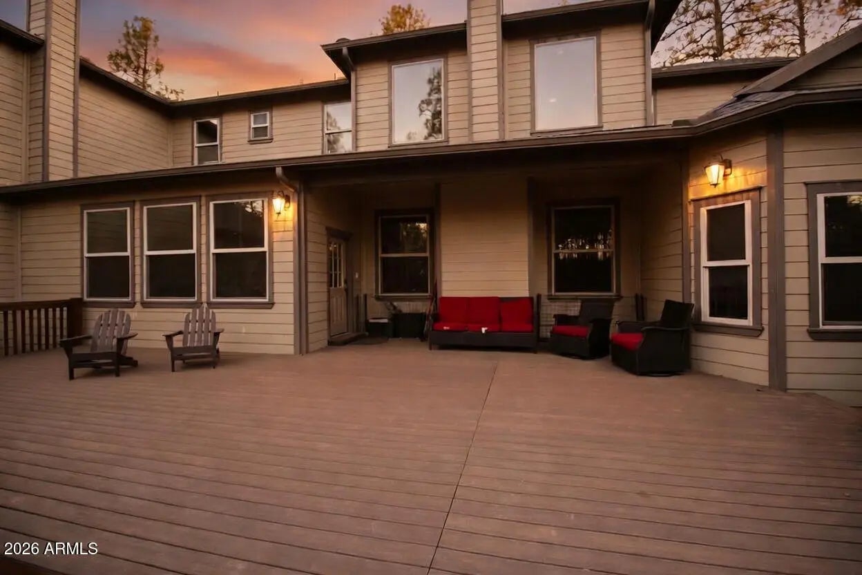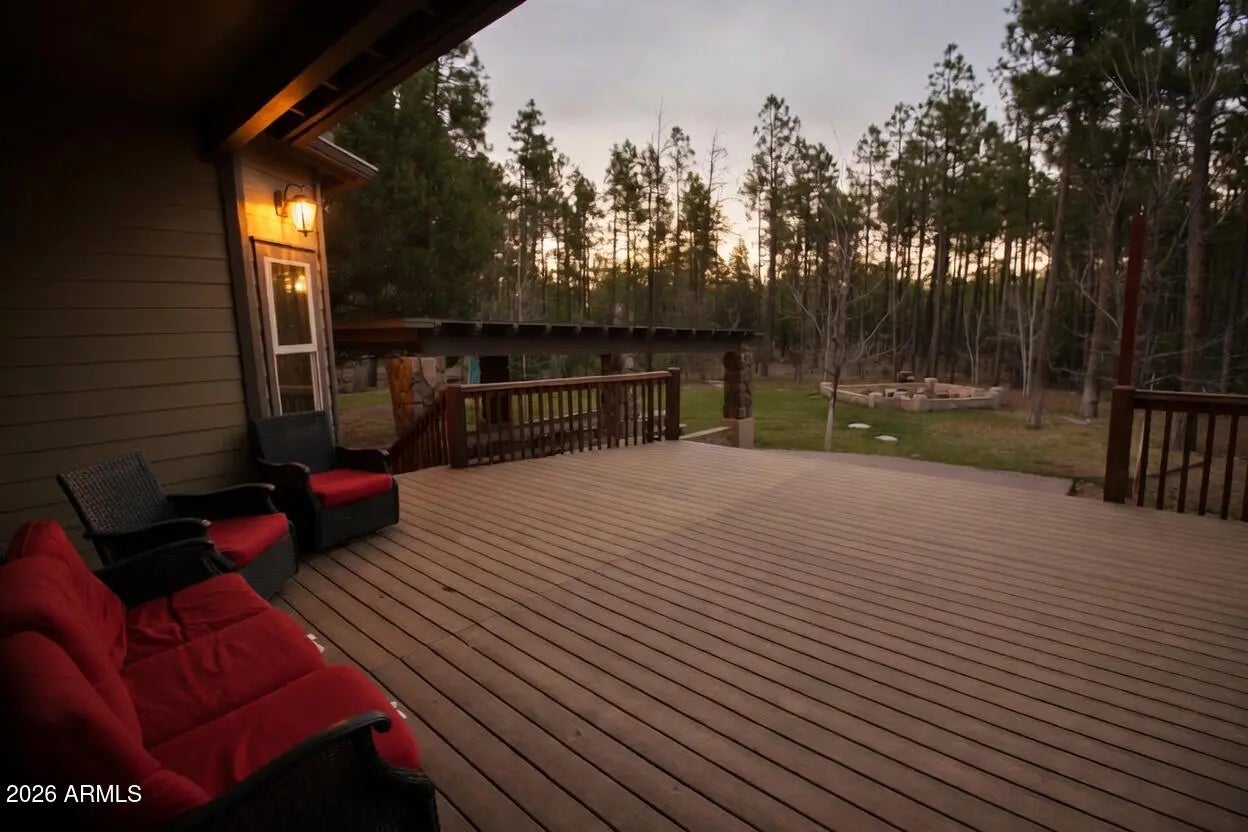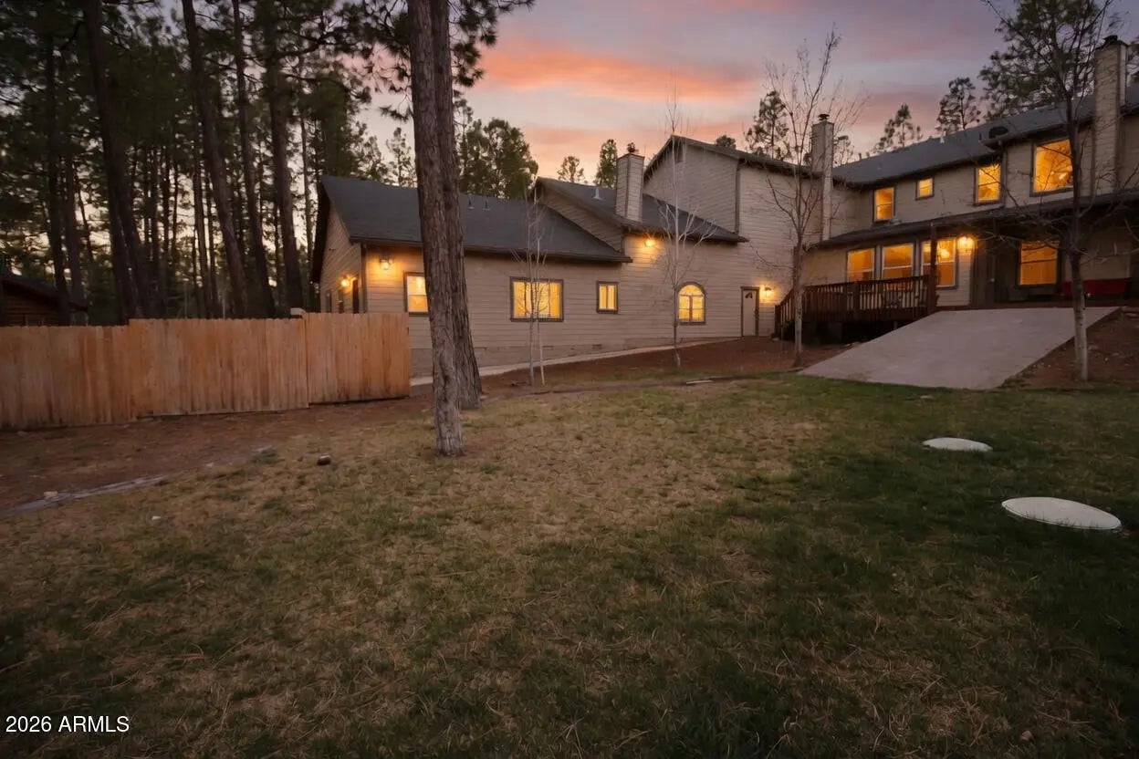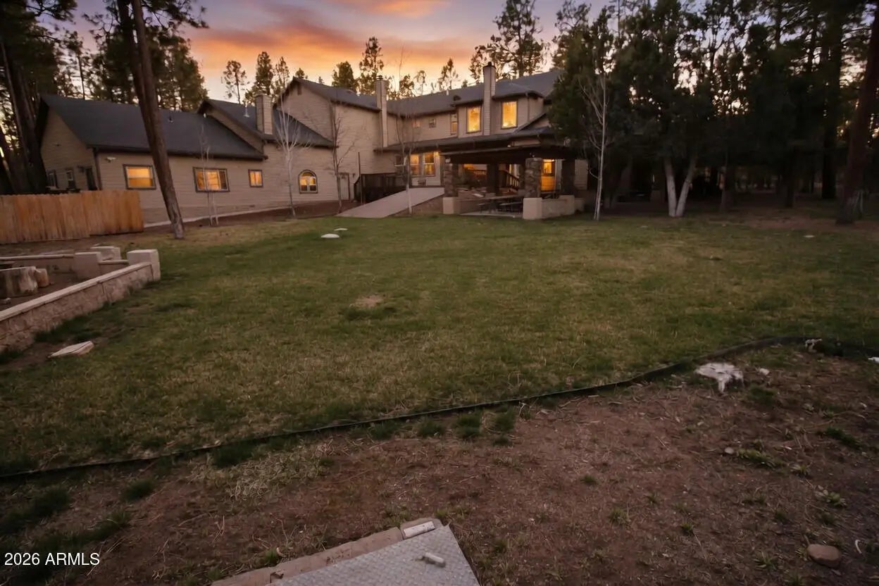 Nestled on a two-acre corner lot bordering the White Mountain Apache Reservation in Pinetop this stunning custom-built Lodge offers unmatched privacy and effortless mountain living. Located at Rim Road and Timber Pine Lane near Lakeside amenities. The 7600 square foot Lodge has a main level master suite huge upstairs game room six bedrooms and 6.5 baths. Includes attached two-bedroom two bath cottage with living area and kitchenette. Features eight car garage and landscaped fenced backyard with grass firepit and covered patio. Built in 2008 with no homeowner's association. Must see.