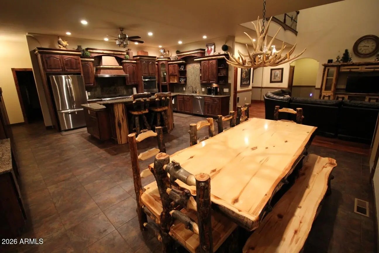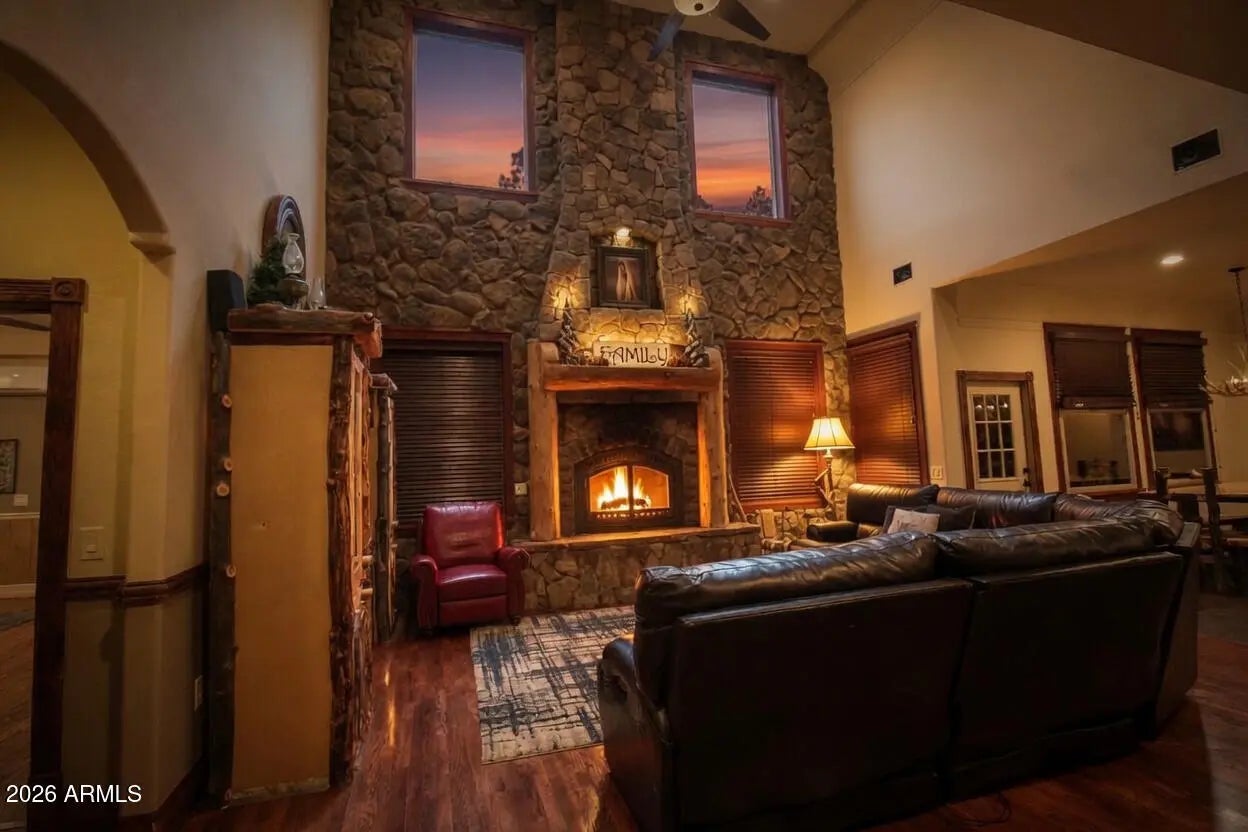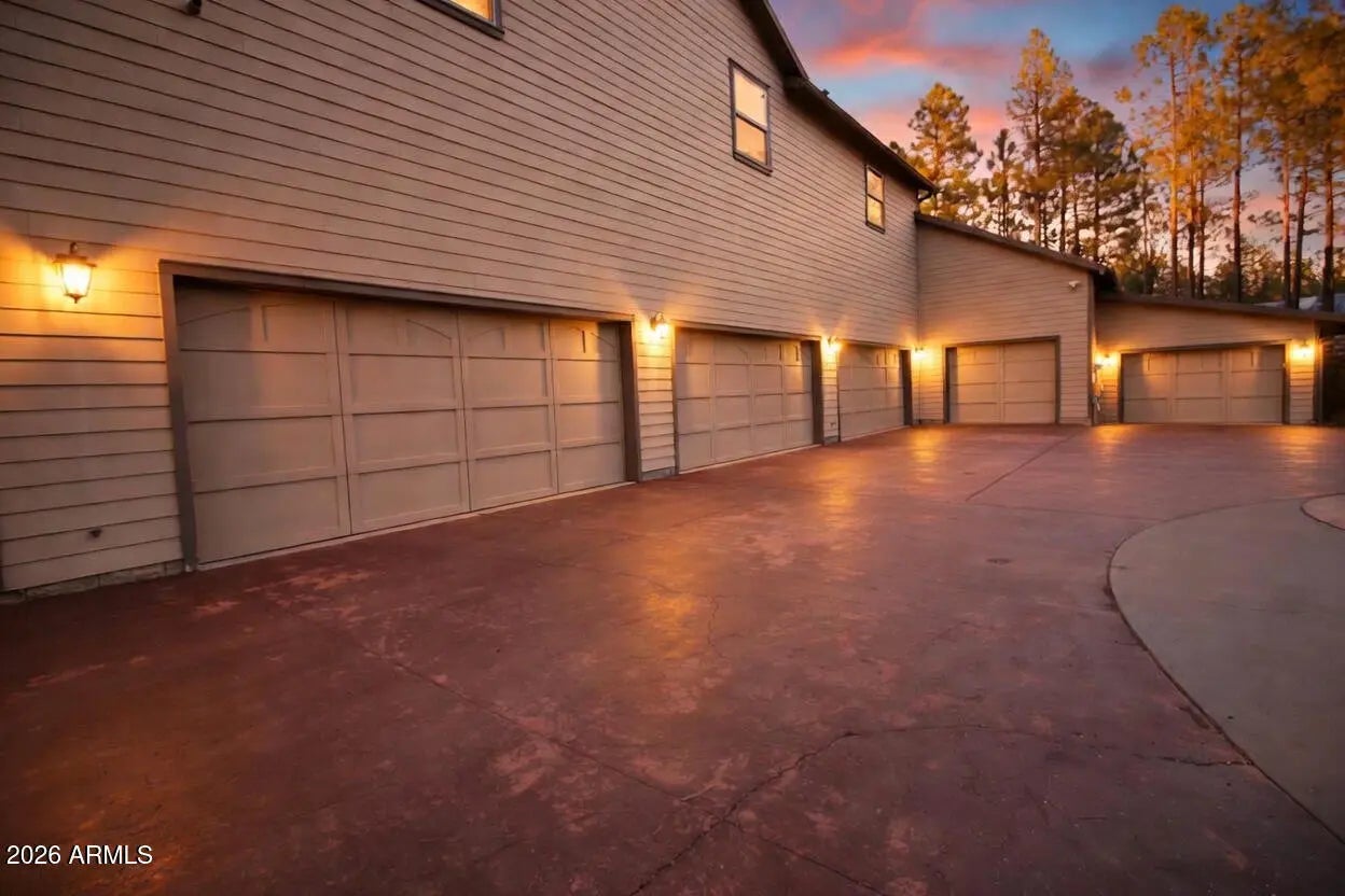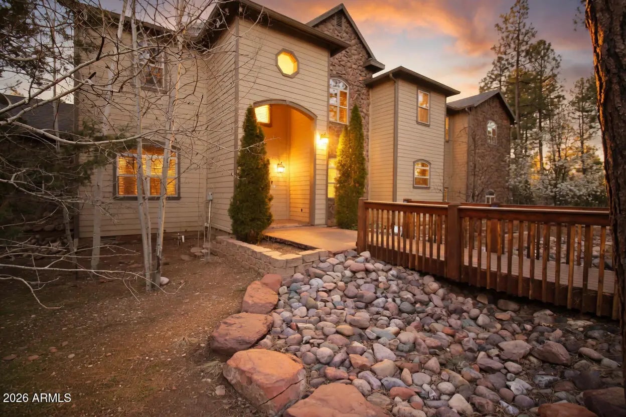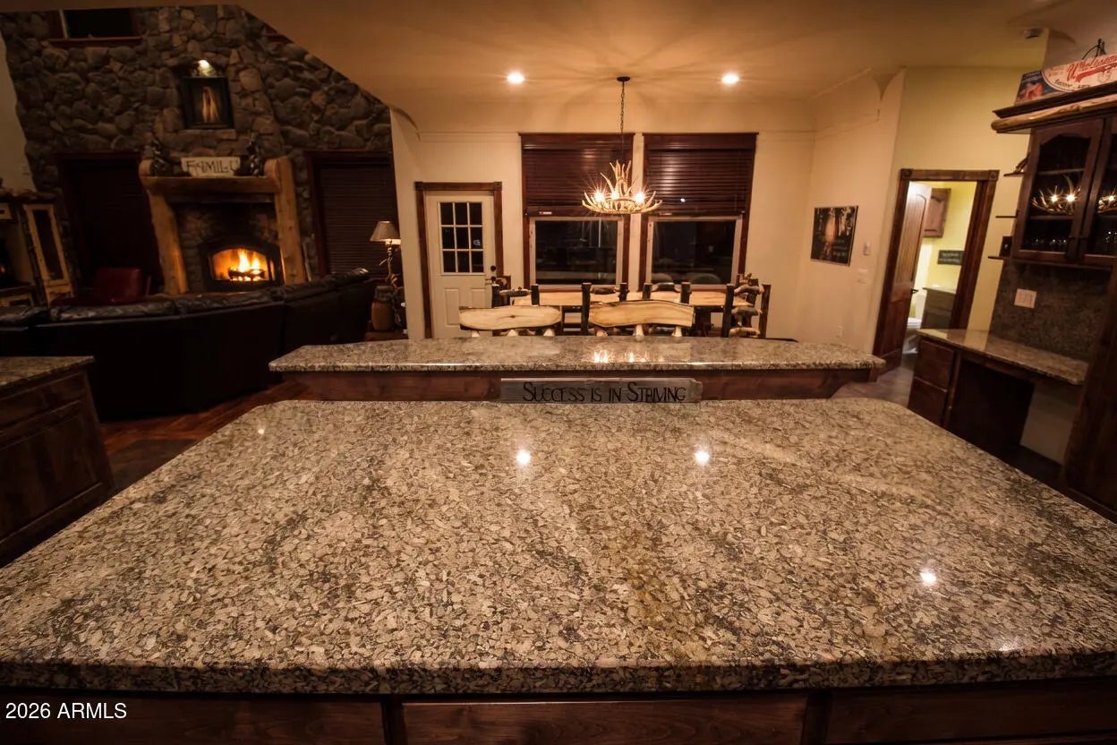 Nestled on a two-acre corner lot bordering the White Mountain Apache Reservation in Pinetop this stunning custom-built Lodge offers unmatched privacy and effortless mountain living. Located at Rim Road and Timber Pine Lane near Lakeside amenities. The 7600 square foot Lodge has a main level master suite huge upstairs game room six bedrooms and 6.5 baths. Includes attached two-bedroom two bath cottage with living area and kitchenette. Features eight car garage and landscaped fenced backyard with grass firepit and covered patio. Built in 2008 with no homeowner's association. Must see.