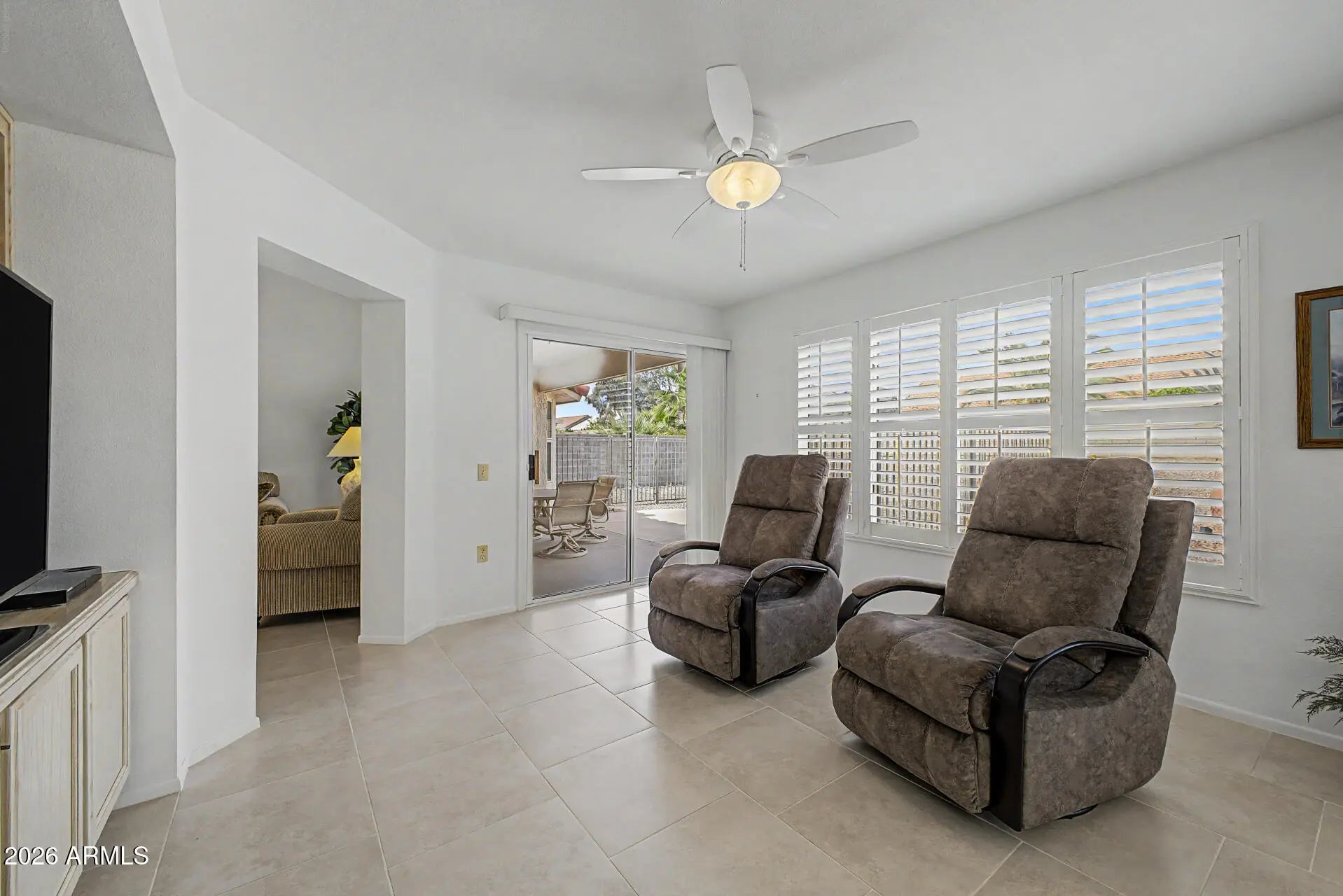 Step into this well cared-for Wexford plan, reflecting exceptional attention to detail and true pride of ownership. This turn-key home is offered fully furnished, as shown. Nestled on an oversized lot within the peaceful Sun City West adult community, it delivers both comfort and access to outstanding amenities. The living and dining spaces feel inviting and open, enhanced by plentiful natural light streaming through bay windows. Features include tile flooring, plantation shutters, and updated LG appliances, including a new LG refrigerator/freezer installed April 2026. Enjoy outdoor living under the covered patio, with a removable wrought iron enclosure area for pets, easily removable if not desired.