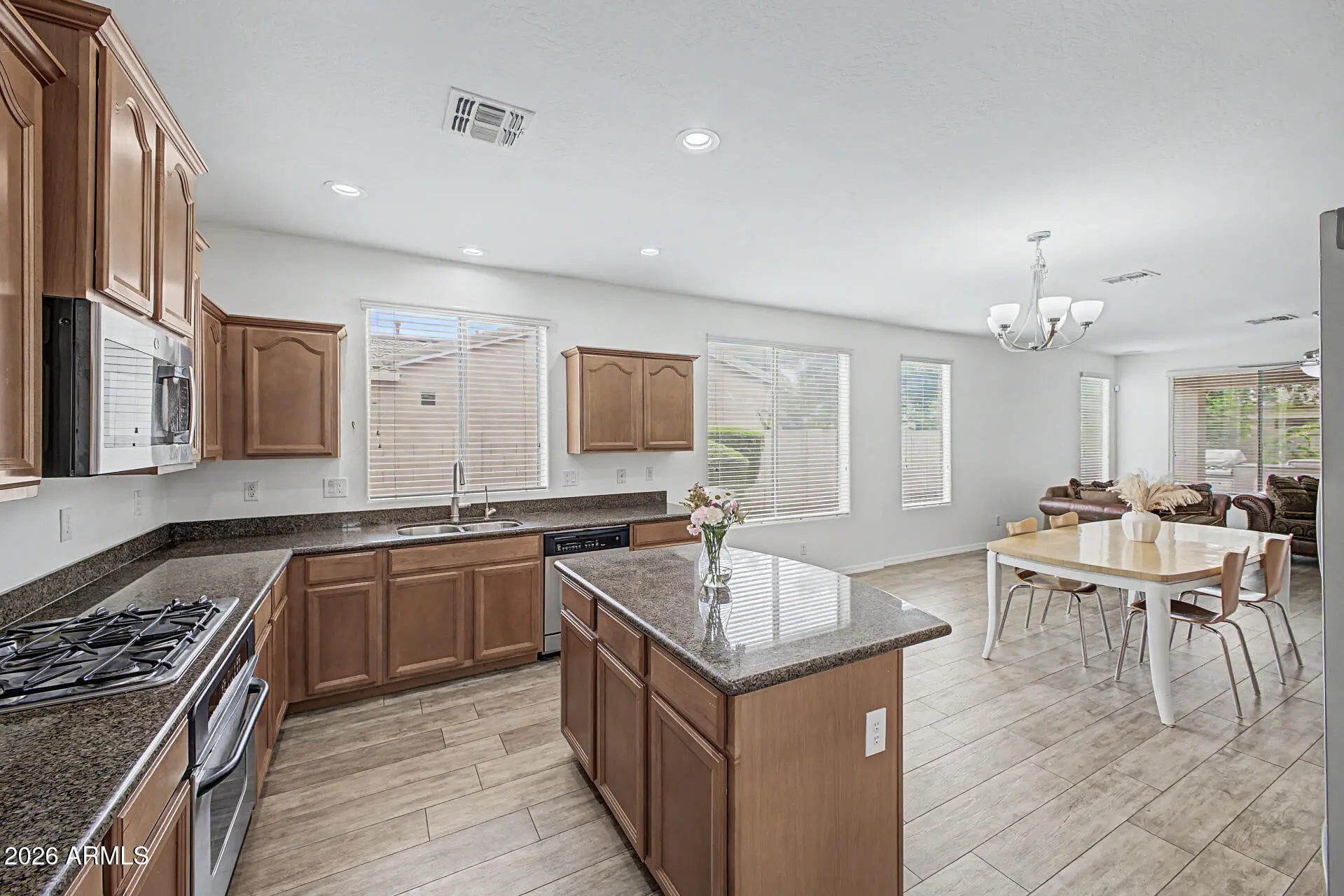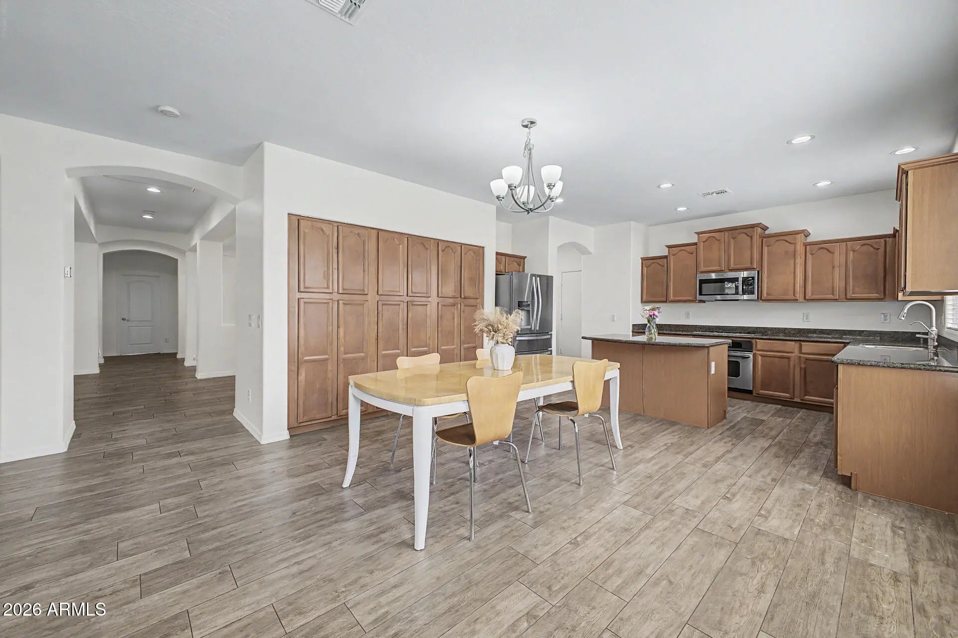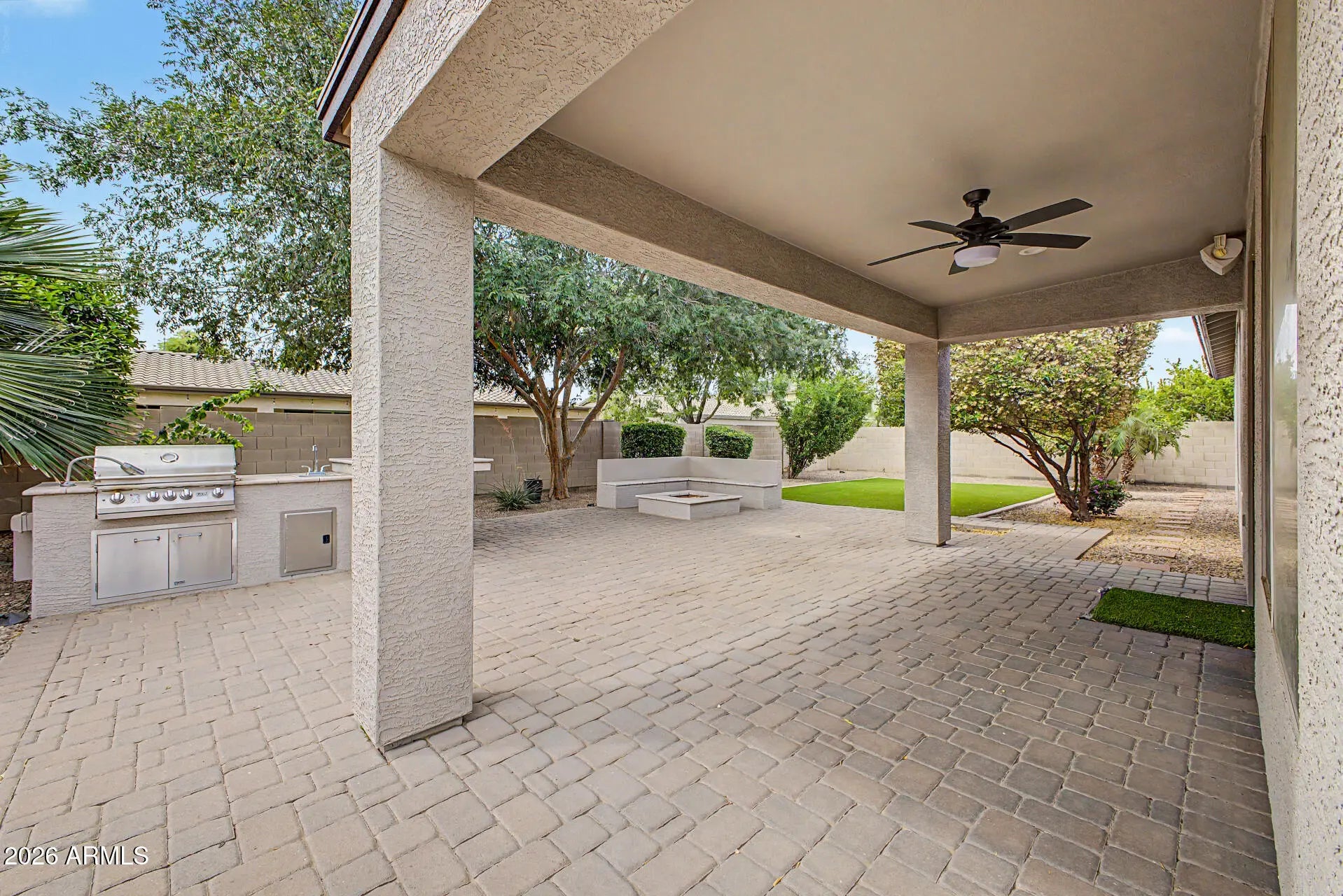 The freshly painted interior (March 2026) sets the tone for this lovely, inviting home. The open island kitchen features granite counters, stainless steel appliances including a gas range, a butler's pantry, and abundant cabinetry. The spacious primary suite offers a large walk-in closet and a beautifully appointed bath with double sinks, separate tub and shower. Wood plank tile adorns the floors in all the right places, enhancing both style and permanence. The home boasts attractive curb appeal. The indoor laundry has side yard access. Outside you'll find a very private backyard an with extended paver patio and painted fence. This home is located within walking distance to Ryan Elementary School, Arizona College Prep HS, a city park, shopping, and dining.