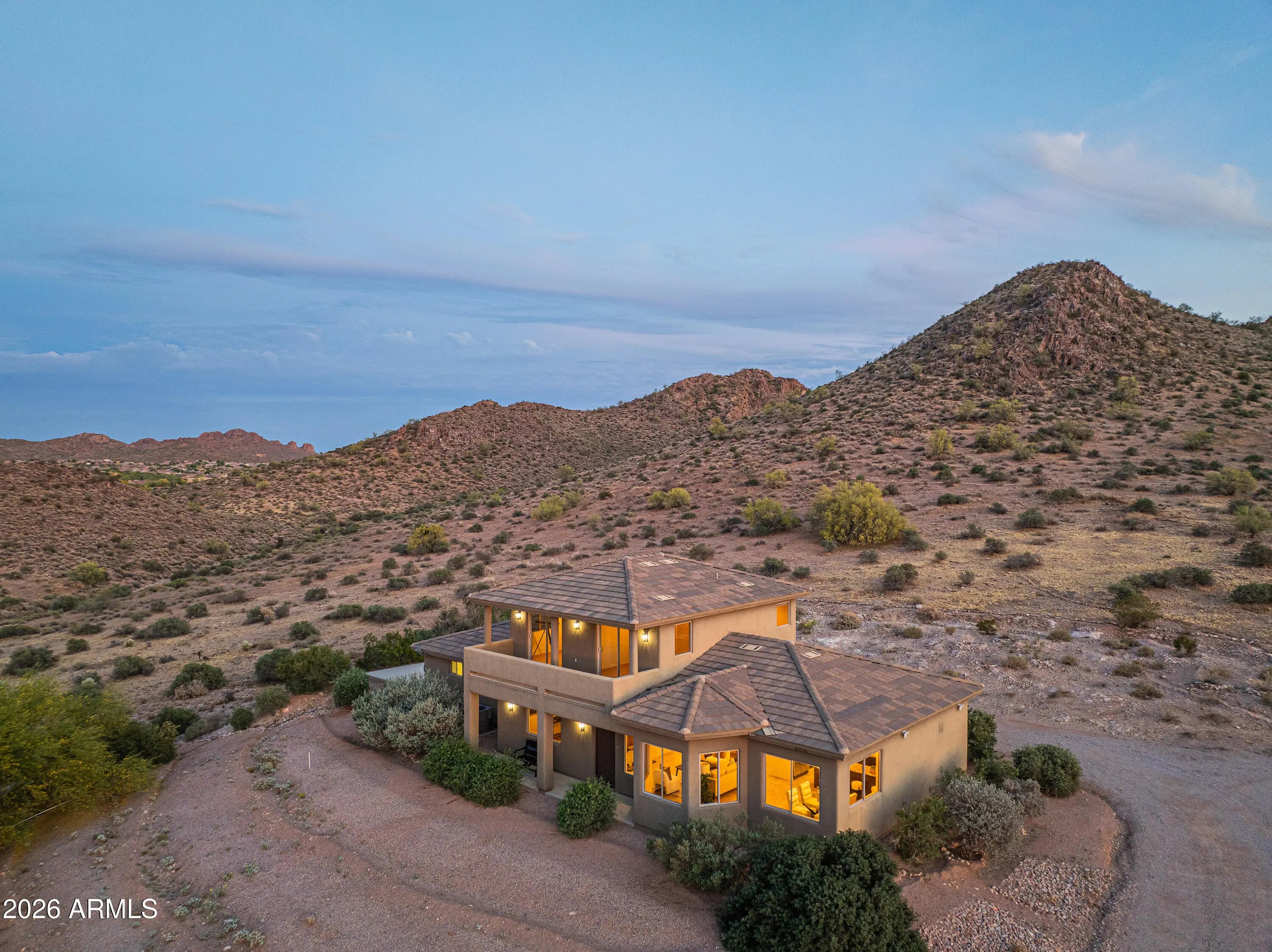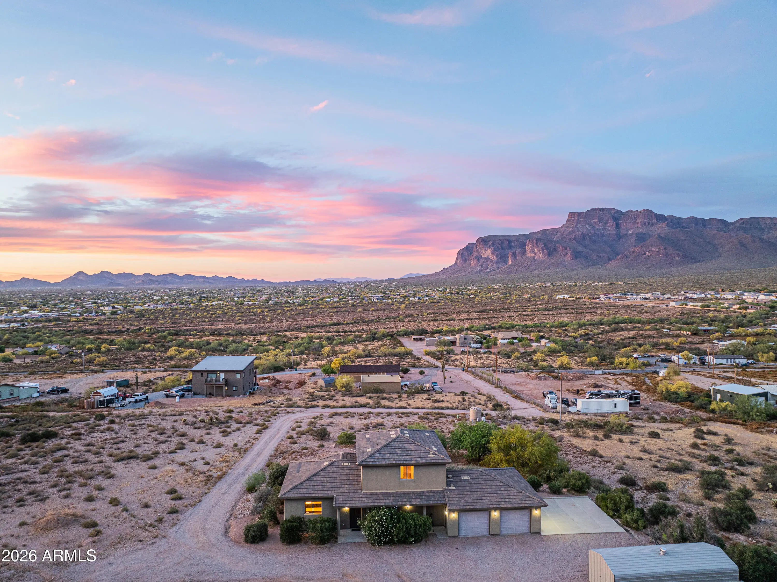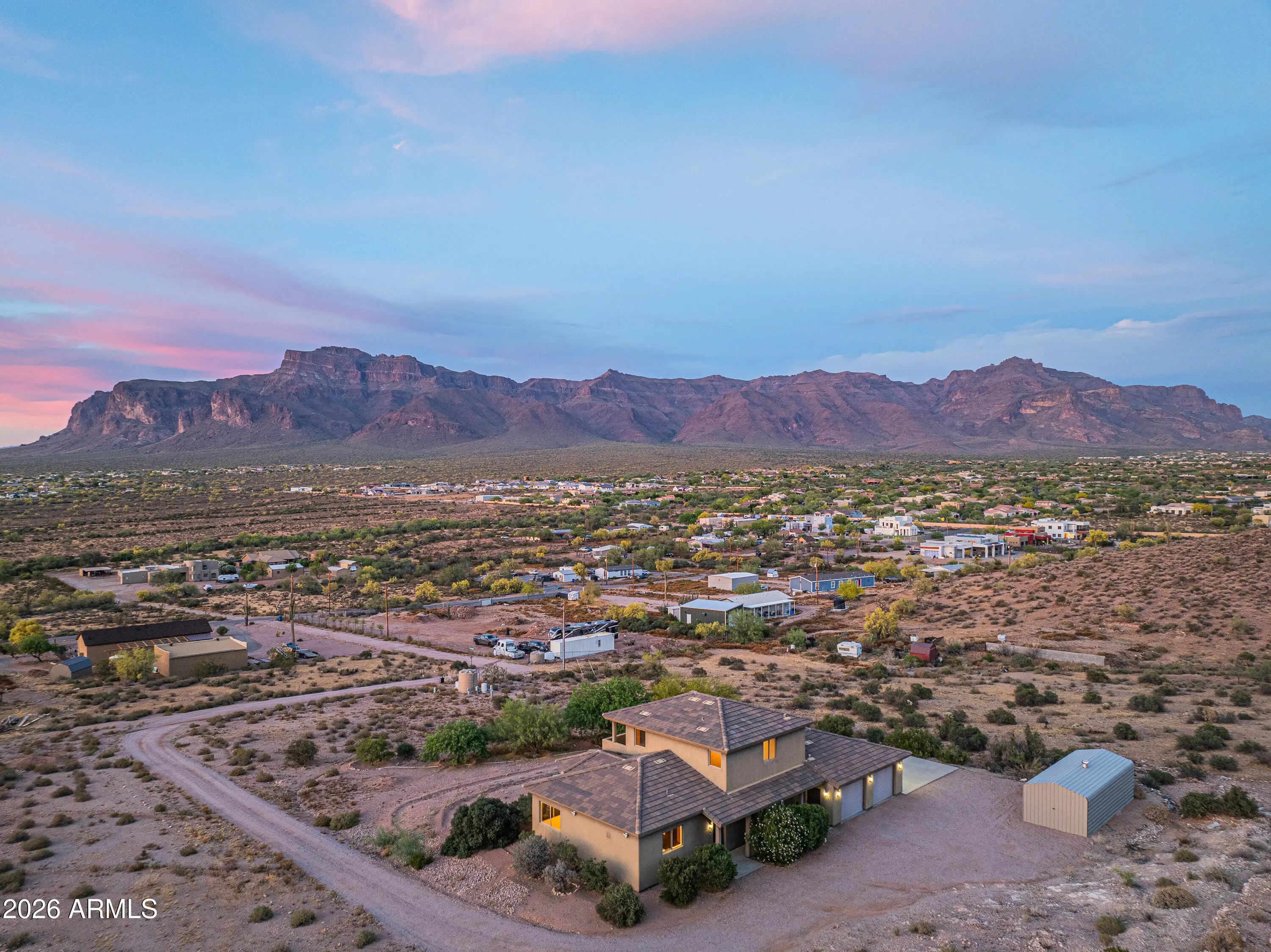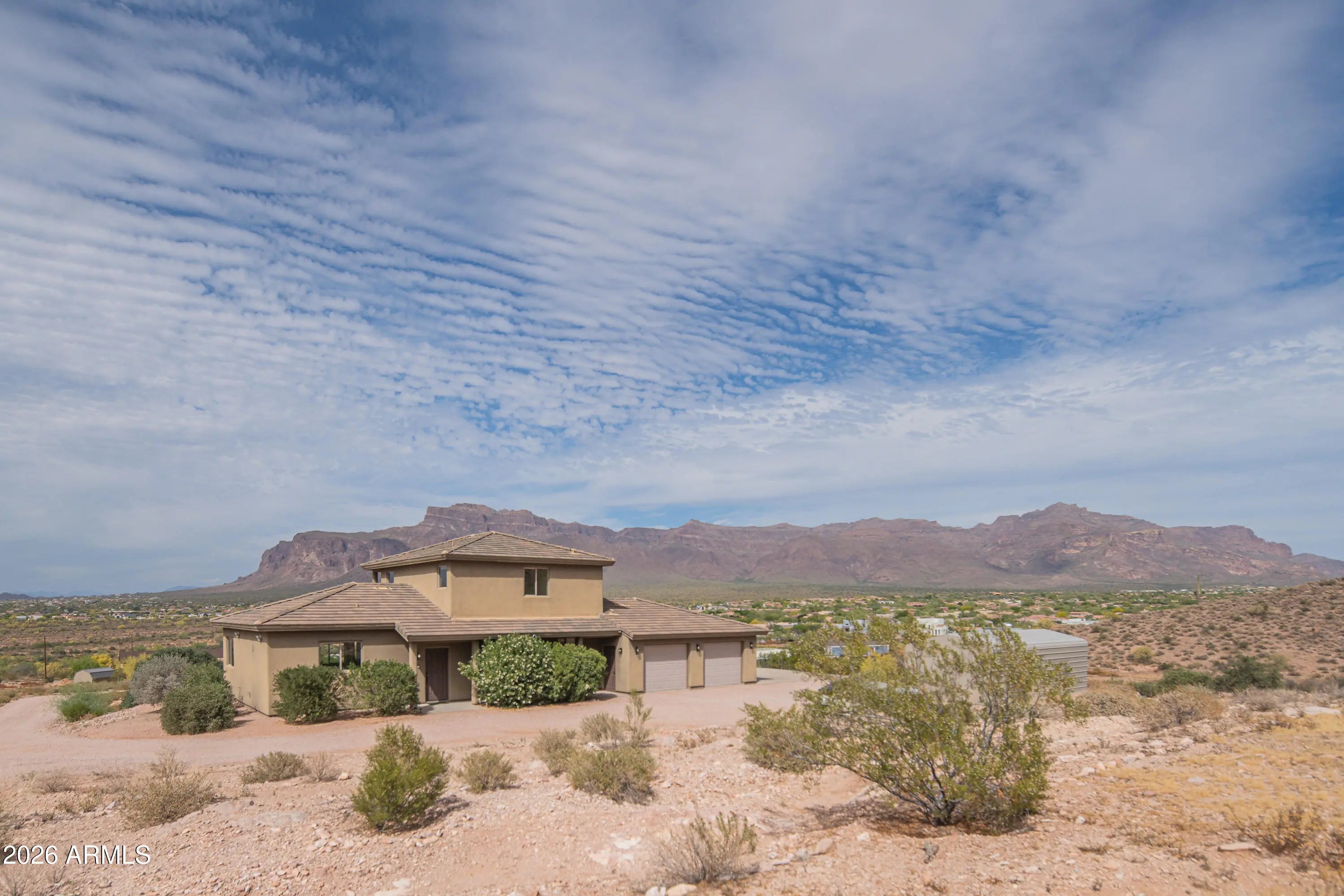 **PANORAMIC VIEWS ALL AROUND WITH NO HOA RESTRICTIONS** Well-kept gem right on the edge of Silly Mountain Park with natural desert surrounding the entire property. This home features north/south exposure, 2.5+ acres of land between 2 parcels, private access road with a power-operated gate, and no neighbors behind. Upgraded kitchen is outfitted with custom cabinetry with ample storage space, granite countertops, under-cabinet lighting, and tons of counter space. Living/Dining area features a bay window, endless views, and a 1/2 bath for guests. Downstairs primary suite features a walk-in closet, dual sinks in bathroom, tiled shower, and a separate tub. Upstairs features 2 guest bedrooms, each with deep closets and direct balcony access. All bedrooms in the home have picturesque views of the Superstition Mountains. Both HVAC systems were replaced in 2025. Attached garage space features an extended-length bay, which was built with a boat or longer vehicle in mind. Detached secondary/boat garage is also extended for a longer vehicle/additional storage space. RV Pad features 110V for hookup. Property has its own private well, with no other homes tied to such. Well has been upgraded with new well pump and 2500 gallon storage tank, to allow it to be tied in to allow expansion to multiple structures. Located on the border of Apache Junction and Gold Canyon, with close proximity to US60, shopping and a wide selection of golfing and hiking options nearby.