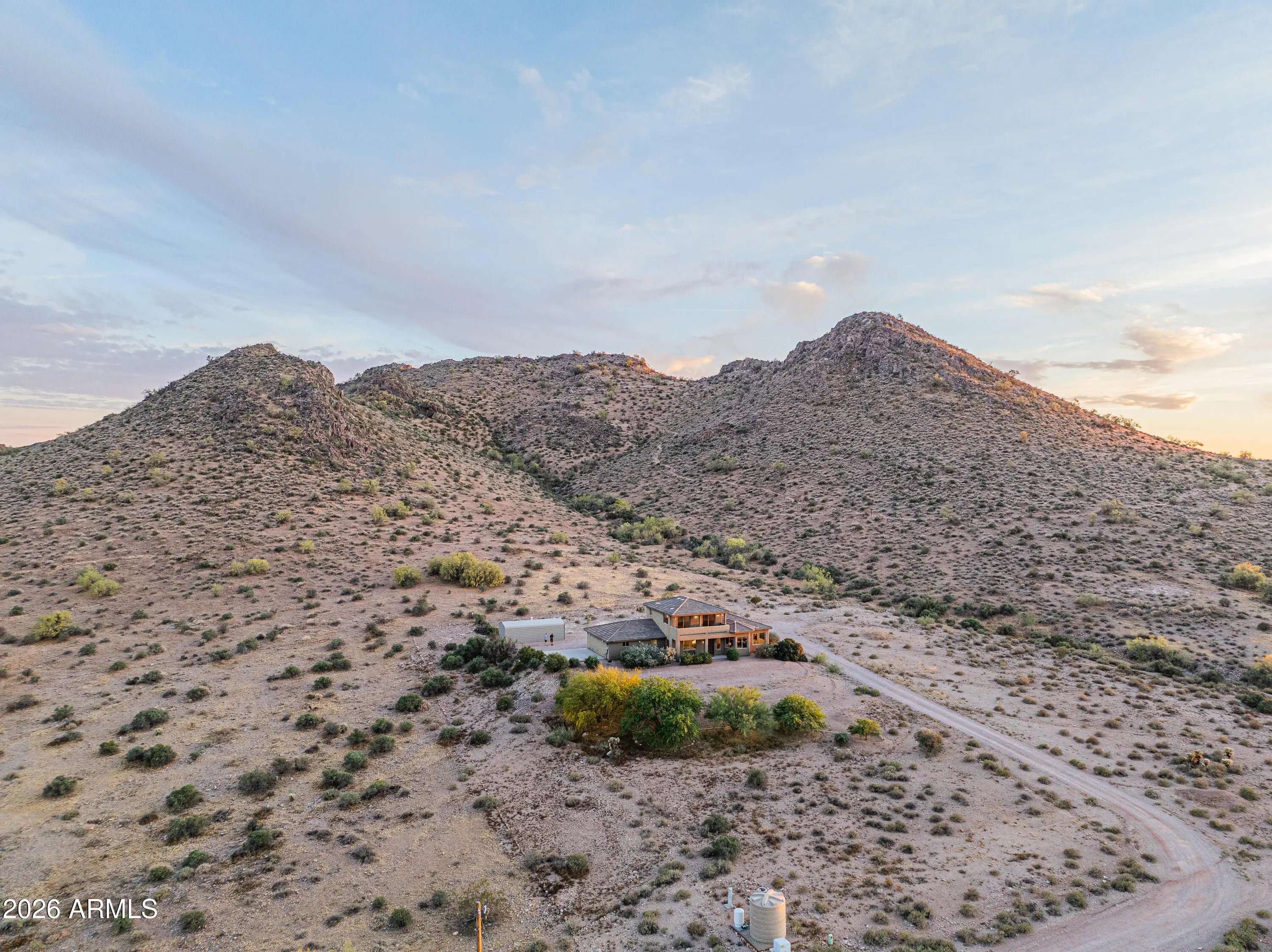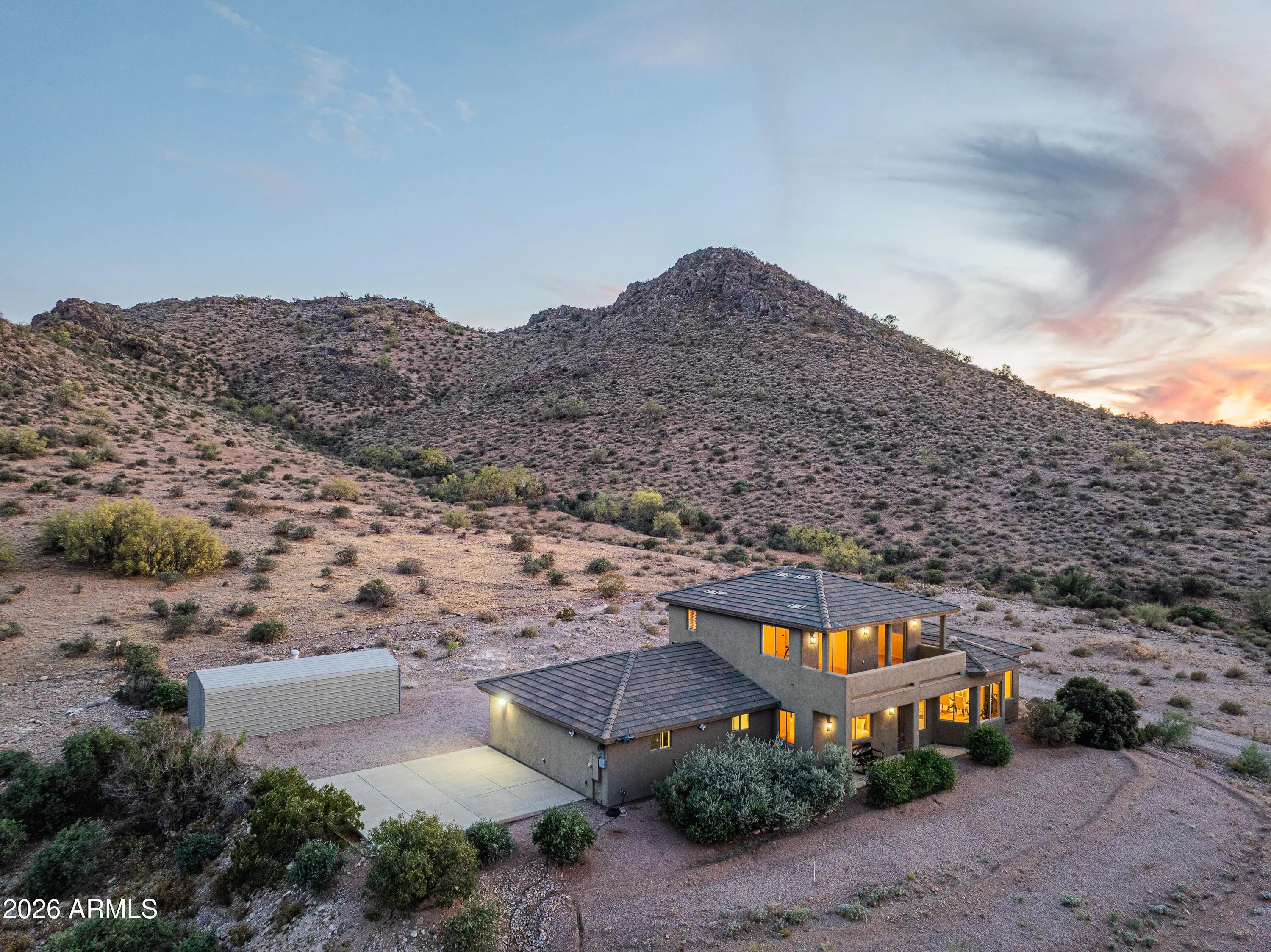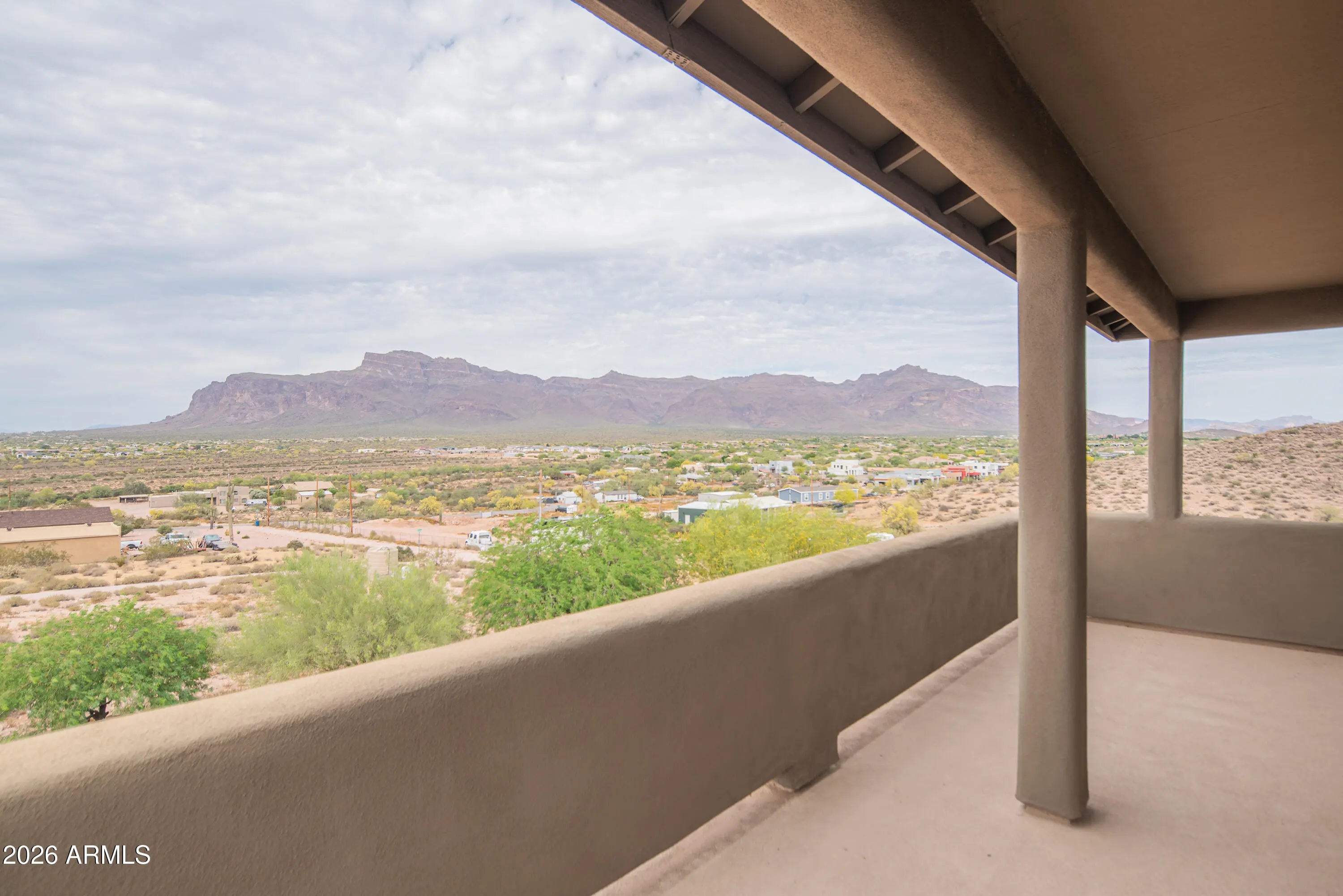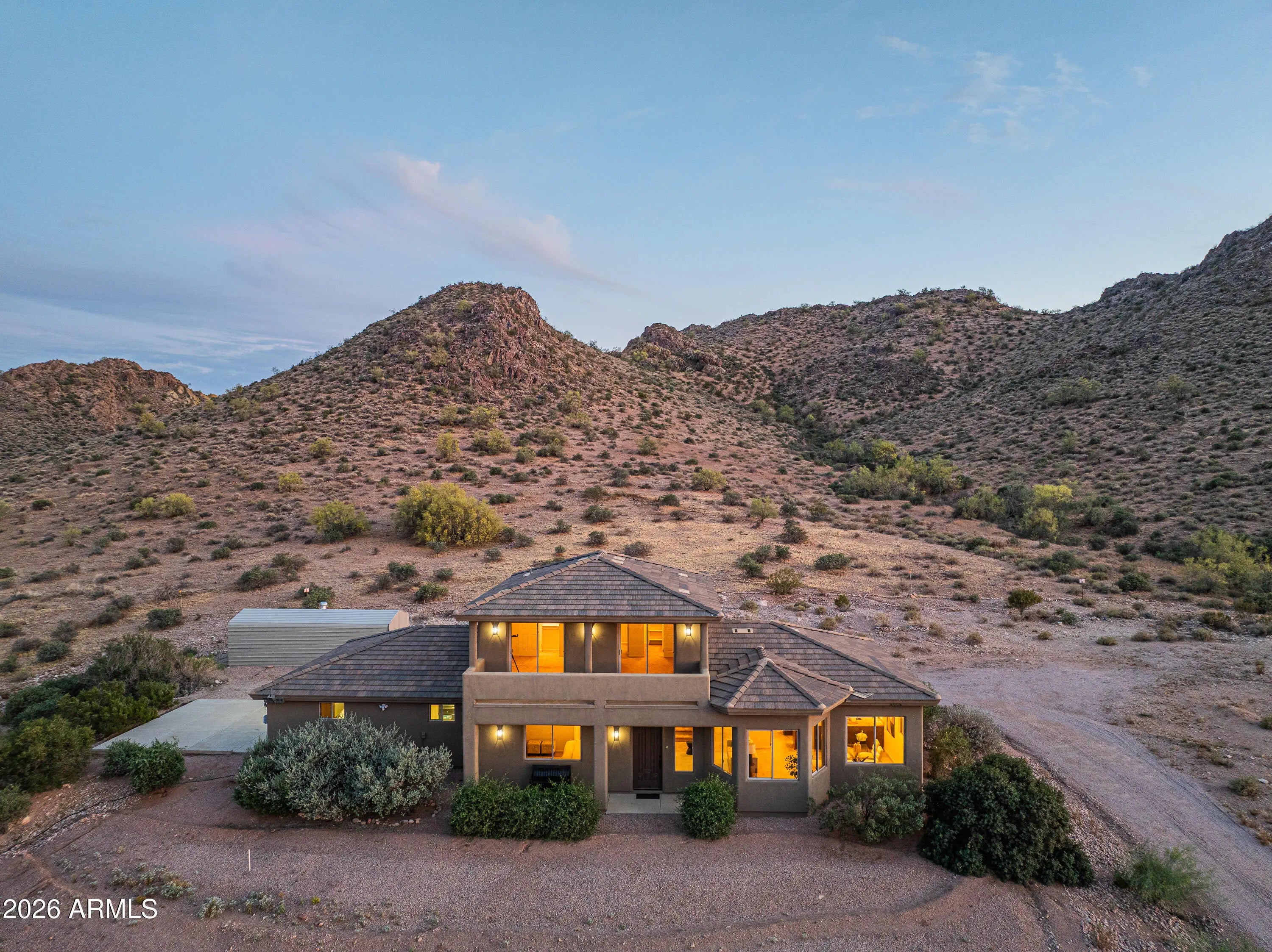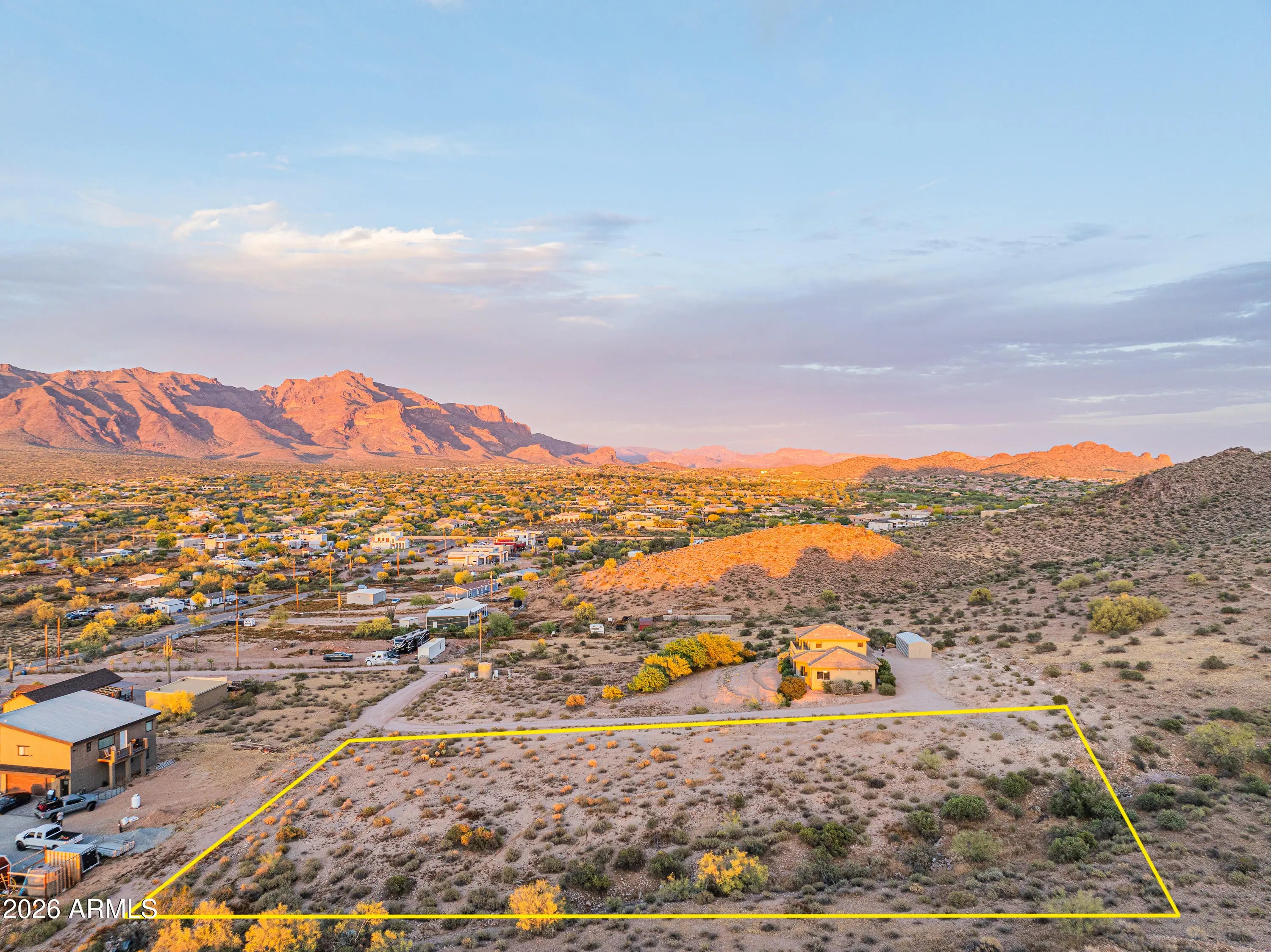 **PANORAMIC VIEWS ALL AROUND WITH NO HOA RESTRICTIONS** Well-kept gem right on the edge of Silly Mountain Park with natural desert surrounding the entire property. This home features north/south exposure, 2.5+ acres of land between 2 parcels, private access road with a power-operated gate, and no neighbors behind. Upgraded kitchen is outfitted with custom cabinetry with ample storage space, granite countertops, under-cabinet lighting, and tons of counter space. Living/Dining area features a bay window, endless views, and a 1/2 bath for guests. Downstairs primary suite features a walk-in closet, dual sinks in bathroom, tiled shower, and a separate tub. Upstairs features 2 guest bedrooms, each with deep closets and direct balcony access. All bedrooms in the home have picturesque views of the Superstition Mountains. Both HVAC systems were replaced in 2025. Attached garage space features an extended-length bay, which was built with a boat or longer vehicle in mind. Detached secondary/boat garage is also extended for a longer vehicle/additional storage space. RV Pad features 110V for hookup. Property has its own private well, with no other homes tied to such. Well has been upgraded with new well pump and 2500 gallon storage tank, to allow it to be tied in to allow expansion to multiple structures. Located on the border of Apache Junction and Gold Canyon, with close proximity to US60, shopping and a wide selection of golfing and hiking options nearby.