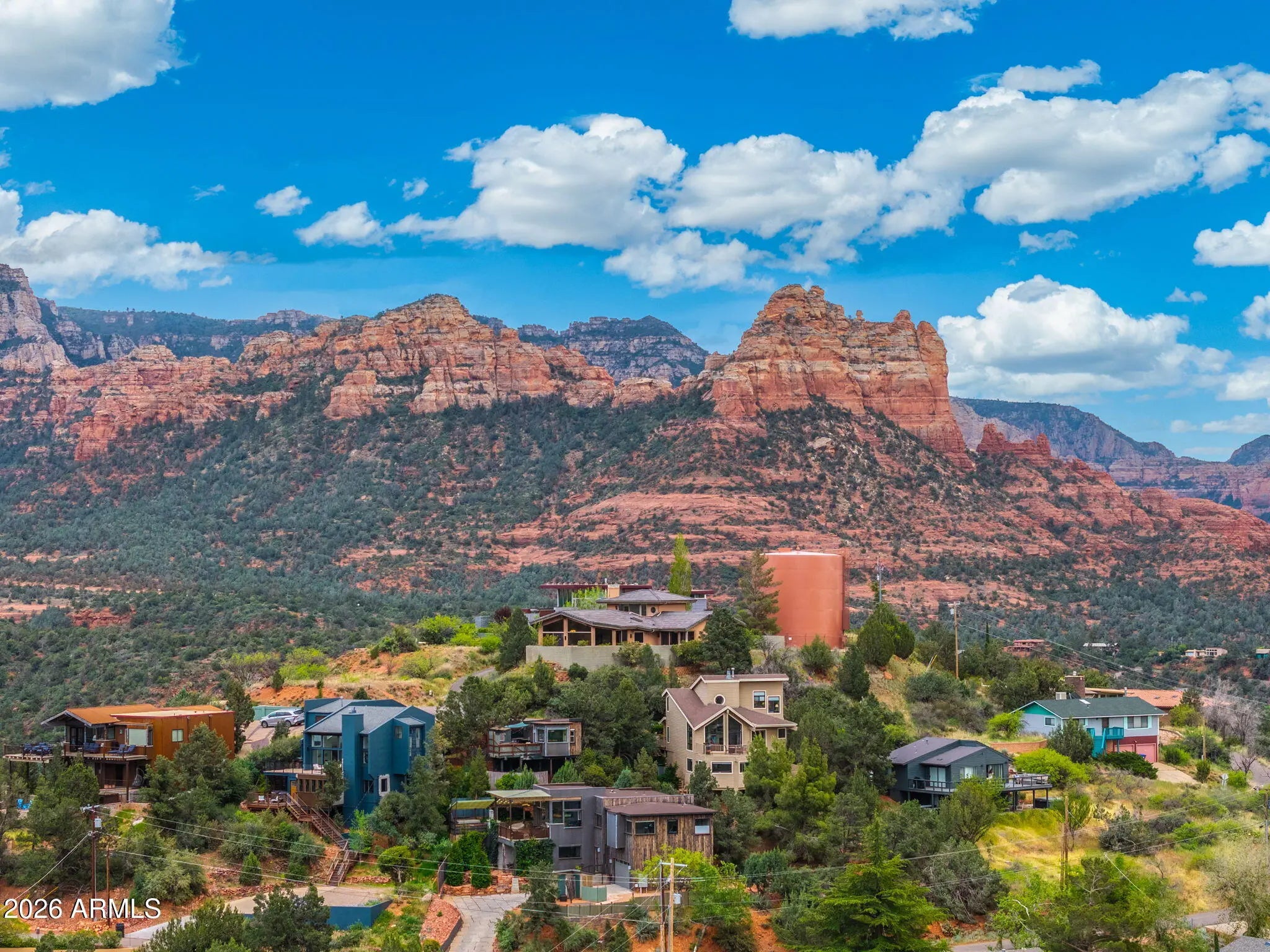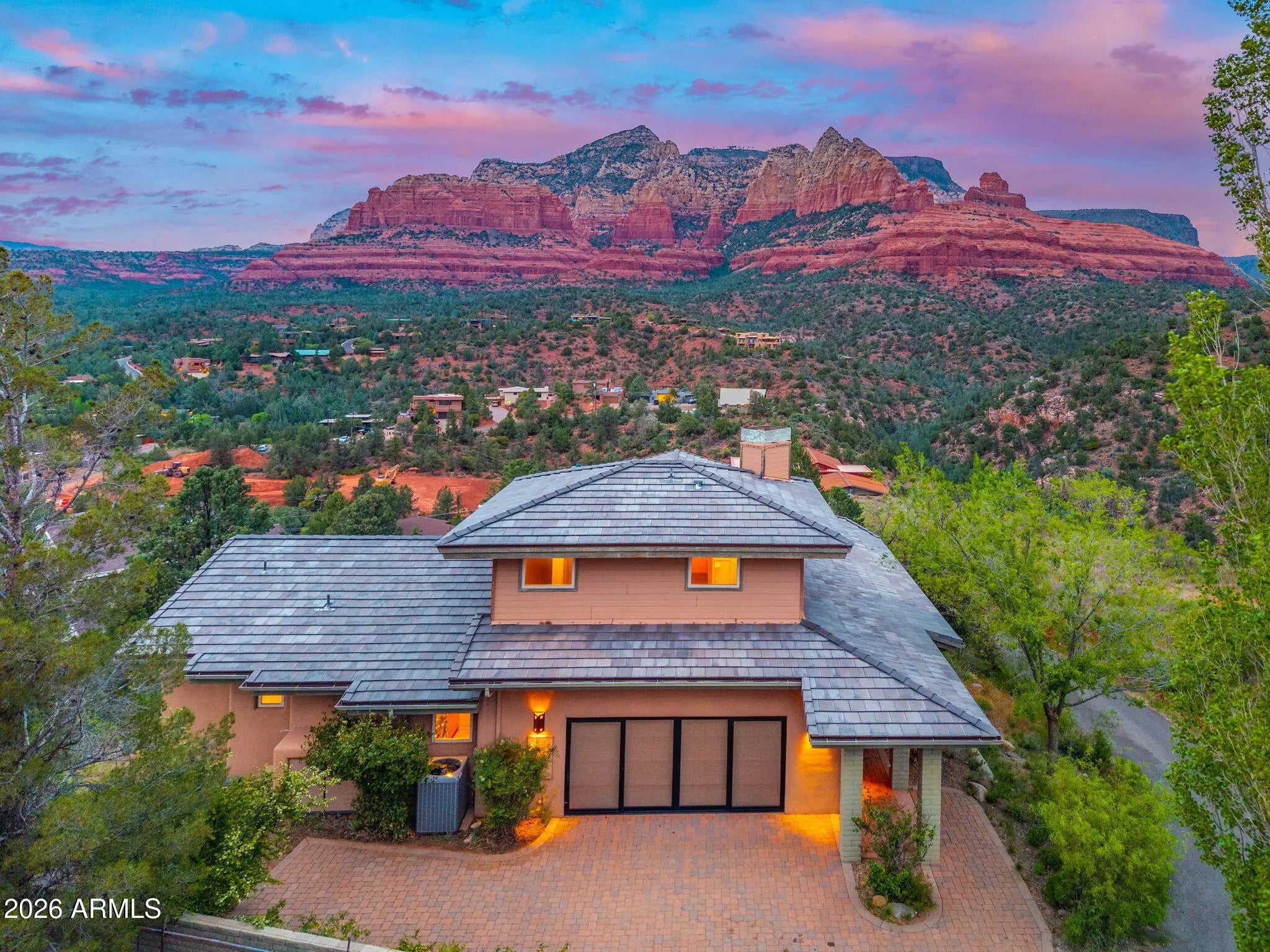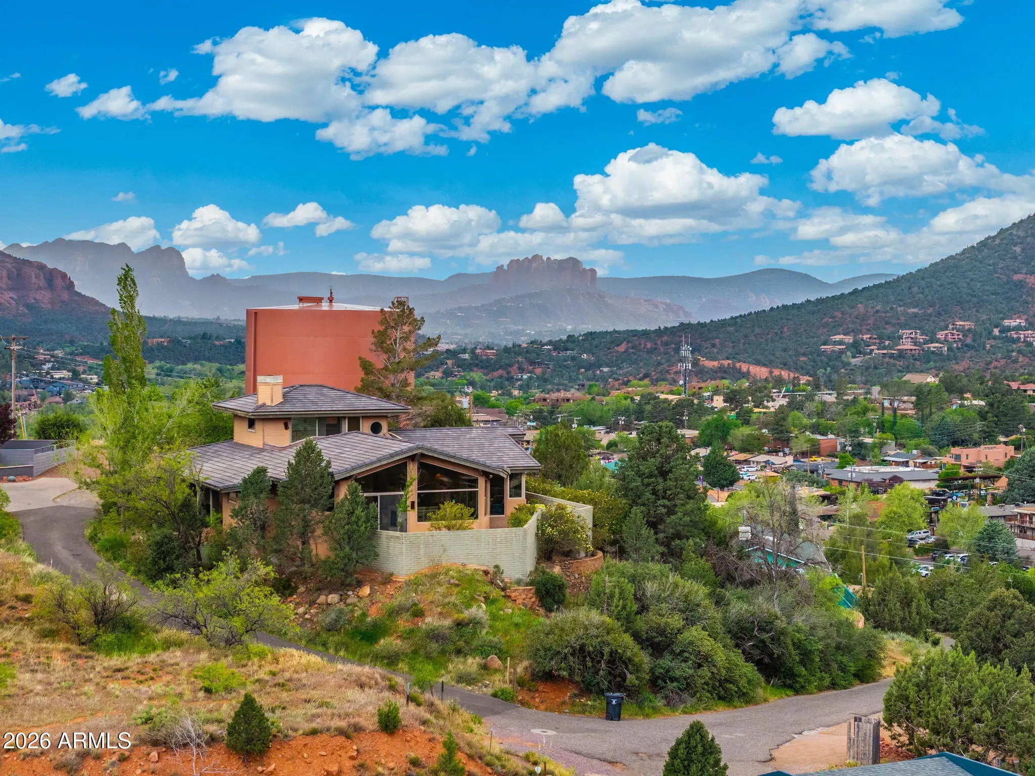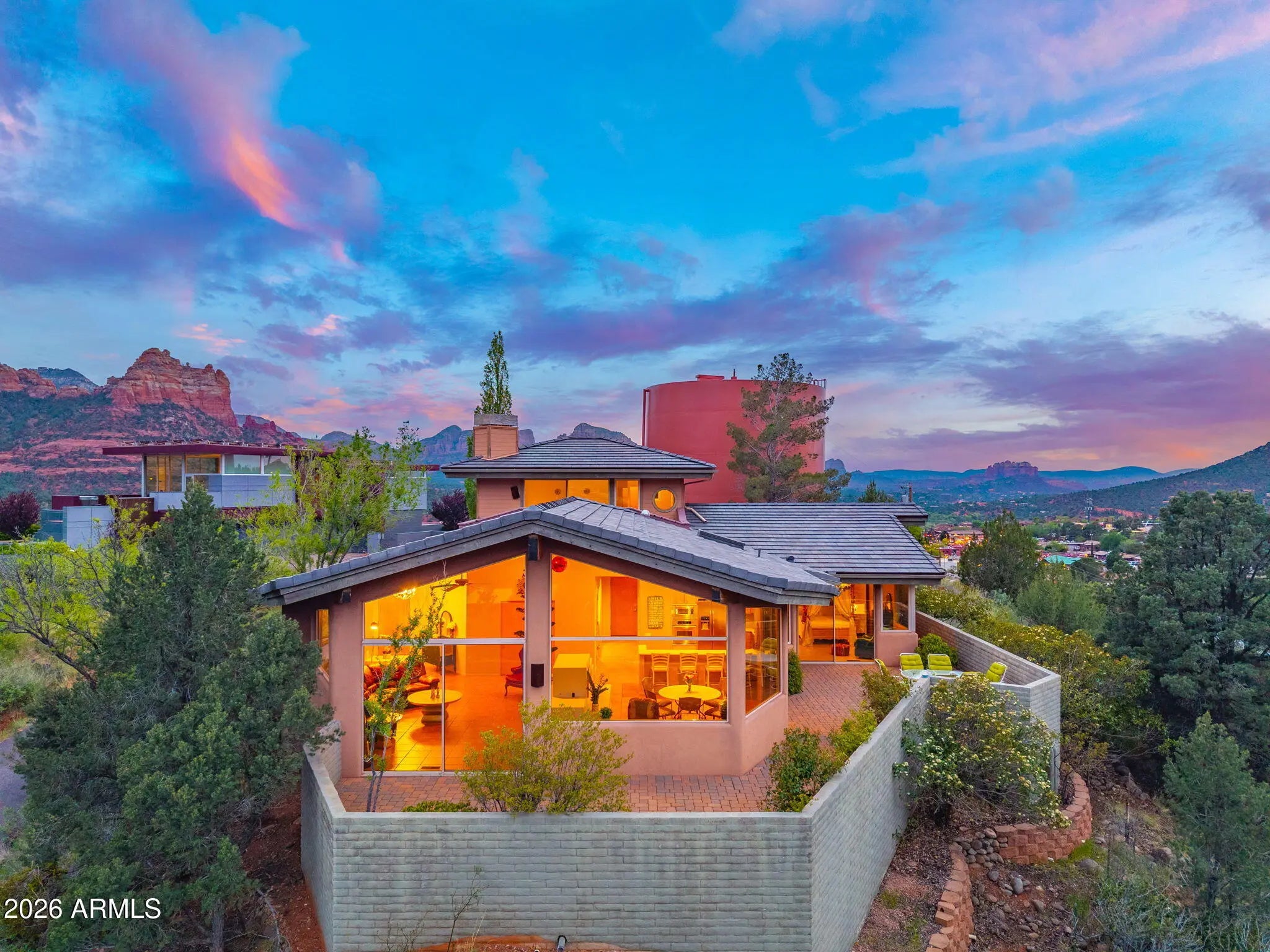 Secluded sanctuary of rare distinction perched atop a private hill in Uptown. This exceptional 2,900 sq ft home delivers breathtaking panoramic red rock views and plentiful spacious built-ins throughout. Built by renowned master builder John Griffin with concrete tile roof and timeless Southwestern architecture, it boasts an expansive open concept floor plan with seamless indoor/outdoor living. Soaring windows frame ever-changing light across iconic formations. Relax on the cozy covered front porch with glorious sunrise views beside a trickling wall fountain. Inside, 3 bed / 2.5 bath offer refined comfort. The upstairs primary suite features its own fireplace and private deck, ideal for morning coffee or evening stargazing. Just a 4 minute stroll to Uptown! No HOA (buy