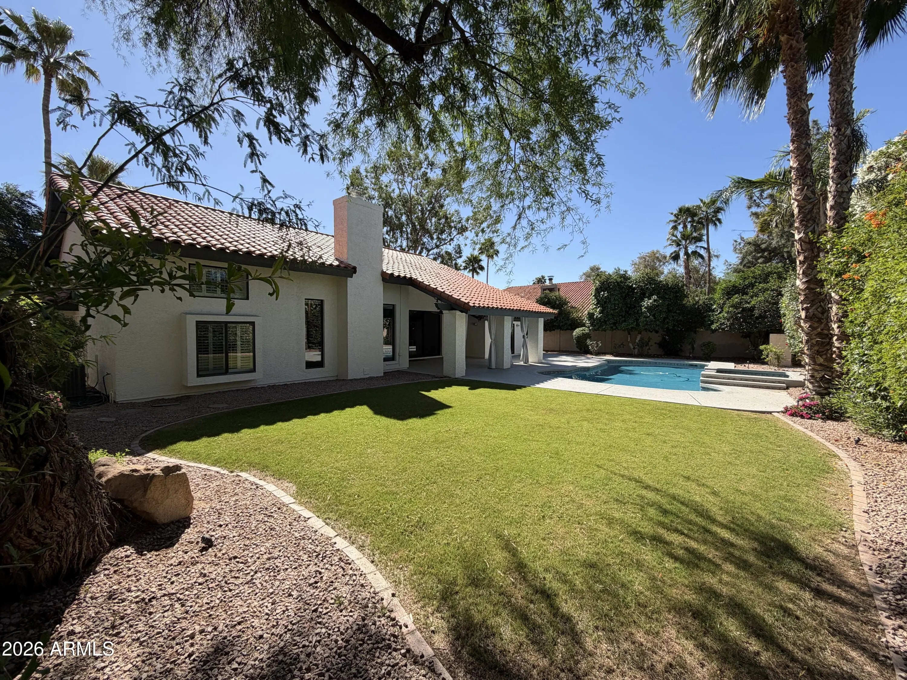 Gorgeous remodeled single-level home in the highly desirable Scottsdale Ranch community! This 4-bedroom, 2.5-bath home., offers 3,259 sq ft of beautifully updated living space on a quiet cul-de-sac. The gourmet kitchen features stainless steel appliances, quartzite countertops, custom cabinetry, a built-in coffee maker, wine fridge, and wet bar. Vaulted ceilings and accordion patio doors create seamless indoor-outdoor living. The split floor plan provides privacy with a spacious primary suite. Enjoy a resort-style backyard with a heated pool and spa, new Pebble Tec resurfacing, new pool deck, and fresh exterior paint. Additional upgrades include whole-house water filtration, irrigation system, remote pool access, and Ring doorbell. Roof replaced in 2015; new pool pump in 2025. Located i Gorgeous, fully remodeled single-level home in the highly sought-after Scottsdale Ranch lake community! This exceptional 4-bedroom, 2.5-bath residence offers 3,259 sq ft of beautifully curated living space, perfectly situated on a quiet cul-de-sac. Designed with both elegance and functionality in mind, the gourmet kitchen showcases stainless steel appliances, stunning quartzite countertops, custom cabinetry, a built-in coffee maker, wine fridge, and a stylish wet bar--ideal for entertaining. Soaring vaulted ceilings and expansive accordion patio doors create a seamless indoor-outdoor experience, filling the home with natural light and enhancing the open, airy ambiance. The thoughtfully designed split floor plan provides ultimate privacy, featuring a spacious primary suite that serves as a serene retreat. Generously sized secondary bedrooms offer comfort and flexibility for family and guests. Step into your private resort-style backyard, complete with a heated pool and spa, newly resurfaced Pebble Tec finish, a brand-new pool deck, and fresh exterior paint--perfect for enjoying Arizona living year-round. Additional premium upgrades include a whole-house water filtration system, irrigation system, remote pool control, and a Ring doorbell for added convenience and peace of mind. The roof was replaced in 2015 and remains under warranty through October 2025, and a new pool pump was installed in 2025--providing added value and confidence. Located within a desirable lake subdivision, this remarkable home offers the perfect blend of luxury, comfort, and prime Scottsdale living.