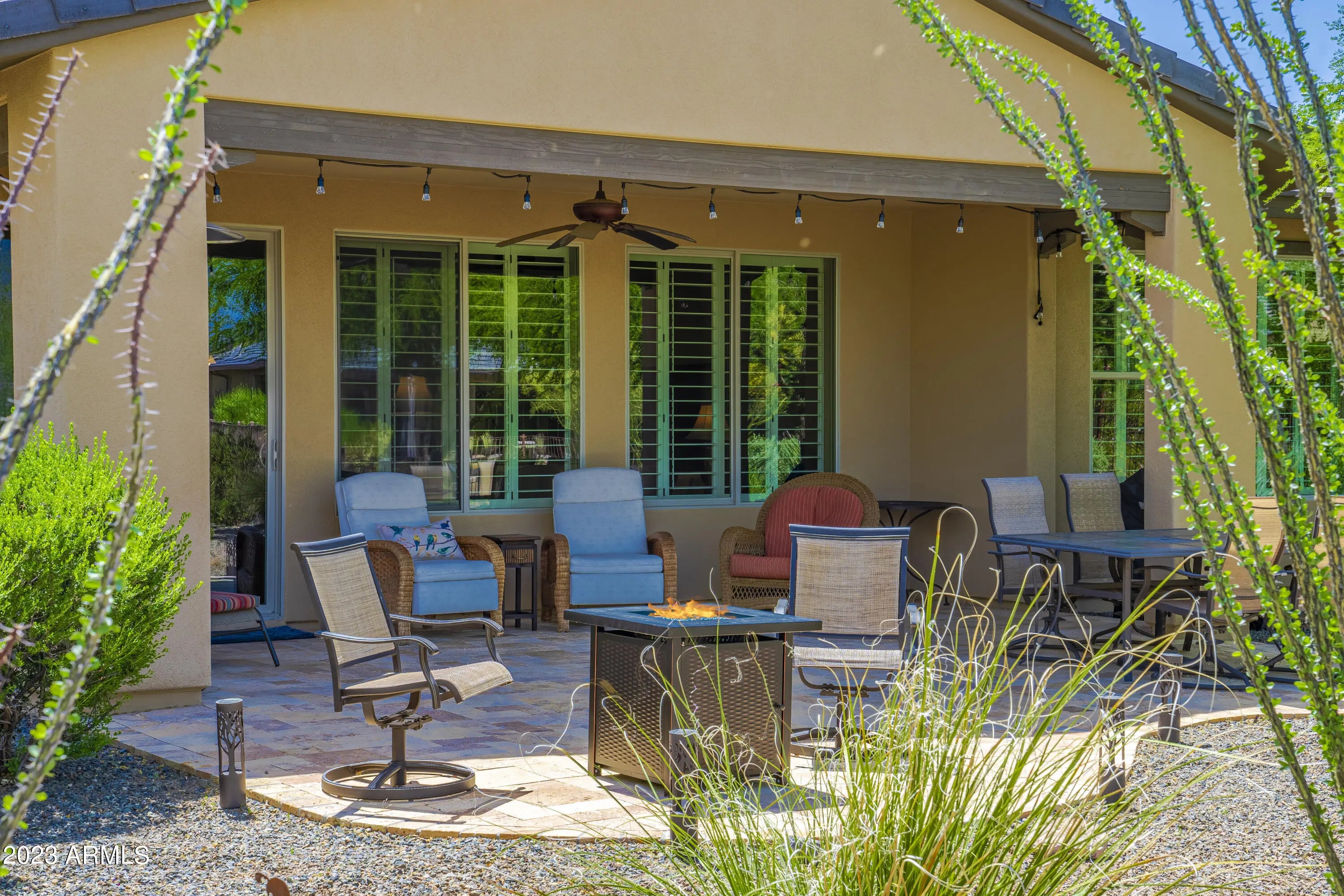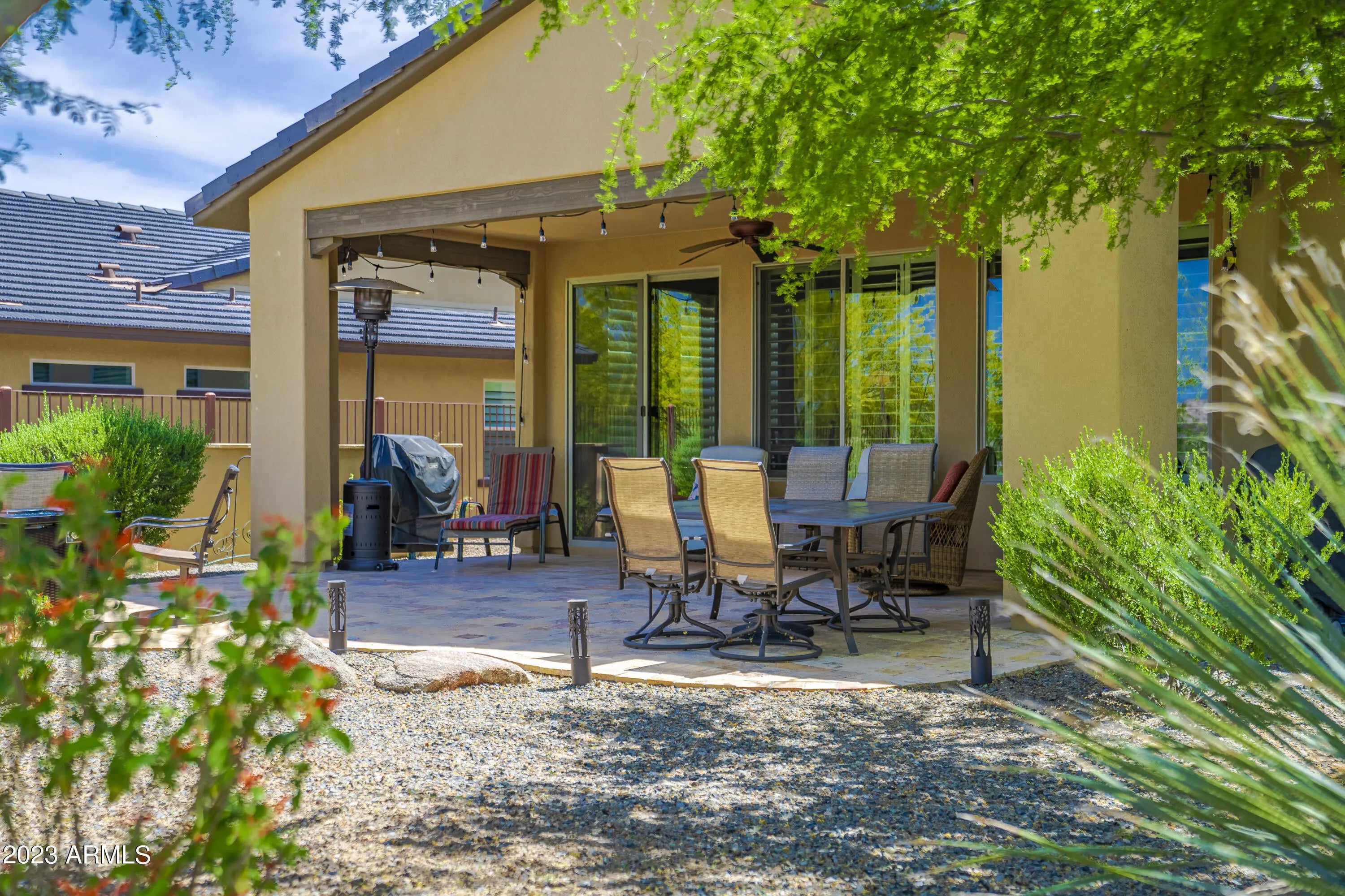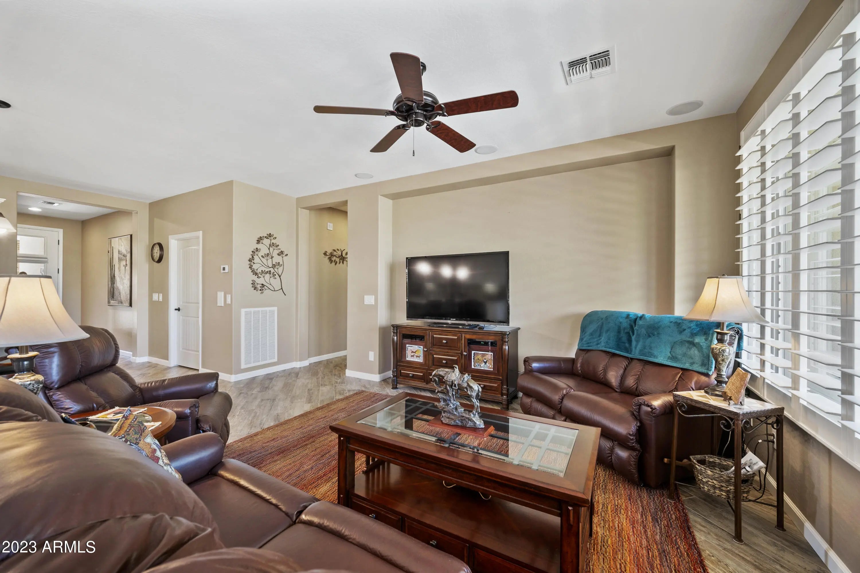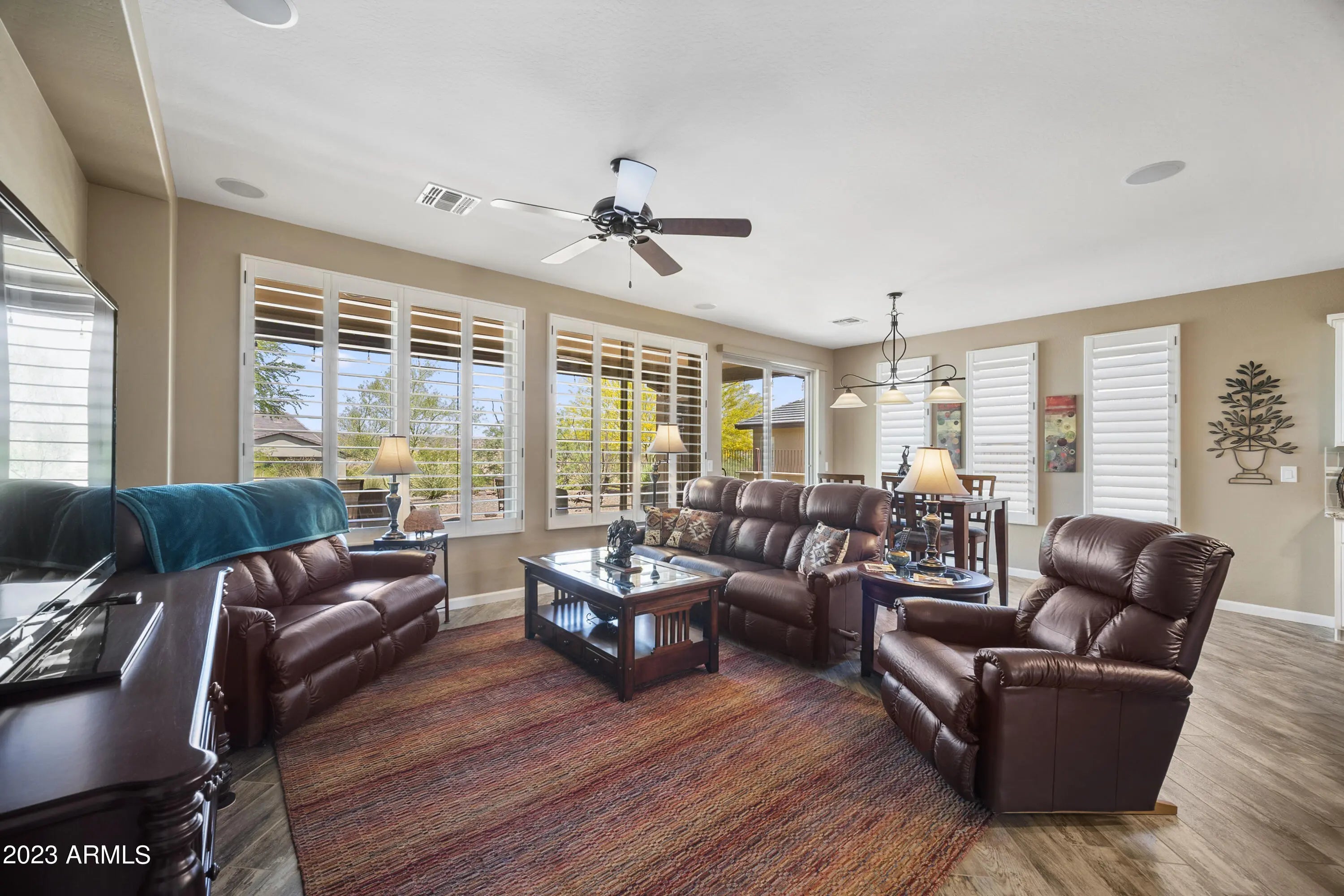 Wickenburg Ranch living works best when a home feels easy the minute you arrive, and this one does exactly that. The layout is efficient, comfortable, and designed to be used, not just looked at. Nothing feels oversized, yet nothing feels missing, creating a balance that works for both full-time living and a lock-and-leave lifestyle. Plantation shutters and hard surface flooring keep everything low maintenance, while the finishes stay clean and consistent throughout. Out back, the extended patio and mature landscaping provide shade and privacy, creating a space that feels established and ready to enjoy without extra effort or ongoing upkeep.