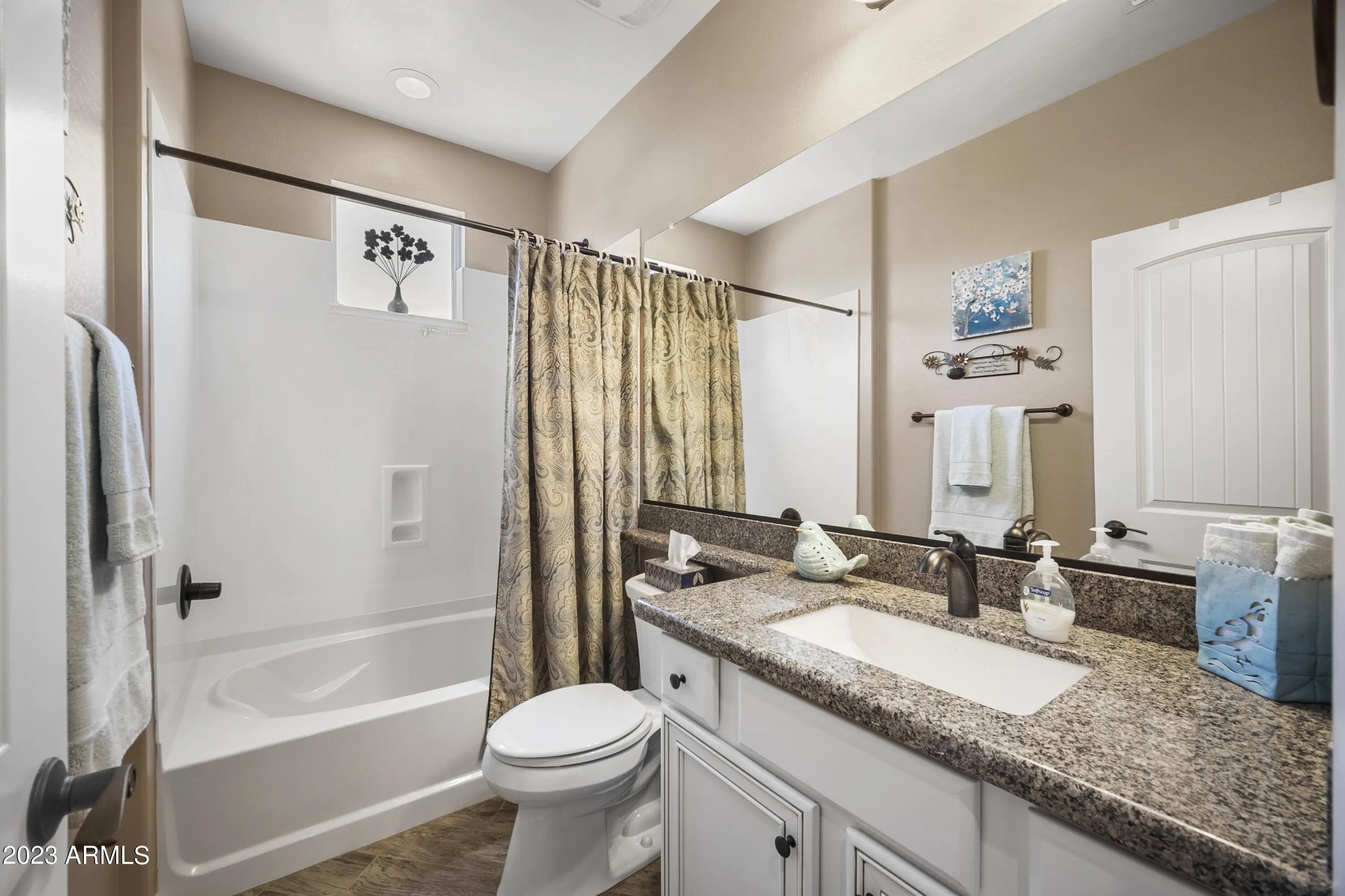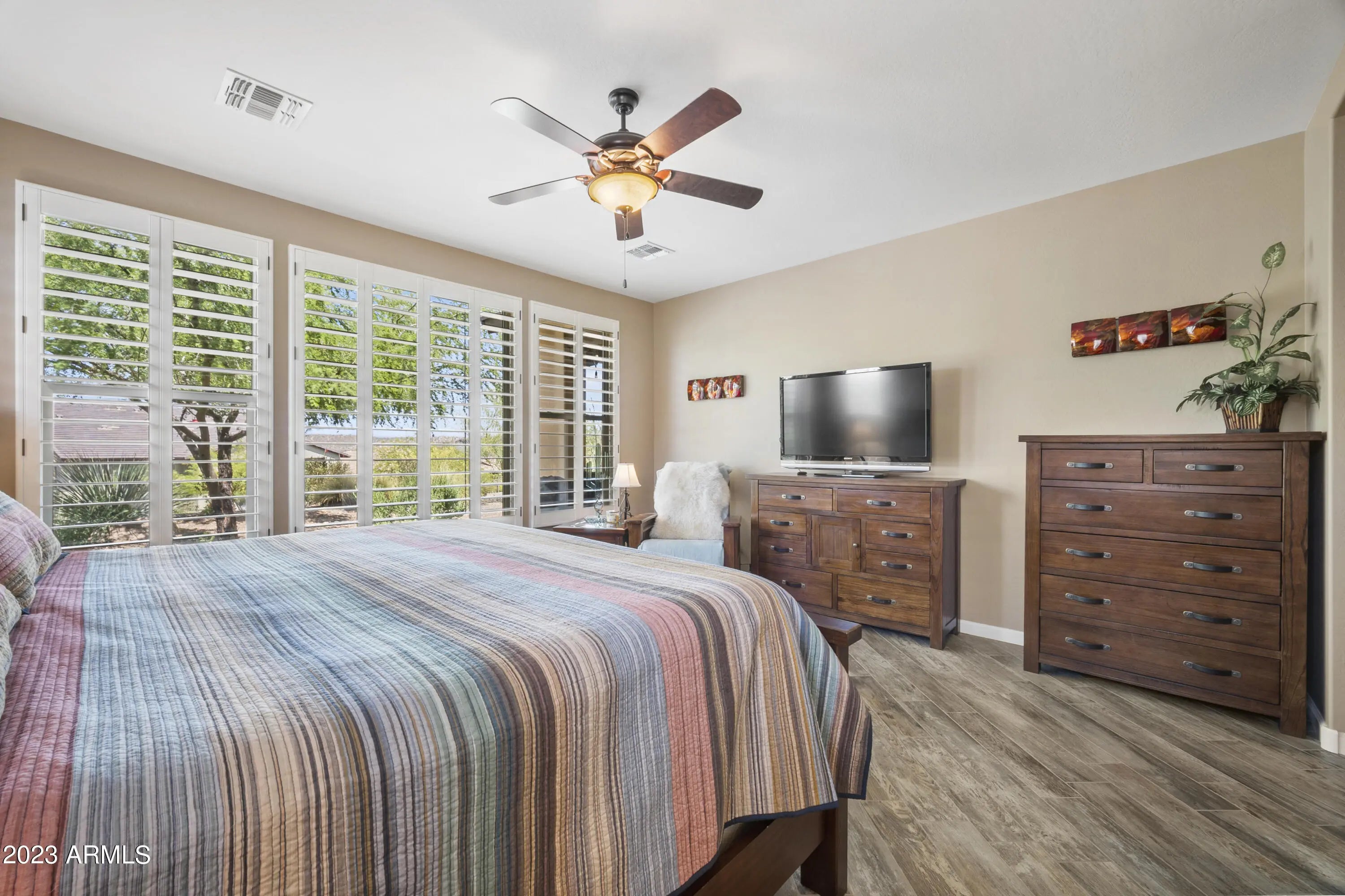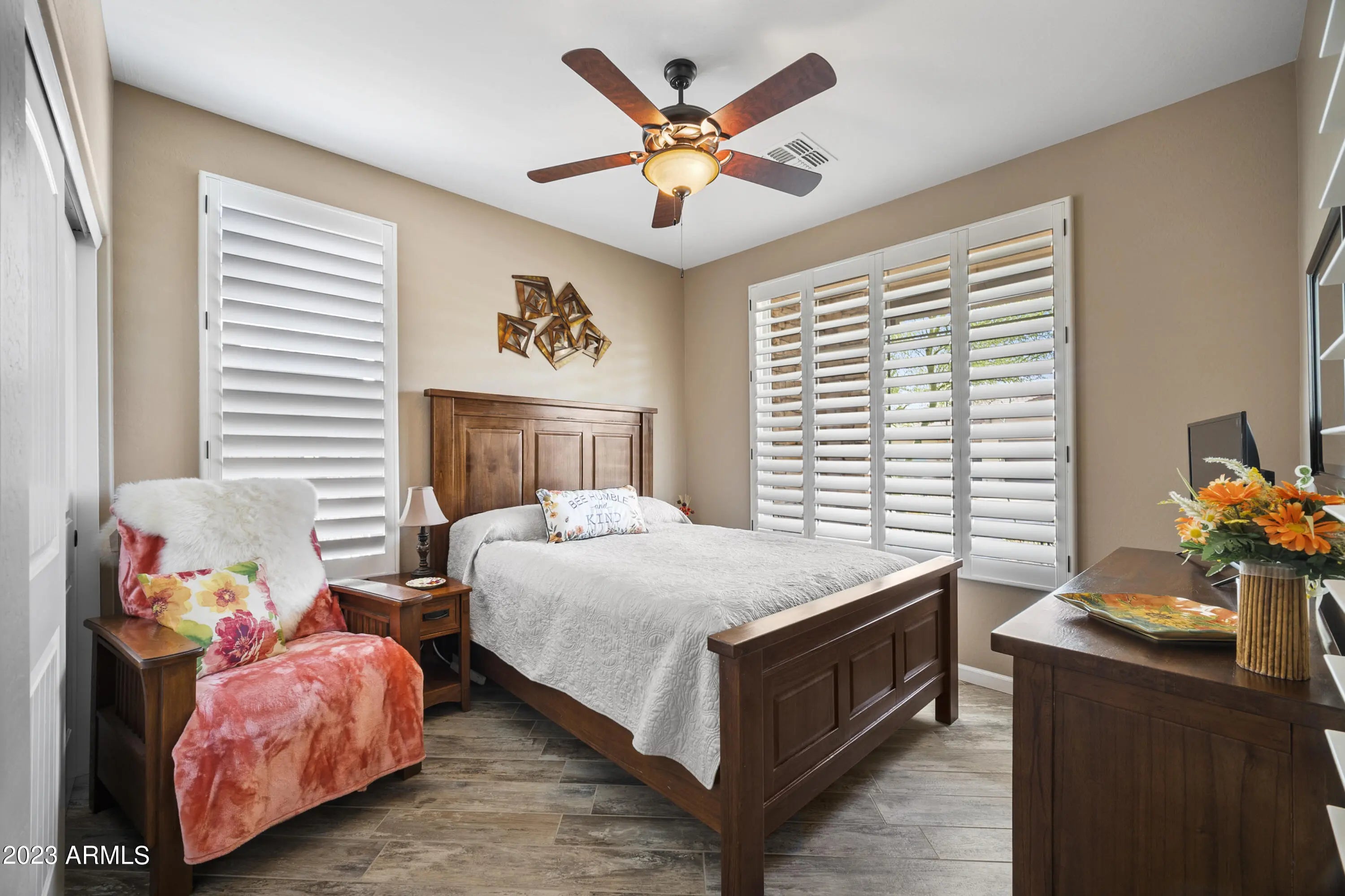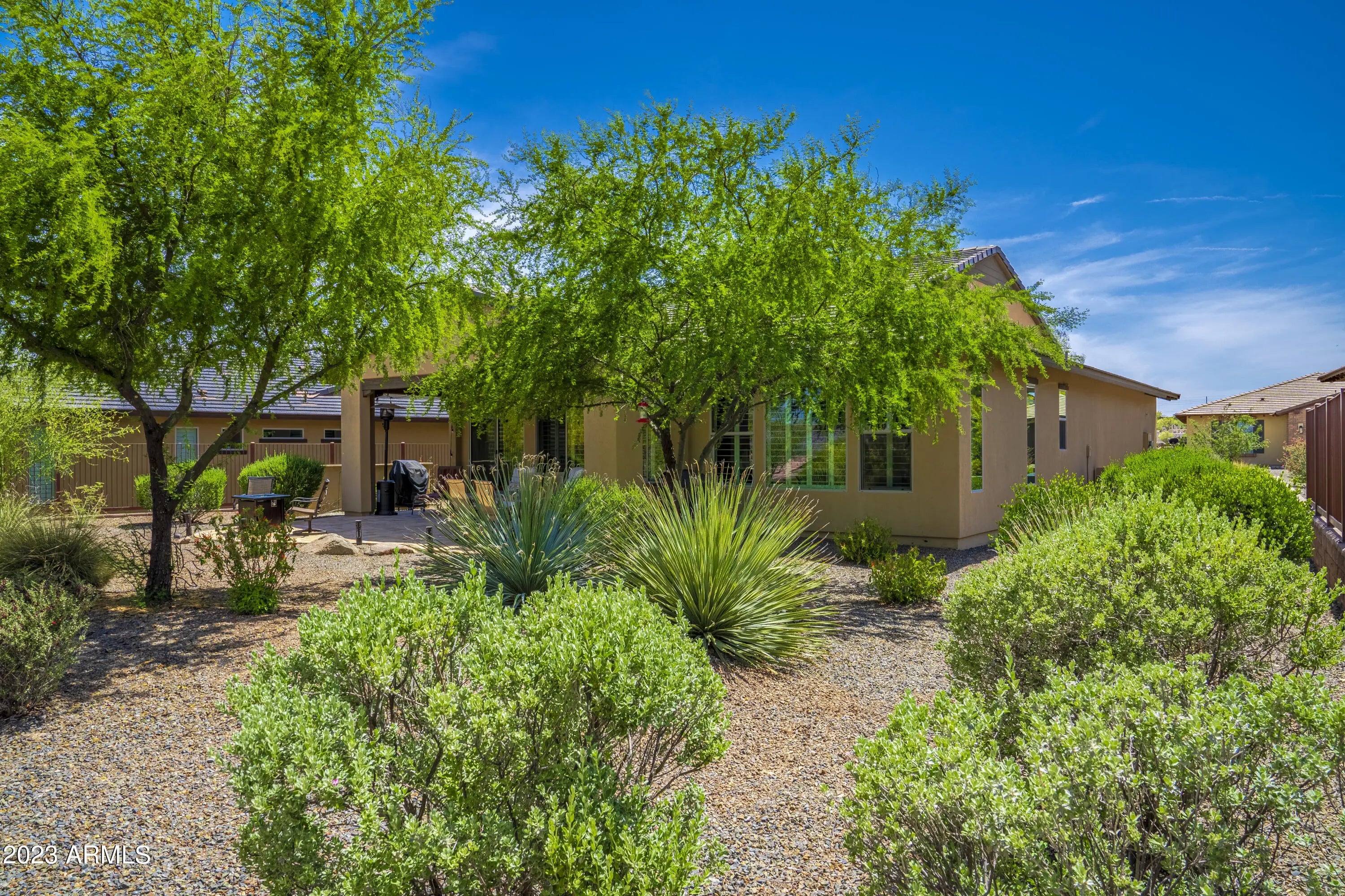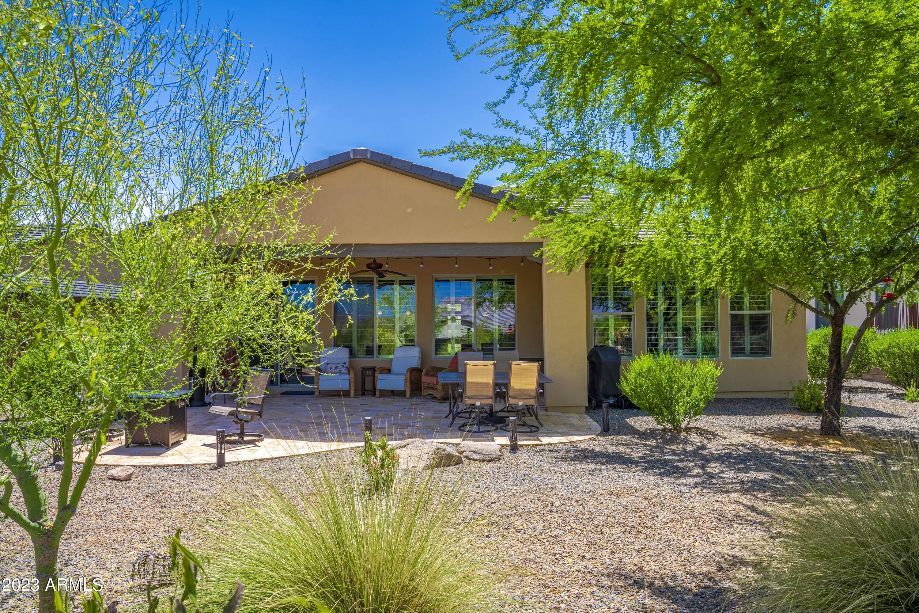 Wickenburg Ranch living works best when a home feels easy the minute you arrive, and this one does exactly that. The layout is efficient, comfortable, and designed to be used, not just looked at. Nothing feels oversized, yet nothing feels missing, creating a balance that works for both full-time living and a lock-and-leave lifestyle. Plantation shutters and hard surface flooring keep everything low maintenance, while the finishes stay clean and consistent throughout. Out back, the extended patio and mature landscaping provide shade and privacy, creating a space that feels established and ready to enjoy without extra effort or ongoing upkeep.