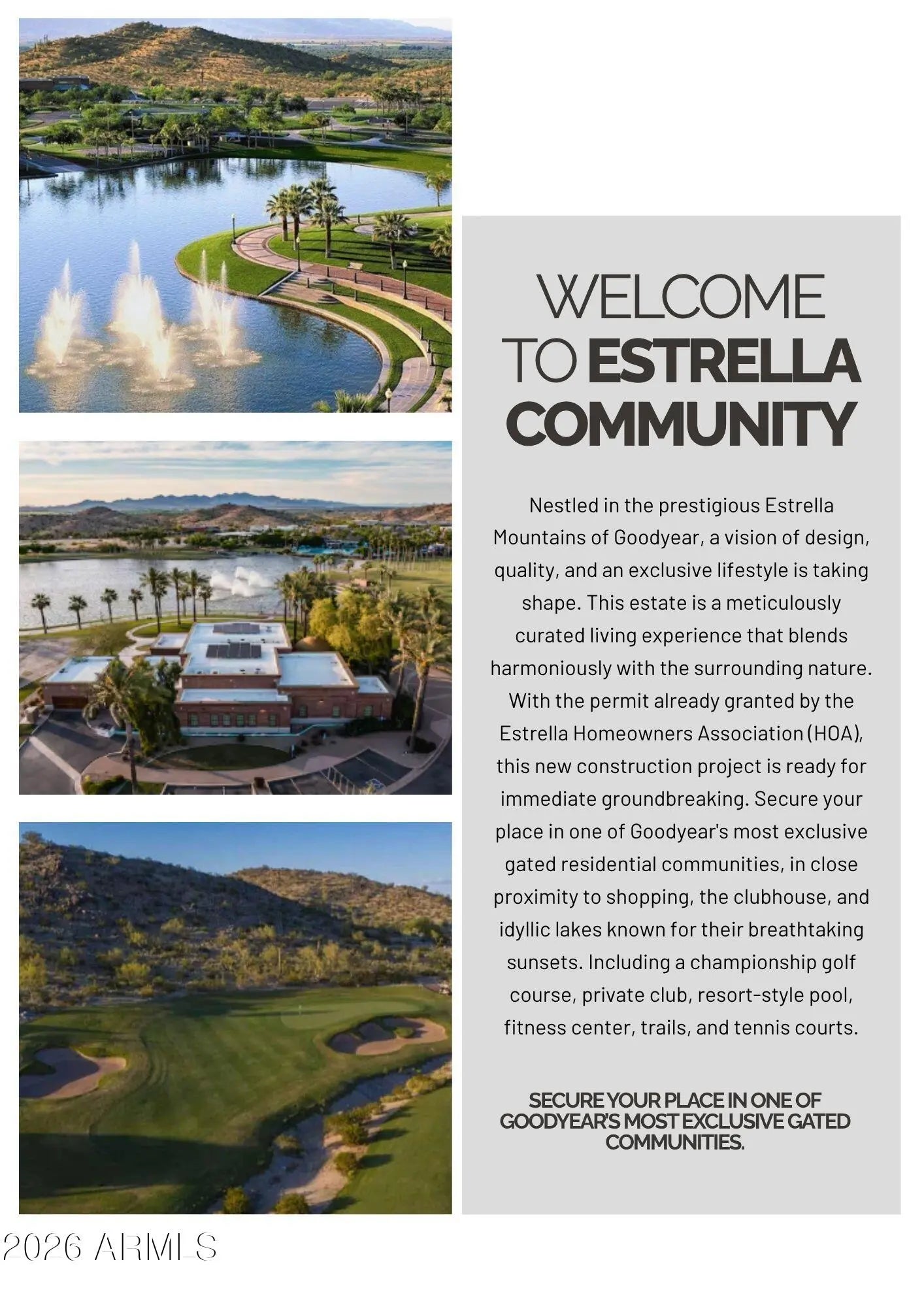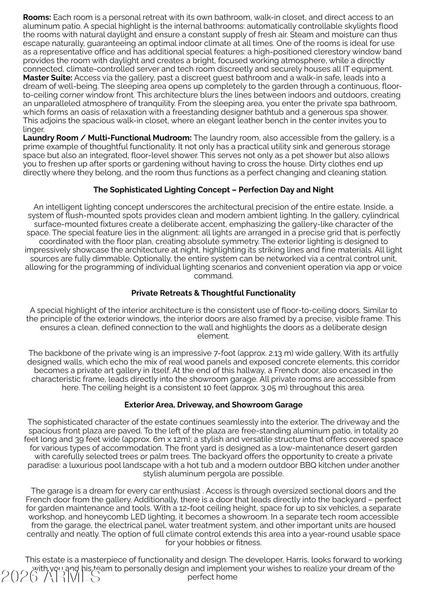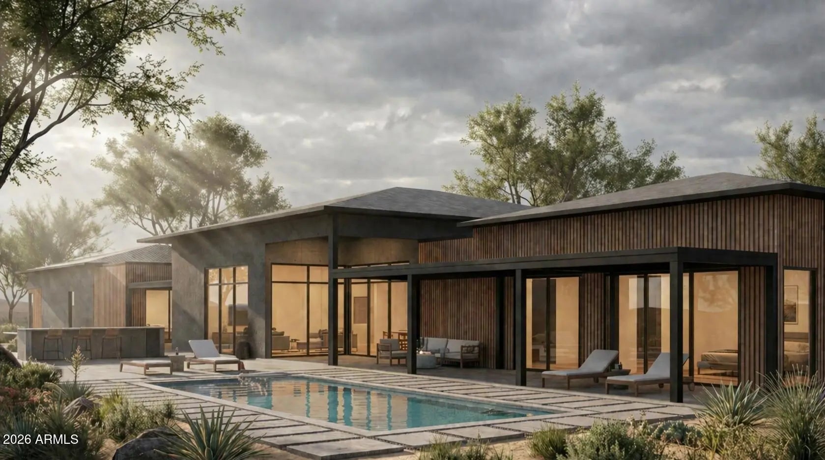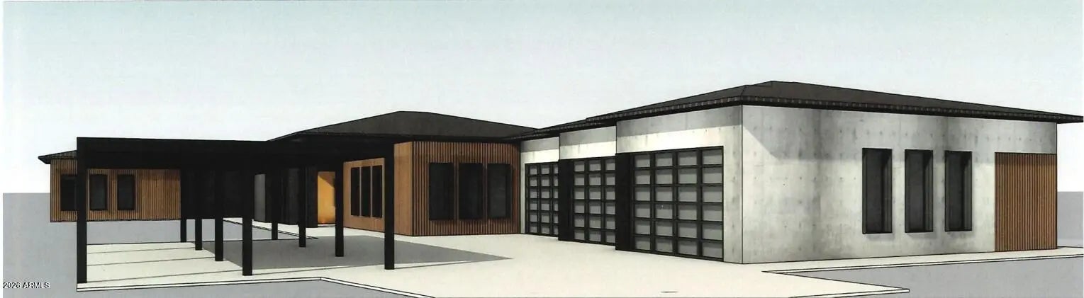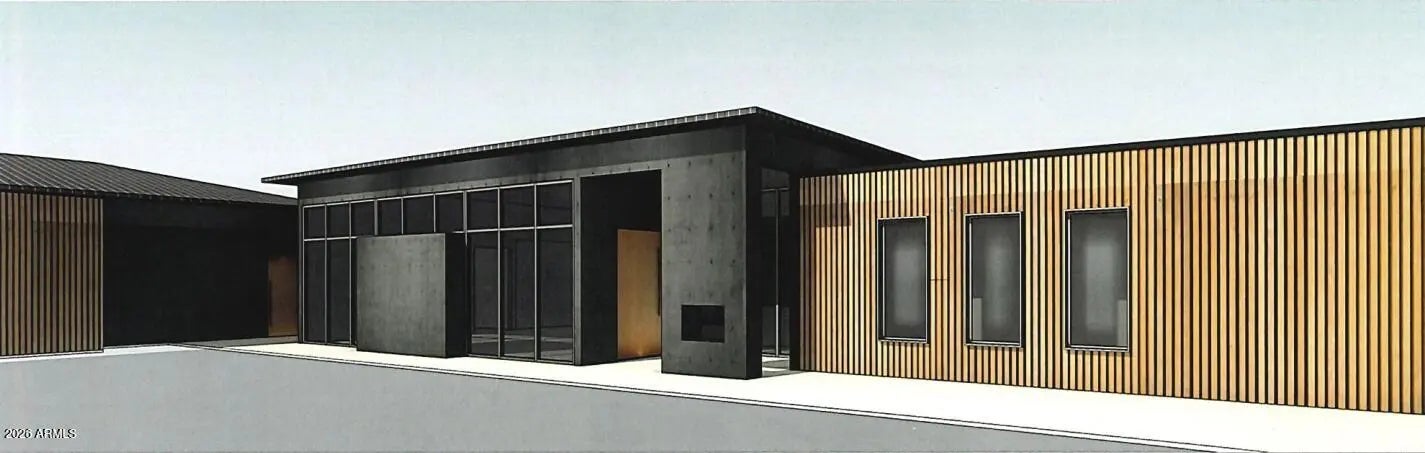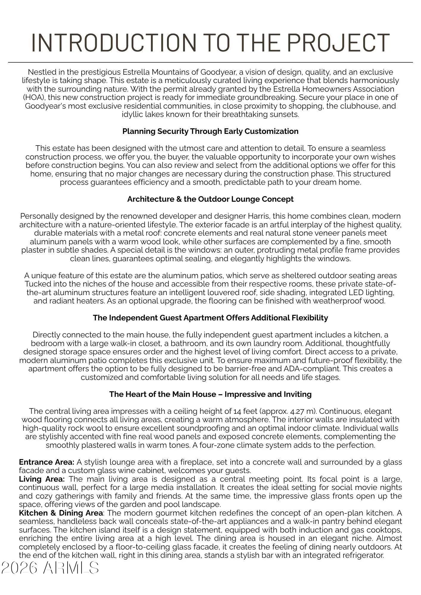 This property will sit on a generous 0.573-acre lot (24,944 sq ft) and offers a combined total of approximately 8,207 sq ft of built space, including the main house, guest suite, garage, and framed porches. With the permit already granted by the Estrella Homeowners Association (HOA), this new construction project is ready for immediate groundbreaking. Secure your place in one of Goodyear's most exclusive residential communities, in close proximity to shopping, the clubhouse, and idyllic lakes known for their breathtaking sunsets. A single source for design, planning, and building. All photos are virtual renderings provided by the builder and architect; actual finishes and features may vary. **Planning Security Through Early Customization** This estate has been designed with the utmost care and attention to detail. To ensure a seamless construction process, we offer you, the buyer, the valuable opportunity to incorporate your own wishes before construction begins. You can also review and select from the additional options we offer for this home, ensuring that no major changes are necessary during the construction phase. This structured process guarantees efficiency and a smooth, predictable path to your dream home. **Architecture & the Outdoor Lounge Concept** Personally designed by the renowned developer and designer Harris, this home combines clean, modern architecture with a nature-oriented lifestyle. The exterior facade is an artful interplay of the highest quality, durable materials with a metal roof: concrete elements and real natural stone veneer panels meet aluminum panels with a warm wood look, while other surfaces are complemented by a fine, smooth plaster in subtle shades. A special detail is the windows: an outer, protruding metal profile frame provides clean lines, guarantees optimal sealing, and elegantly highlights the windows. A unique feature of this estate is the private patios, which serve as sheltered outdoor seating areas Tucked into the niches of the house and accessible from their respective rooms, these state-of-the-art aluminum structures feature an intelligent louvered roof, side shading, integrated LED lighting, and radiant heaters. As an optional upgrade, the flooring can be finished with weatherproof wood. **The Independent Guest Apartment Offers Additional Flexibility** Directly connected to the main house, the fully independent guest apartment includes a kitchen, a bedroom with a large walk-in closet, a bathroom, and its own laundry room. Additional, thoughtfully designed storage space ensures order and the highest level of living comfort. Direct access to a private, modern aluminum patio completes this exclusive unit. To ensure maximum and future-proof flexibility, the apartment offers the option to be fully designed to be barrier-free and ADA-compliant. This creates a customized and comfortable living solution for all needs and life stages. **The Heart of the Main House - Impressive and Inviting** The central living area impresses with a ceiling height of 14 feet (approx. 4.27 m). Continuous, elegant wood flooring connects all living areas, creating a warm atmosphere. The interior walls are insulated with high-quality rock wool to ensure excellent soundproofing and an optimal indoor climate. Individual walls are stylishly accented with fine real wood panels and exposed concrete elements, complementing the smoothly plastered walls in warm tones. A four-zone climate system adds to the perfection. * Entrance Area: A stylish lounge area with a fireplace, set into a concrete wall and surrounded by a glass facade and a custom glass wine cabinet, welcomes your guests. * Living Area: The main living area is designed as a central meeting point. Its focal point is a large, continuous wall, perfect for a large media installation. It creates the ideal setting for social movie nights and cozy gatherings with family and friends. At the same time, the impressive glass fronts open up the space, offering views of the garden and pool landscape. * Kitchen & Dining Area: The modern gourmet kitchen redefines the concept of an open-plan kitchen. A seamless, handleless back wall conceals state-of-the-art appliances and a walk-in pantry behind elegant surfaces. The kitchen island itself is a design statement, equipped with both induction and gas cooktops, enriching the entire living area at a high level. The dining area is housed in an elegant niche. Almost completely enclosed by a floor-to-ceiling glass facade, it creates the feeling of dining nearly outdoors. At the end of the kitchen wall, right in this dining area, stands a stylish bar with an integrated refrigerator. * Rooms: Each room is a personal retreat with its own bathroom, walk-in closet, and direct access to a modern aluminum patio. A special highlight is the internal bathrooms: modern, automatically controllable skylights flood the rooms with natural daylight and ensure a constant supply of fresh air. Steam and moisture can thus escape naturally, guaranteeing an optimal indoor climate at all times. One of the rooms is ideal for use as a representative office and has additional special features: a high-positioned clerestory window band provides the room with daylight and creates a bright, focused working atmosphere, while a directly connected, climate-controlled server and tech room discreetly and securely houses all IT equipment. * Master Suite: Access via the gallery, past a discreet guest bathroom and a walk-in safe, leads into a dream of well-being. The sleeping area opens up completely to the garden through a continuous, floor-to-ceiling corner window front. This architecture blurs the lines between indoors and outdoors, creating an unparalleled atmosphere of tranquility. From the sleeping area, you enter the private spa bathroom, which forms an oasis of relaxation with a freestanding designer bathtub and a generous spa shower. This adjoins the spacious walk-in closet, where an elegant leather bench in the cente