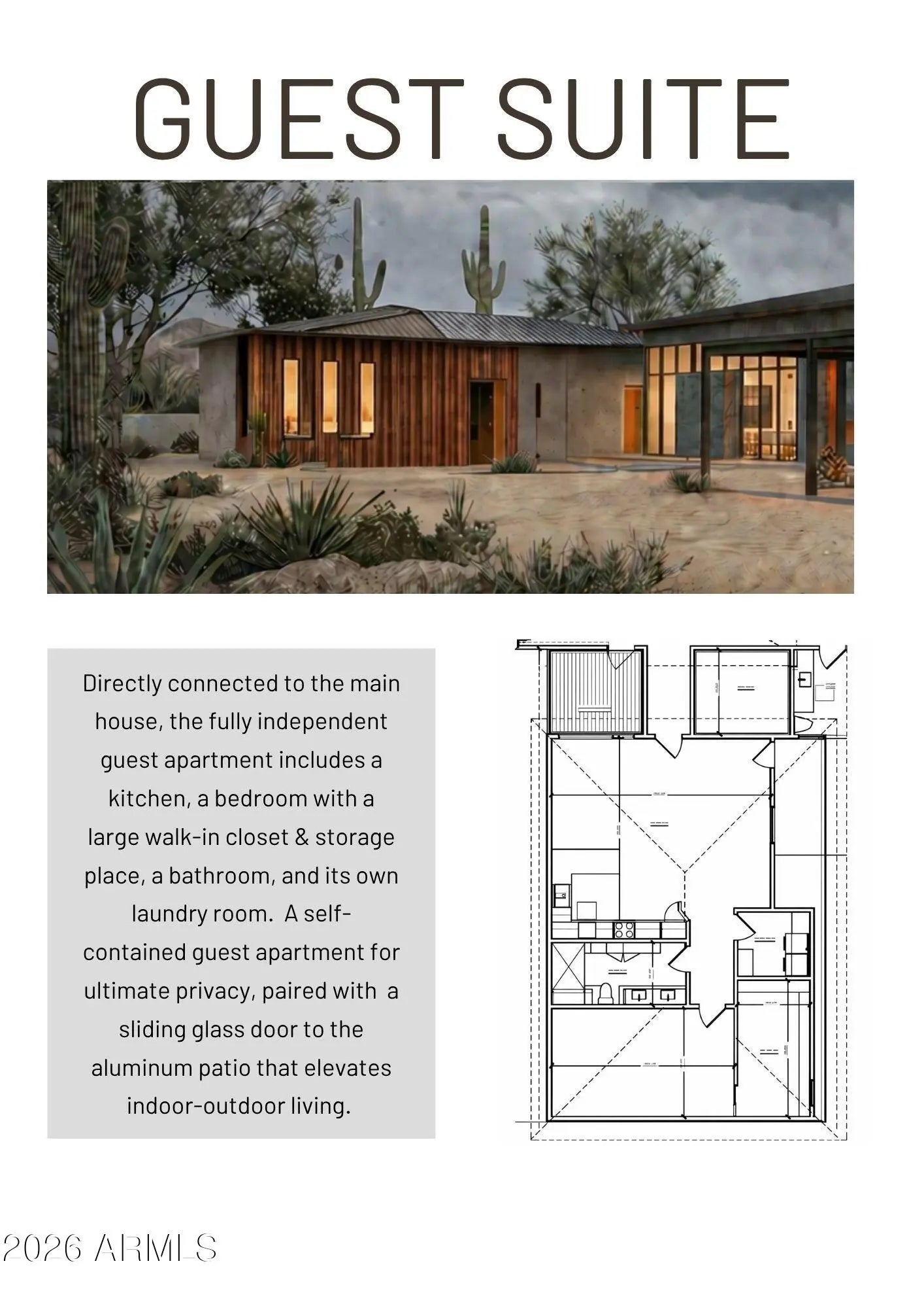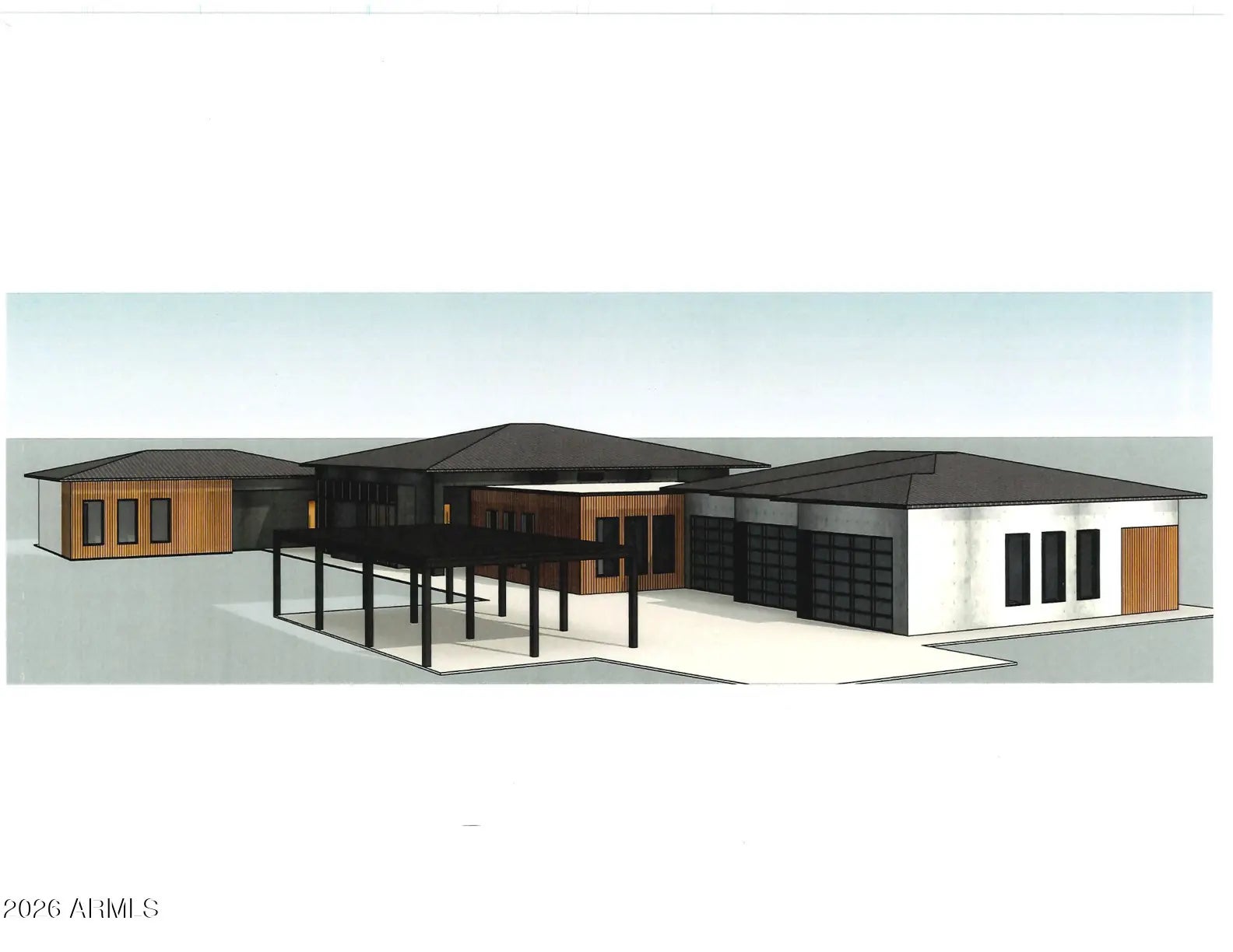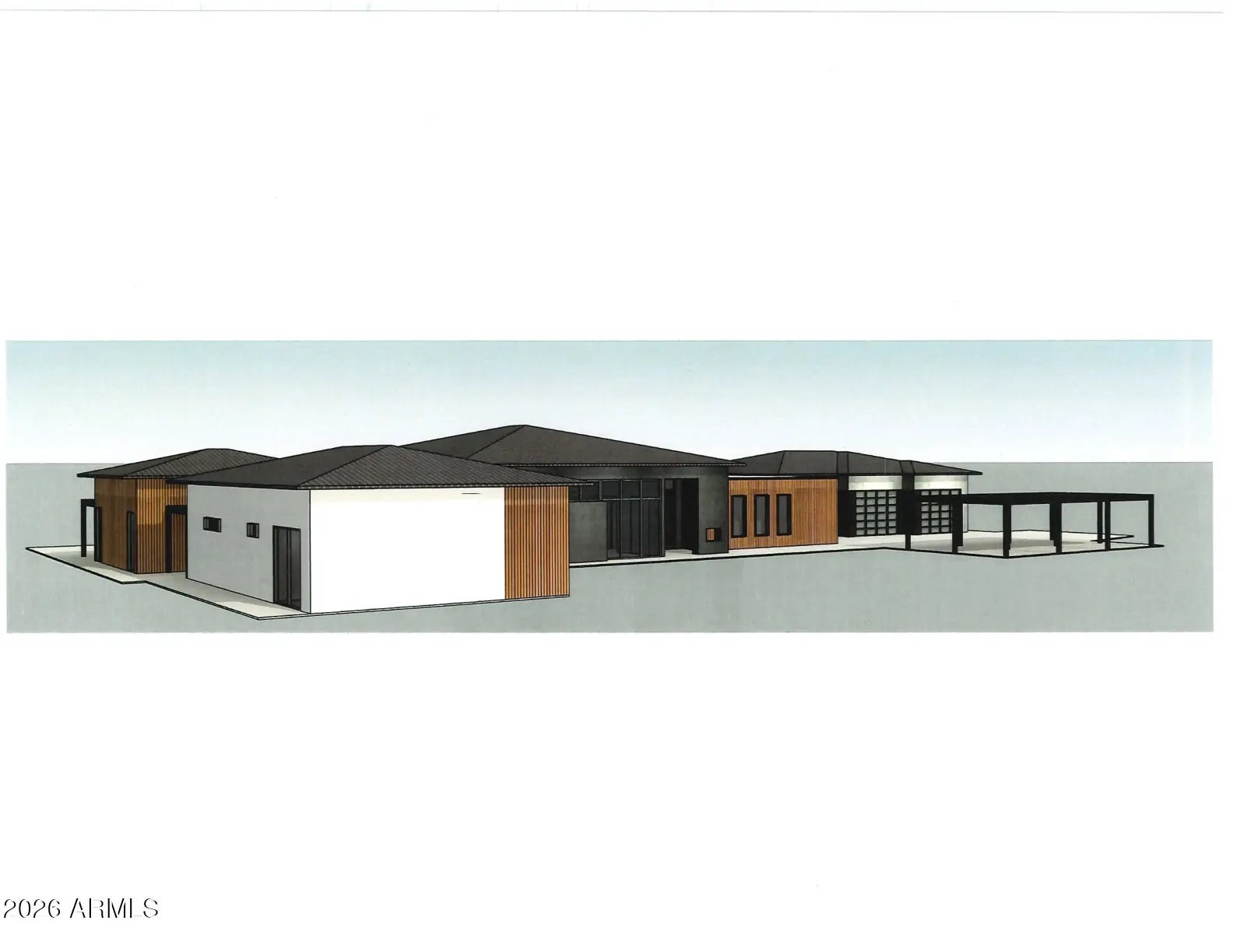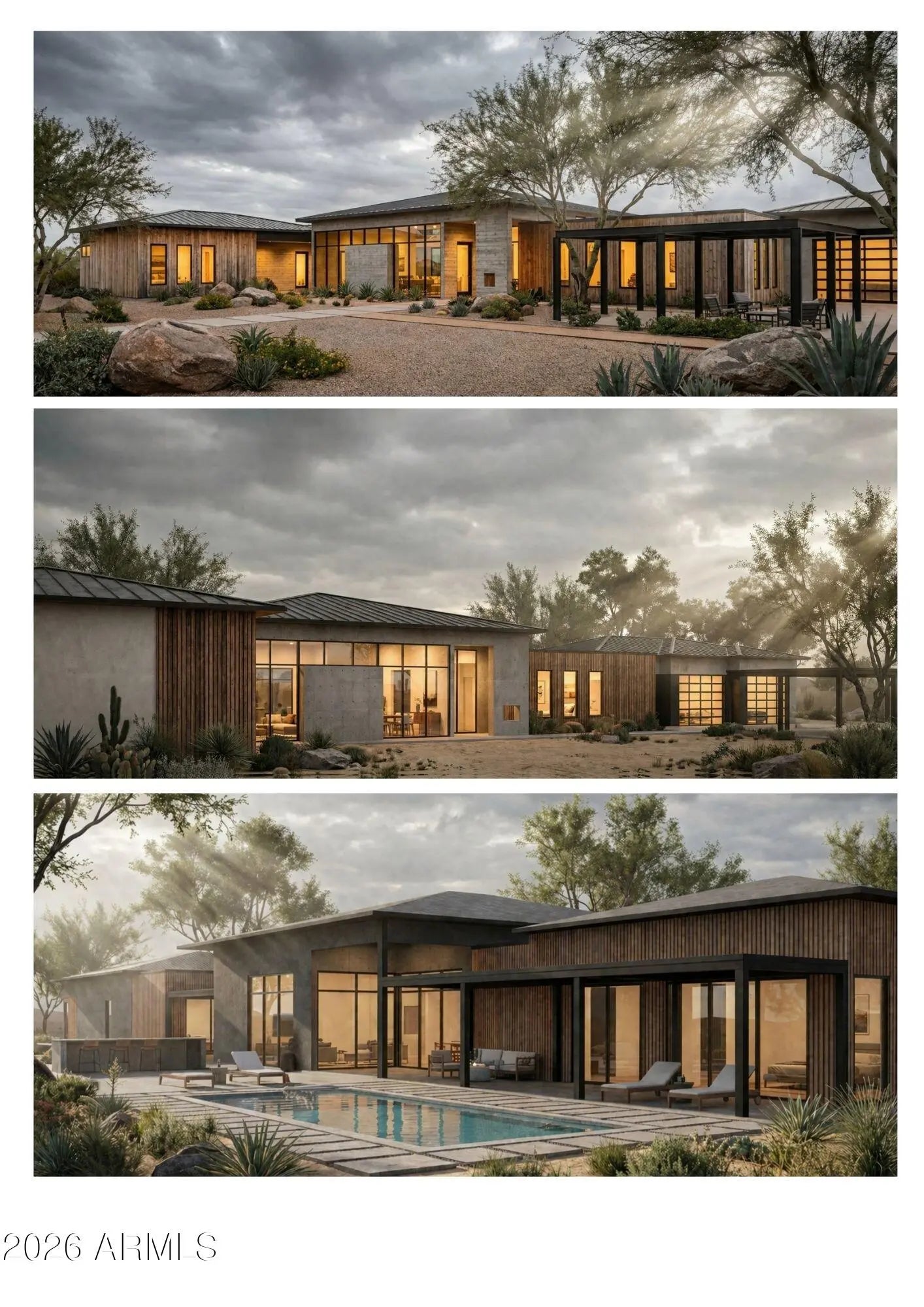 This property will sit on a generous 0.573-acre lot (24,944 sq ft) and offers a combined total of approximately 8,207 sq ft of built space, including the main house, guest suite, garage, and framed porches. With the permit already granted by the Estrella Homeowners Association (HOA), this new construction project is ready for immediate groundbreaking. Secure your place in one of Goodyear's most exclusive residential communities, in close proximity to shopping, the clubhouse, and idyllic lakes known for their breathtaking sunsets. A single source for design, planning, and building. All photos are virtual renderings provided by the builder and architect; actual finishes and features may vary. **Planning Security Through Early Customization** This estate has been designed with the utmost care and attention to detail. To ensure a seamless construction process, we offer you, the buyer, the valuable opportunity to incorporate your own wishes before construction begins. You can also review and select from the additional options we offer for this home, ensuring that no major changes are necessary during the construction phase. This structured process guarantees efficiency and a smooth, predictable path to your dream home. **Architecture & the Outdoor Lounge Concept** Personally designed by the renowned developer and designer Harris, this home combines clean, modern architecture with a nature-oriented lifestyle. The exterior facade is an artful interplay of the highest quality, durable materials with a metal roof: concrete elements and real natural stone veneer panels meet aluminum panels with a warm wood look, while other surfaces are complemented by a fine, smooth plaster in subtle shades. A special detail is the windows: an outer, protruding metal profile frame provides clean lines, guarantees optimal sealing, and elegantly highlights the windows. A unique feature of this estate is the private patios, which serve as sheltered outdoor seating areas Tucked into the niches of the house and accessible from their respective rooms, these state-of-the-art aluminum structures feature an intelligent louvered roof, side shading, integrated LED lighting, and radiant heaters. As an optional upgrade, the flooring can be finished with weatherproof wood. **The Independent Guest Apartment Offers Additional Flexibility** Directly connected to the main house, the fully independent guest apartment includes a kitchen, a bedroom with a large walk-in closet, a bathroom, and its own laundry room. Additional, thoughtfully designed storage space ensures order and the highest level of living comfort. Direct access to a private, modern aluminum patio completes this exclusive unit. To ensure maximum and future-proof flexibility, the apartment offers the option to be fully designed to be barrier-free and ADA-compliant. This creates a customized and comfortable living solution for all needs and life stages. **The Heart of the Main House - Impressive and Inviting** The central living area impresses with a ceiling height of 14 feet (approx. 4.27 m). Continuous, elegant wood flooring connects all living areas, creating a warm atmosphere. The interior walls are insulated with high-quality rock wool to ensure excellent soundproofing and an optimal indoor climate. Individual walls are stylishly accented with fine real wood panels and exposed concrete elements, complementing the smoothly plastered walls in warm tones. A four-zone climate system adds to the perfection. * Entrance Area: A stylish lounge area with a fireplace, set into a concrete wall and surrounded by a glass facade and a custom glass wine cabinet, welcomes your guests. * Living Area: The main living area is designed as a central meeting point. Its focal point is a large, continuous wall, perfect for a large media installation. It creates the ideal setting for social movie nights and cozy gatherings with family and friends. At the same time, the impressive glass fronts open up the space, offering views of the garden and pool landscape. * Kitchen & Dining Area: The modern gourmet kitchen redefines the concept of an open-plan kitchen. A seamless, handleless back wall conceals state-of-the-art appliances and a walk-in pantry behind elegant surfaces. The kitchen island itself is a design statement, equipped with both induction and gas cooktops, enriching the entire living area at a high level. The dining area is housed in an elegant niche. Almost completely enclosed by a floor-to-ceiling glass facade, it creates the feeling of dining nearly outdoors. At the end of the kitchen wall, right in this dining area, stands a stylish bar with an integrated refrigerator. * Rooms: Each room is a personal retreat with its own bathroom, walk-in closet, and direct access to a modern aluminum patio. A special highlight is the internal bathrooms: modern, automatically controllable skylights flood the rooms with natural daylight and ensure a constant supply of fresh air. Steam and moisture can thus escape naturally, guaranteeing an optimal indoor climate at all times. One of the rooms is ideal for use as a representative office and has additional special features: a high-positioned clerestory window band provides the room with daylight and creates a bright, focused working atmosphere, while a directly connected, climate-controlled server and tech room discreetly and securely houses all IT equipment. * Master Suite: Access via the gallery, past a discreet guest bathroom and a walk-in safe, leads into a dream of well-being. The sleeping area opens up completely to the garden through a continuous, floor-to-ceiling corner window front. This architecture blurs the lines between indoors and outdoors, creating an unparalleled atmosphere of tranquility. From the sleeping area, you enter the private spa bathroom, which forms an oasis of relaxation with a freestanding designer bathtub and a generous spa shower. This adjoins the spacious walk-in closet, where an elegant leather bench in the cente