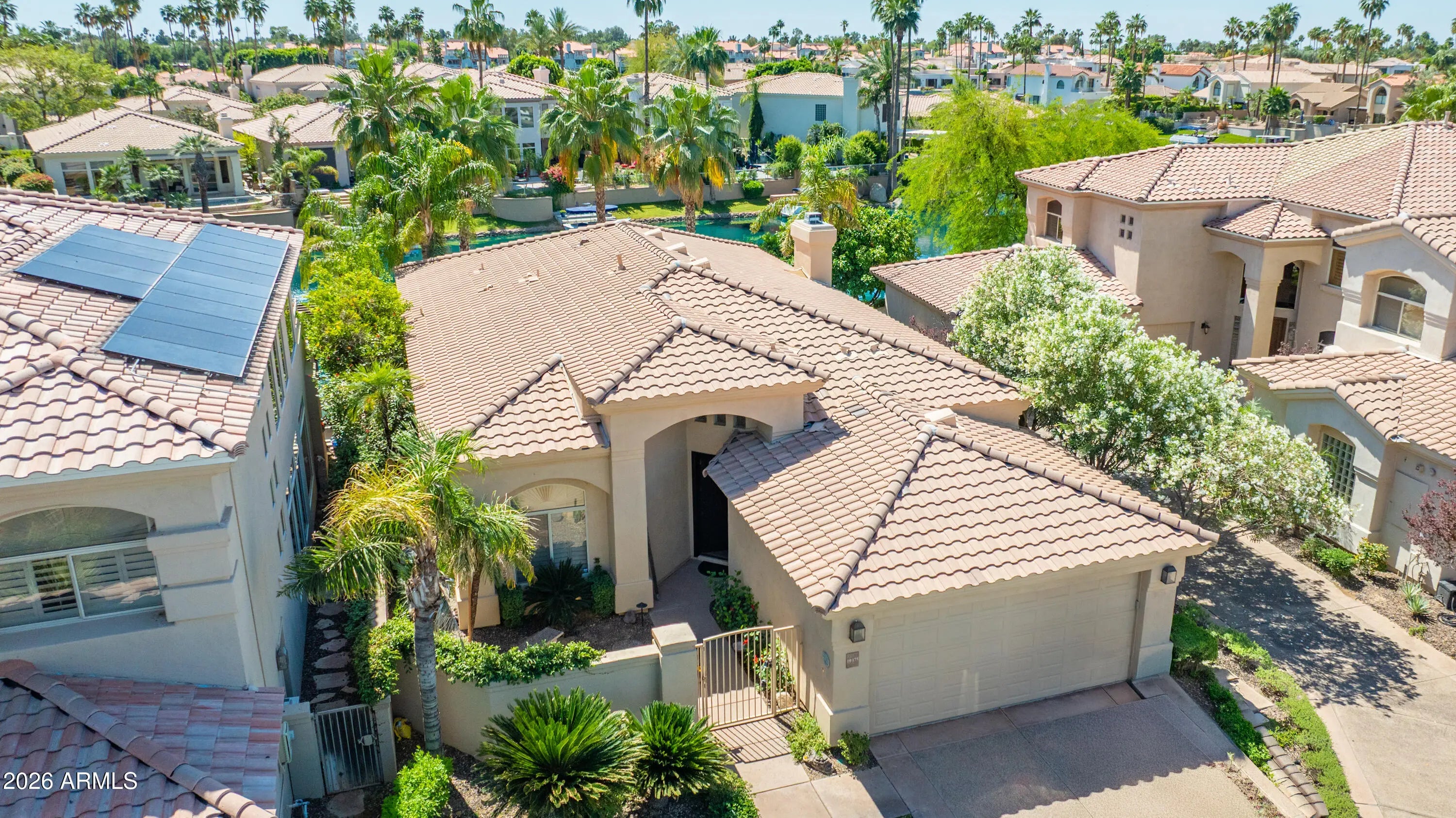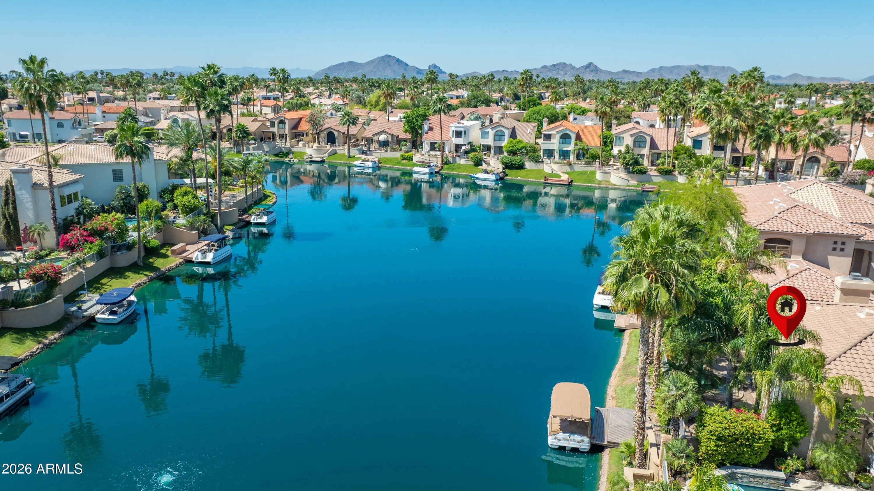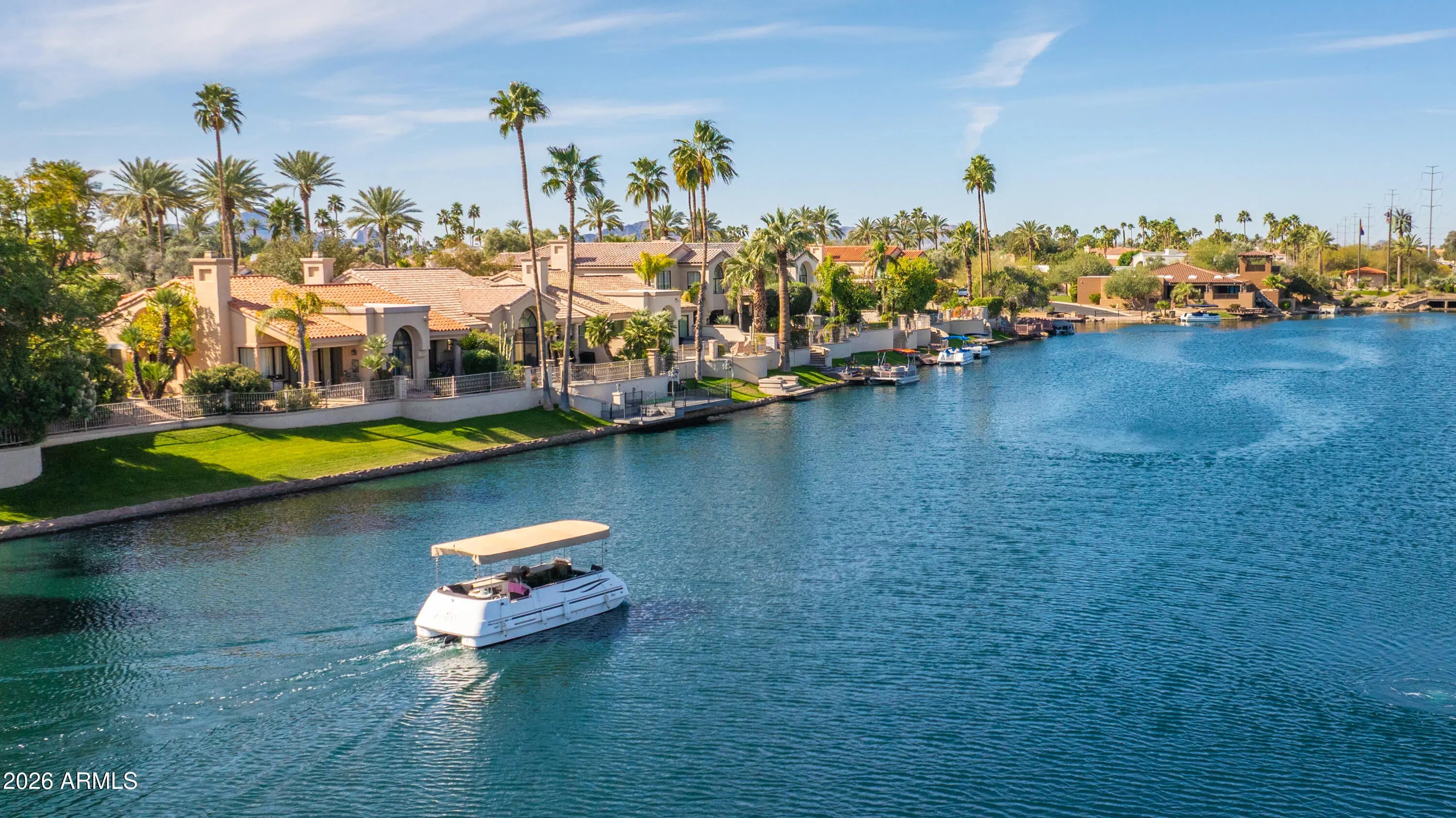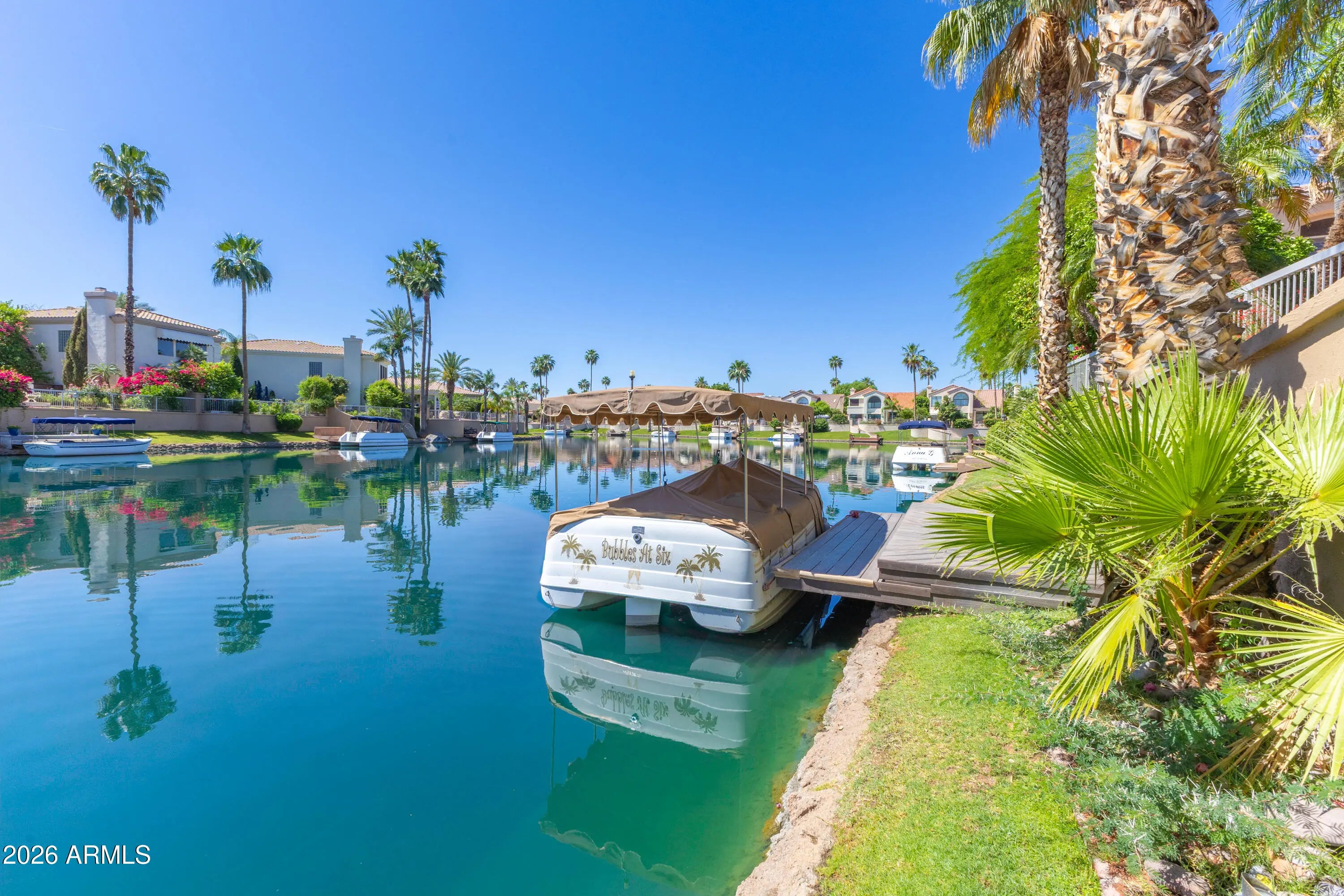 Beautifully renovated in late 2025-located on a WATERFRONT lot-single-level home in The Landings a gated community in Scottsdale Ranch. This 3-bedroom, 2.5-bath residence features an open, light-filled floor plan with high ceilings and spacious living and dining areas ideal for everyday living and entertaining. The updated kitchen offers upgraded cabinetry, quartz countertops, stainless steel appliances, and a breakfast area/dining overlooking the water. The primary suite includes a walk-in closet, spacious bathroom with large shower . Two additional bedrooms provide flexible space for guests or a home office. Step outside to a private patio with ideal exposure, private pool with jets, backing to the water, where you'll enjoy stunning Arizona sunsets and your lake access & boat dock.