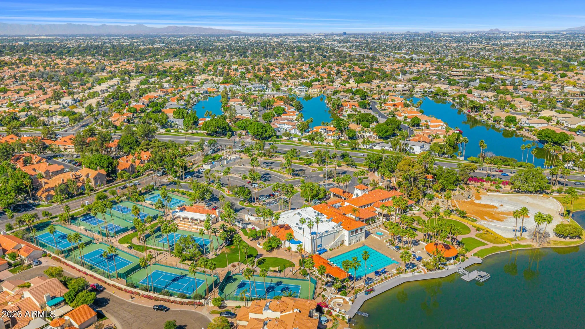 Experience a rare lakeside lifestyle in the desert within the gated community of West Lakes Estates. Tucked at the end of a quiet cul de sac, this timeless estate captures sweeping lake views and unforgettable Arizona sunsets, creating a truly picturesque setting. A grand staircase makes a striking first impression, setting the tone for the home's elegant interiors, including a formal dining room illuminated by a crystal chandelier. The spacious kitchen is designed for both beauty and function, featuring granite countertops, high end appliances, and an oversized island that flows seamlessly into the family room with a gas fireplace and soaring ceilings. A private home theater adds to the home's impressive amenities. The lower level is an entertainer's dream, complete with a secondary kitchen, expansive game room, 720 bottle wine room, private living quarters, and a fully equipped home gym. Upstairs, five well appointed bedrooms plus an attached guest suite with its own kitchen and living area, ideal for extended stays or multi generational living. The primary suite is both grand and inviting, featuring a charming sitting room overlooking the lake, a spacious walk in closet, dual vanities, a jetted soaking tub, and a walk in shower. Residents enjoy access to community amenities including pickleball and tennis courts, all while being ideally located in one of Gilbert's most sought after neighborhoods. This is a rare opportunity to enjoy refined, resort style living with a lakeside backdrop in the heart of the desert.