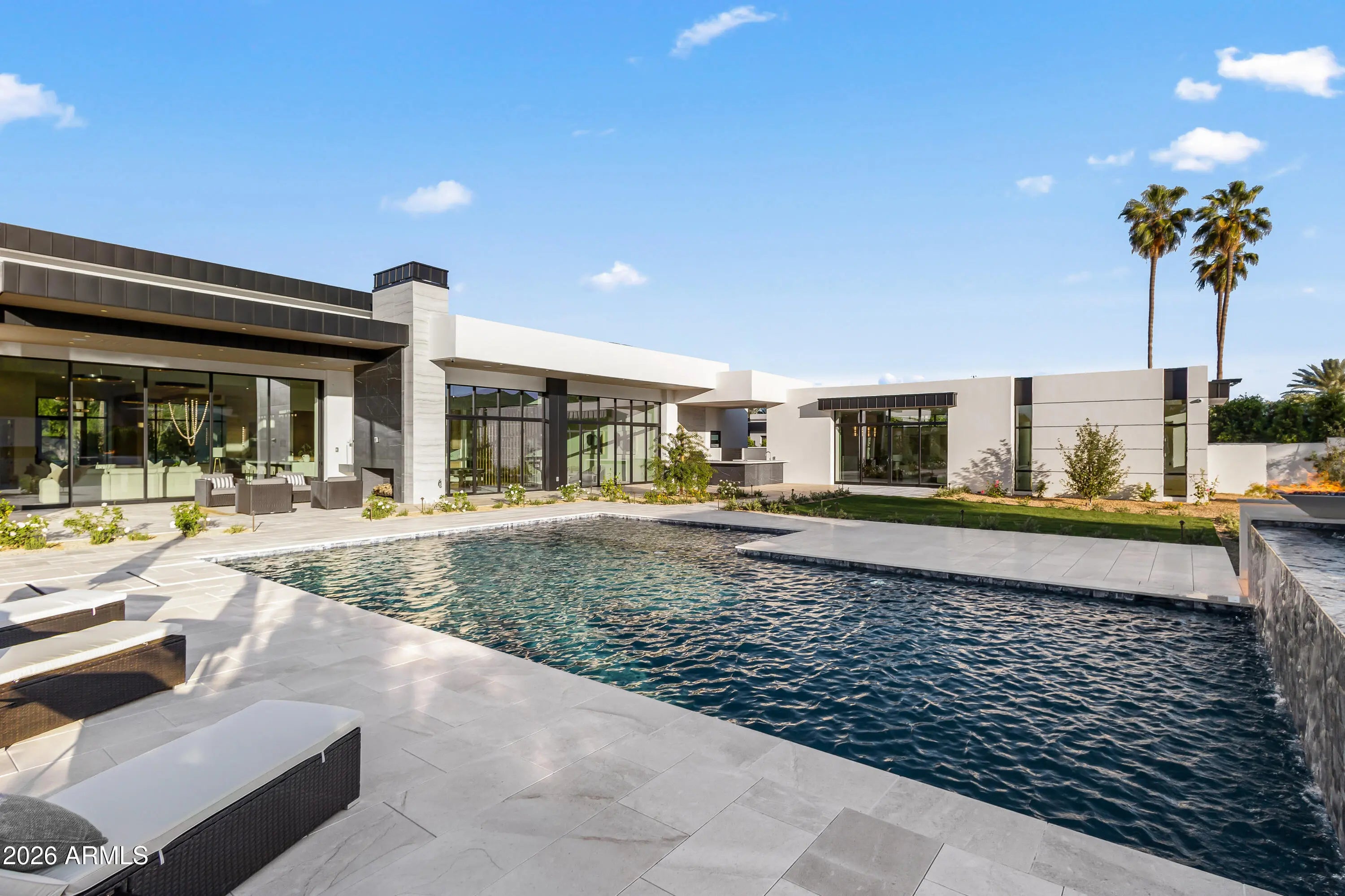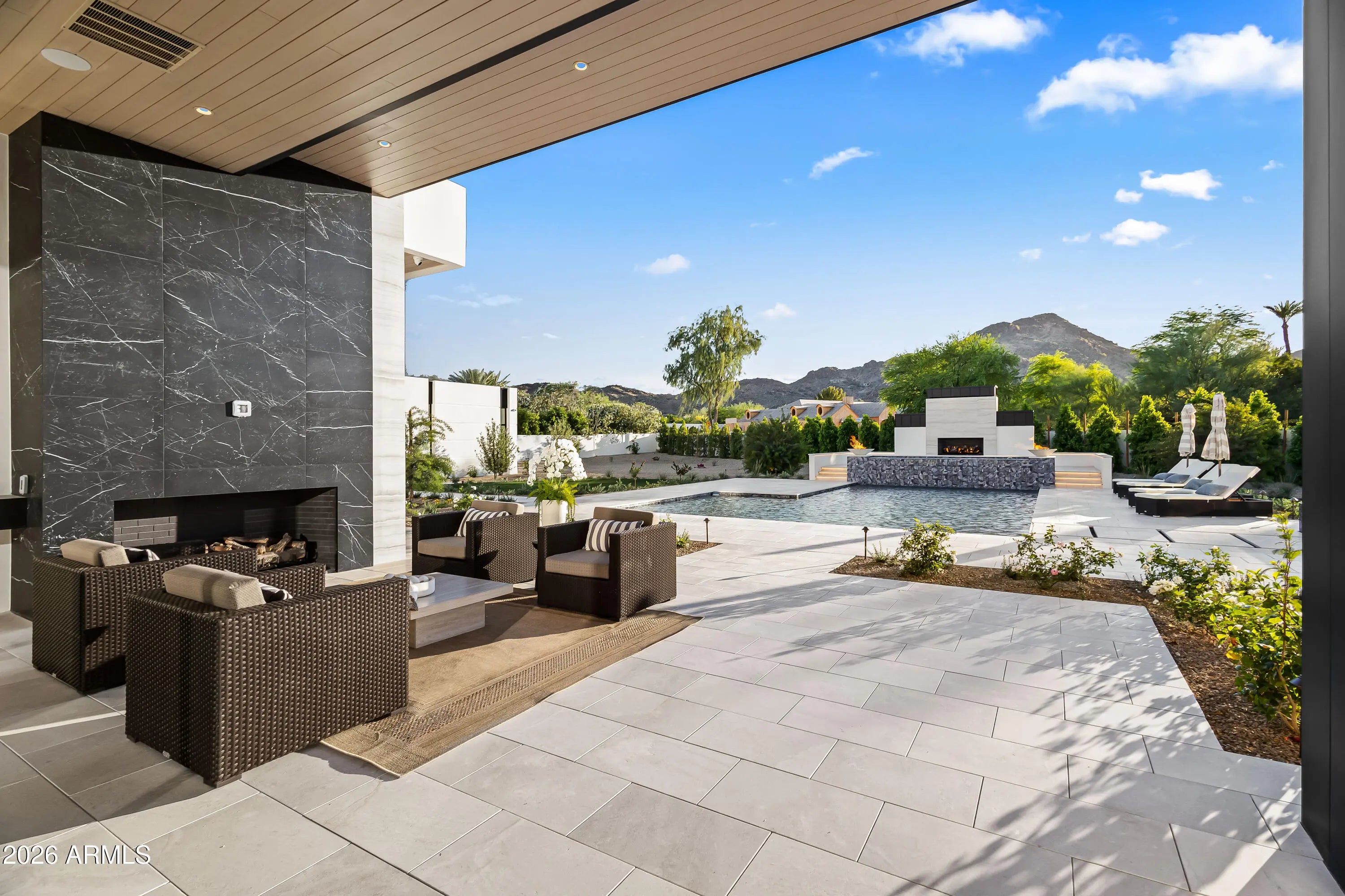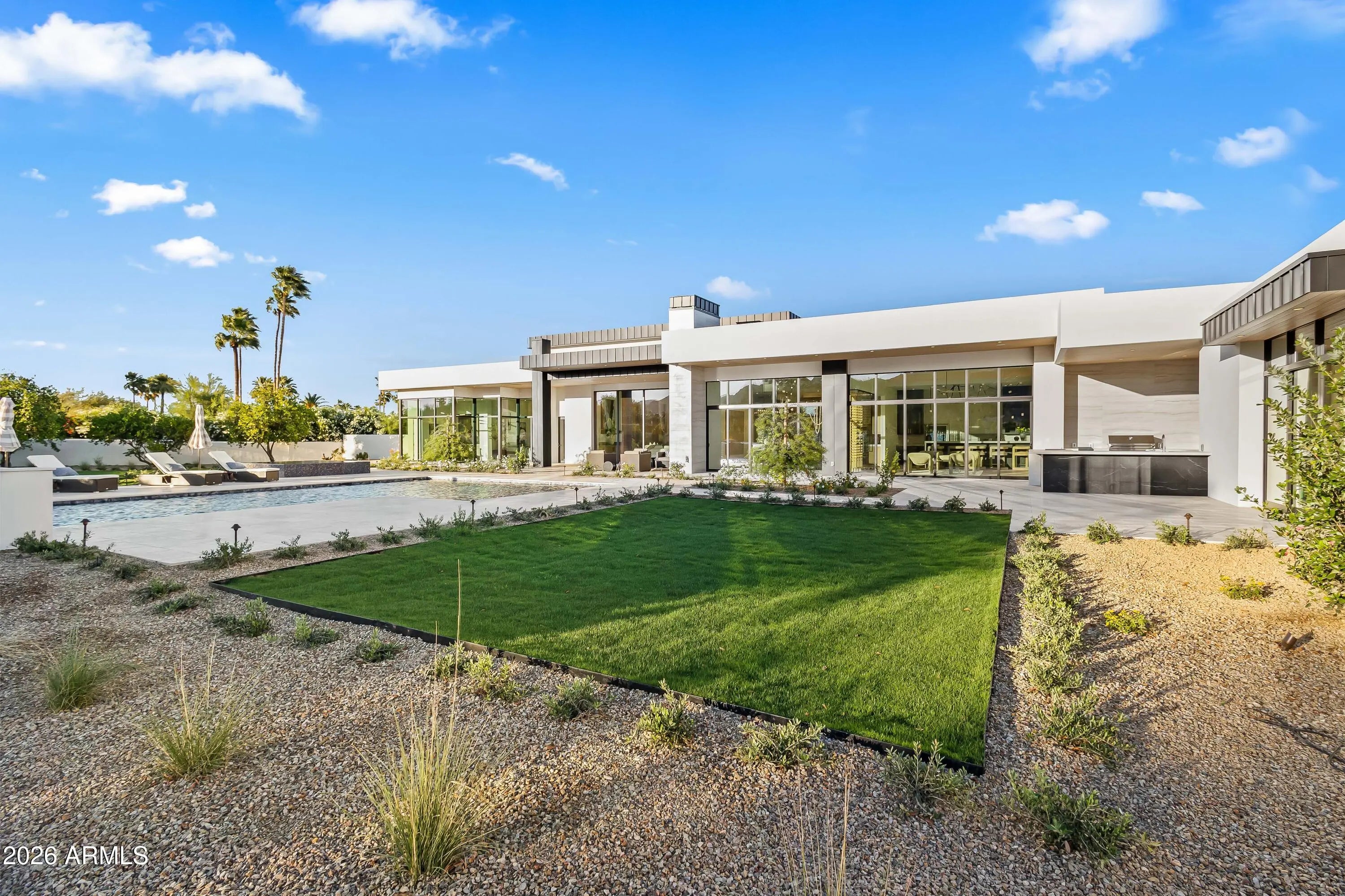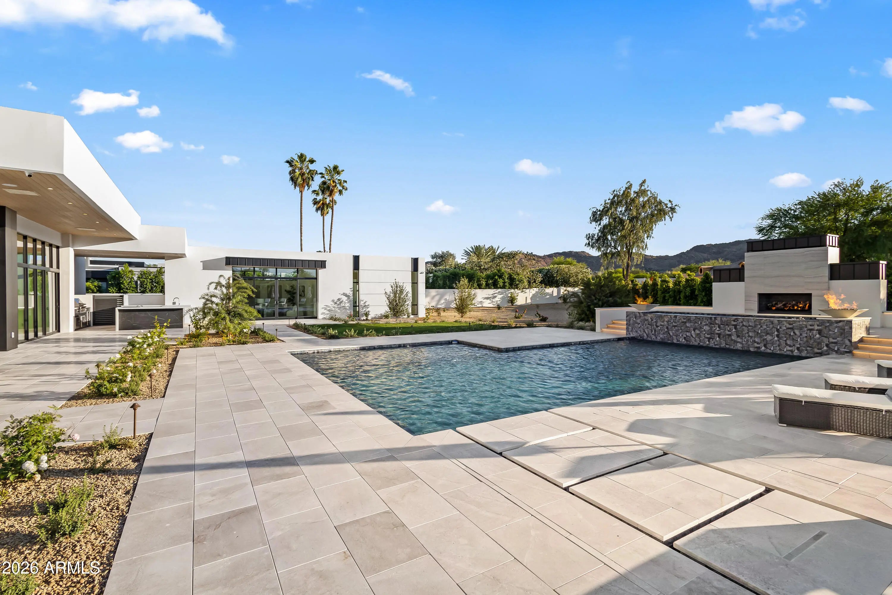 Newly completed architectural masterpiece showcasing breathtaking Mummy Mountain views in the heart of Paradise Valley. Situated on an expansive 1+ acre lot within the prestigious Camelback Country Club Estates, this exceptional single-level estate offers refined desert luxury and seamless indoor-outdoor living. The main residence features 4 spacious bedrooms and 6 spa-inspired bathrooms, complemented by a private 1 bed/1 bath guest casita complete with its own kitchen and living area--ideal for guests or multigenerational living. Designed for both grand entertaining and everyday comfort, the open-concept floor plan includes a stunning great room, formal dining area, and elegant living room anchored by a dramatic marble fireplace. The chef's kitchen is a true centerpiece, featuring dual oversized islands, a breakfast nook, and a fully equipped butler's pantry. The luxurious primary suite offers a private sitting area, direct access to a serene courtyard, an adjoining fitness room, and a spa-like bath with an expansive walk-in closet complete with in-suite laundry. Resort-style outdoor living includes a custom heated pool and spa, outdoor fireplace, fully equipped kitchen with island, and multiple lounge and entertaining spaces surrounded by mountain views. Additional highlights include a private office with custom built-ins, a game room with a striking glass wine wall and full wet bar, and a 4-car garage. Ideally located just minutes from top-rated schools, world-class resorts, fine dining, upscale shopping, and entertainment.