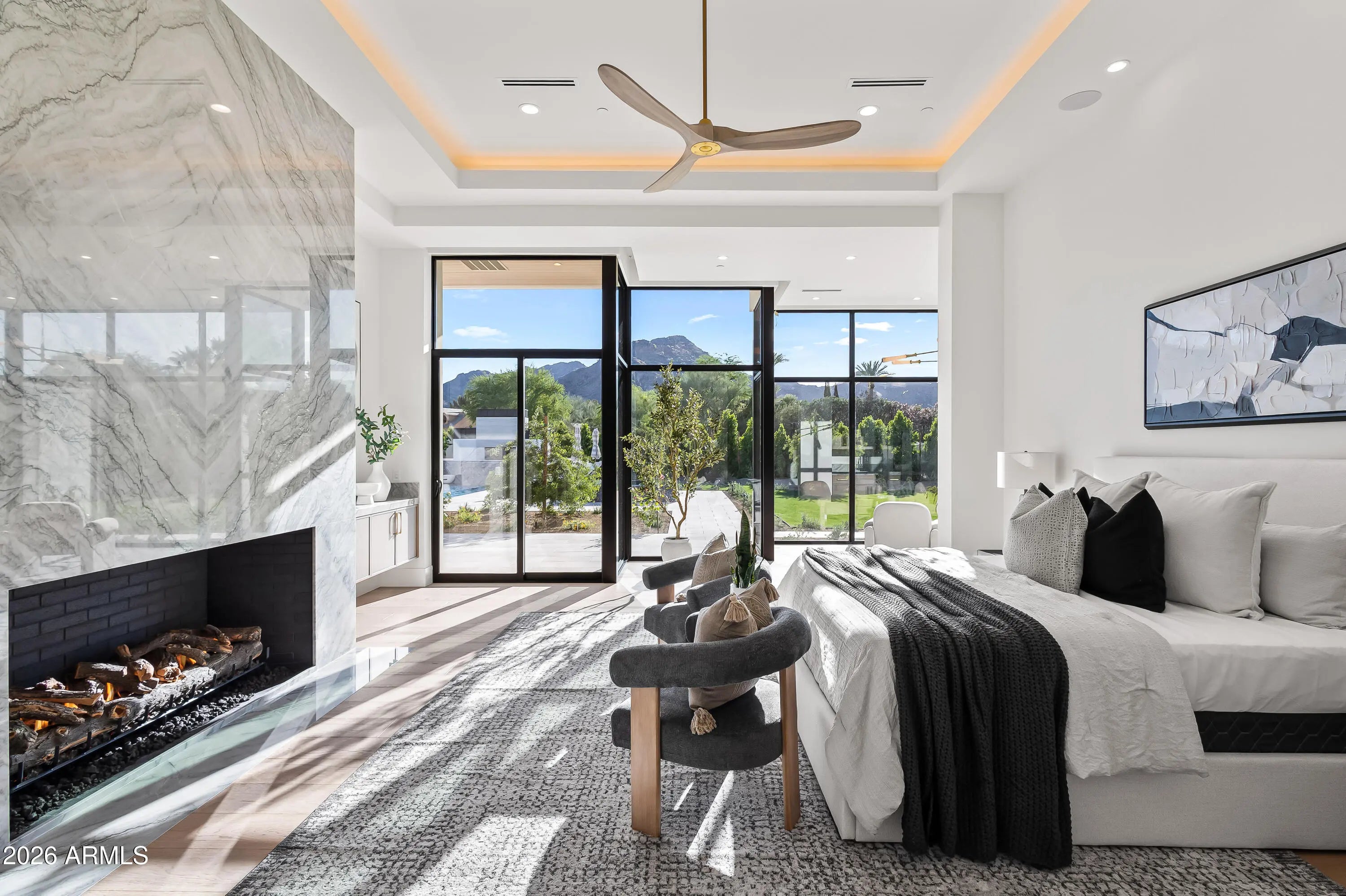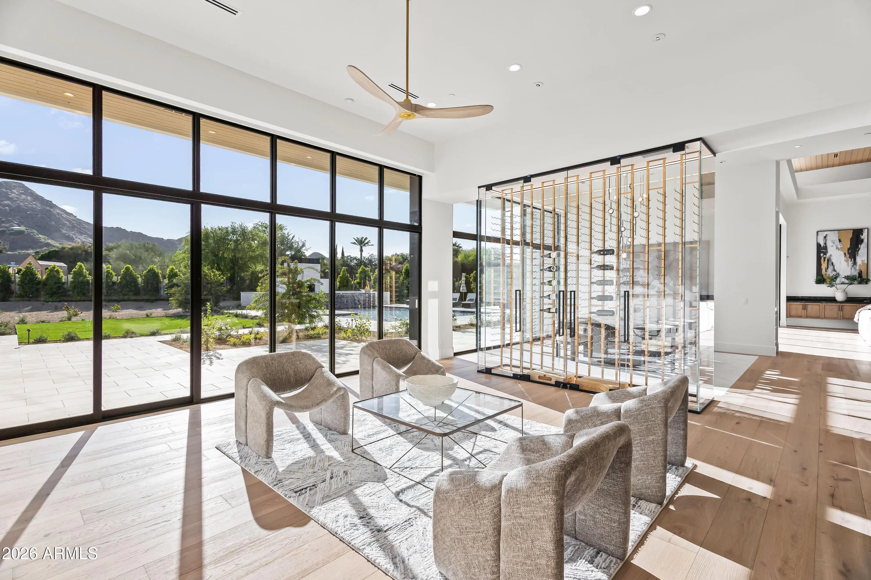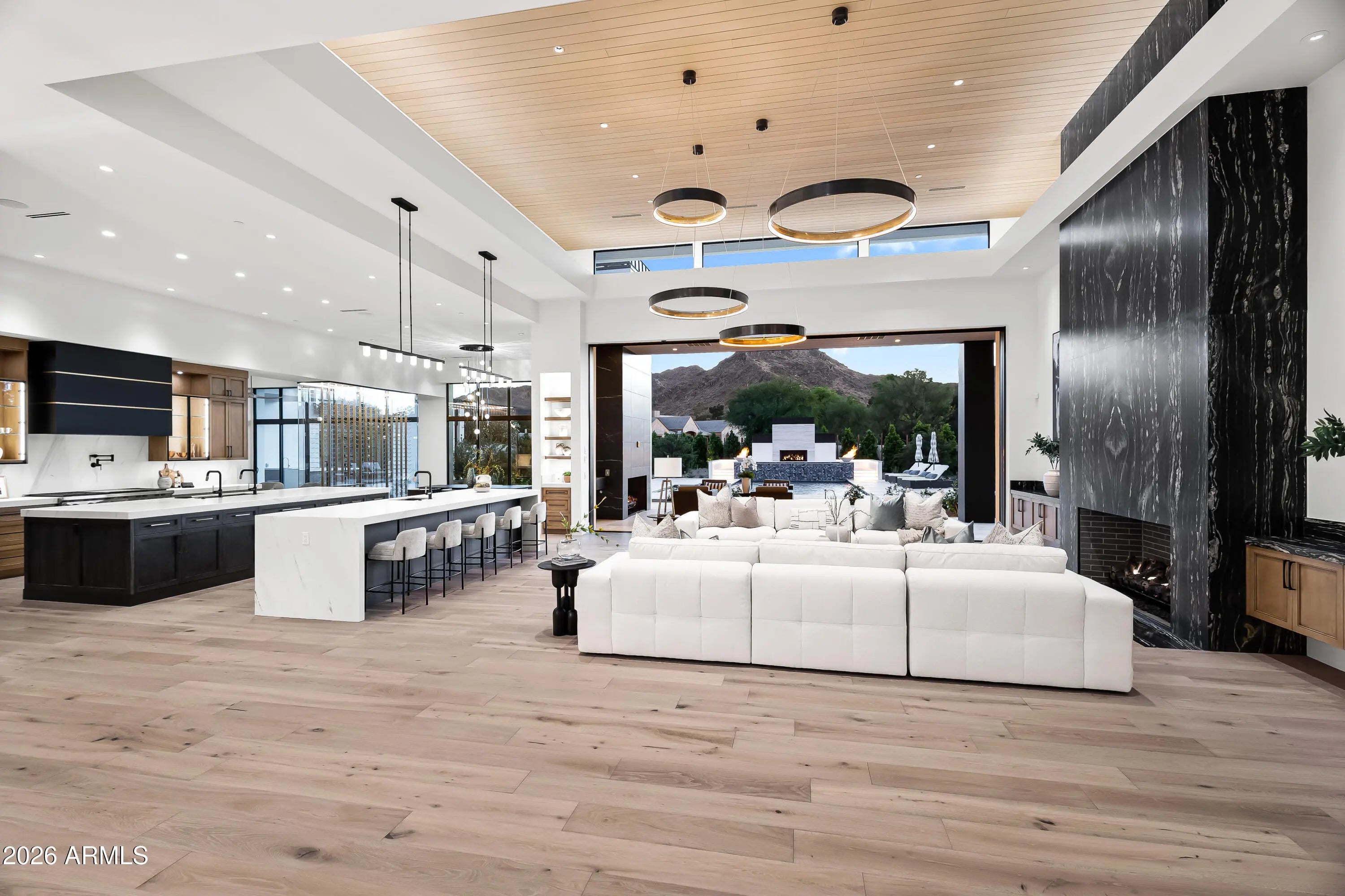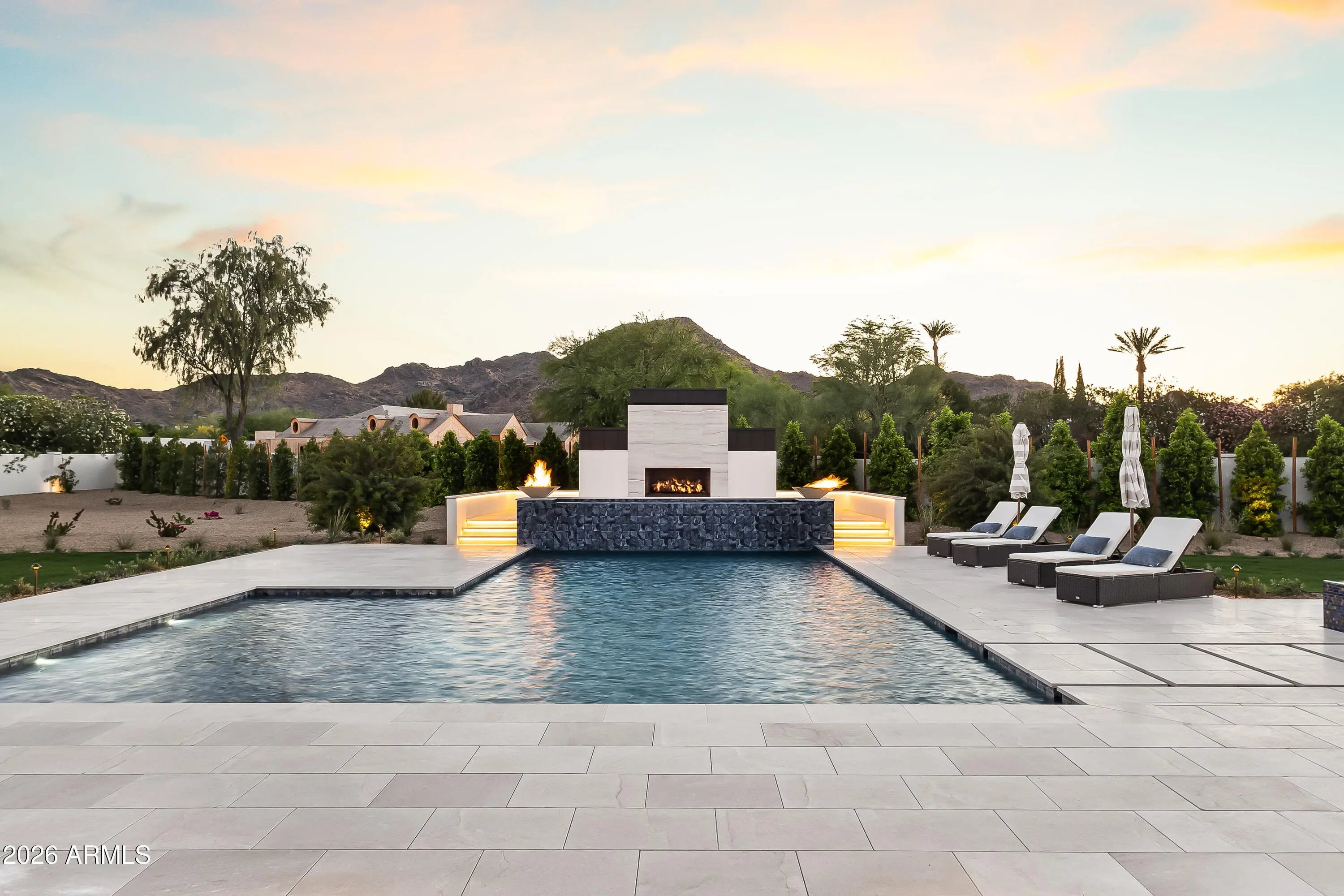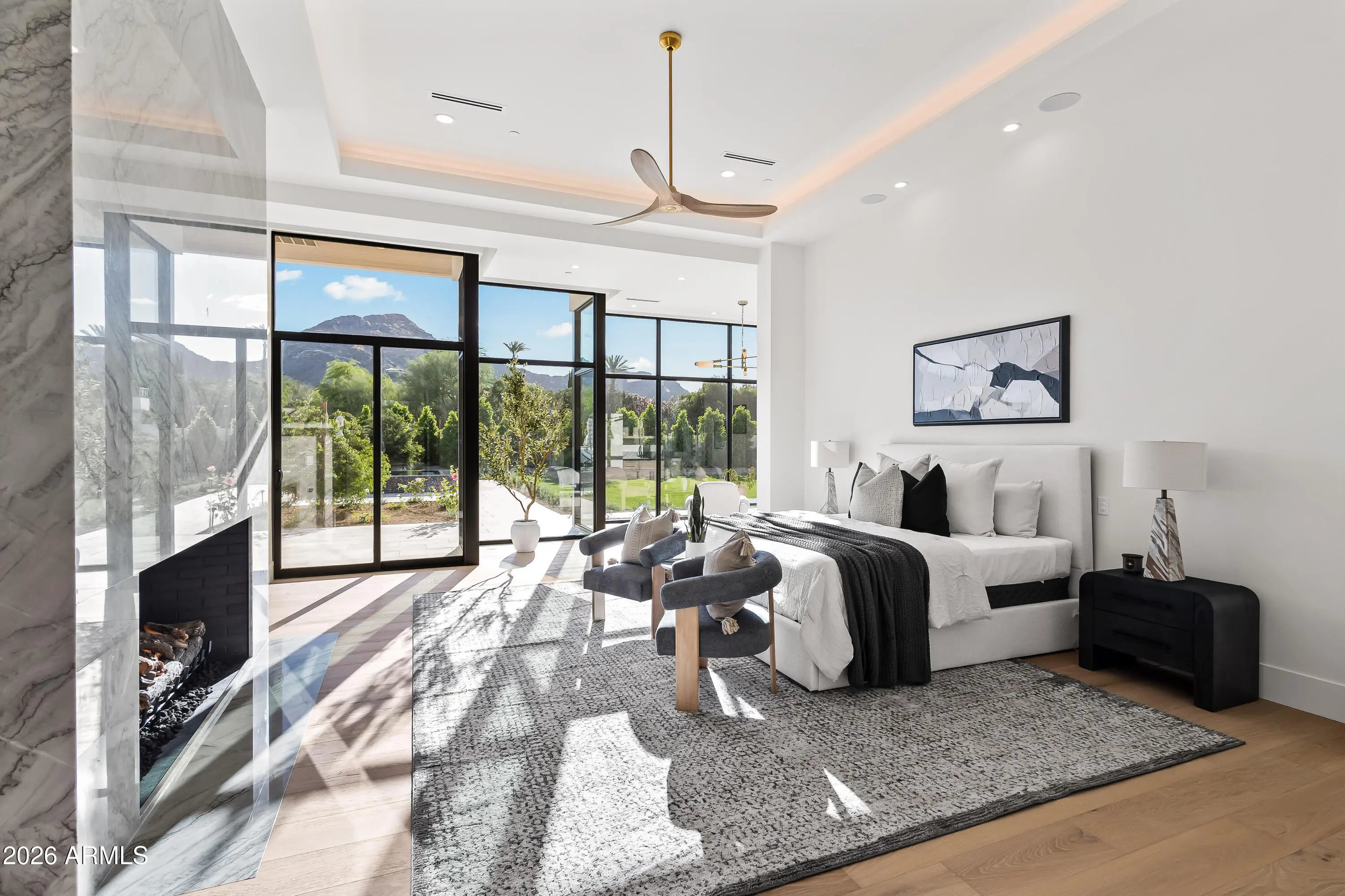Newly completed architectural masterpiece showcasing breathtaking Mummy Mountain views in the heart of Paradise Valley. Situated on an expansive 1+ acre lot within the prestigious Camelback Country Club Estates, this exceptional single-level estate offers refined desert luxury and seamless indoor-outdoor living. The main residence features 4 spacious bedrooms and 6 spa-inspired bathrooms, complemented by a private 1 bed/1 bath guest casita complete with its own kitchen and living area--ideal for guests or multigenerational living. Designed for both grand entertaining and everyday comfort, the open-concept floor plan includes a stunning great room, formal dining area, and elegant living room anchored by a dramatic marble fireplace. The chef's kitchen is a true centerpiece, featuring dual oversized islands, a breakfast nook, and a fully equipped butler's pantry. The luxurious primary suite offers a private sitting area, direct access to a serene courtyard, an adjoining fitness room, and a spa-like bath with an expansive walk-in closet complete with in-suite laundry. Resort-style outdoor living includes a custom heated pool and spa, outdoor fireplace, fully equipped kitchen with island, and multiple lounge and entertaining spaces surrounded by mountain views. Additional highlights include a private office with custom built-ins, a game room with a striking glass wine wall and full wet bar, and a 4-car garage. Ideally located just minutes from top-rated schools, world-class resorts, fine dining, upscale shopping, and entertainment.