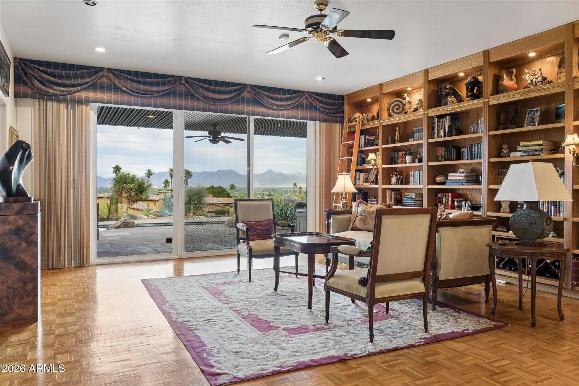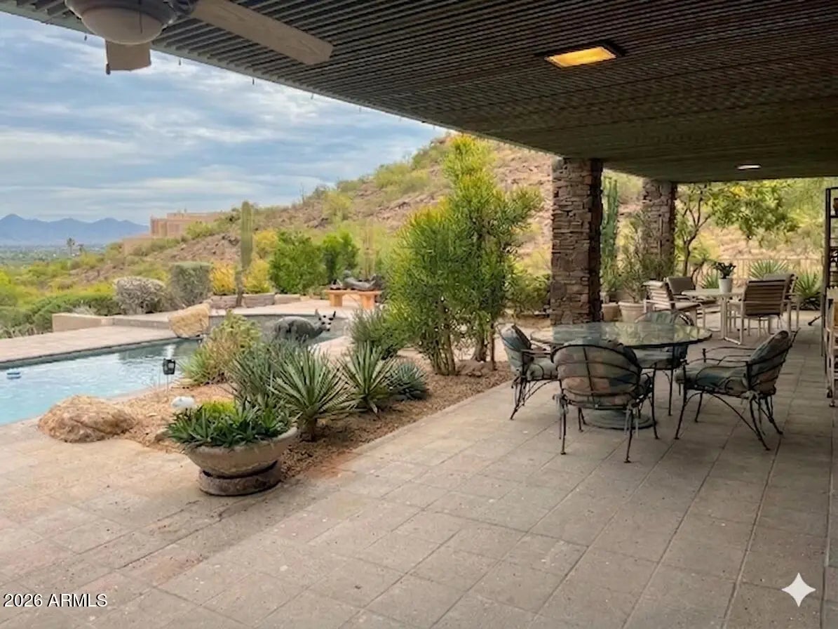 Set on 1.35 acres against the hillside, this privately sited residence offers unobstructed valley and mountain views. Walls of sliding glass connect the interiors to patios and pool, supporting indoor-outdoor living. A split floor plan includes 4 bedrooms and 3.5 baths, with formal dining, media room, and multiple living areas arranged for both function and scale. Custom cabinetry, parquet flooring, fireplaces, and architectural elements reflect quality construction and a well-executed layout.