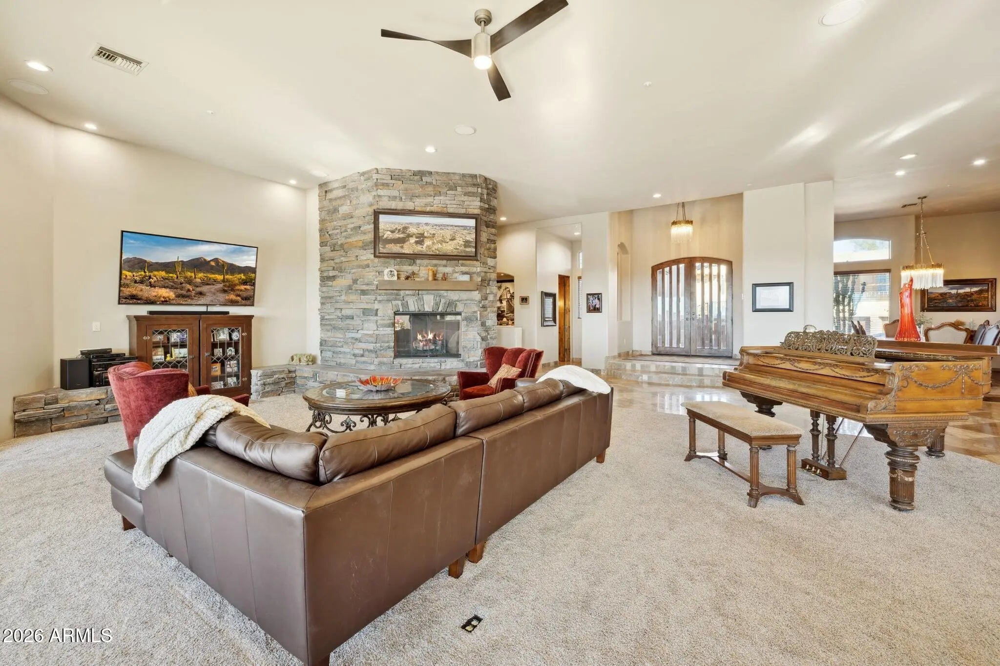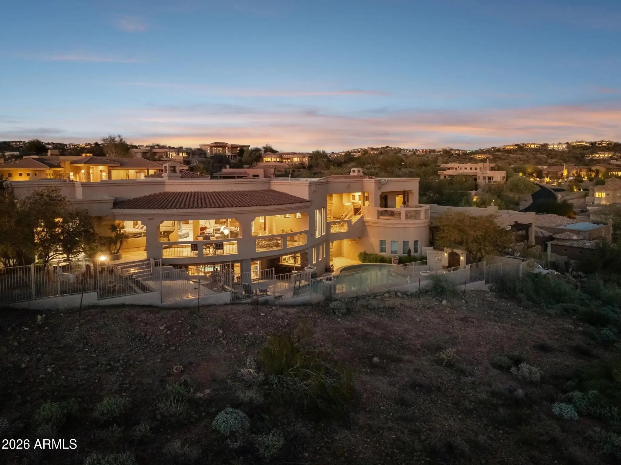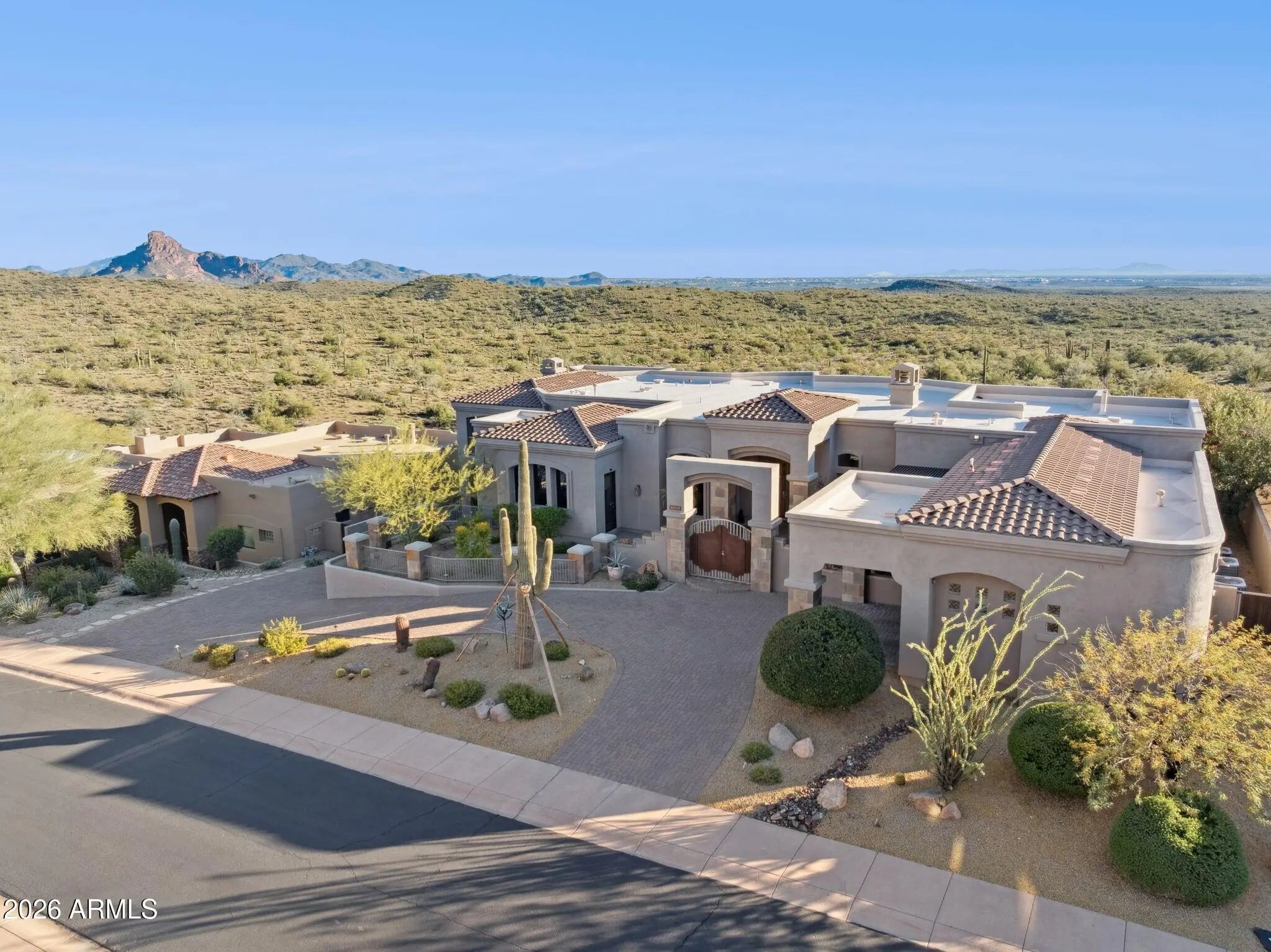 Set within the guard-gated Eagle Mountain, this property offers a rare combination of flexibility, privacy, and lifestyle-driven design, all framed by sweeping views from Red Mountain to Camelback and the soft glow of city lights that emerge each evening. At the heart of the home is a Great Room layout that lives as comfortably as a single level home, creating ease and simplicity for everyday living. The detached casita is a standout feature, offering its own private entrance, kitchenette, fireplace, and patio. It provides a fully self-contained living environment that is ideal for long-term guests, multigenerational living, or a dedicated work /creative space. It feels intentional, comfortable, and entirely its own, while still being seamlessly connected to the main residence. Thoughtfully designed transitions between indoor and outdoor living further enhance the sense of space and livability throughout. Equally compelling is the property's exceptional garage capacity. Designed to accommodate a substantial vehicle collection, including a fully equipped RV garage with electrical service and a sewer dump, this home caters to those who value capability as much as comfort. Whether housing a collection, supporting travel, or simply allowing room to grow, the possibilities here are both rare and meaningful. Additional garage spaces provide flexibility for storage, hobbies, or workshop use, complementing the home's overall versatility. The lower level expands the living experience even further, offering a full bar, game room, theater, and a full kitchen, creating a fully self-sufficient lower-level living environment, along with an additional bedroom and bath. It creates a natural hub for gathering, entertaining, or extended stays, giving the home a dynamic versatility that evolves with your lifestyle. This level lives comfortably as its own retreat, ideal for hosting while maintaining privacy and separation from the main living areas. The design adapts effortlessly to a variety of needs, whether enjoying a quiet morning, hosting an intimate dinner, or welcoming a full house of guests. Surrounded by desert beauty and designed with intention, this is a home that offers not just space, but freedom. Natural light fills the interior, and the connection to the outdoors is ever present, creating an atmosphere that feels both grounded and elevated. It is a place where your lifestyle can expand, evolve, and truly feel at home.