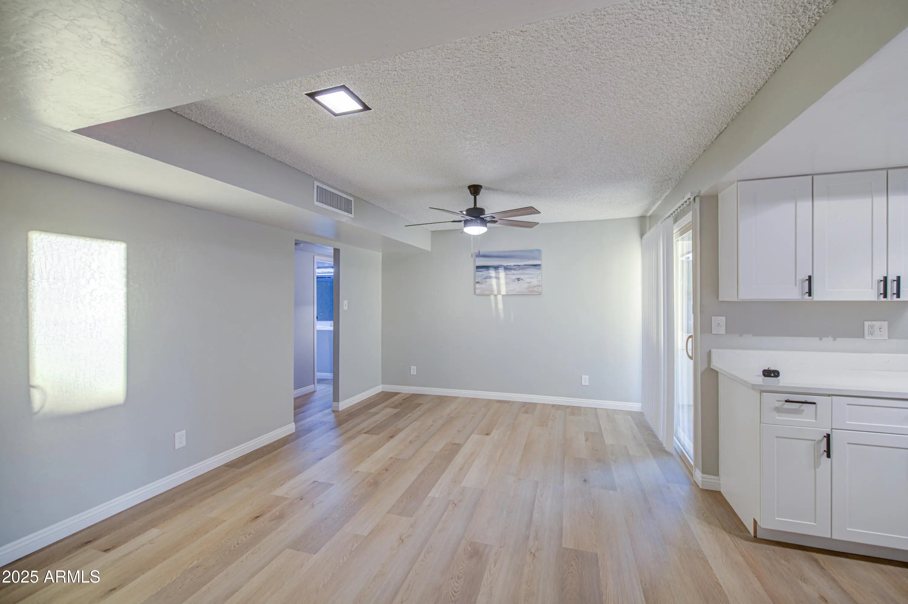 Large 5 bed / 2 bath completely remodeled home! Enter through a serene front courtyard with a waterfall pond. Inside, enjoy new luxury vinyl plank flooring, plush carpet in bedrooms, updated fixtures, hardware, and fresh kitchen cabinets and bathroom vanities. The split floorplan offers privacy with the primary suite and an additional bedroom on one side, and three bedrooms on the other. Spacious kitchen with ample counters overlooks a large living room, plus separate dining and family rooms. Master has walk-in closet and private backyard access. Enjoy a large covered patio with two sliding doors, inside laundry, a 2-car garage with extra storage, and a newly renovated roof too! A must-see on a generous lot in a great location!