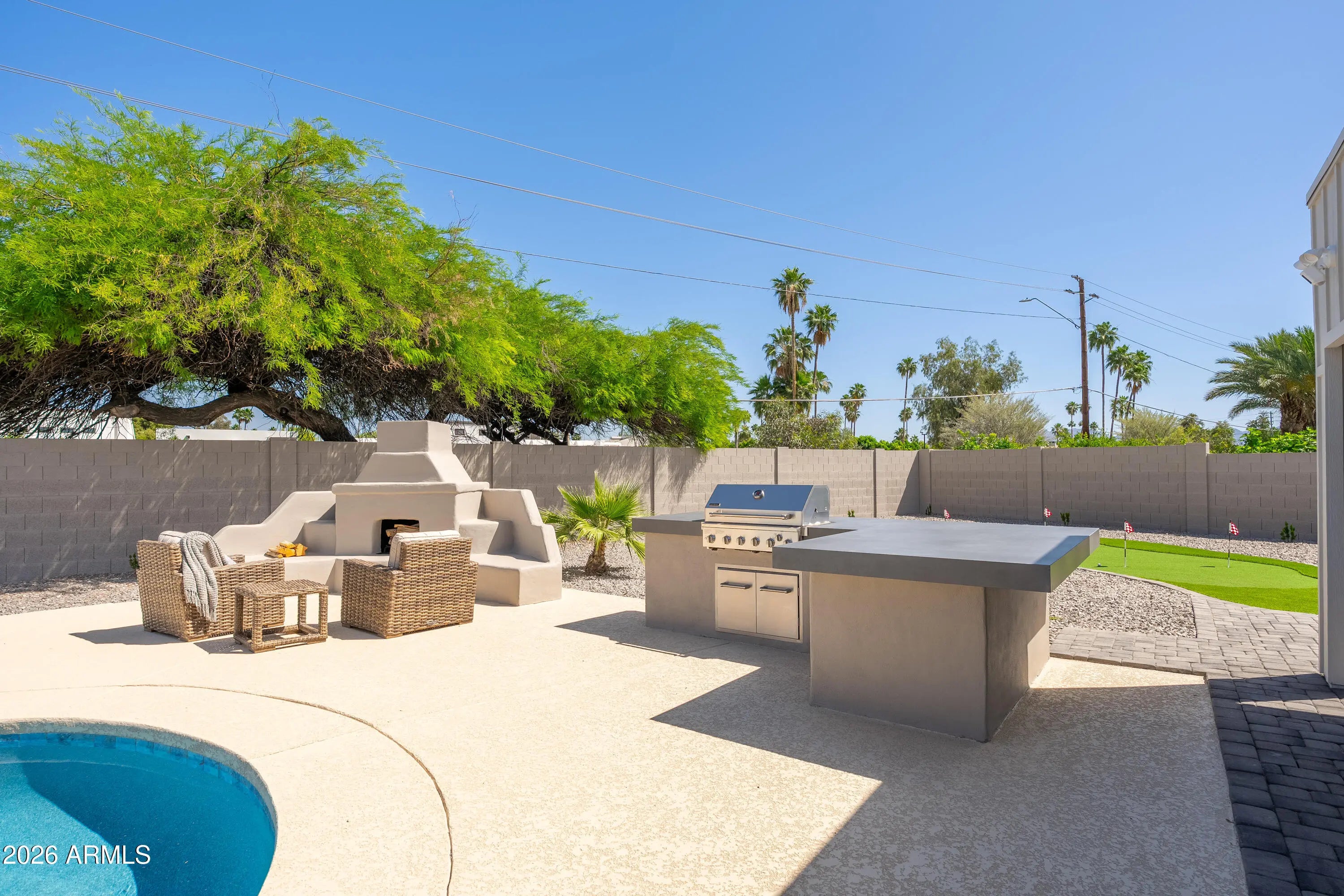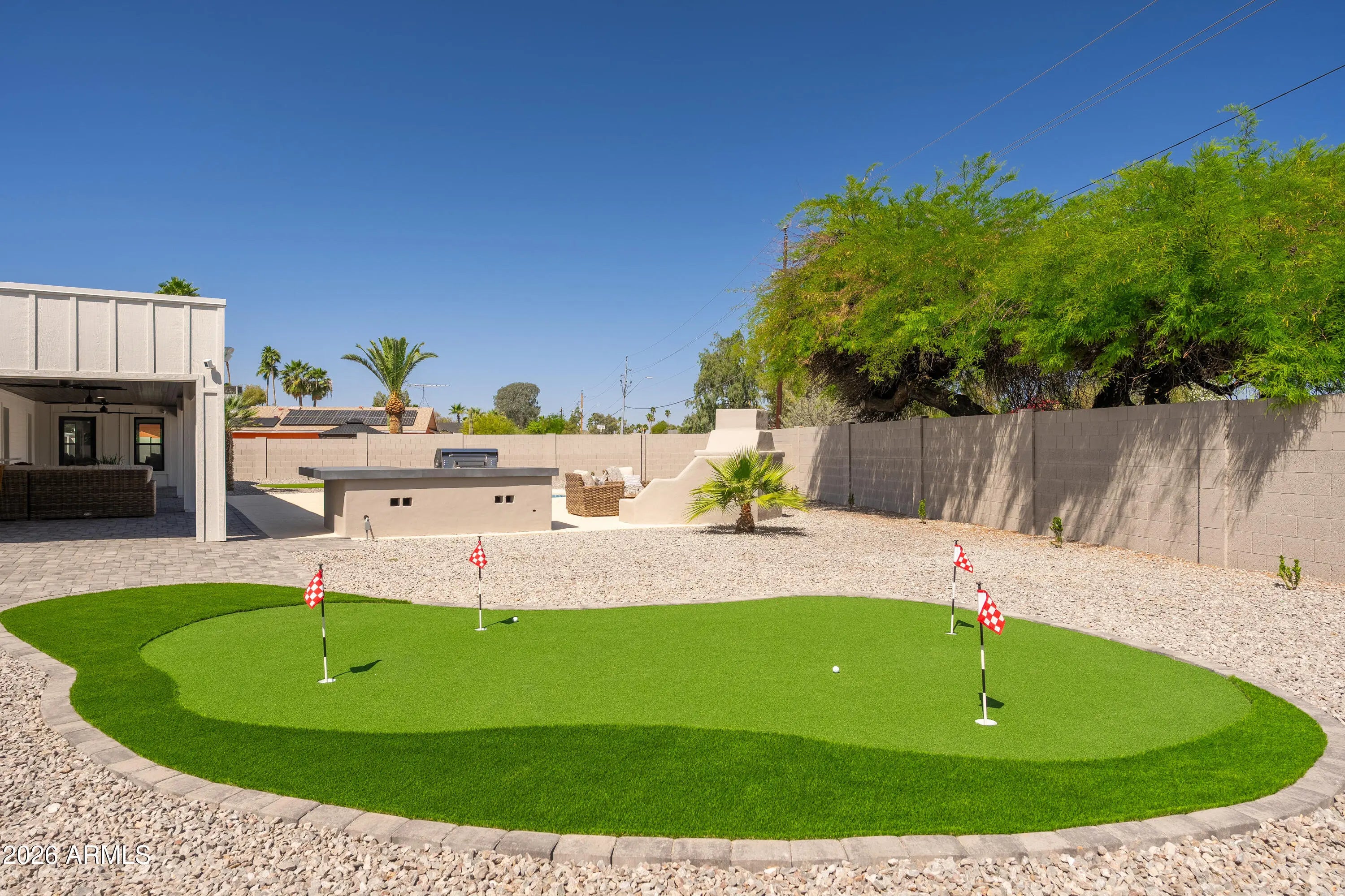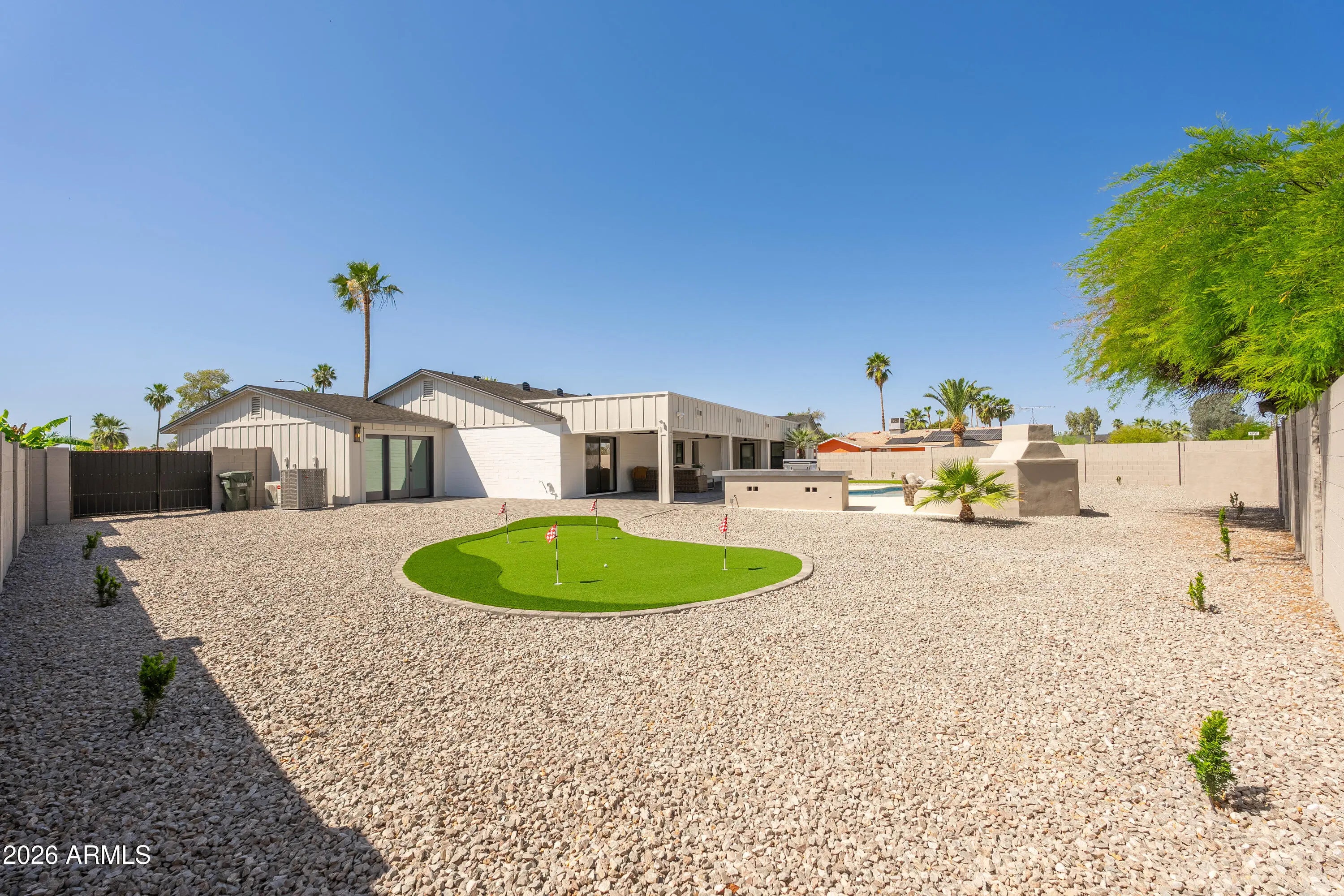 Another immaculate renovation and remodel by Mariano & Co in the sought after 85254 zip code. After adding 1,200 sqft, as well as a 3rd car garage, total livable size is now at 3,052 sqft. Property was taken down to the studs with no stone left unturned including NEW electrical wiring, plumbing, windows, insulation, HVAC, roof, front & back landscaping, and of course all the interior finishes. This open floorplan boasts 4 bedrooms and 4 bathrooms on a cul-de-sac lot with a north/south exposure. The chef's kitchen features WOLF appliances, Cambria countertops, waterfall island, pass-through window (excellent for outdoor entertaining), butler's pantry, and floor-to-ceiling wine closet. The primary suite includes a massive walk-in closet (with own washer & dryer), private backyard access, and an en-suite bathroom with dual vanities, soaking tub, and a huge shower with double shower zones. The garages offer epoxy flooring, with the 3rd car bay completely insulated with its own mini-split HVAC system ... ideal for the car enthusiast, a fitness room, or an extra indoor/outdoor recreation room with its direct yard access through glass French doors. The backyard showcases an oversized covered patio, pavers, refinished pool interior & decking, built-in BBQ, and a putting green to create the perfect Arizona oasis. Every detail of this home shines, highlighting its incredible features throughout--don't miss this Scottsdale gem!