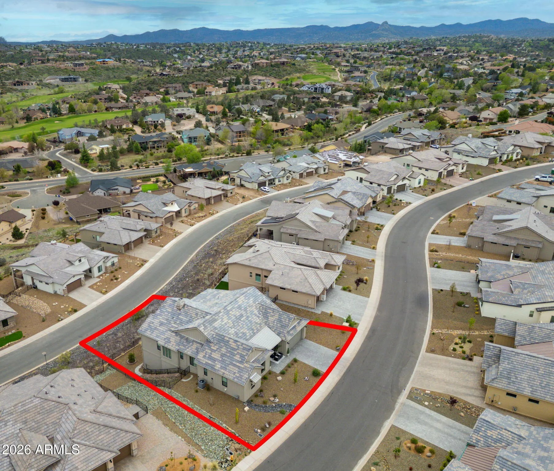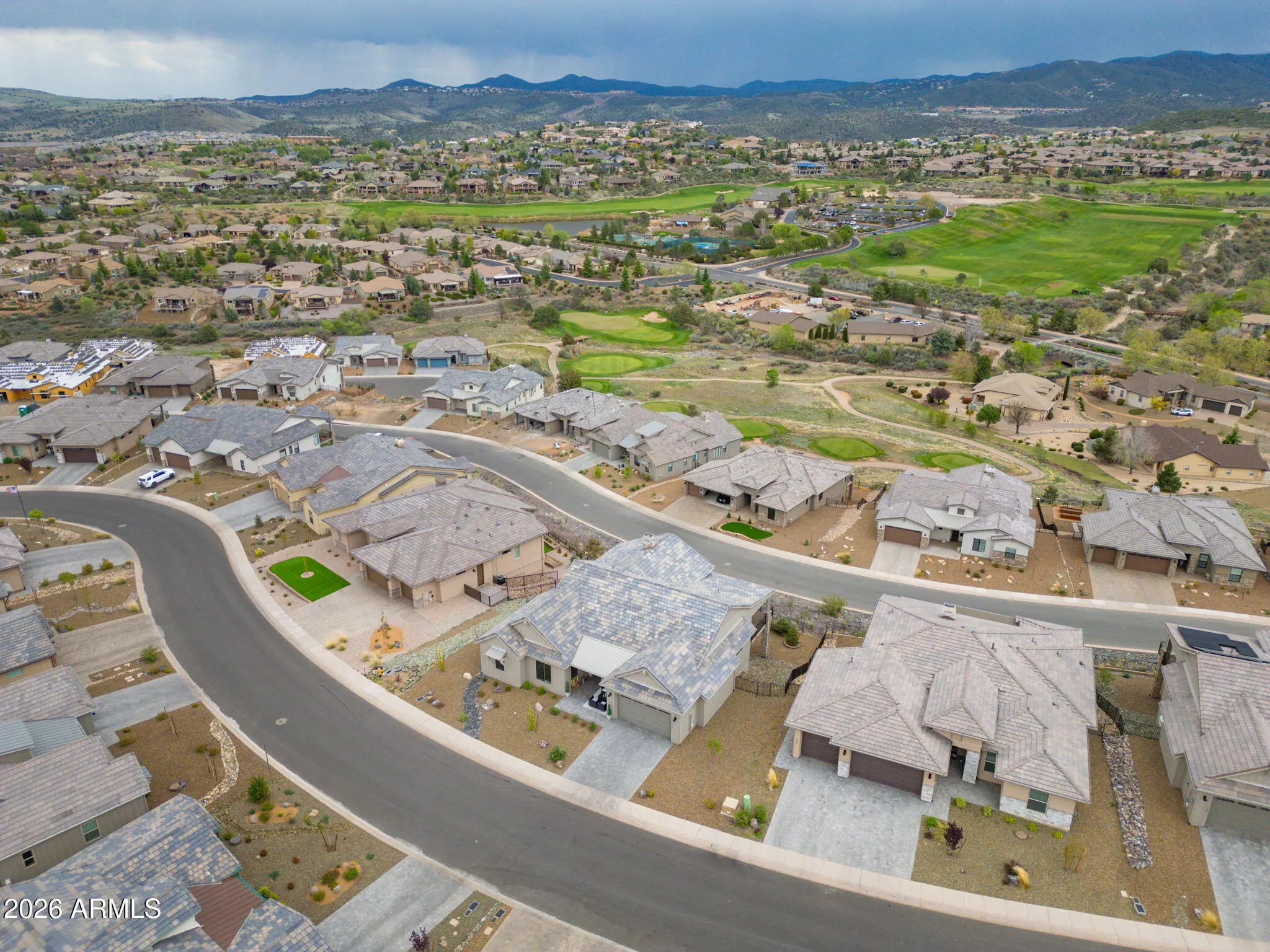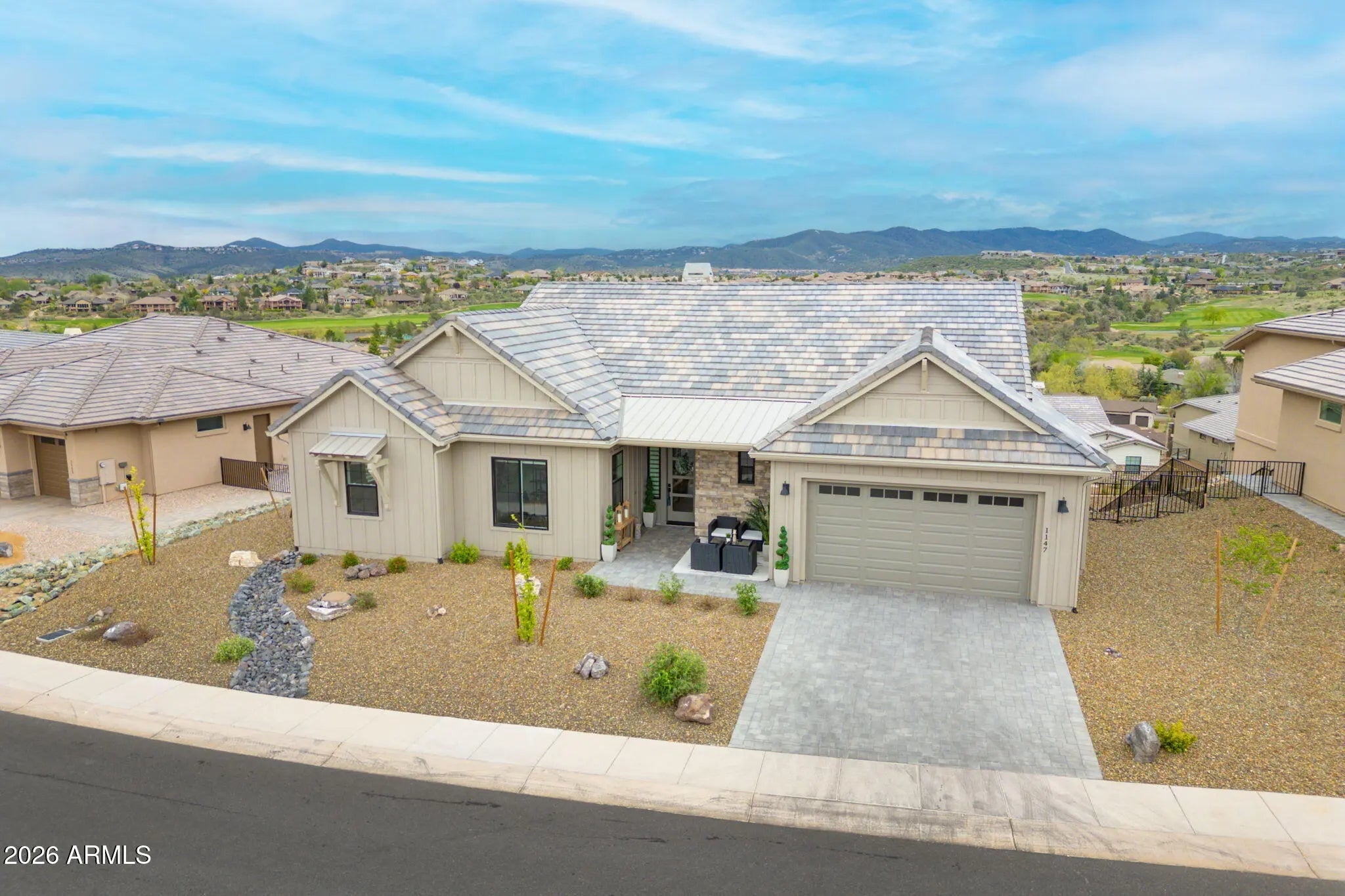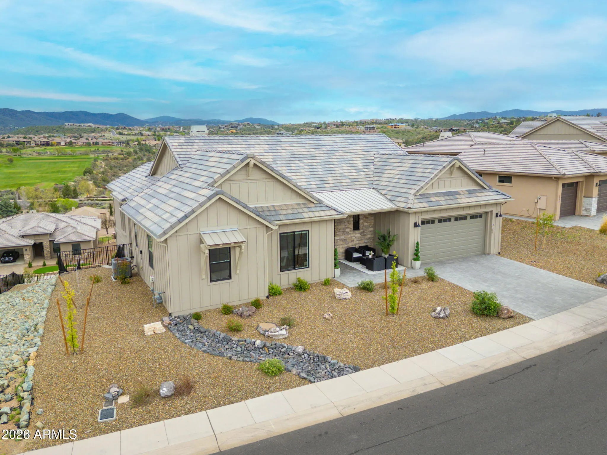 Welcome to a truly spectacular home nestled within the exclusive, gated community of Solstice Ridge II at Prescott Lakes. This luxurious, like-new single-level residence epitomizes high-desert living, offering breathtaking, panoramic views of the manicured golf course and surrounding mountains. Spanning 2,525 square feet, this meticulously designed home provides both elegance and comfort. The open-concept design seamlessly connects the great room to the gourmet kitchen, making it ideal for both daily life and hosting guests. The great room features a cozy gas fireplace and flows directly onto a large deck--perfect for al fresco dining and taking in the impressive views. The chef's gourmet kitchen is a true centerpiece, boasting an enormous central island, an abundance of additional custom cabinetry, and top-of-the-line Bosch stainless steel appliances. The home layout includes three bedrooms and three bathrooms, along with a dedicated office space that offers the flexibility to serve as a potential fourth bedroom. The generously sized primary suite is a private retreat, featuring a spacious walk-in closet and a luxurious dual-vanity sink arrangement in the primary bath. Convenience is enhanced by a large laundry room equipped with a utility sink. Architecturally designed to maximize natural light and views, the home features windows galore throughout. The exterior is equally well-appointed, with a tastefully landscaped front and backyard, the latter being fully fenced. A three-car garage provides ample storage and parking. Beyond the features of the home itself, the location is unbeatable. It is centrally situated near downtown Prescott, offering easy access to the area's best shopping, dining, and entertainment. Residents of Prescott Lakes enjoy a secure, amenity-rich, low-maintenance lifestyle, with access to unparalleled community features, including: Indoor and outdoor swimming pools A state-of-the-art fitness center A private restaurant and bar Tennis and pickleball courts A private, members-only golf course