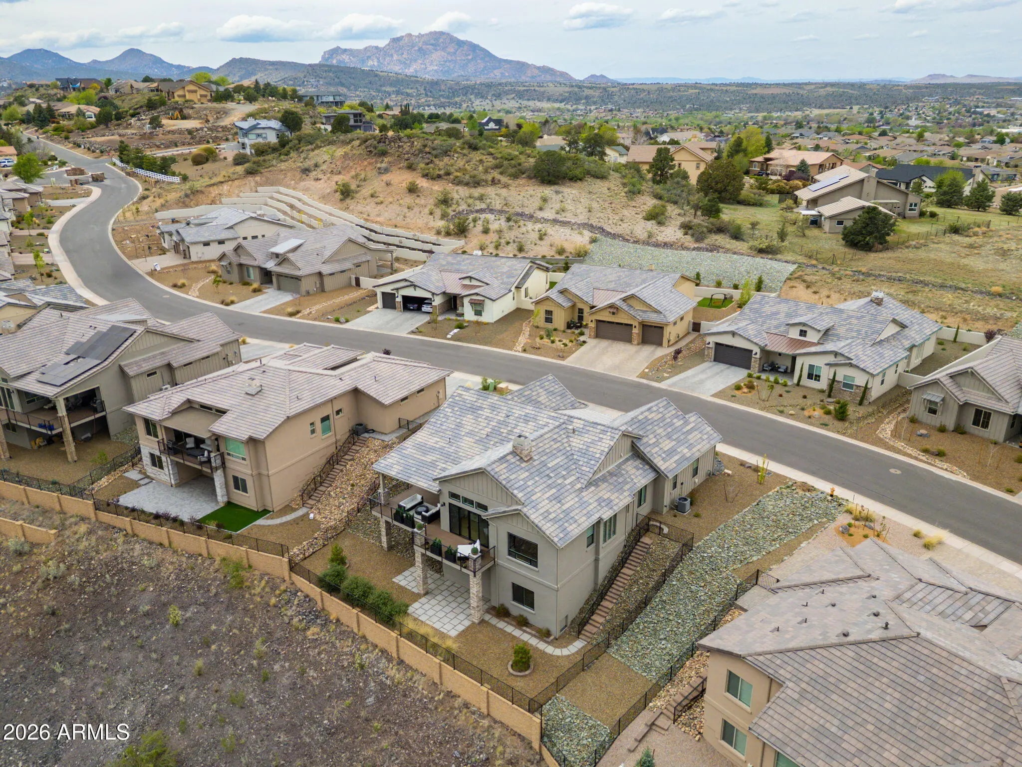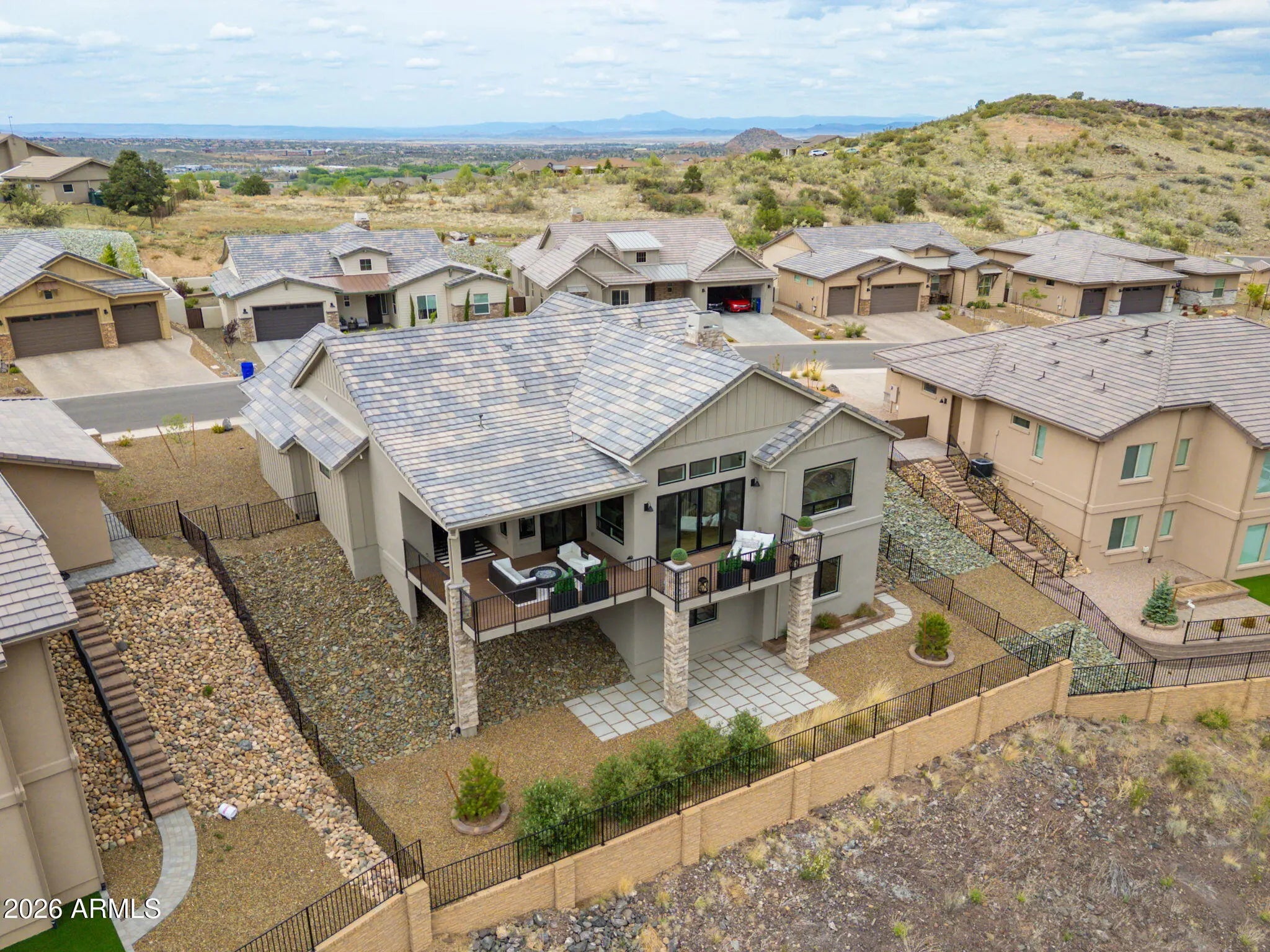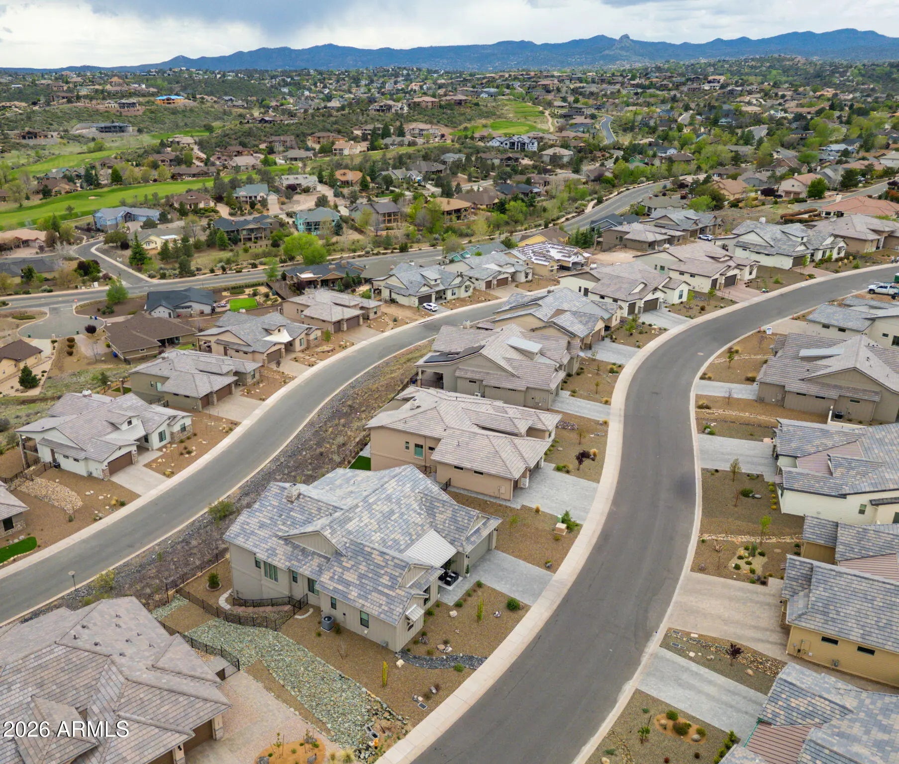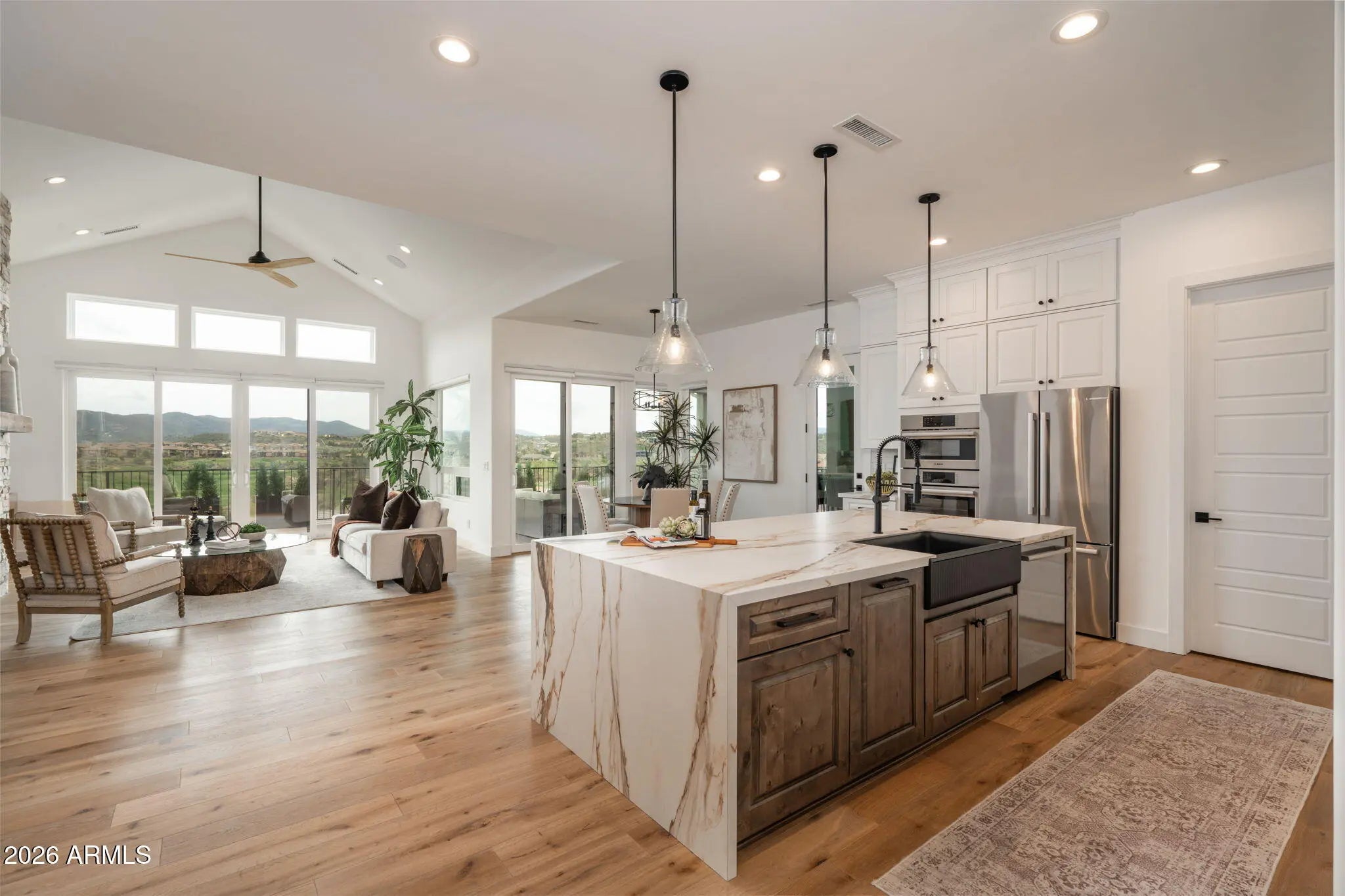 Welcome to a truly spectacular home nestled within the exclusive, gated community of Solstice Ridge II at Prescott Lakes. This luxurious, like-new single-level residence epitomizes high-desert living, offering breathtaking, panoramic views of the manicured golf course and surrounding mountains. Spanning 2,525 square feet, this meticulously designed home provides both elegance and comfort. The open-concept design seamlessly connects the great room to the gourmet kitchen, making it ideal for both daily life and hosting guests. The great room features a cozy gas fireplace and flows directly onto a large deck--perfect for al fresco dining and taking in the impressive views. The chef's gourmet kitchen is a true centerpiece, boasting an enormous central island, an abundance of additional custom cabinetry, and top-of-the-line Bosch stainless steel appliances. The home layout includes three bedrooms and three bathrooms, along with a dedicated office space that offers the flexibility to serve as a potential fourth bedroom. The generously sized primary suite is a private retreat, featuring a spacious walk-in closet and a luxurious dual-vanity sink arrangement in the primary bath. Convenience is enhanced by a large laundry room equipped with a utility sink. Architecturally designed to maximize natural light and views, the home features windows galore throughout. The exterior is equally well-appointed, with a tastefully landscaped front and backyard, the latter being fully fenced. A three-car garage provides ample storage and parking. Beyond the features of the home itself, the location is unbeatable. It is centrally situated near downtown Prescott, offering easy access to the area's best shopping, dining, and entertainment. Residents of Prescott Lakes enjoy a secure, amenity-rich, low-maintenance lifestyle, with access to unparalleled community features, including: Indoor and outdoor swimming pools A state-of-the-art fitness center A private restaurant and bar Tennis and pickleball courts A private, members-only golf course