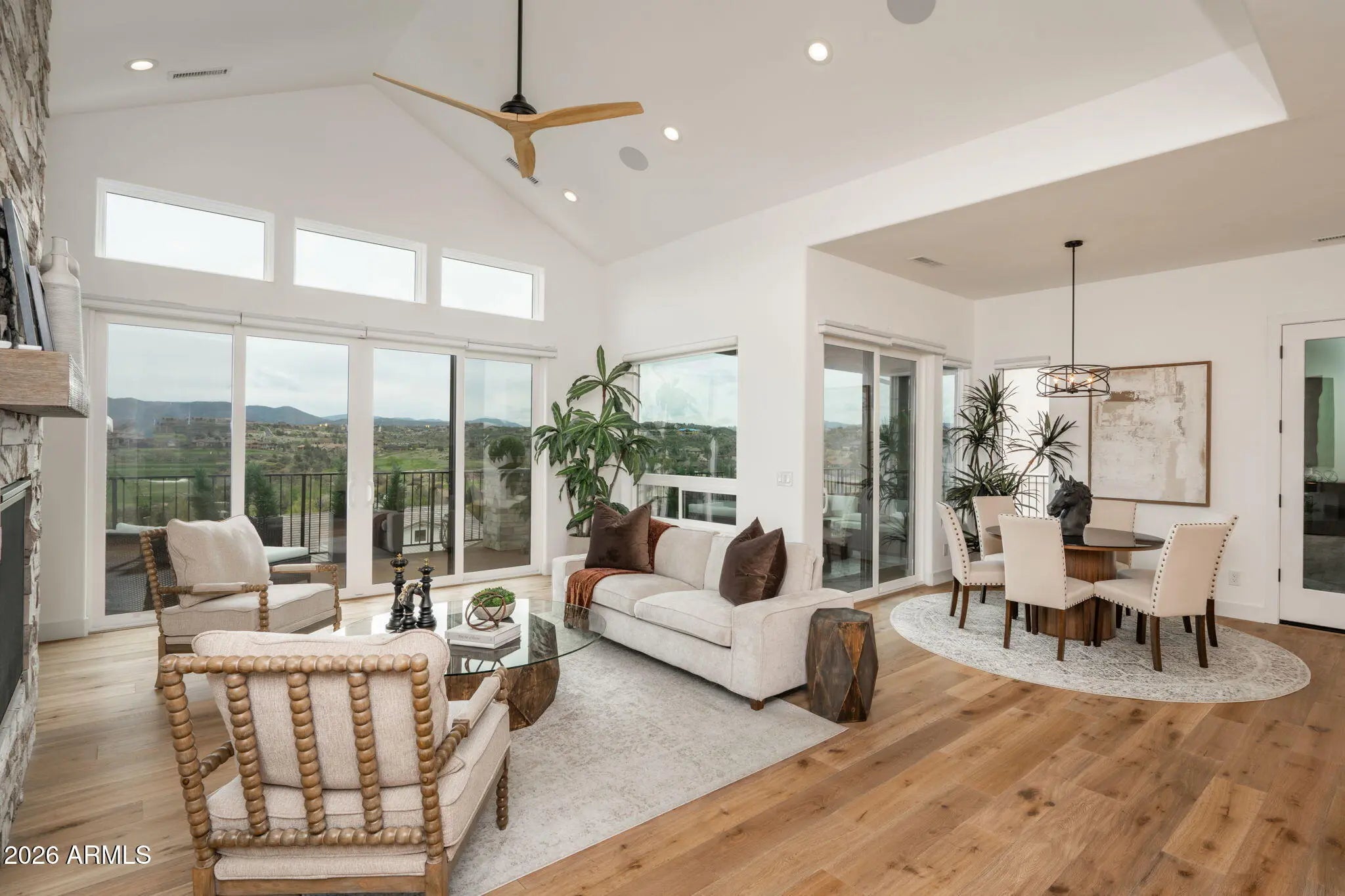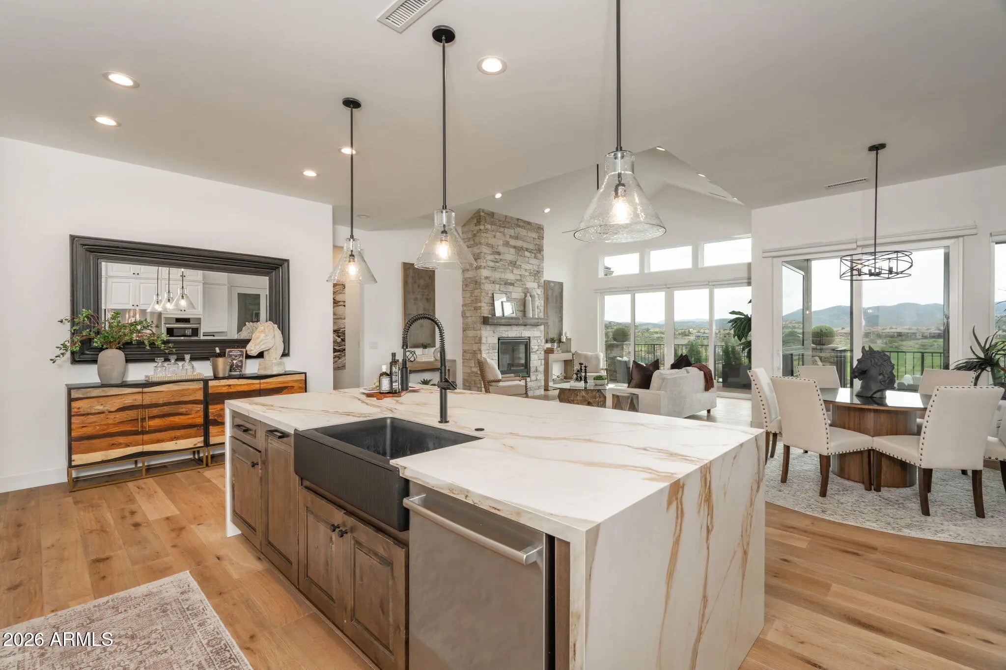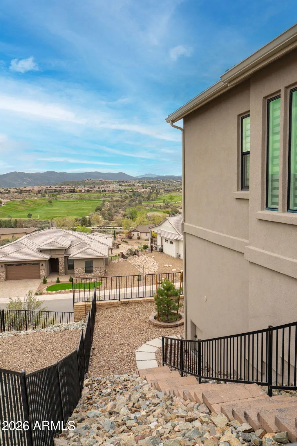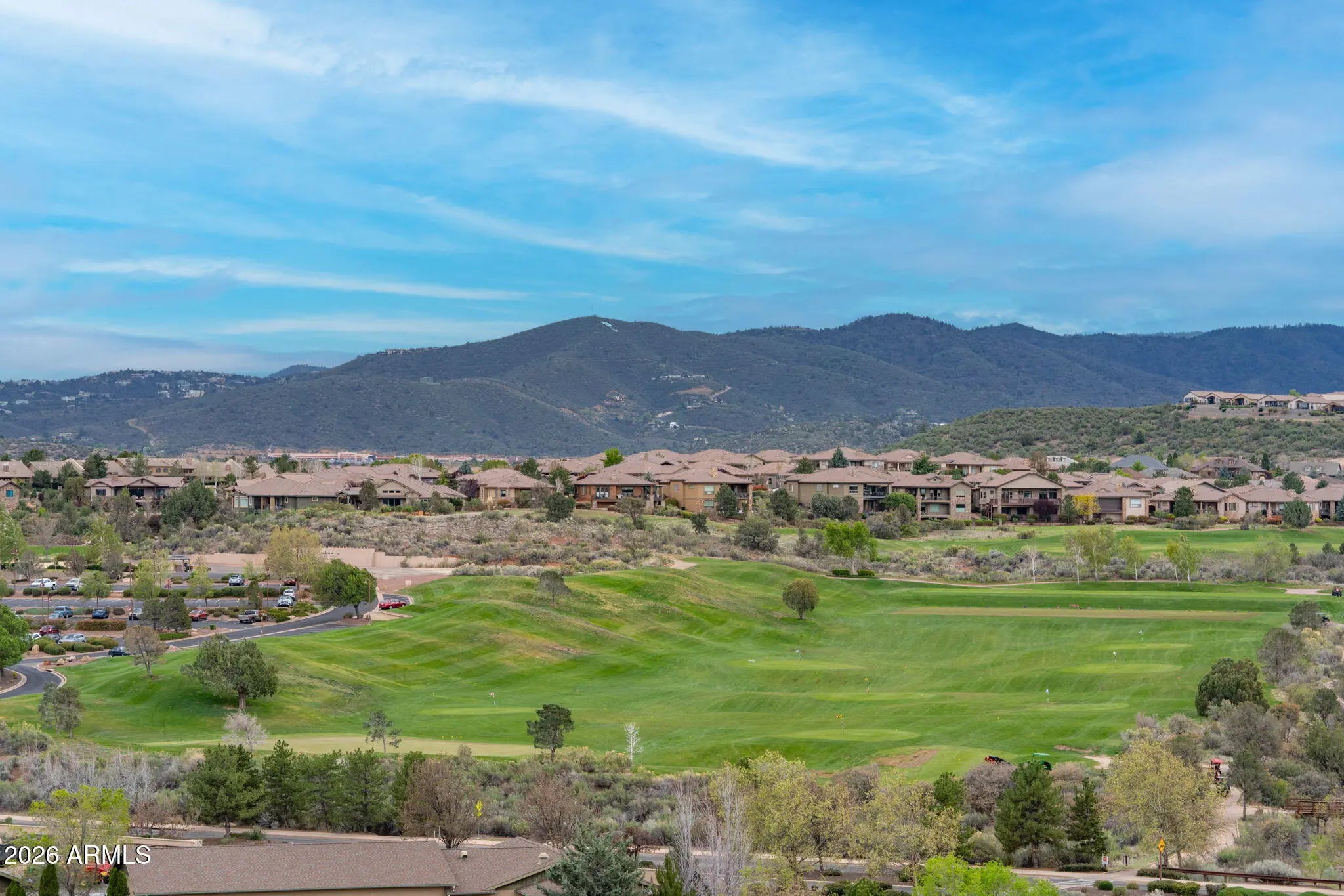 Welcome to a truly spectacular home nestled within the exclusive, gated community of Solstice Ridge II at Prescott Lakes. This luxurious, like-new single-level residence epitomizes high-desert living, offering breathtaking, panoramic views of the manicured golf course and surrounding mountains. Spanning 2,525 square feet, this meticulously designed home provides both elegance and comfort. The open-concept design seamlessly connects the great room to the gourmet kitchen, making it ideal for both daily life and hosting guests. The great room features a cozy gas fireplace and flows directly onto a large deck--perfect for al fresco dining and taking in the impressive views. The chef's gourmet kitchen is a true centerpiece, boasting an enormous central island, an abundance of additional custom cabinetry, and top-of-the-line Bosch stainless steel appliances. The home layout includes three bedrooms and three bathrooms, along with a dedicated office space that offers the flexibility to serve as a potential fourth bedroom. The generously sized primary suite is a private retreat, featuring a spacious walk-in closet and a luxurious dual-vanity sink arrangement in the primary bath. Convenience is enhanced by a large laundry room equipped with a utility sink. Architecturally designed to maximize natural light and views, the home features windows galore throughout. The exterior is equally well-appointed, with a tastefully landscaped front and backyard, the latter being fully fenced. A three-car garage provides ample storage and parking. Beyond the features of the home itself, the location is unbeatable. It is centrally situated near downtown Prescott, offering easy access to the area's best shopping, dining, and entertainment. Residents of Prescott Lakes enjoy a secure, amenity-rich, low-maintenance lifestyle, with access to unparalleled community features, including: Indoor and outdoor swimming pools A state-of-the-art fitness center A private restaurant and bar Tennis and pickleball courts A private, members-only golf course
