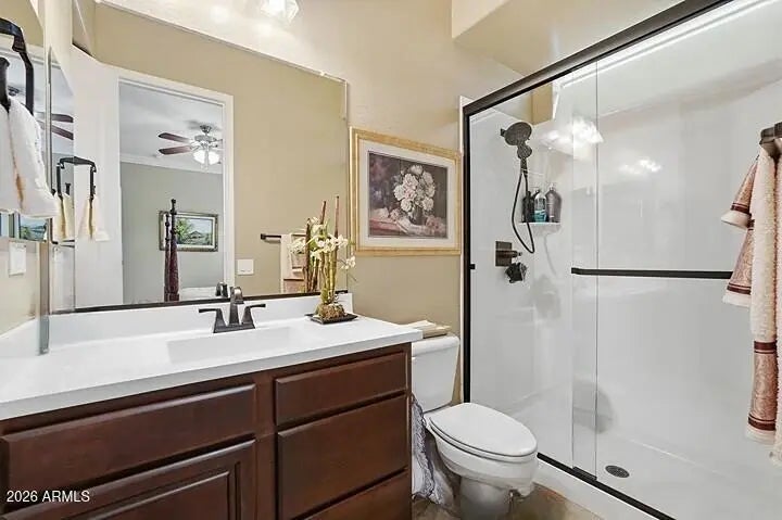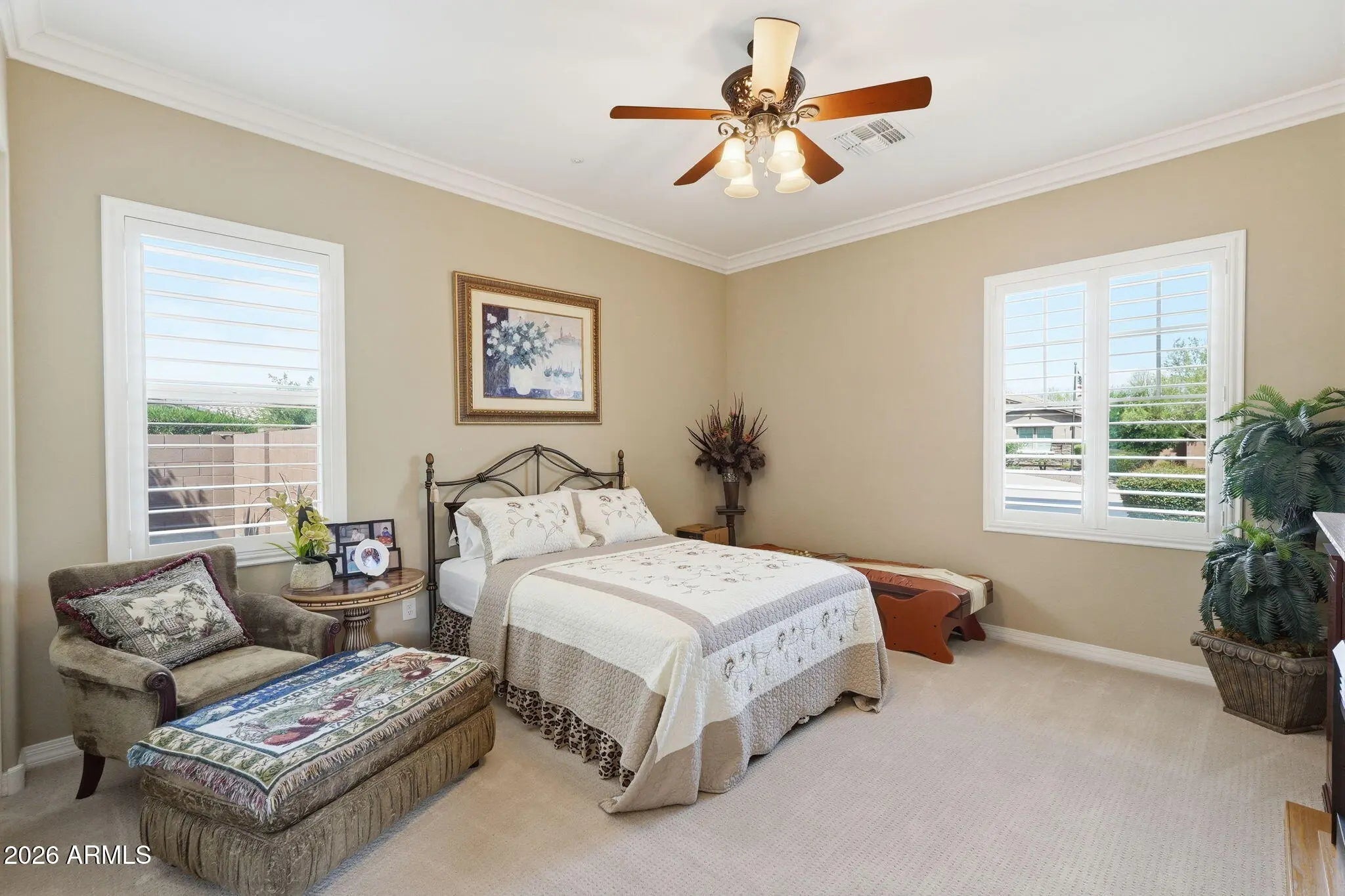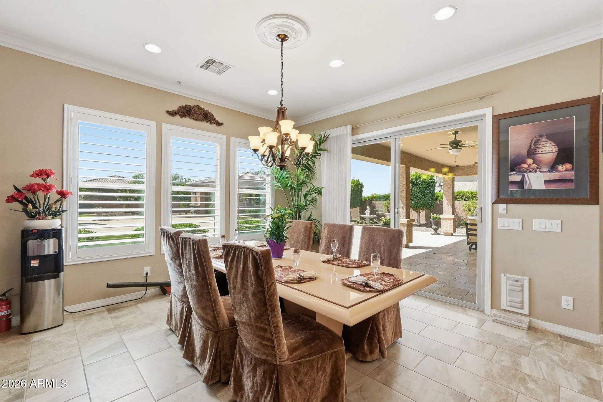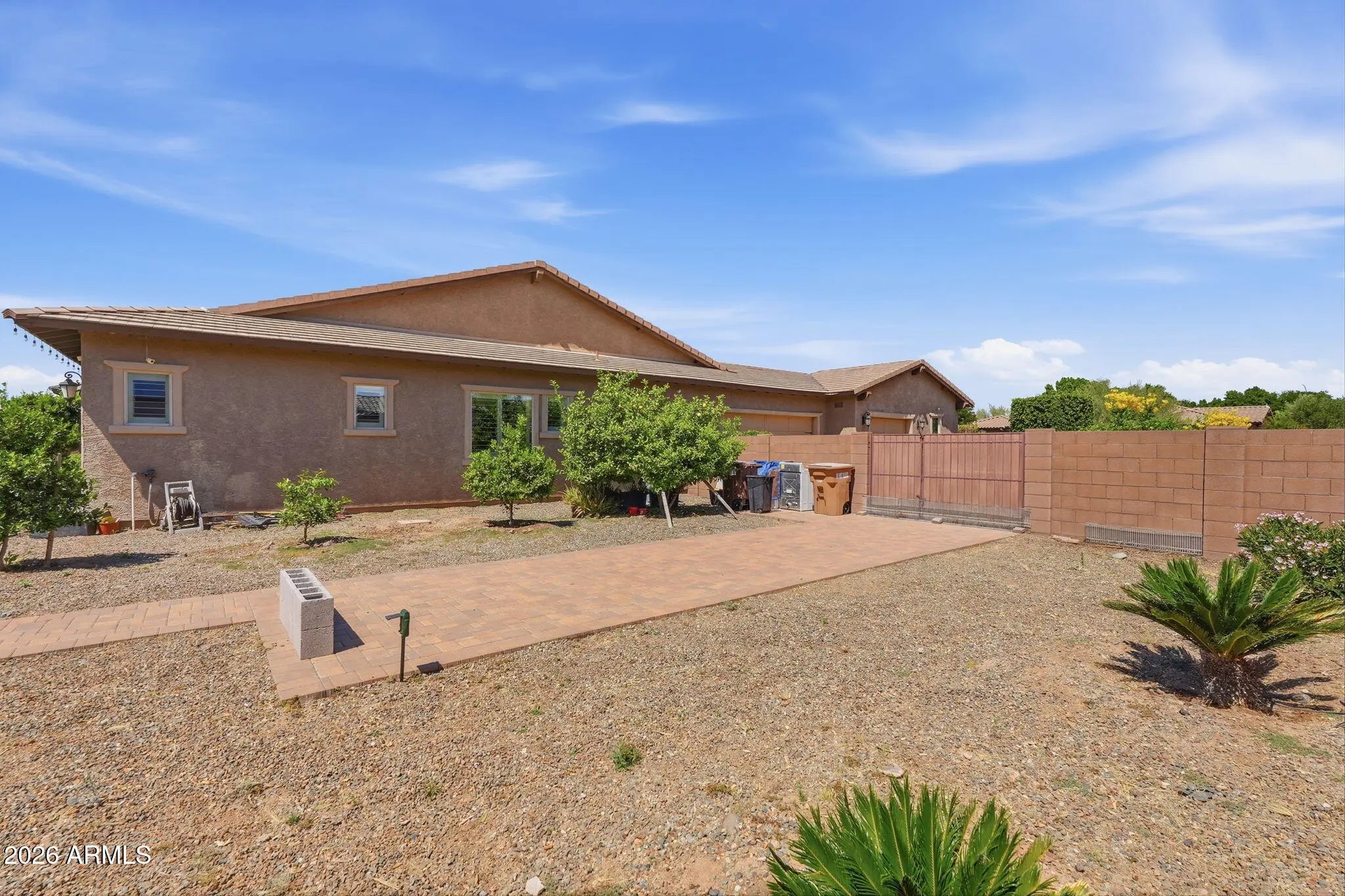 Beautiful single-story home located in a gated community on an expansive almost one-acre lot, featuring an attached casita, private courtyard entry, and circular paver driveway. This well-maintained home features an open floor plan with a large chef's kitchen offering granite countertops, extensive cabinetry, center island with sink, stainless steel refrigerator, tile backsplash, built-in microwave, and single wall oven, plus a long serving counter/butler's pantry area perfect for entertaining. The home includes both formal dining and casual dining areas and opens to spacious living areas with crown molding, plantation shutters, and ceiling fans throughout. The oversized primary suite features large windows with backyard views and plenty of space for a sitting area. Secondary bedrooms are generously sized, and there is additional flex space perfect for an office. Exterior features include a gated front courtyard entrance, stone exterior accents, grass landscaping, RV gate and side yard access, large paver circular driveway, and a 3-car garage. The backyard offers a resort-style setting with a heated pool and raised spa with spillover water feature, large paver patio, ramada, and mature landscaping, ideal for outdoor entertaining. The attached 352 square foot casita with private entrance is perfect for guests or a home office.