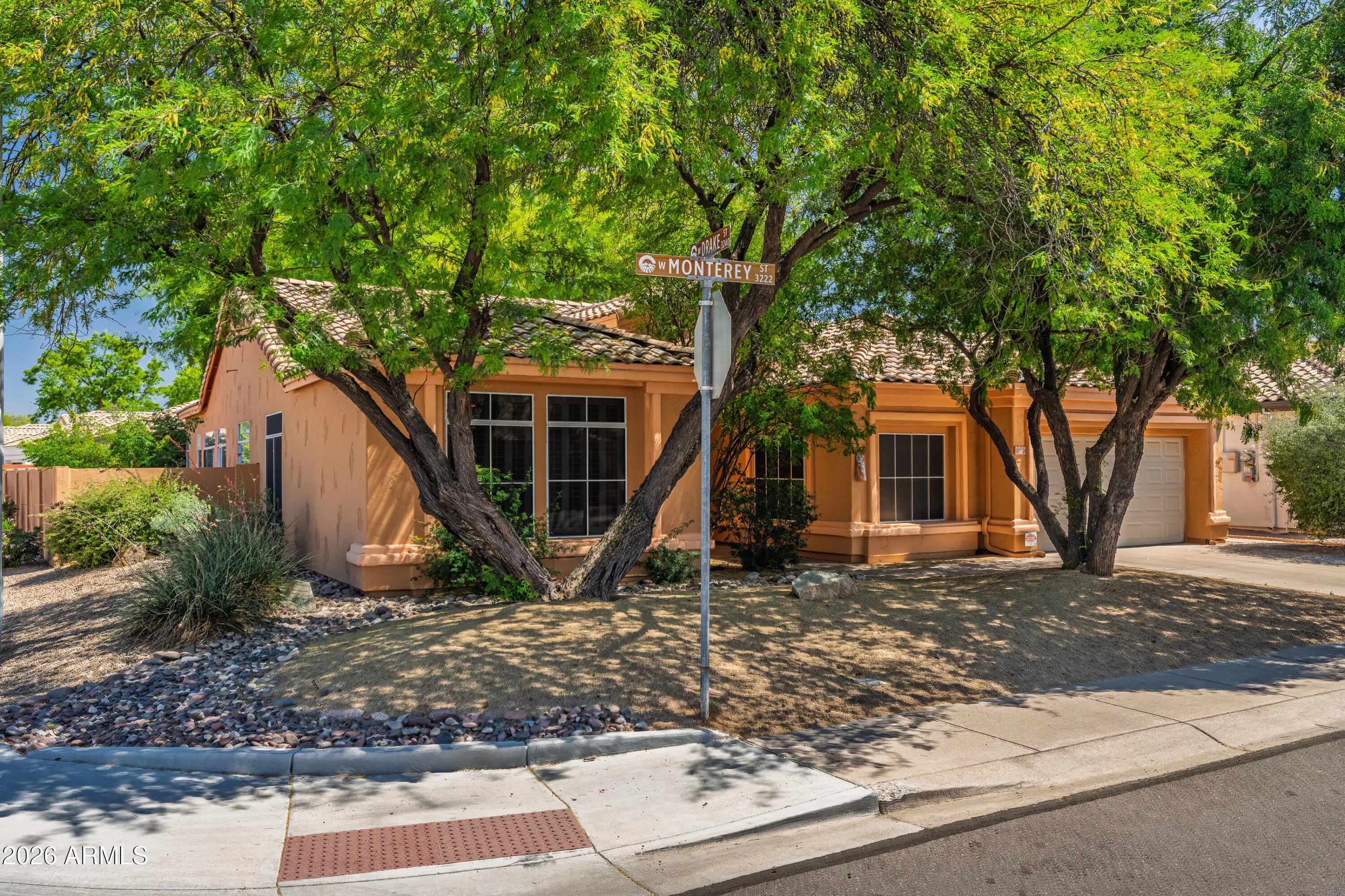 Awesome one owner home that has been meticulously maintained. Situated on oversized corner lot. Highly sought after Kyrene Corridor neighborhood. Home features include Island kitchen, plenty of cabinets, walk in pantry, and breakfast bar. Family room is opened to kitchen area. Spacious living room/dining room with double french doors leading to backyard. Split bedrooms with primary ensuite w/full bath. Huge walk in closet. Separate exit to backyard. Laundry room with sink and cabinets and access to double car garage which has extended space with built in cabinets. There are two secondary bedrooms split with full bath and dual sinks. Plantation shutters thru-out. Tranquil backyard with extended tiled patio. West facing for afternoon shade. This is a must see!