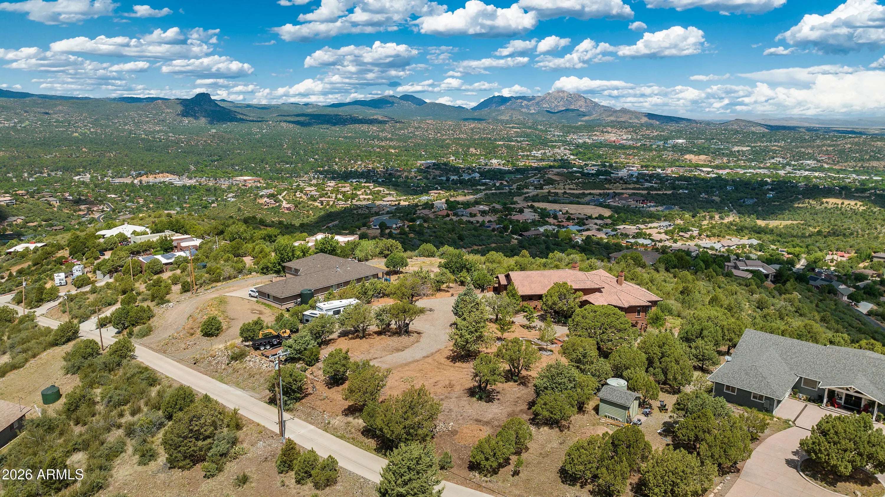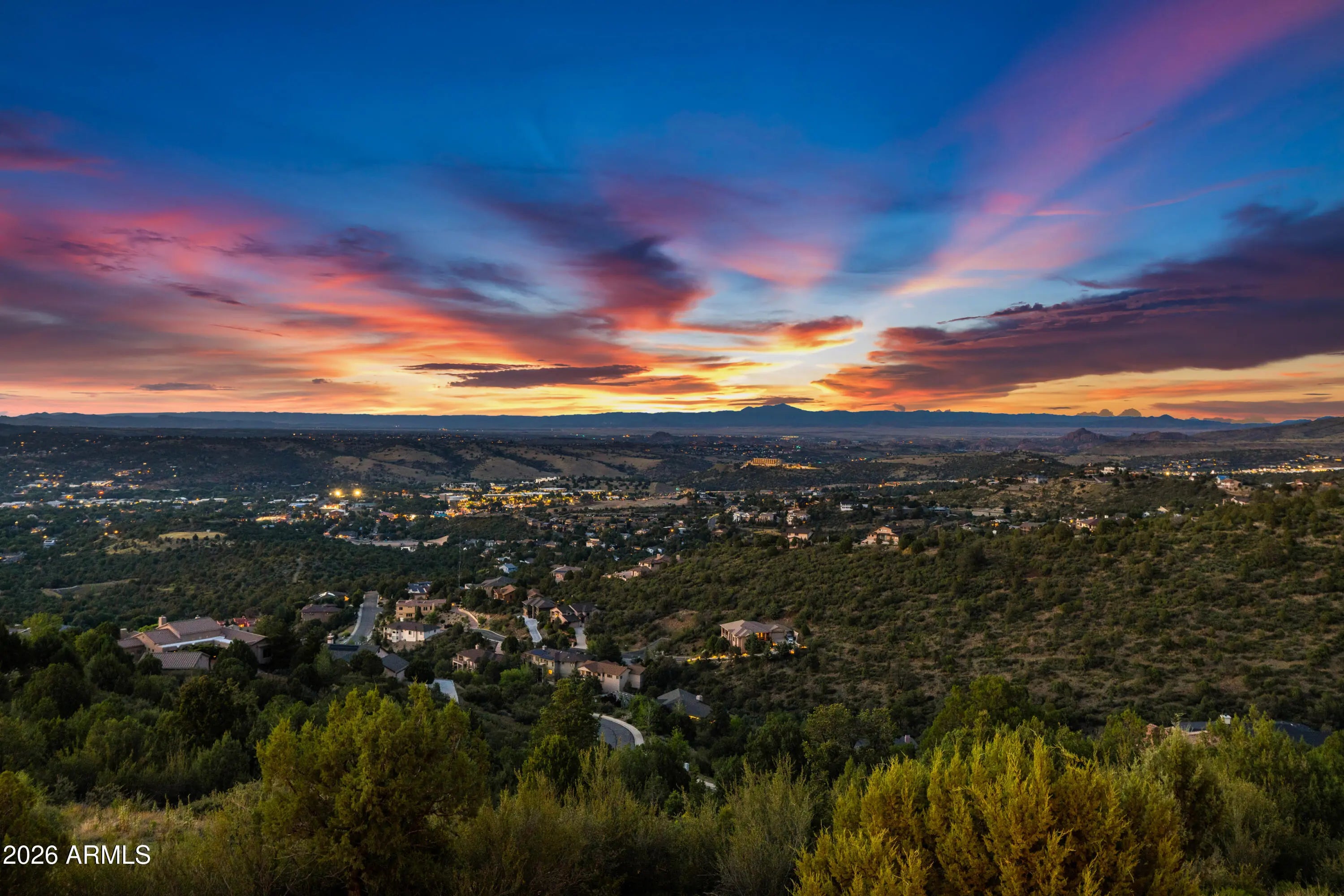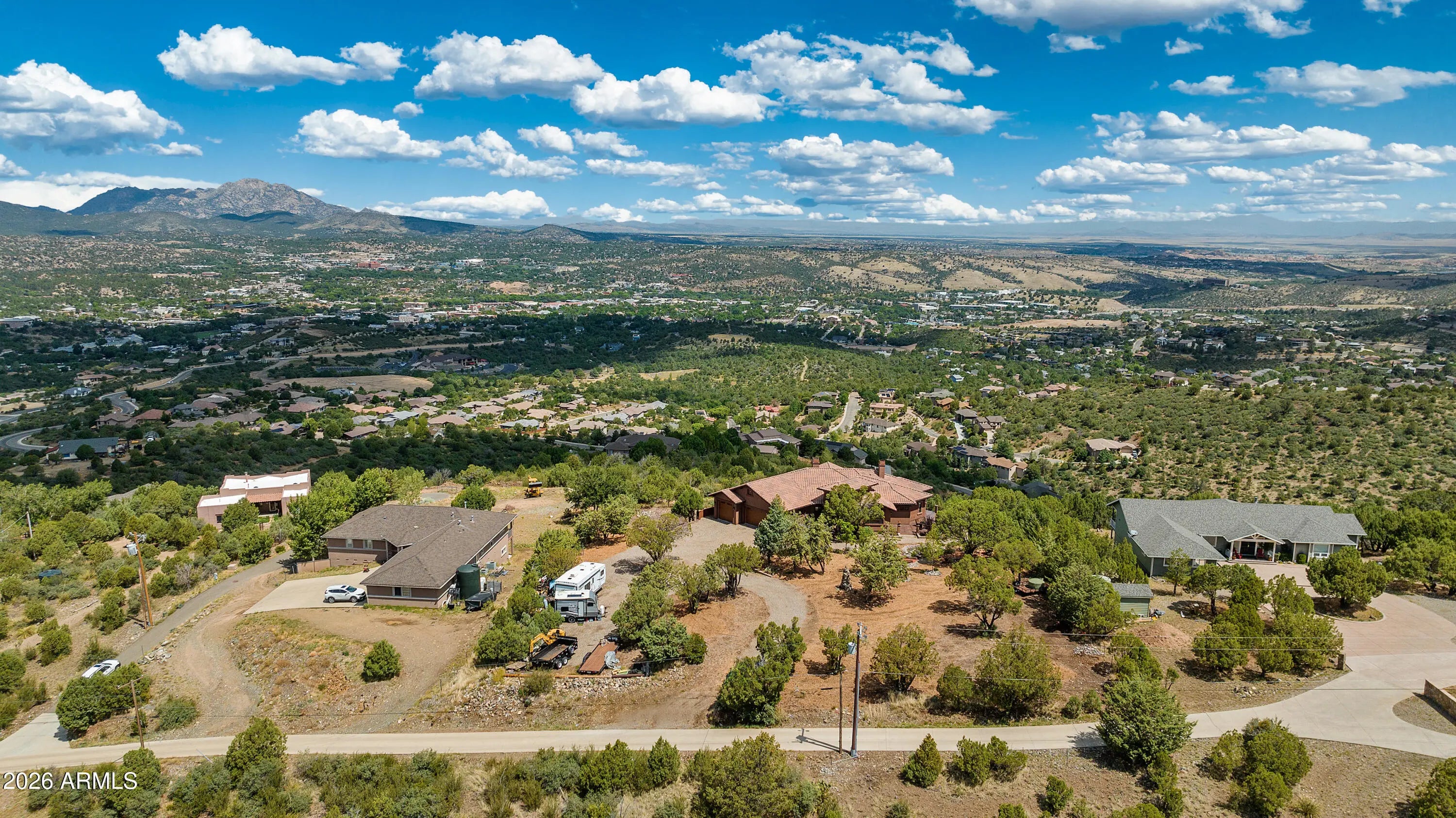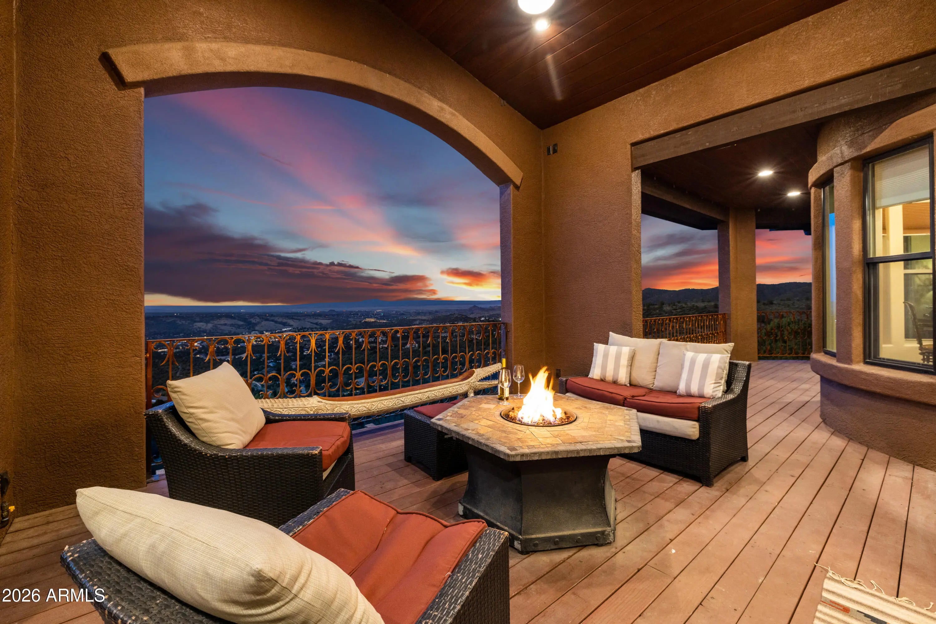 Perched on 1.37 acres high above Prescott, this custom-built residence was thoughtfully designed to capture some of the most breathtaking panoramic views in the region. From the expansive covered deck, take in unobstructed vistas stretching from Thumb Butte and Granite Mountain to the distant San Francisco Peaks, with the sparkling city lights of Prescott unfolding below. The main level features a highly functional split floor plan, offering both a luxurious primary suite and a private secondary en suite, thoughtfully separated by an open-concept living and kitchen area. The chef's kitchen is as beautiful as it is practical, showcasing rich knotty alder cabinetry, chisel-edge granite countertops, and a breakfast bar framed by a sunlit enclave of windows-- perfect for enjoying serene mornin The lower level is equally impressive, with stamped concrete flooring throughout and generous space for relaxation and entertainment. Here you'll find a spacious family room, an inviting wet bar, a dedicated game or hobby room, and a third bedroom. Step outside to the covered patio, where the remarkable views continue uninterrupted. Multiple outdoor living spaces, enhanced by carefully designed patios and tranquil water features, create a private sanctuary that feels worlds away. Completing the property is an oversized three-car garage and full RV hookups, offering both convenience and versatility. This exceptional home is a rare opportunity to experience elevated living, where refined design meets awe-inspiring natural beauty.