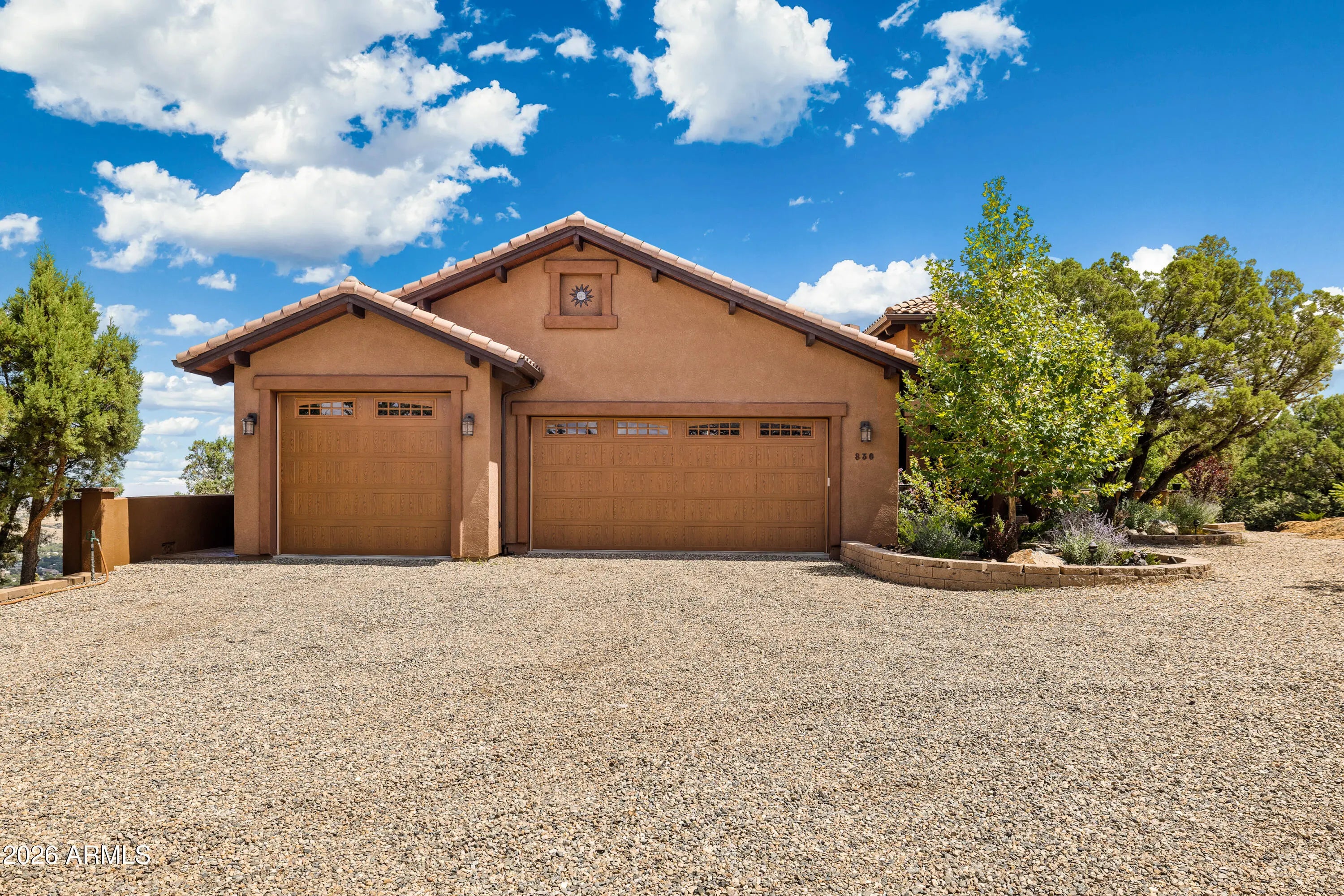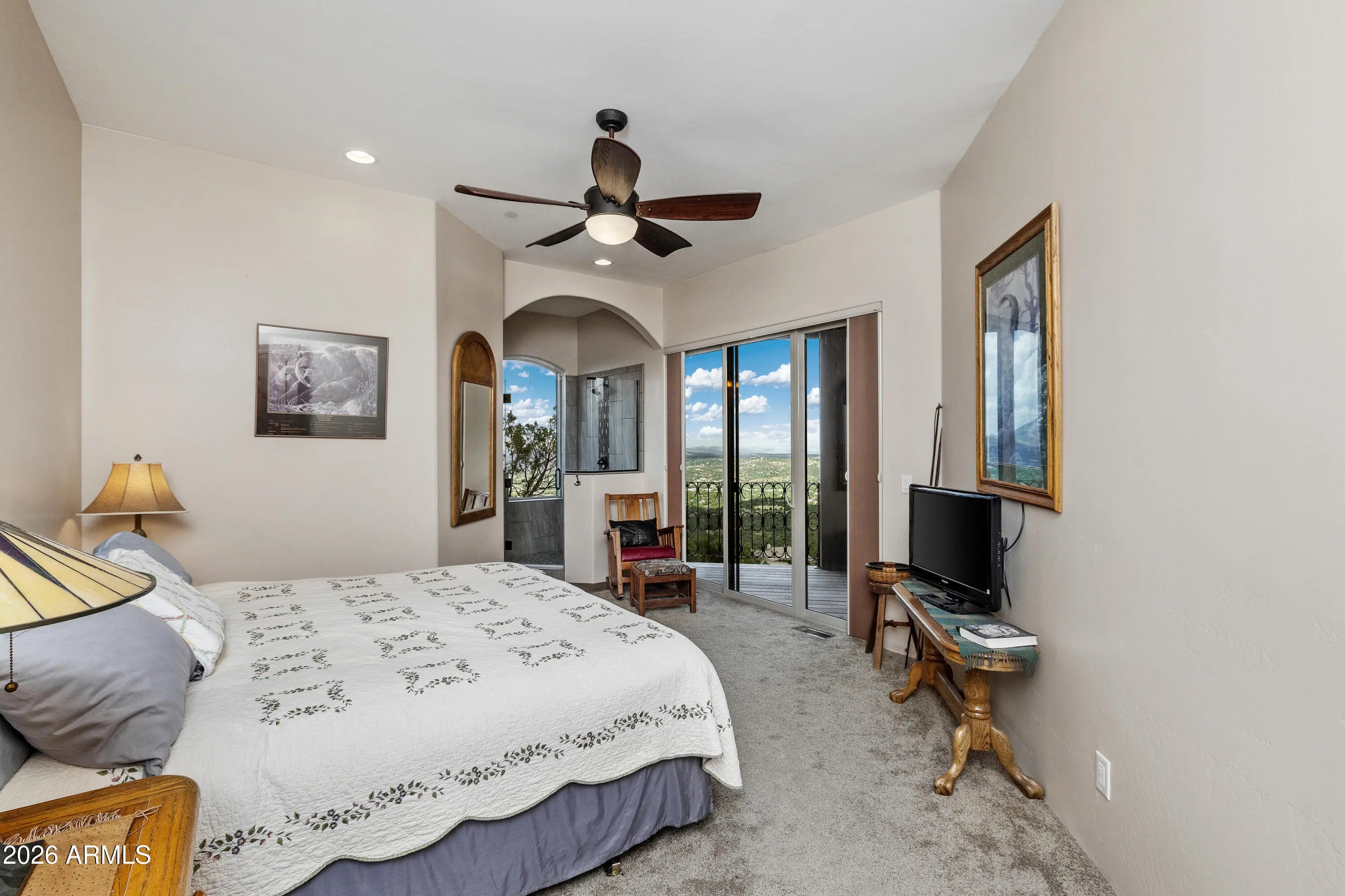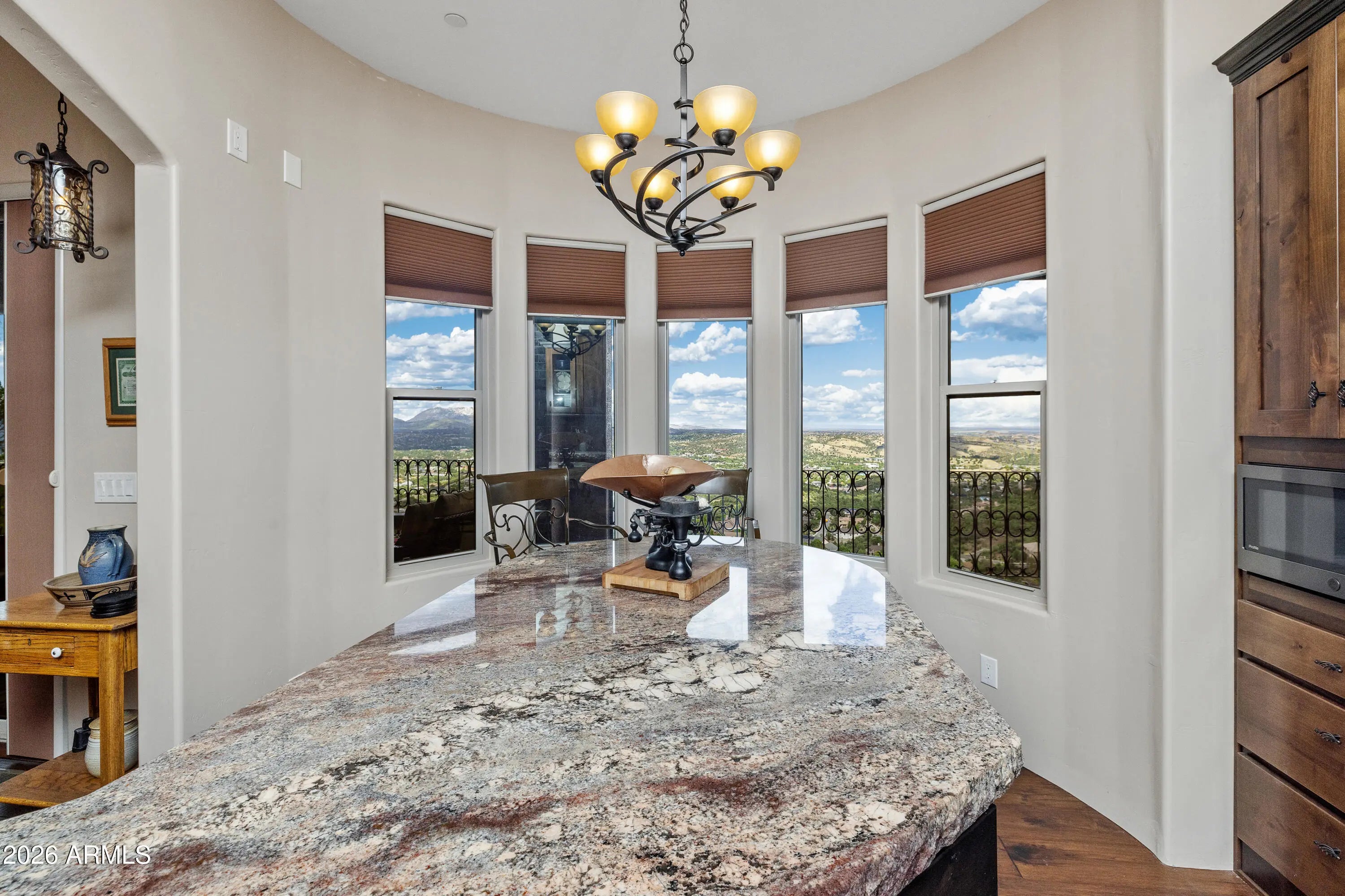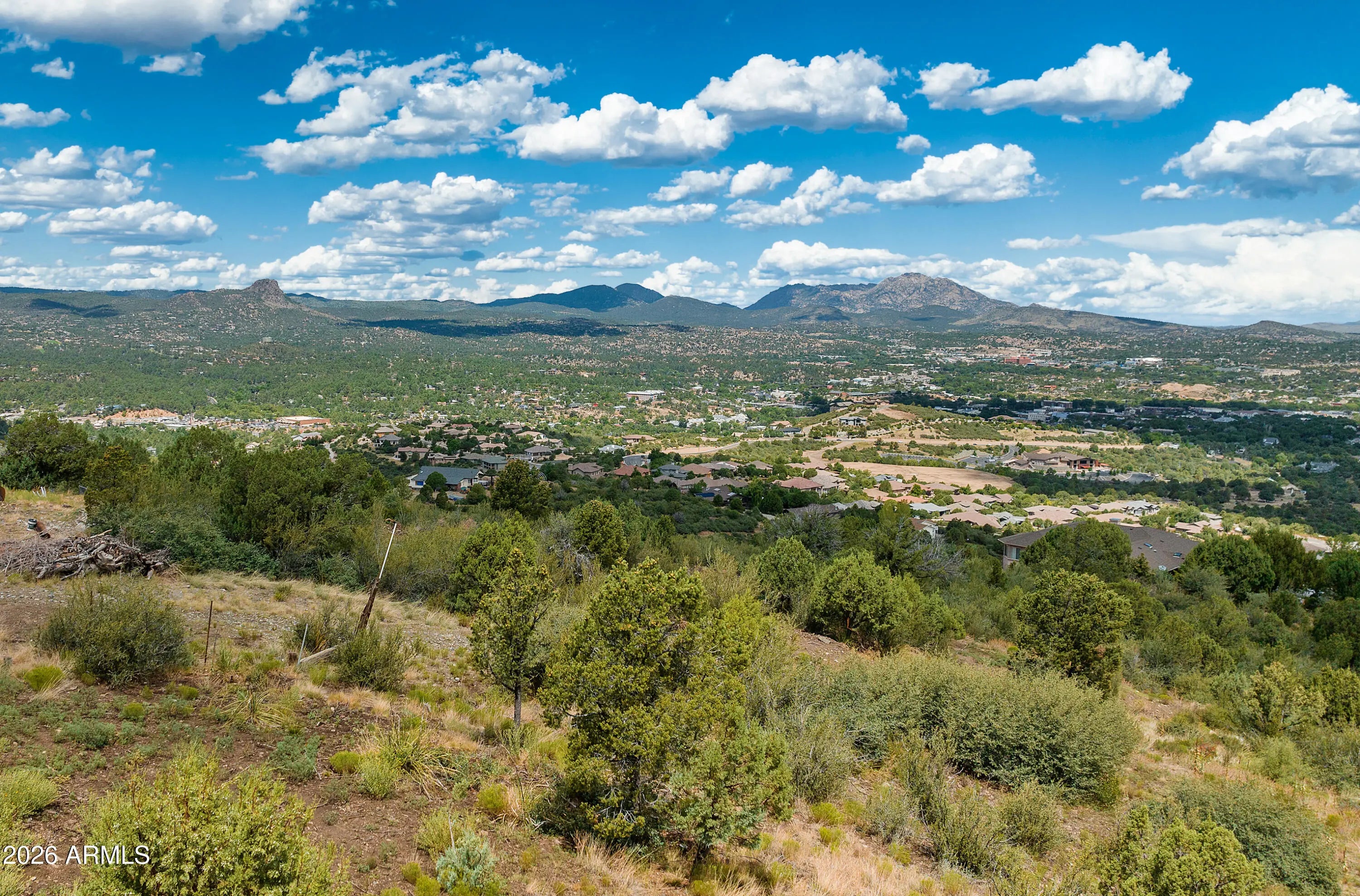 Perched on 1.37 acres high above Prescott, this custom-built residence was thoughtfully designed to capture some of the most breathtaking panoramic views in the region. From the expansive covered deck, take in unobstructed vistas stretching from Thumb Butte and Granite Mountain to the distant San Francisco Peaks, with the sparkling city lights of Prescott unfolding below. The main level features a highly functional split floor plan, offering both a luxurious primary suite and a private secondary en suite, thoughtfully separated by an open-concept living and kitchen area. The chef's kitchen is as beautiful as it is practical, showcasing rich knotty alder cabinetry, chisel-edge granite countertops, and a breakfast bar framed by a sunlit enclave of windows-- perfect for enjoying serene mornin The lower level is equally impressive, with stamped concrete flooring throughout and generous space for relaxation and entertainment. Here you'll find a spacious family room, an inviting wet bar, a dedicated game or hobby room, and a third bedroom. Step outside to the covered patio, where the remarkable views continue uninterrupted. Multiple outdoor living spaces, enhanced by carefully designed patios and tranquil water features, create a private sanctuary that feels worlds away. Completing the property is an oversized three-car garage and full RV hookups, offering both convenience and versatility. This exceptional home is a rare opportunity to experience elevated living, where refined design meets awe-inspiring natural beauty.
