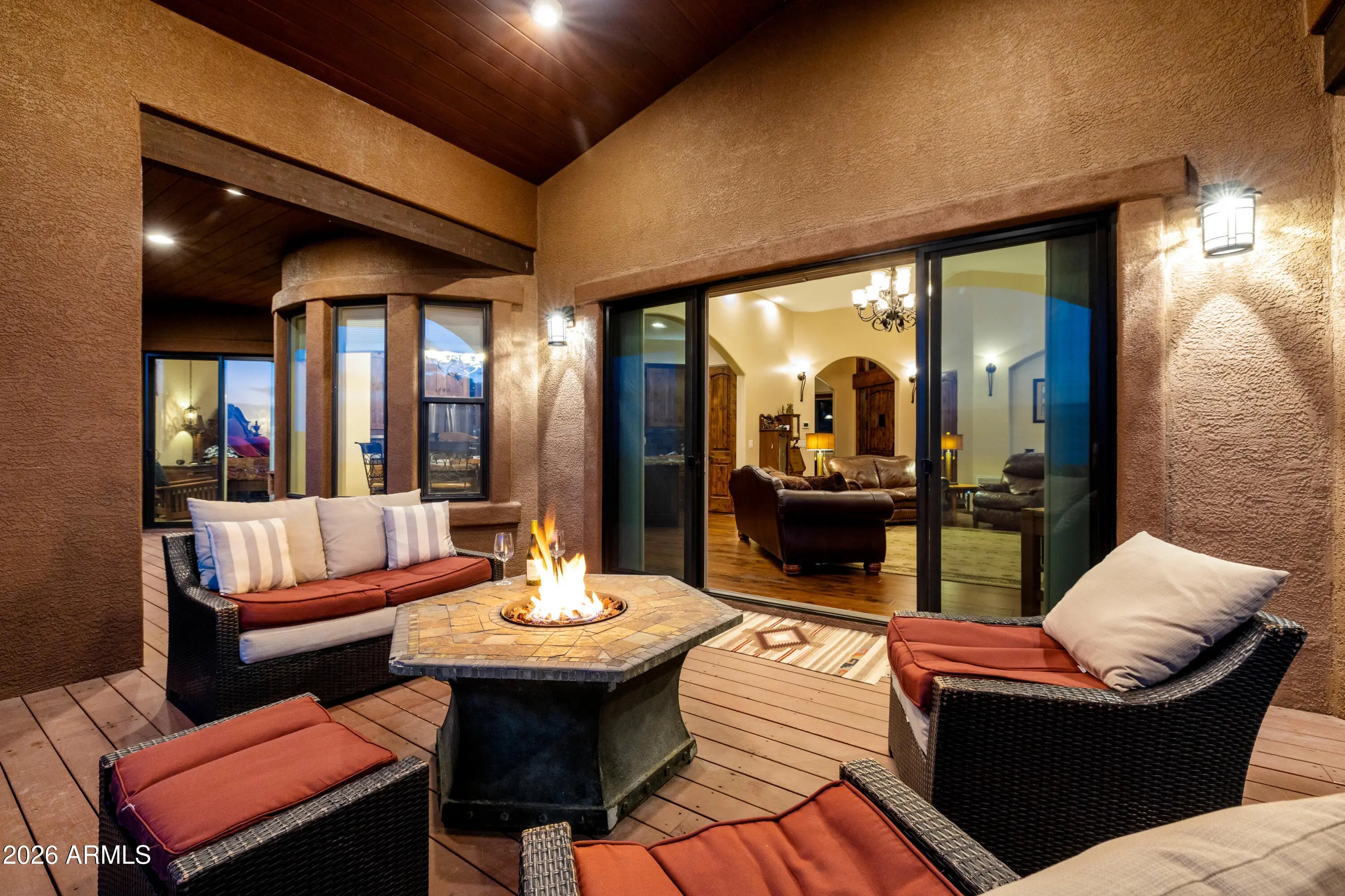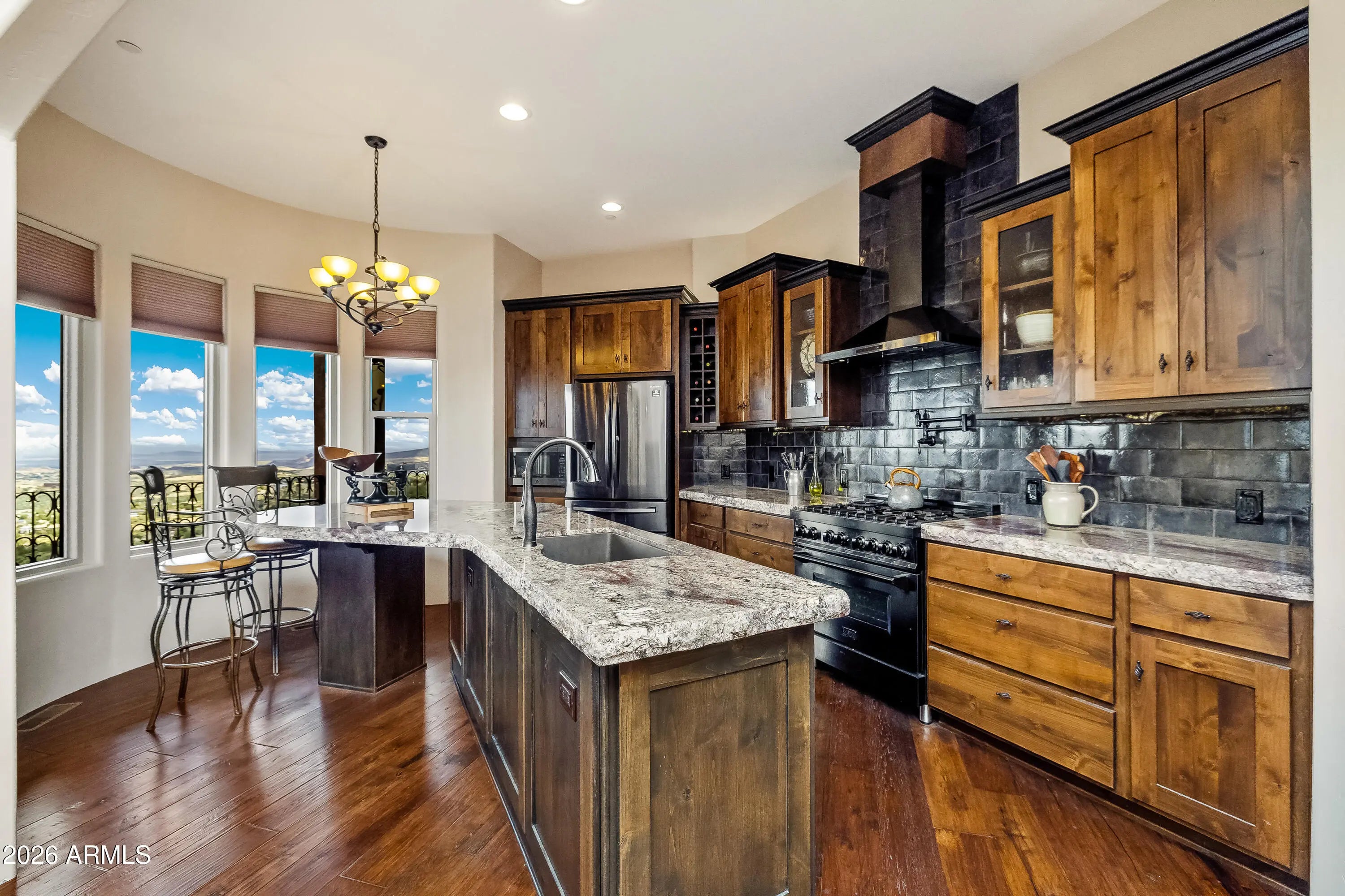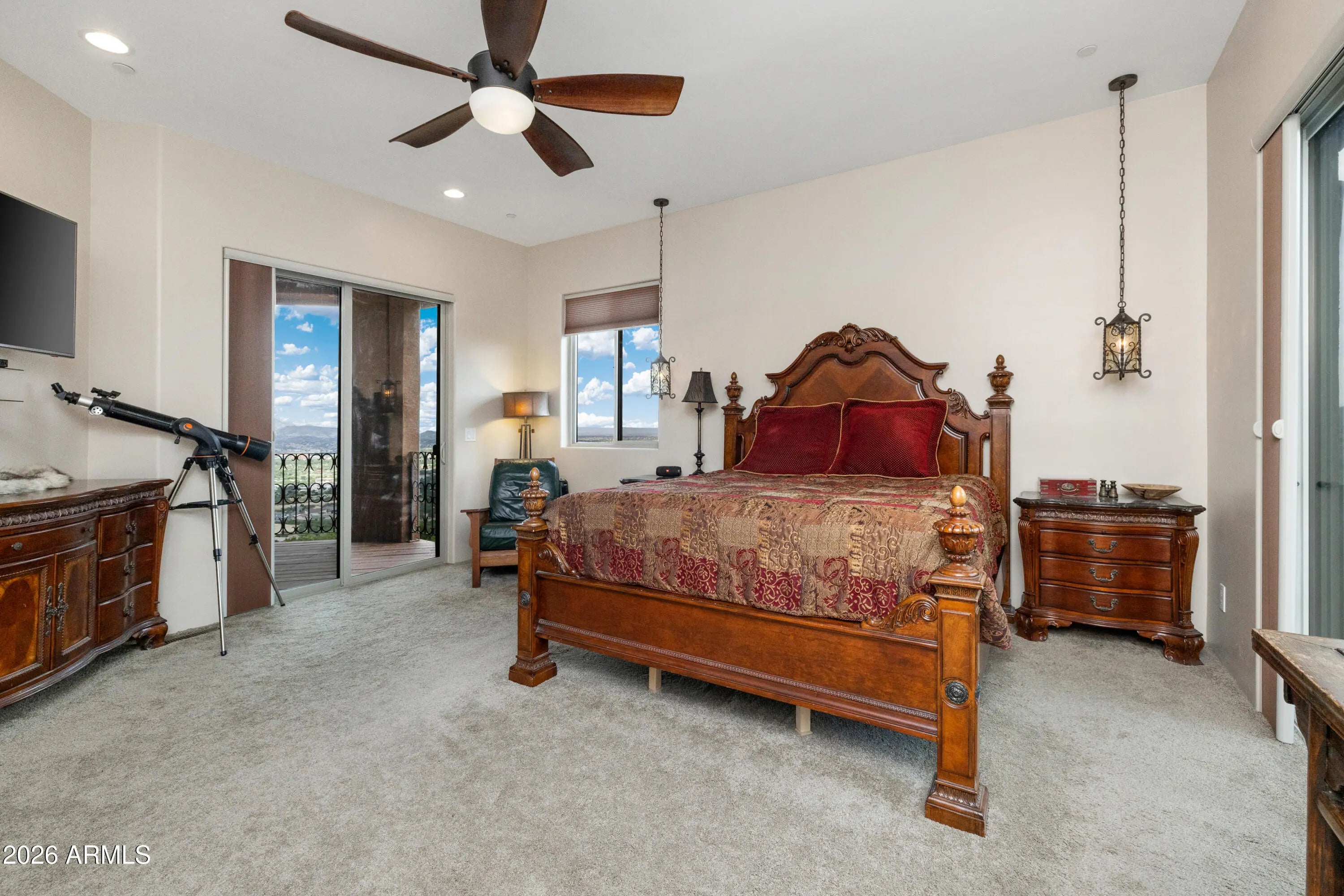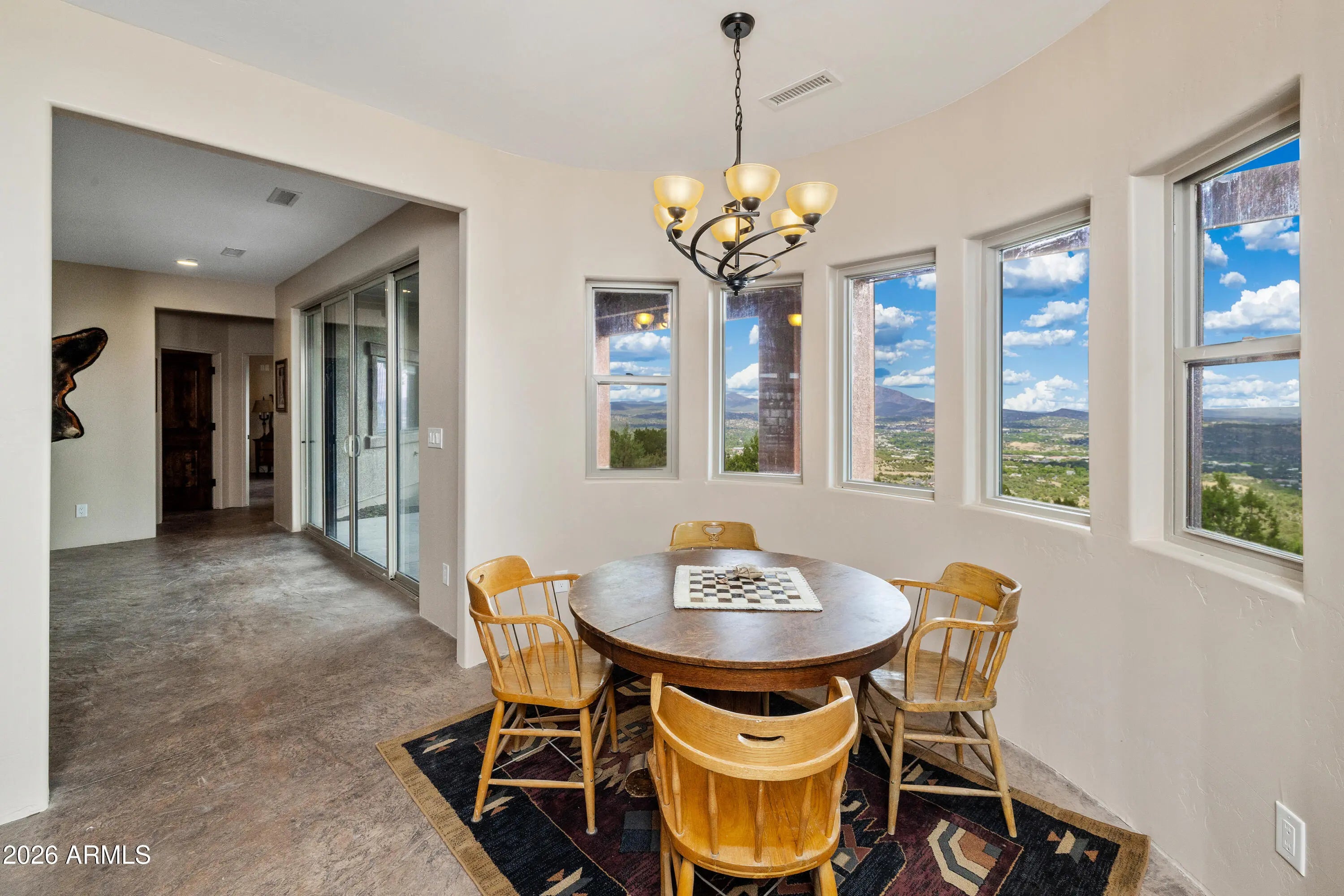 Perched on 1.37 acres high above Prescott, this custom-built residence was thoughtfully designed to capture some of the most breathtaking panoramic views in the region. From the expansive covered deck, take in unobstructed vistas stretching from Thumb Butte and Granite Mountain to the distant San Francisco Peaks, with the sparkling city lights of Prescott unfolding below. The main level features a highly functional split floor plan, offering both a luxurious primary suite and a private secondary en suite, thoughtfully separated by an open-concept living and kitchen area. The chef's kitchen is as beautiful as it is practical, showcasing rich knotty alder cabinetry, chisel-edge granite countertops, and a breakfast bar framed by a sunlit enclave of windows-- perfect for enjoying serene mornin The lower level is equally impressive, with stamped concrete flooring throughout and generous space for relaxation and entertainment. Here you'll find a spacious family room, an inviting wet bar, a dedicated game or hobby room, and a third bedroom. Step outside to the covered patio, where the remarkable views continue uninterrupted. Multiple outdoor living spaces, enhanced by carefully designed patios and tranquil water features, create a private sanctuary that feels worlds away. Completing the property is an oversized three-car garage and full RV hookups, offering both convenience and versatility. This exceptional home is a rare opportunity to experience elevated living, where refined design meets awe-inspiring natural beauty.
