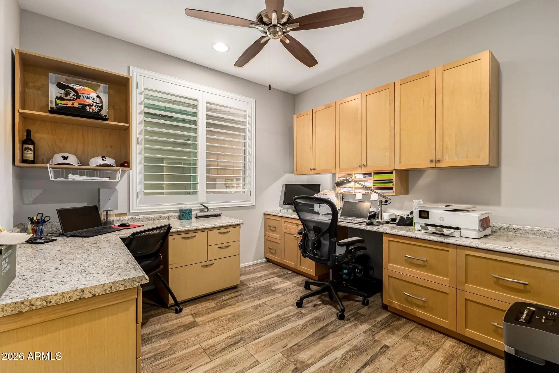 Upgraded home w/ $140K+ in improvements--this one stands out. Tile wood floors t/o, elec fireplace (plumbed for gas) & open layout. Kitchen features granite counters, island, elevated dishwasher, walk-in pantry, soft-close cabs, SS appliances & 5-burner gas cooktop. Split floor plan w/ guest suite + powder rm & office. Primary suite w/ elec awning. Backyard is dialed in--smart pool w/ deck jets, aerators & in-pool table, turf front/back, 3 date palms, custom lighting & main patio sun screen. Golf ball screens + added privacy. 2-car extended garage w/ epoxy floors & overhead storage. Tankless gas HWH. Premium golf course lot (13th fairway) w/ greenbelt across the street. Rare elevation. Over $140K in upgrades make this home truly stand out. Interior features include tile wood flooring throughout, an electric fireplace (plumbed for gas), and a well-designed open layout. The kitchen is upgraded with granite countertops, a large island, elevated dishwasher, walk-in pantry, soft-close cabinetry, stainless steel appliances, and a 5-burner gas cooktop. Functional split floor plan includes a guest suite with added powder room and a separate office space. The primary suite features added comfort with an electric awning. Backyard is built for enjoyment--smart pool with deck jets, 2 aerators, and an in-pool table, plus turf in both front and back, 3 mature date palms, custom yard lighting, main patio sun screen, and golf ball protection screens. Additional upgrades include new side gates, tankless gas hot water heater, and a 2-car extended garage with epoxy floors and overhead storage. Premium golf course lot backing to the 13th fairway with a greenbelt across the street and a rare elevation not found elsewhere in the neighborhood.