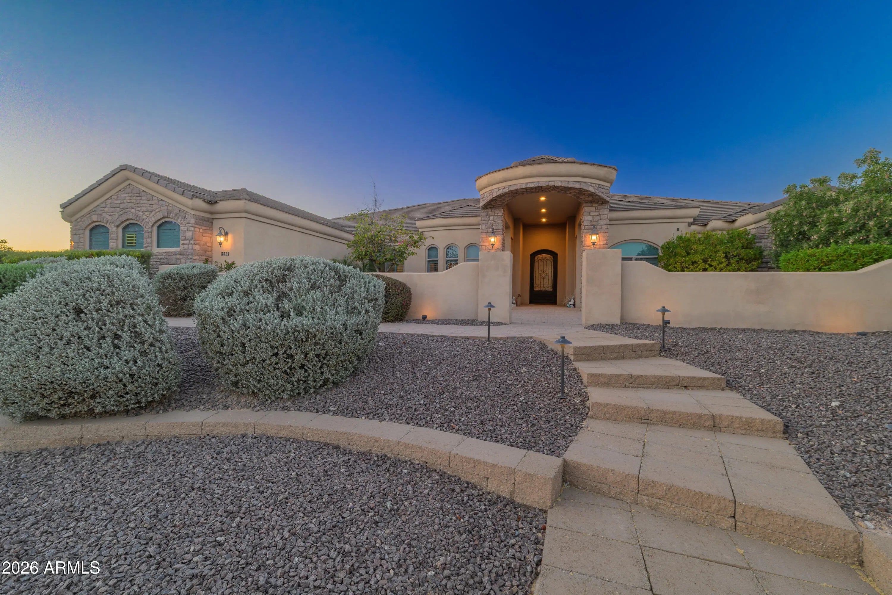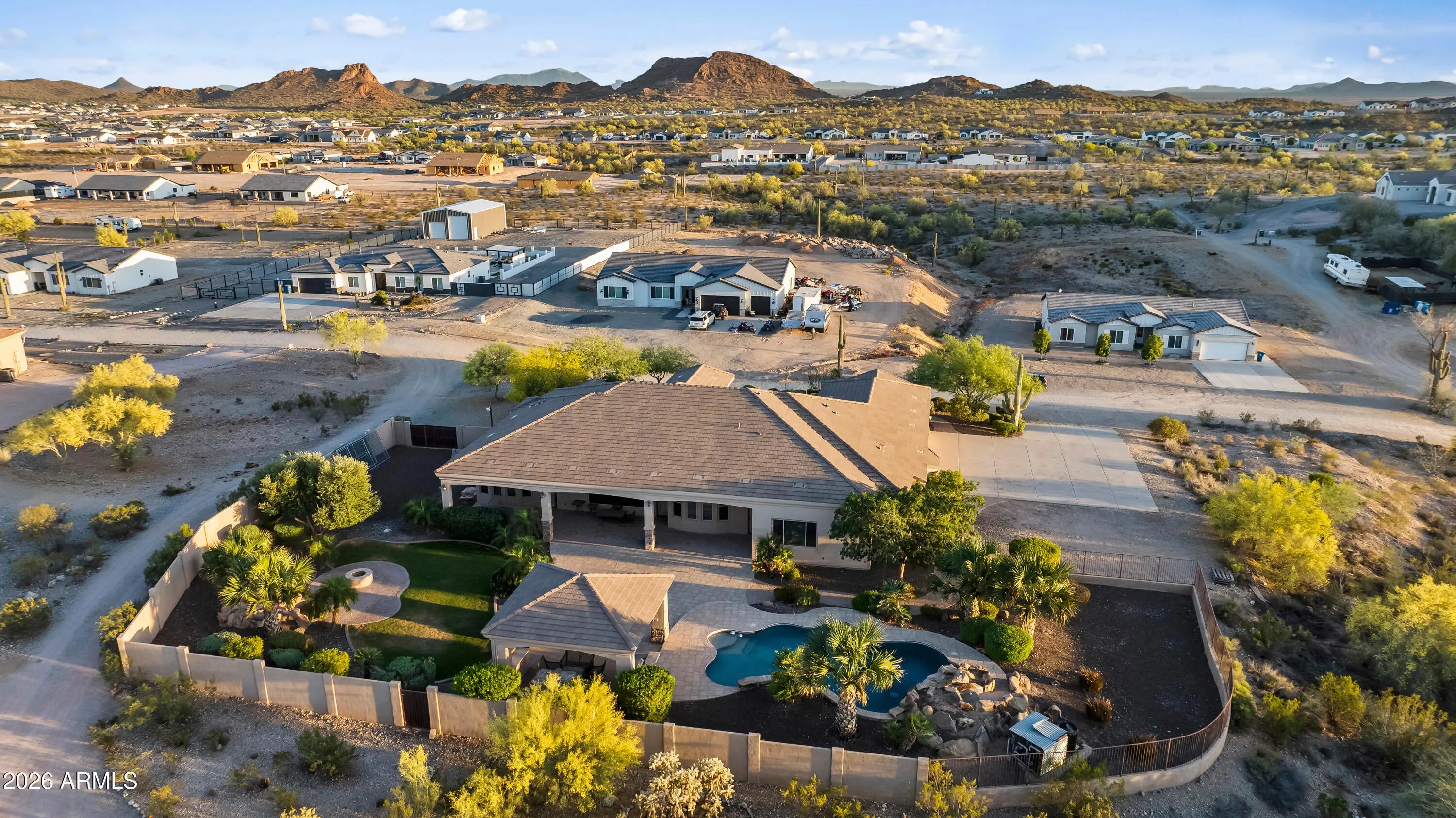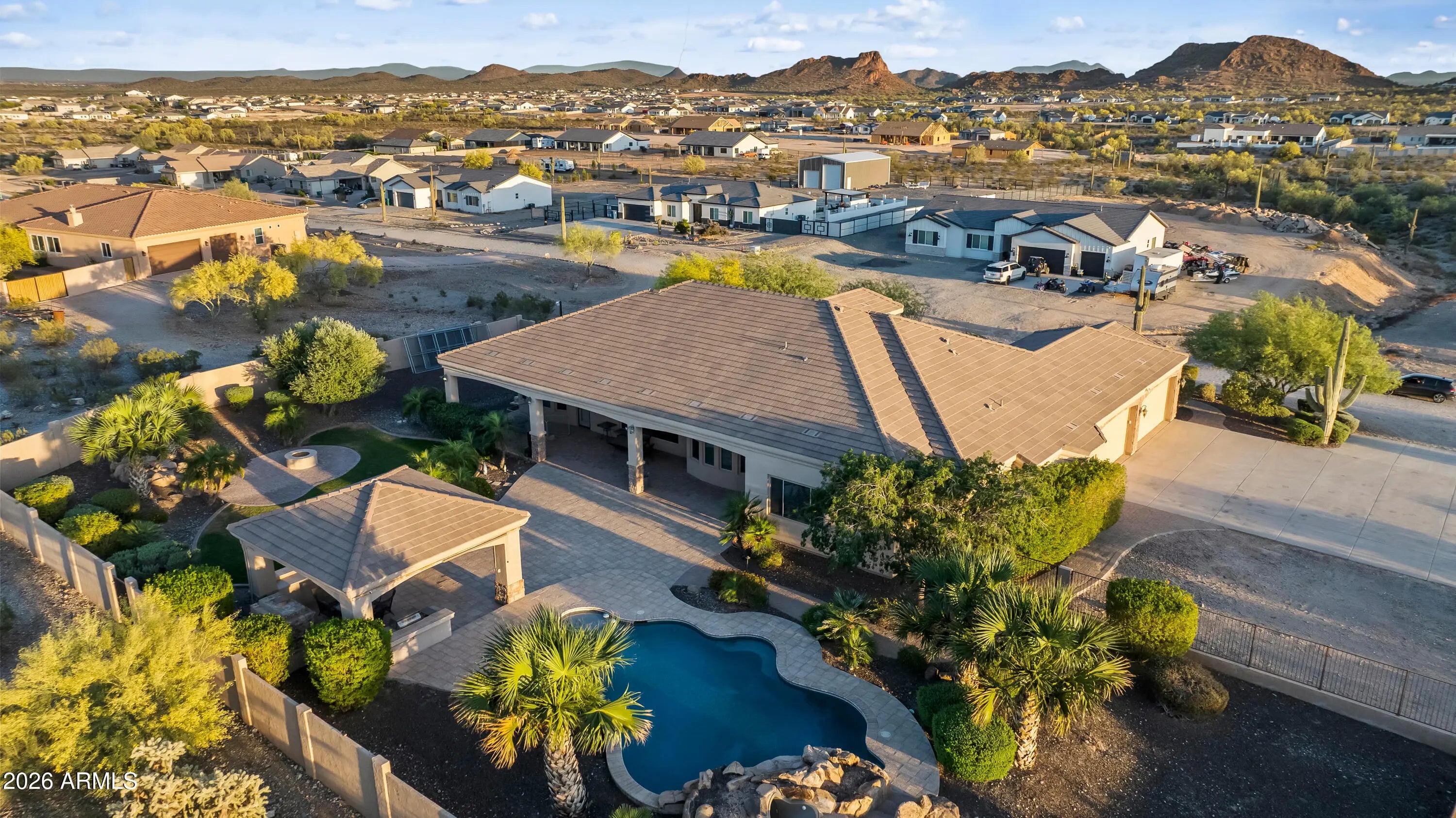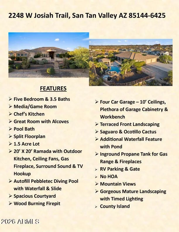 This Spectacular Estate Home offers breathtaking sunset & mountain views that will truly leave you in awe! Nestled on 1.5 acres of wide-open desert in a Luxurious, Private Setting, this stunning horse property at Josiah Trail exudes elegance from the moment you arrive! The expansive front courtyard welcomes you with sweeping vistas, setting the tone for the exceptional craftsmanship & attention to detail found throughout. Step into the gourmet chef's kitchen equipped with premium features that flows seamlessly into a grand Great Room anchored by a gas fireplace & alcoves that frame a dramatic wall of windows. You'll overlook the backyard oasis that showcase a sparkling pool, outdoor kitchen, fireplace, gas fire pit, panoramic views of the San Tan Mountains & iconic mature desert cacti! The vast master suite provides direct access to the pool for ultimate relaxation, while a separate guest wing offers privacy with two bedrooms, a Jack-and-Jill bathroom & a versatile media/game room. This home also offers a Central Vacuum system. The backyard is a true desert oasis with a stunning 22,000-gallon free-form heated pebble-tech pool with an automatic filtering system, autofill, waterfall feature & slide. Also, a wood burning firepit paired with an additional waterfall & pond. Expansive 20'x20' Ramada featuring an outdoor kitchen, ceiling fans & sun-blocking shades. The covered back patio is accessible from the great room, media/game room, pool bath & master suite complete with speaker wiring & TV ready. Mature landscaping with an in-ground irrigation system enhances the fully fenced private yard with partial wrought iron for unobstructed desert views. Additional conveniences include RV parking with a large RV gate on the east side, plus a generous front courtyard. For added appeal, the home boasts a four-car garage with 10' ceilings, abundant built-in storage cabinets & a dedicated workbench. This Josiah Trail gem combines luxurious indoor living with an unparalleled outdoor retreat ideal for those seeking privacy, space for horses & unforgettable Arizona desert beauty! This is your new home in the Countryside of the San Tans! Come Home to the Country, You'll Fall In Love With The San Tans, Too!