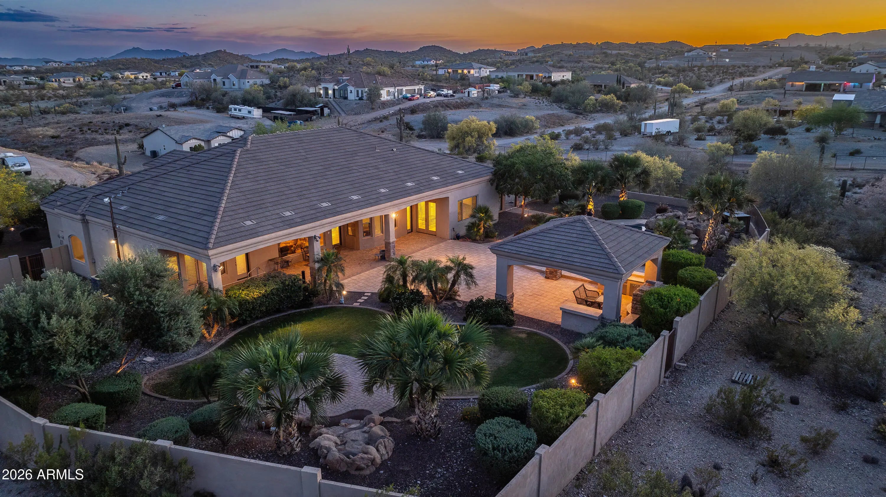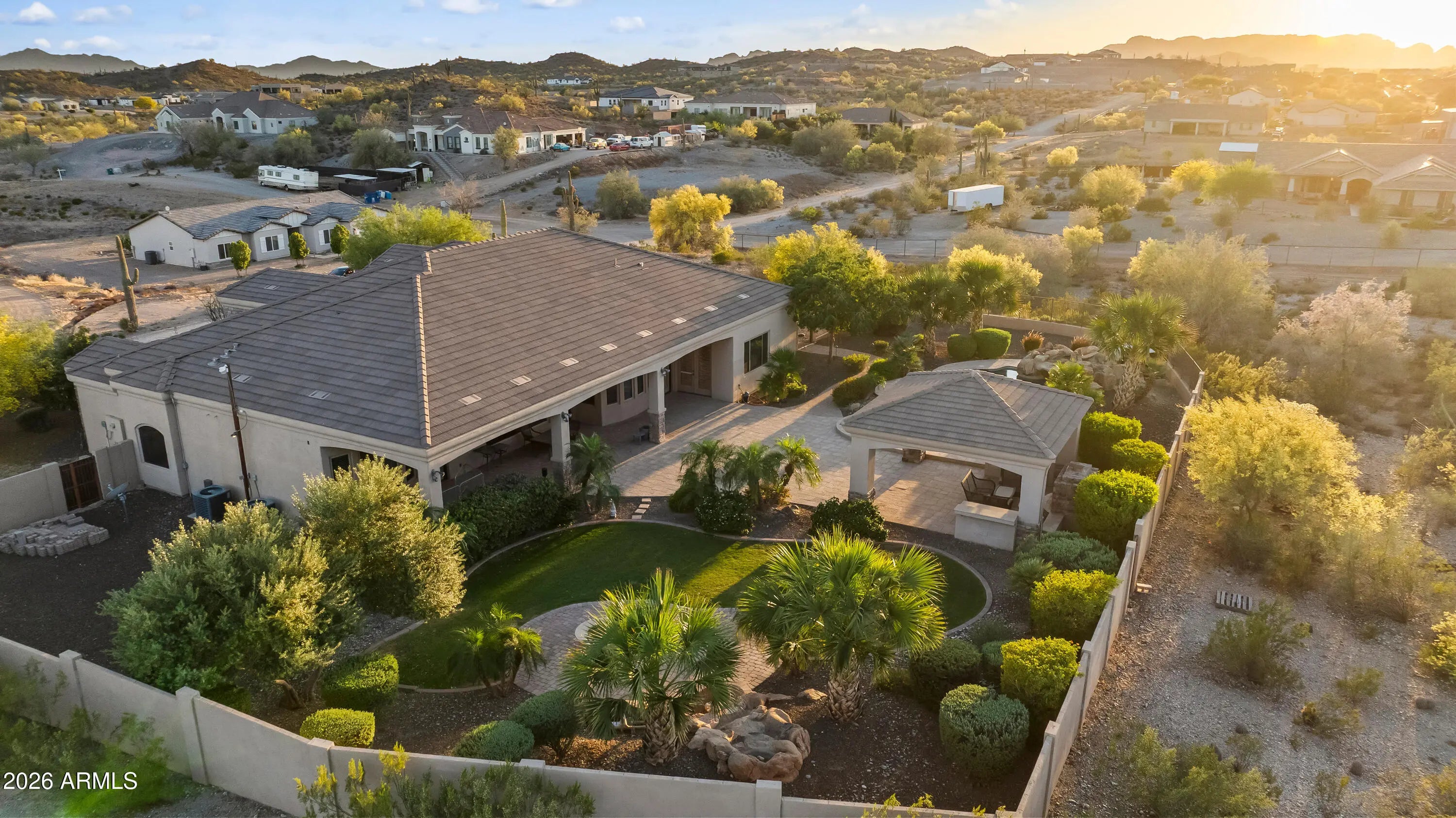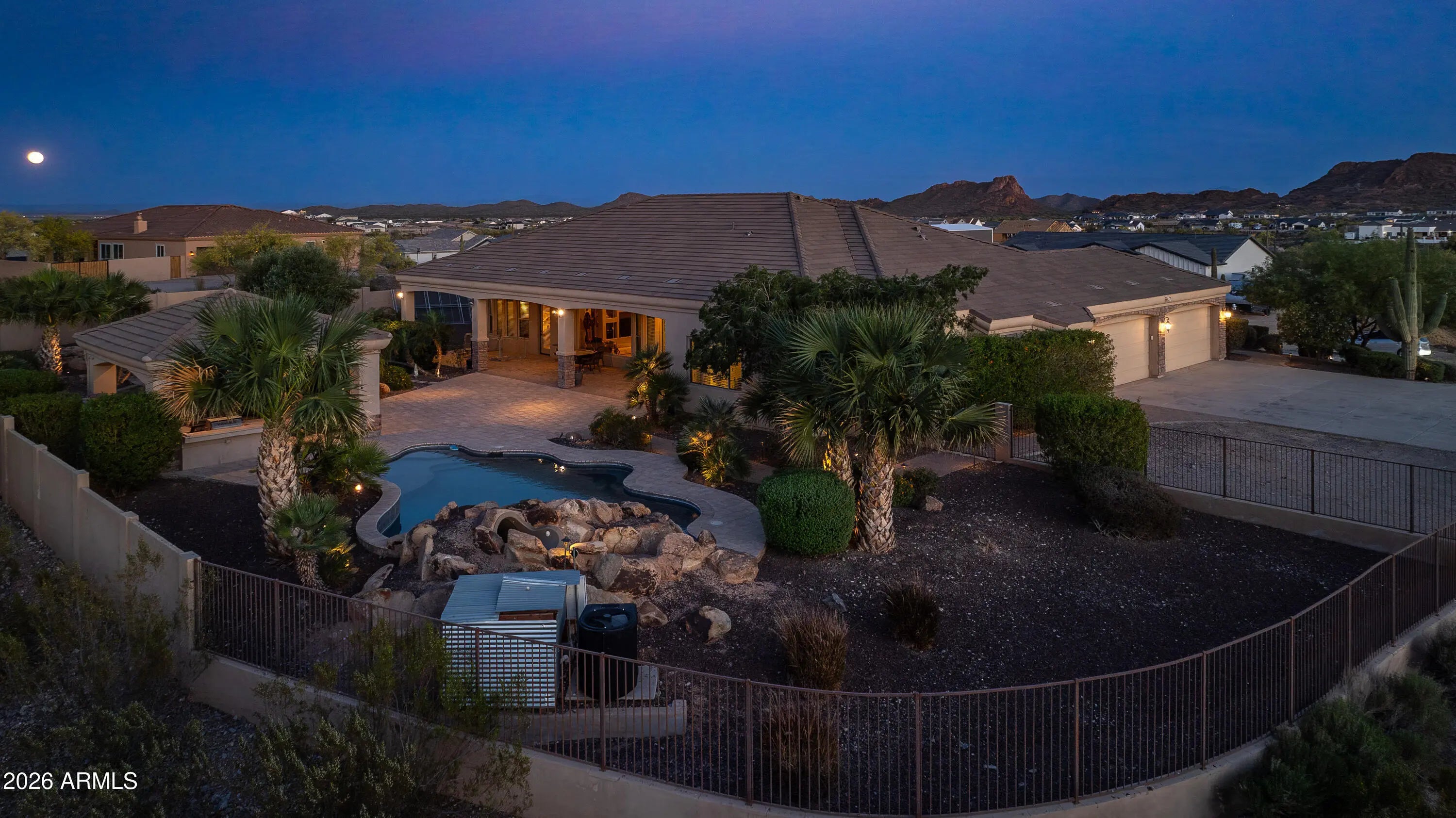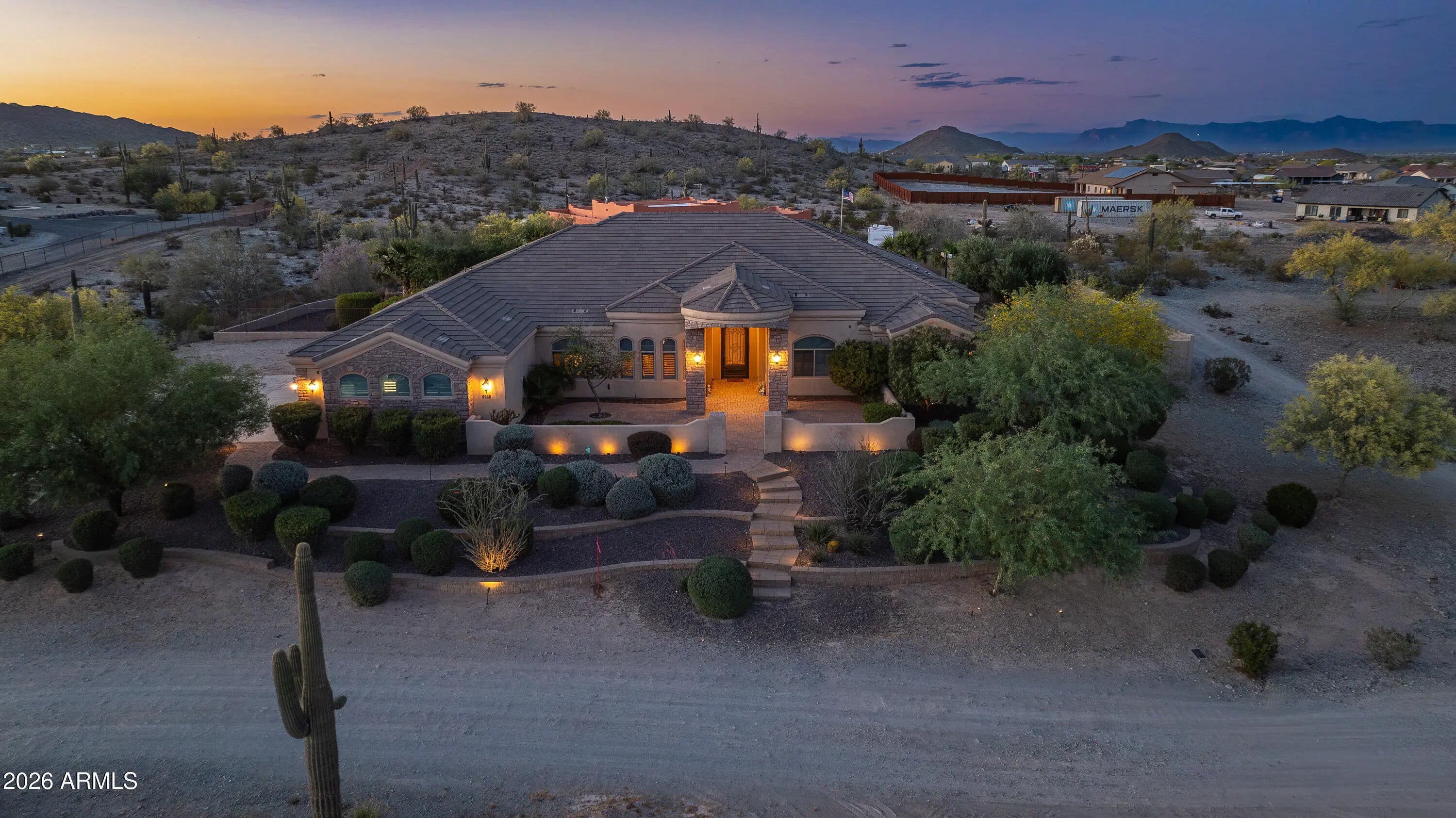 This Spectacular Estate Home offers breathtaking sunset & mountain views that will truly leave you in awe! Nestled on 1.5 acres of wide-open desert in a Luxurious, Private Setting, this stunning horse property at Josiah Trail exudes elegance from the moment you arrive! The expansive front courtyard welcomes you with sweeping vistas, setting the tone for the exceptional craftsmanship & attention to detail found throughout. Step into the gourmet chef's kitchen equipped with premium features that flows seamlessly into a grand Great Room anchored by a gas fireplace & alcoves that frame a dramatic wall of windows. You'll overlook the backyard oasis that showcase a sparkling pool, outdoor kitchen, fireplace, gas fire pit, panoramic views of the San Tan Mountains & iconic mature desert cacti! The vast master suite provides direct access to the pool for ultimate relaxation, while a separate guest wing offers privacy with two bedrooms, a Jack-and-Jill bathroom & a versatile media/game room. This home also offers a Central Vacuum system. The backyard is a true desert oasis with a stunning 22,000-gallon free-form heated pebble-tech pool with an automatic filtering system, autofill, waterfall feature & slide. Also, a wood burning firepit paired with an additional waterfall & pond. Expansive 20'x20' Ramada featuring an outdoor kitchen, ceiling fans & sun-blocking shades. The covered back patio is accessible from the great room, media/game room, pool bath & master suite complete with speaker wiring & TV ready. Mature landscaping with an in-ground irrigation system enhances the fully fenced private yard with partial wrought iron for unobstructed desert views. Additional conveniences include RV parking with a large RV gate on the east side, plus a generous front courtyard. For added appeal, the home boasts a four-car garage with 10' ceilings, abundant built-in storage cabinets & a dedicated workbench. This Josiah Trail gem combines luxurious indoor living with an unparalleled outdoor retreat ideal for those seeking privacy, space for horses & unforgettable Arizona desert beauty! This is your new home in the Countryside of the San Tans! Come Home to the Country, You'll Fall In Love With The San Tans, Too!