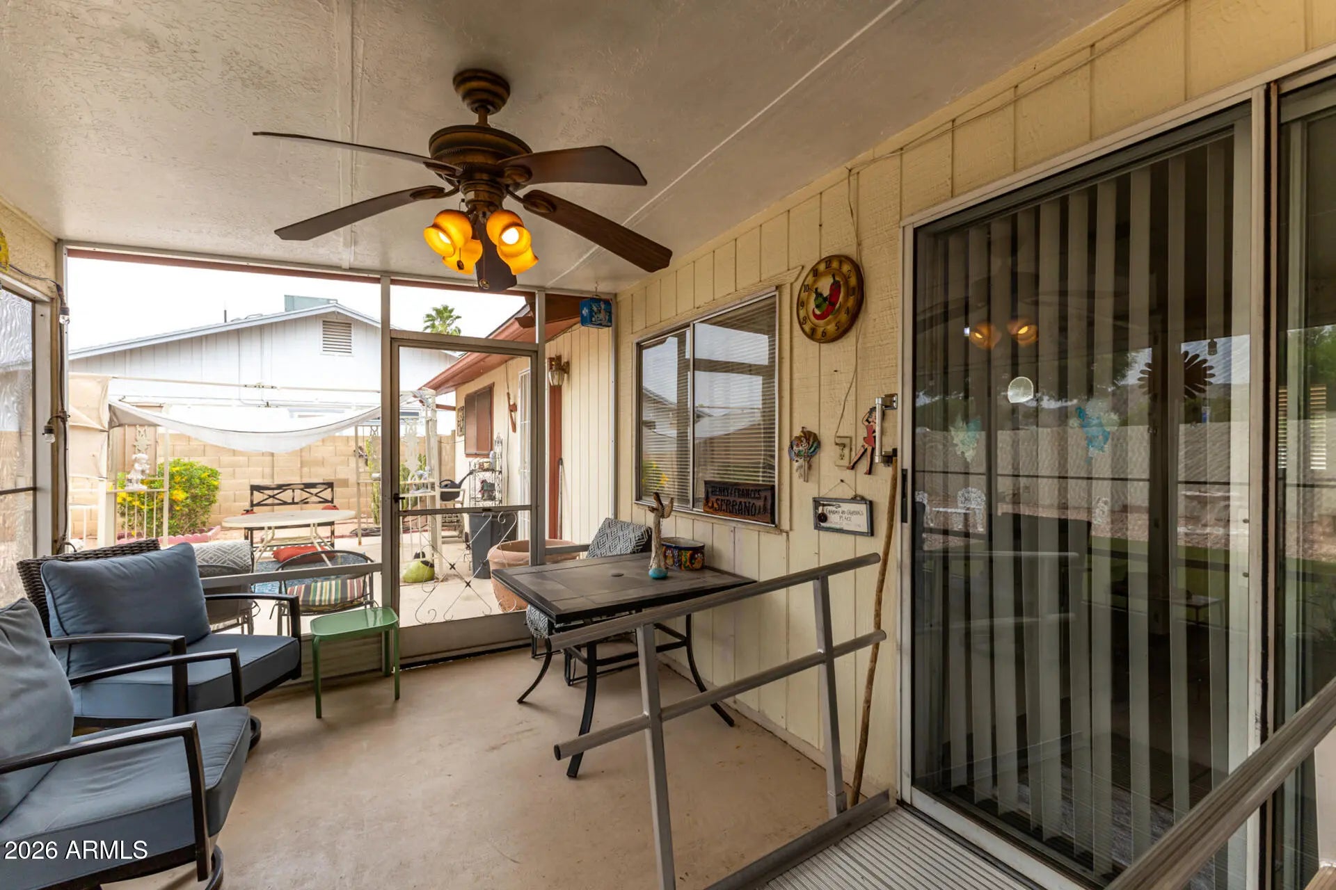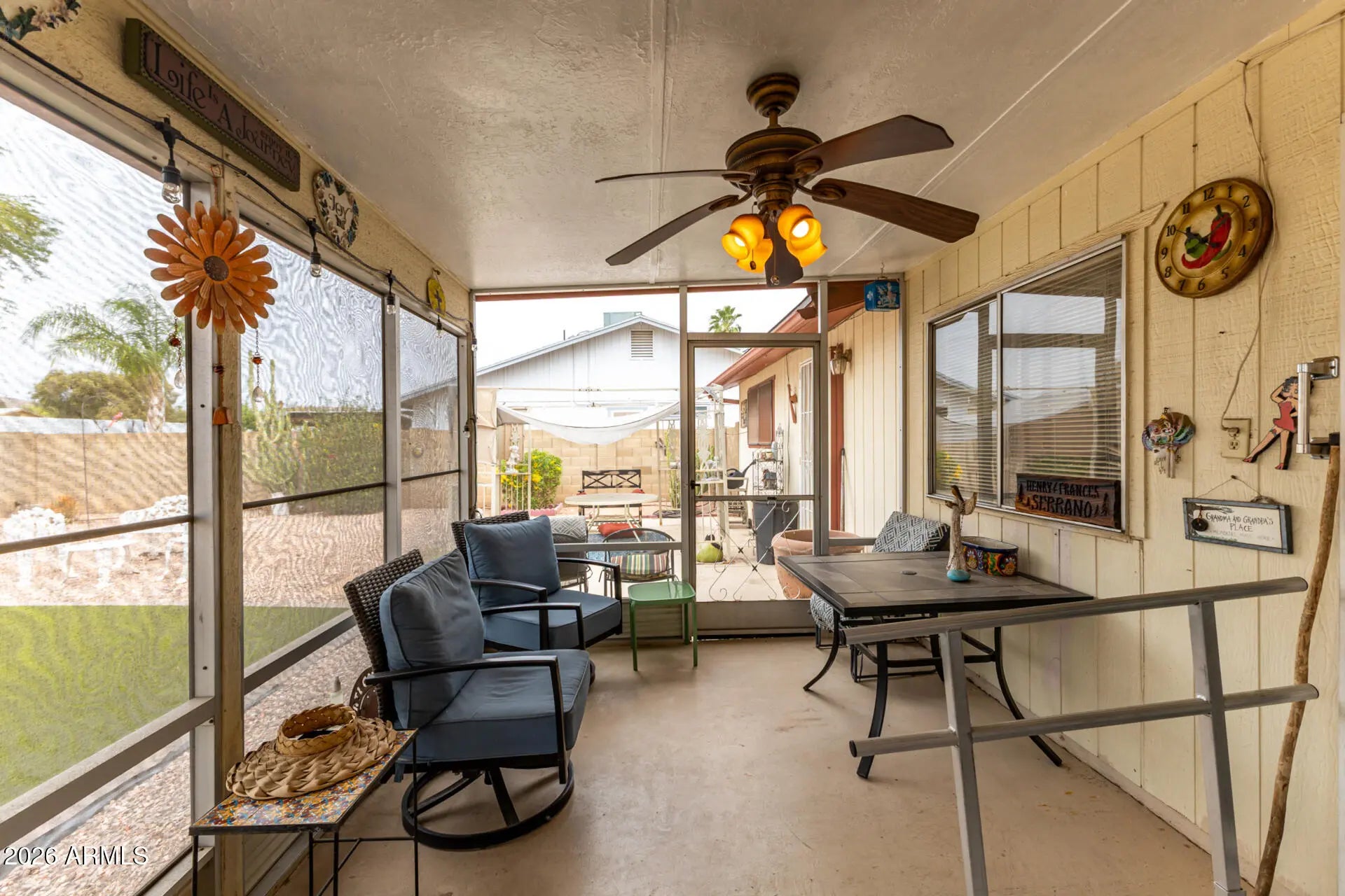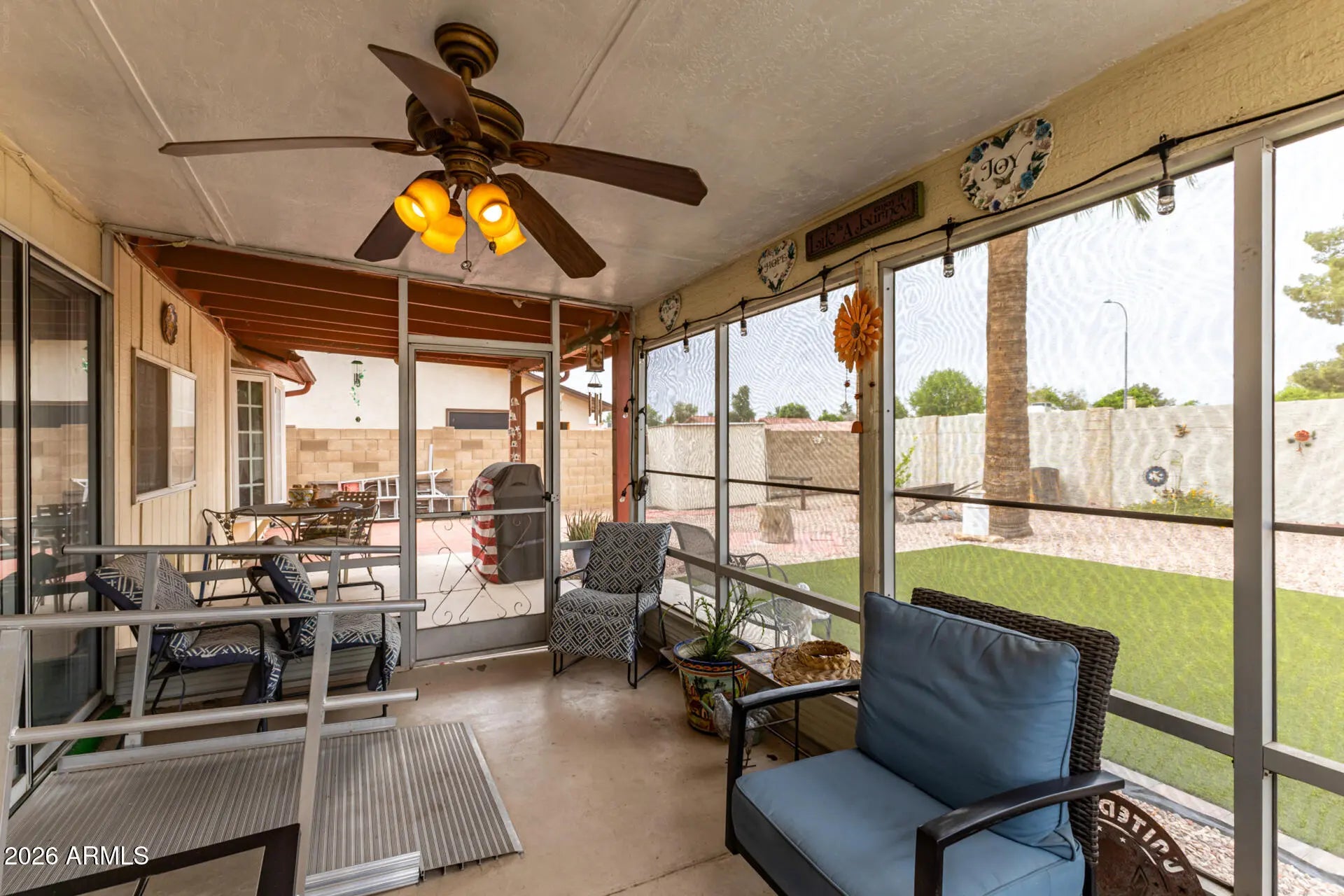 Seize the chance to own this cozy 2-bedroom home in the adult Community of Ahwatukee! You're greeted by a 2-car garage, a low-maintenance desert landscape, and a front patio that sets an inviting tone. Discover a serene living room with a soothing palette, classic plantation shutters, and durable tile flooring for easy maintenance. You'll also find a dedicated family room for relaxing evenings. The well-appointed kitchen comes with granite counters, crisp white cabinetry, a mosaic tile backsplash, essential built-in appliances, and a peninsula for extra prep space. Both bedrooms are well-sized, offering a private retreat for a good night's sleep. Unwind in the backyard, which includes a screened patio and pristine artificial turf for outdoor relaxation. Make it yours today!