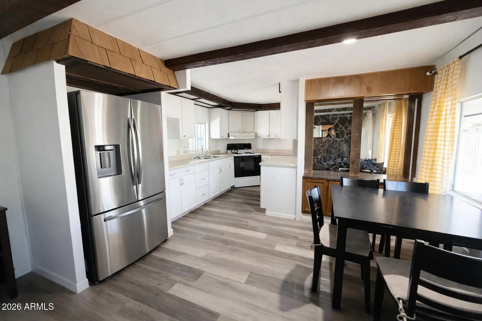 Step into the inviting charm of this delightful corner-lot, affixed mobile home, where comfort meets character. Inside, enjoy wood-look flooring, exposed beams, and wood-plank walls that create a warm, welcoming great room. The kitchen features built-in appliances, white cabinetry, and ample counter space. The main bedroom offers a private bathroom for added comfort. Outside, you'll find a covered patio, storage room, RV gate, and plenty of parking to accommodate multiple vehicles. Conveniently located near parks, schools, freeways, and everyday essentials--don't miss this opportunity!