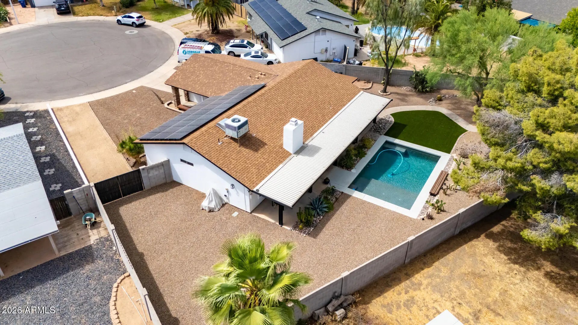 Beautifully updated home tucked into a generous cul-de-sac lot in the heart of Chandler, offering space, flexibility, and an unbeatable location. Thoughtfully renovated with new cabinetry, quartz countertops, open shelving, updated appliances, and modern lighting and plumbing fixtures. Warm Saltillo tile floors and a tile-accented wood-burning fireplace add character to the open living space. Enjoy energy savings with a solar lease paid until 2030. The expansive backyard has a stunning pool with a sun shelf and is ready for entertaining, play, or future customization. Shed with electricity, perfect for a studio or workshop. Conveniently located near the 101 & 202 with quick access to shopping, dining, and everything Chandler has to offer.