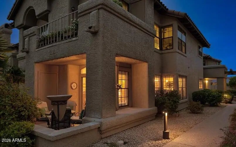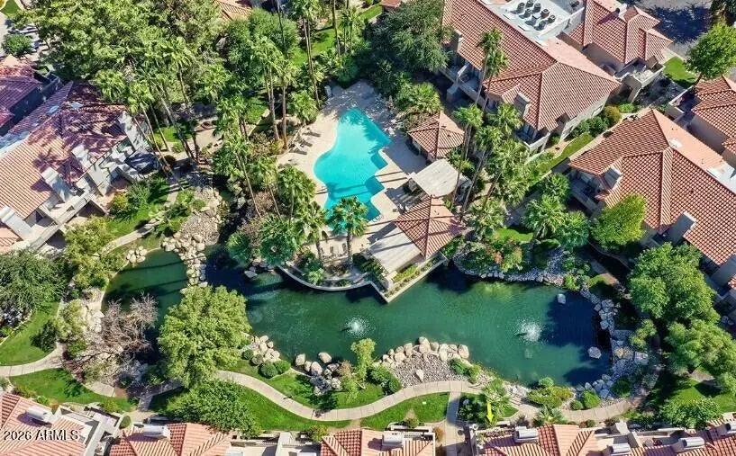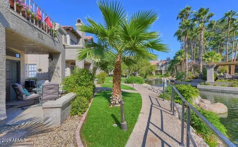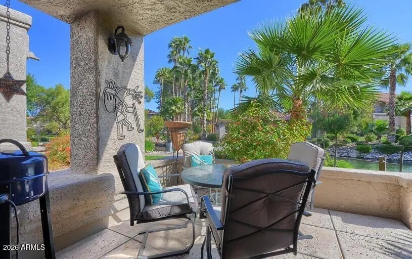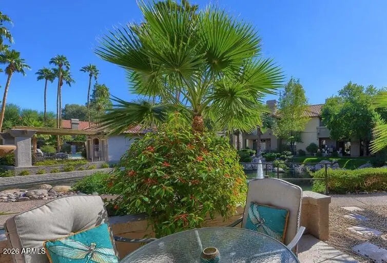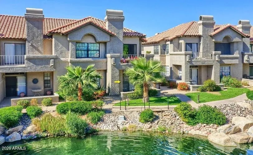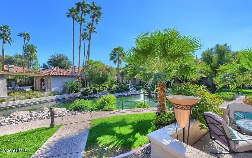 Beautiful GROUND floor CORNER unit located in the Fountains in Scottsdale Ranch Community. The unit patio looks out to the fountain and view of the pool. The condo is move in ready fully furnished. Close to restaurants, shopping, grocery and hospital. Garage and carport space included plenty of storage and closet space. Senior center with tennis, walking & biking paths. Minutes from Barrett Jackson, WM Phoenix Open, Spring Training, Honor Health Hospital and downtown Scottsdale! 30 minutes to Sky Harbor airport. Lush mature green landscape throughout, unit located in back of community for privacy, very quiet. Fountains has a community heated pool and spa Taken care of by the HOA. Resort living at its finest! Don't miss this VERY SPECIAL UNIT!!!
